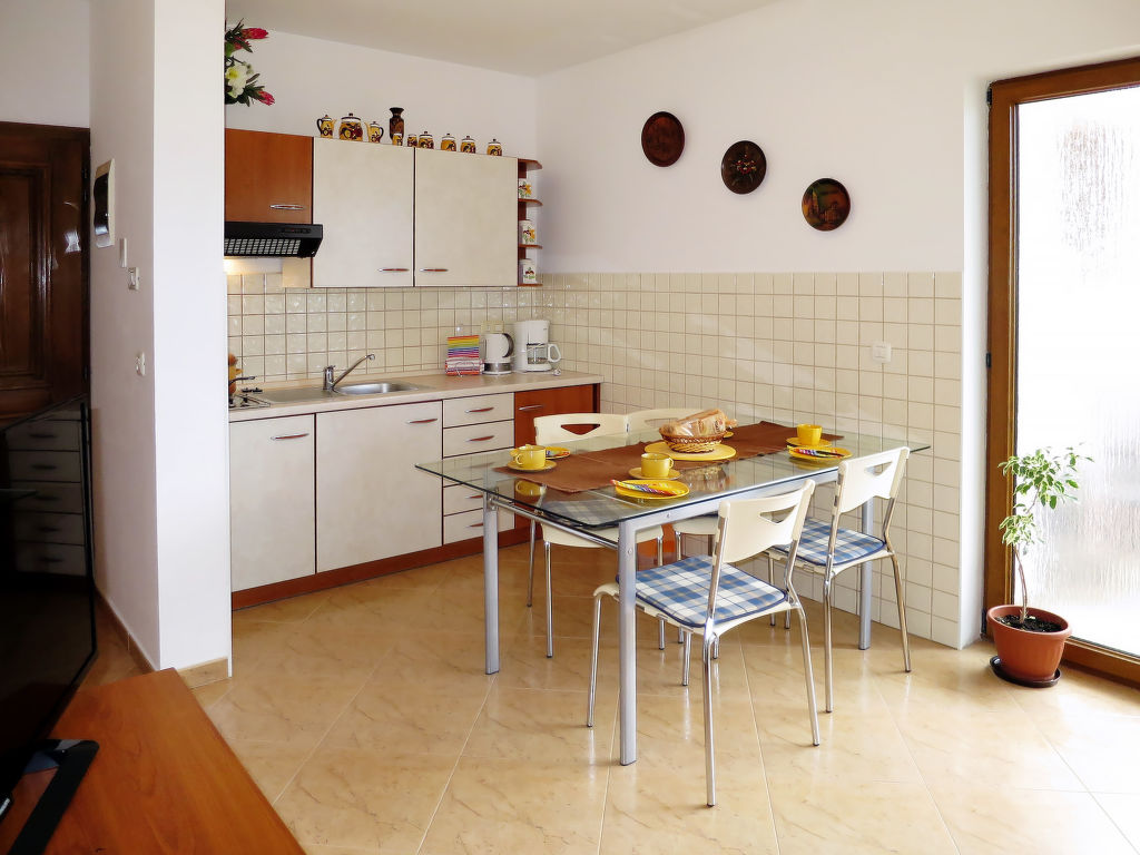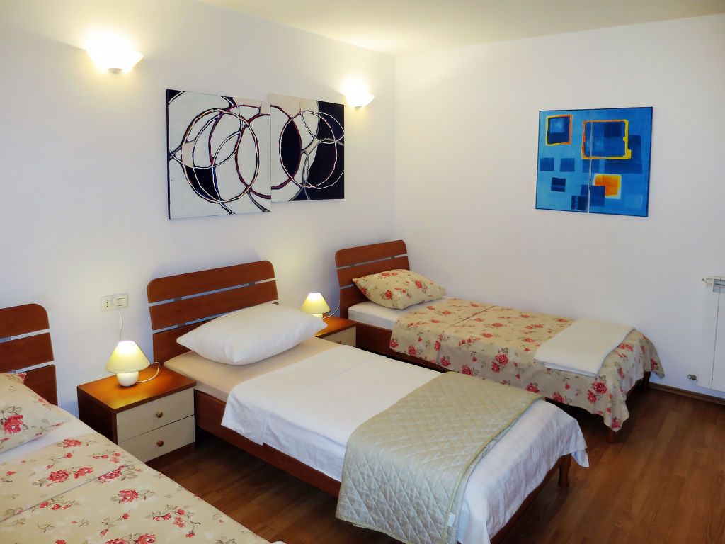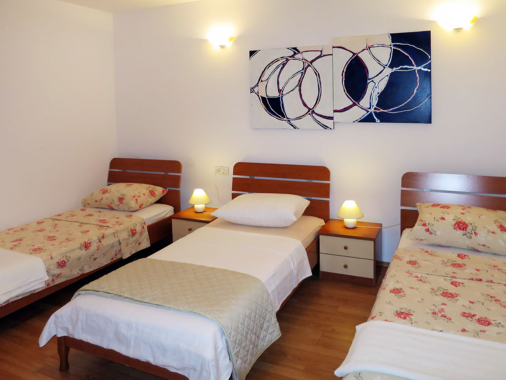 "Zinka (ROJ130)", 3-Zimmer-Wohnung 50 m2 im 1. Stock. Wohn-/Esszimmer mit Sat-TV und Klimaanlage. Ausgang zum Balkon. 1 Zimmer mit 3 Betten. 1 Zimmer mit 1 Doppelbett. Offene Küche (2 Kochplatten, Toaster, Wasserkocher, Mikrowelle, elektrische Kaffeemaschine). Bad/WC. 1 Balkone 10 m2. Balkonmöbel. Zur Verfügung: Internet (Wireless LAN, gratis). Bitte beachten: Nichtraucher-Haus. Maximal 1 Haustier/Hund erlaubt.