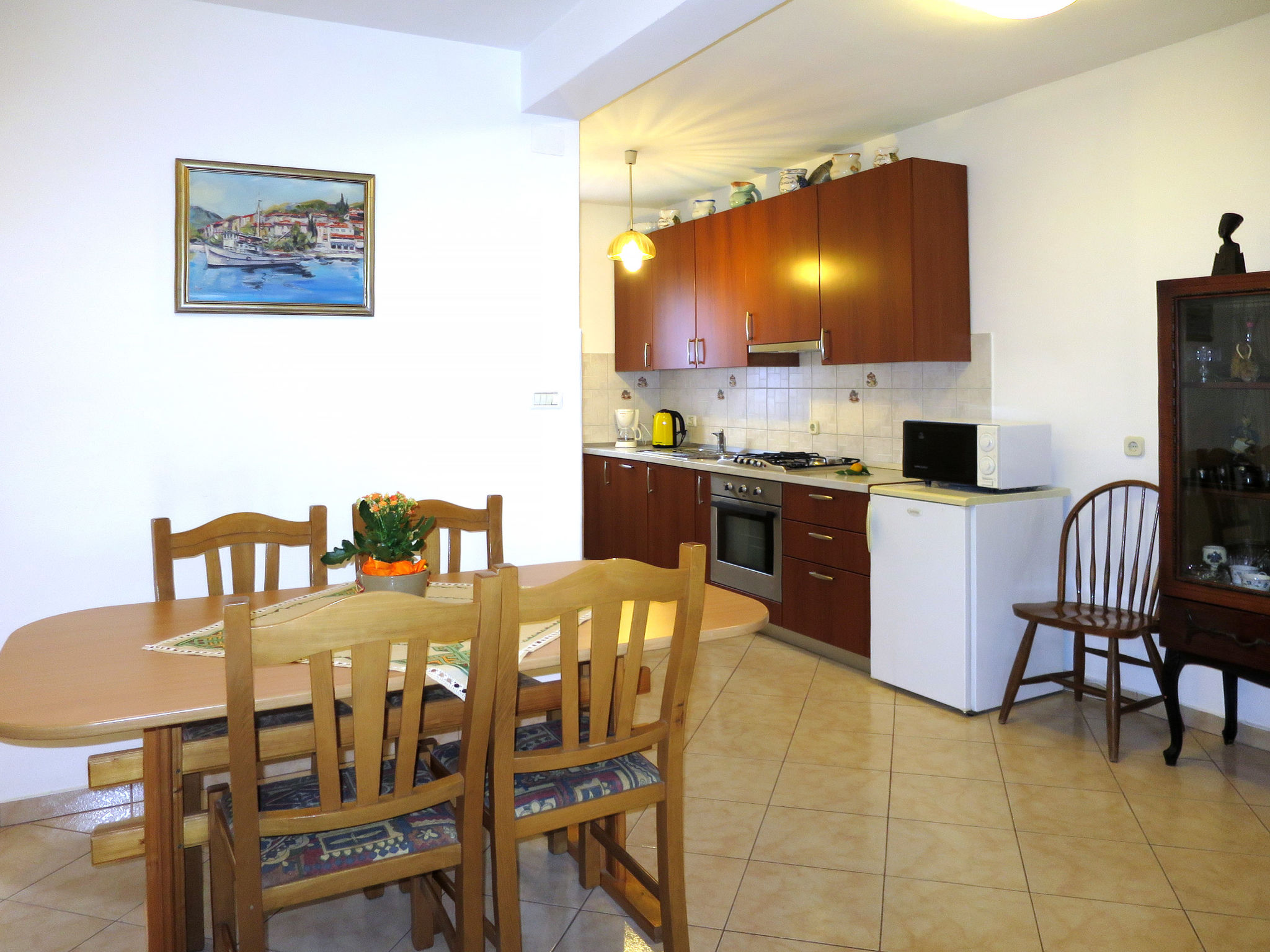 Dreifamilienhaus "Elsa". Im Weiler Ravni, 13 km vom Zentrum von Labin, am Hang, 800 m vom Meer, 800 m vom Strand. Zur Mitbenutzung: naturbelassenes Grundstück 2'000 m2 mit Bäumen. Grill. Im Hause: Internetzugang. Parkplatz auf dem Grundstück. Einkaufsgeschäft 150 m, Supermarkt 14 km, Kieselstrand, Felsstrand 800 m.