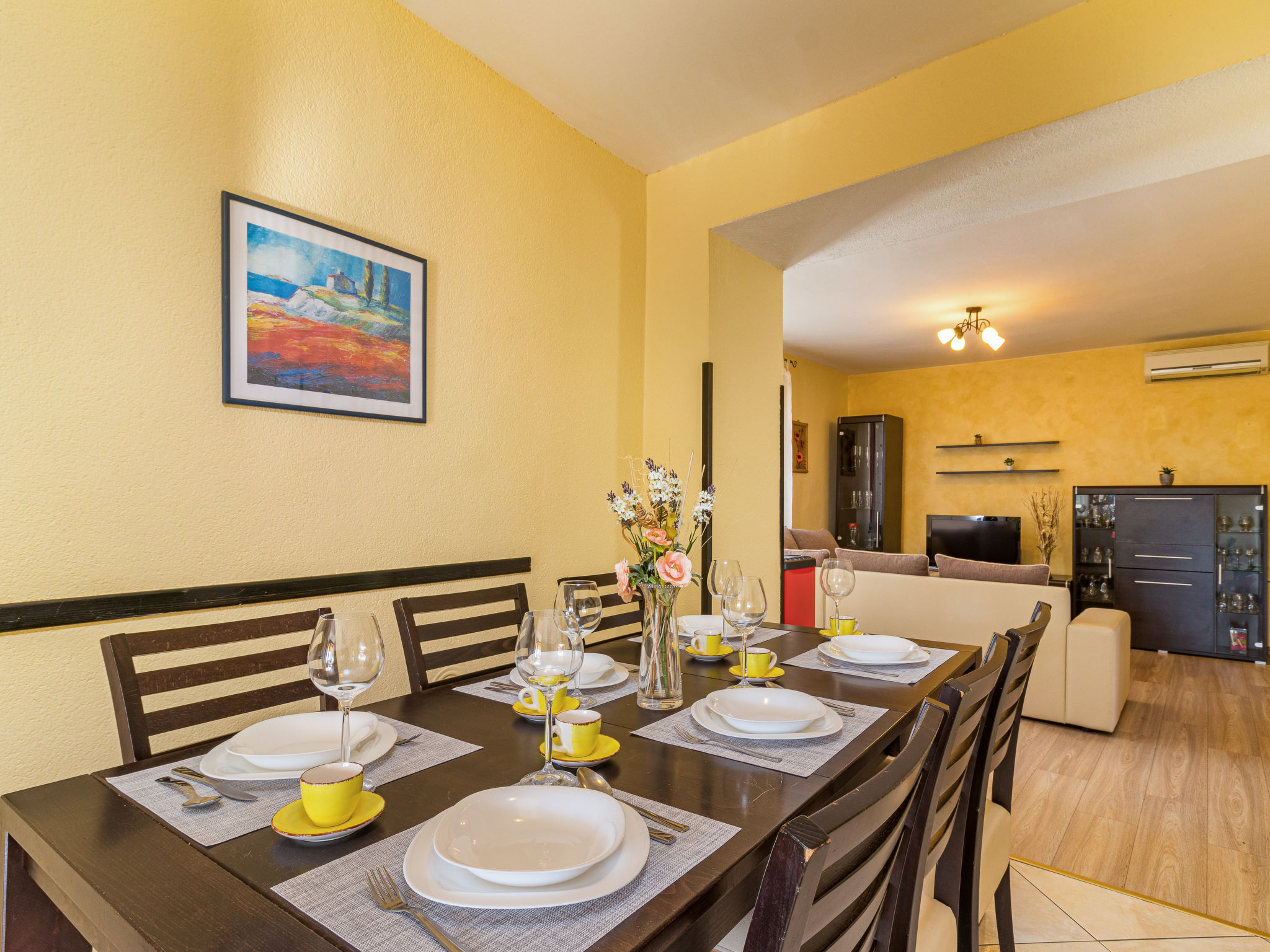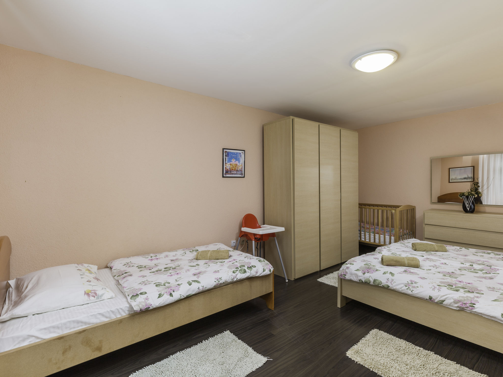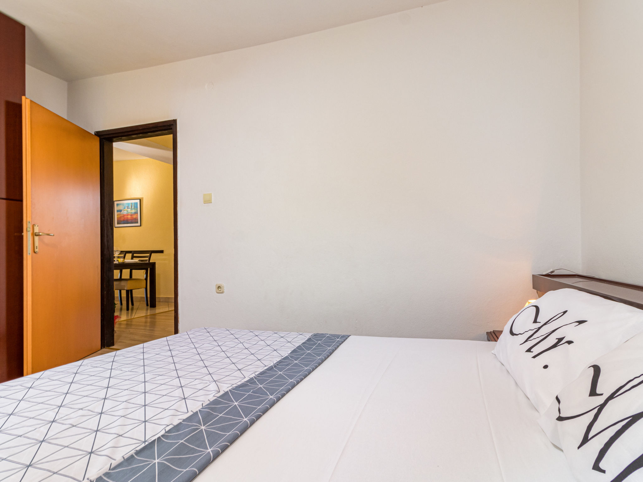 5-Zimmer-Haus 165 m2 auf 2 Stockwerken. 1 Zimmer mit 1 Bett, 1 Doppelbett und TV. Bad/WC mit Eckbadewanne. Obergeschoss: (Aussentreppe) Wohn-/Esszimmer mit Sat-TV (Flachbildschirm), Klimaanlage. Ausgang zum Balkon, zur Terrasse. 1 Zimmer mit 1 Bett und 1 franz. Bett (160 cm, Länge 200 cm). 1 Zimmer mit 2 Betten. 1 Zimmer mit 1 Doppelbett. Offene Küche (4 Kochplatten, Backofen, Geschirrspüler, Mikrowelle, elektrische Kaffeemaschine). Dusche/WC. Balkon, Terrasse. Terrassenmöbel. Zur Verfügung: Bügeleisen, Kinderhochstuhl, Babybett. Bitte beachten: Nichtraucher-Haus. Maximal 1 Haustier/Hund erlaubt.