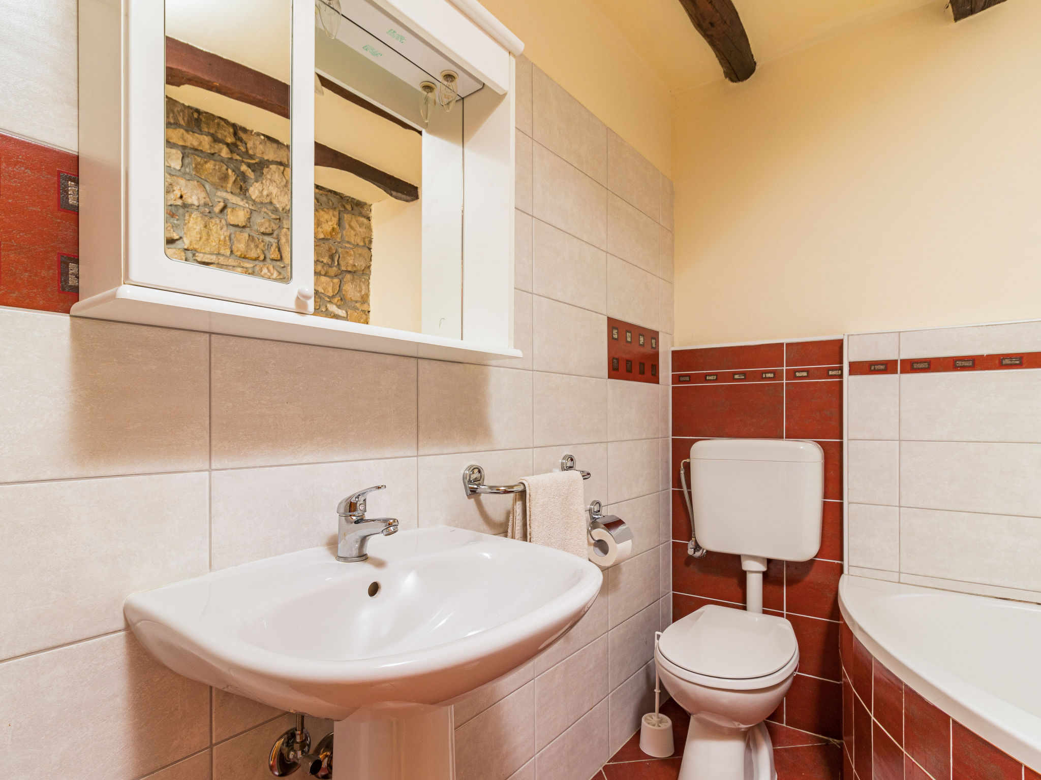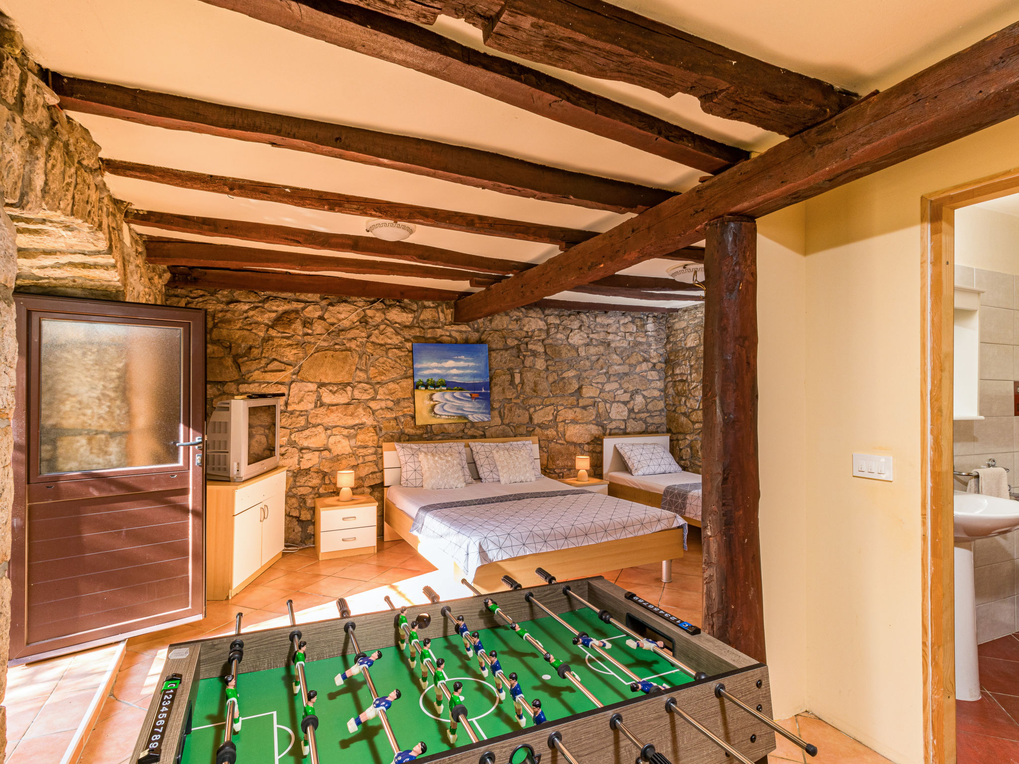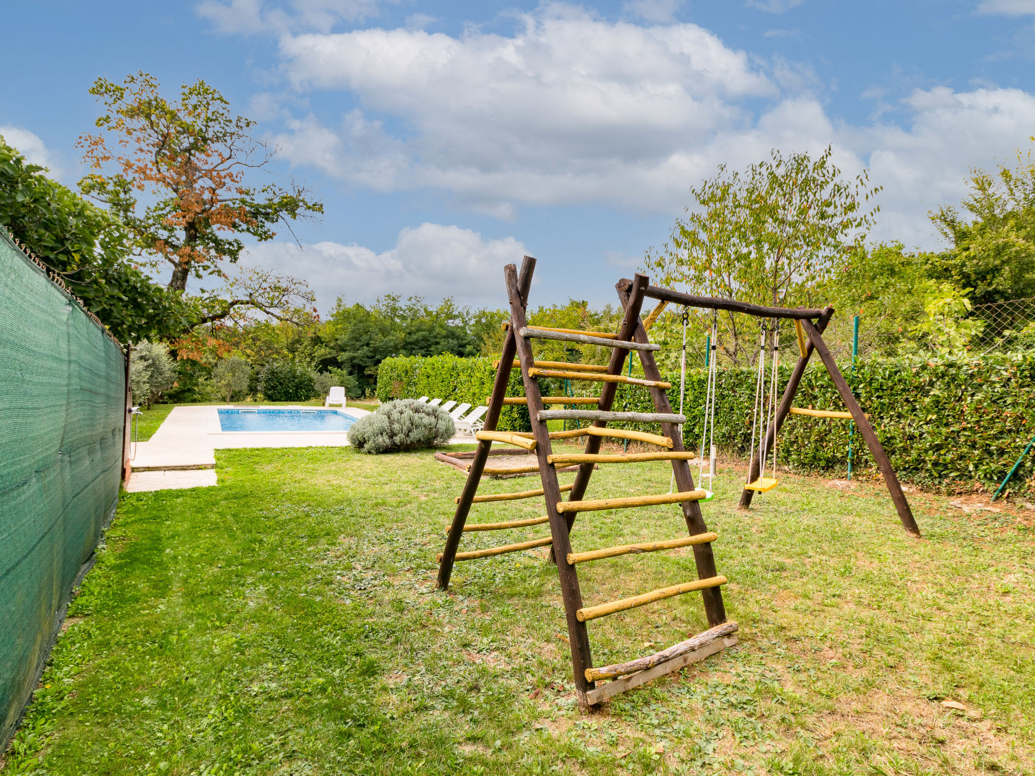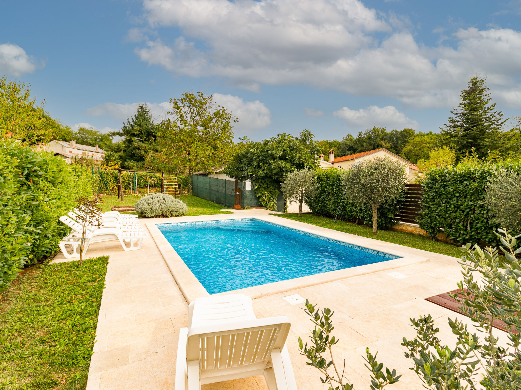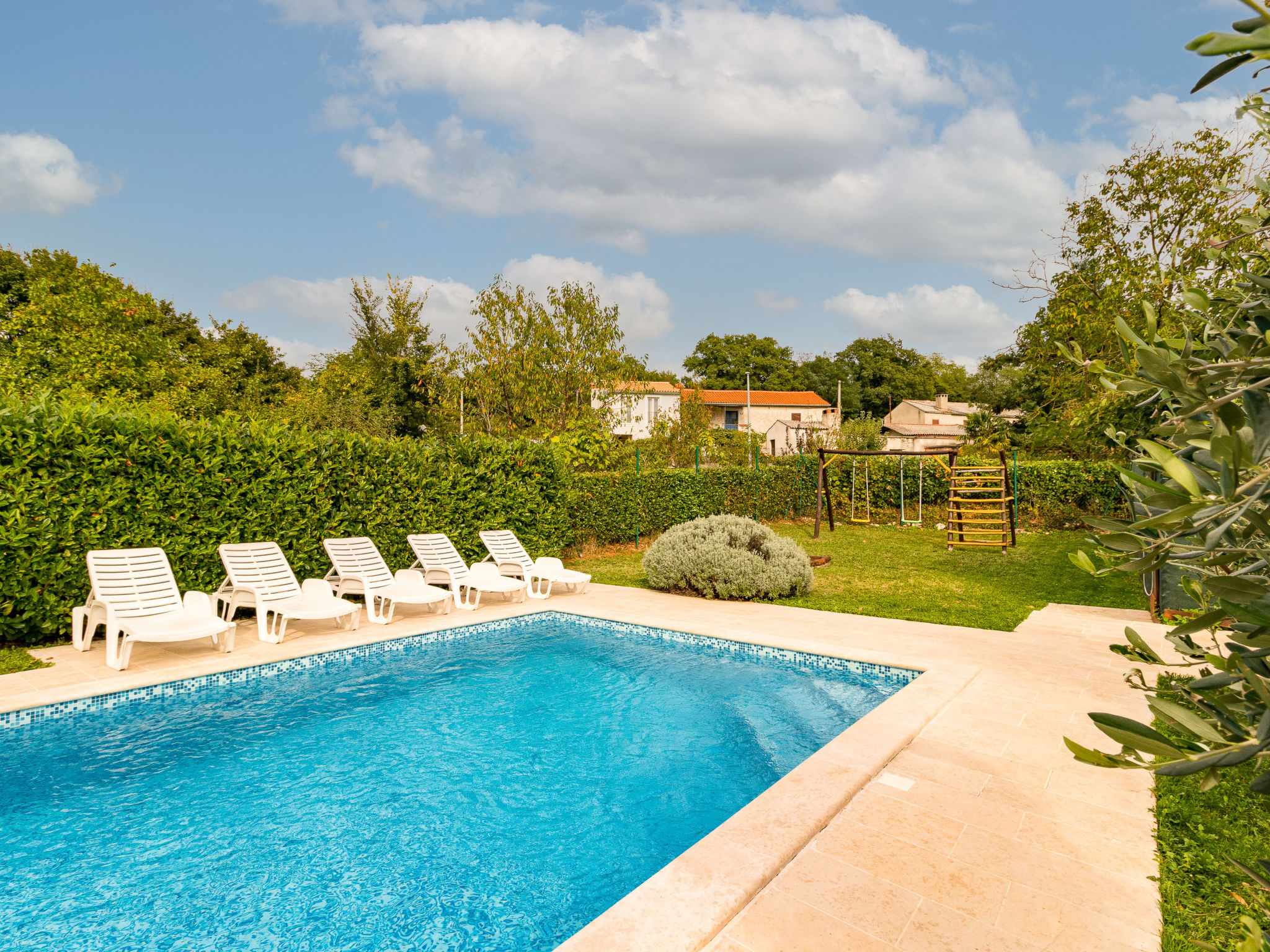 Einfamilienhaus "Sonja", auf 2 Stockwerken. Im Weiler Montovani, 8 km vom Zentrum von Pićan, 13 km vom Zentrum von Žminj, 27 km vom Zentrum von Rabac, 27 km vom Meer. Zur Alleinbenutzung: Grundstück 1'500 m2 mit Rasen, Schwimmbad (7 x 4 m, 150 cm tief, 01.05.-09.10.). Basketball, Terrasse, Gartenmöbel, Grill, Kinderspielplatz, Poolpflege durch den Besitzer/Gärtner. Im Hause: Internetzugang, Tischfussball. Parkplatz (für 3 Autos) beim Haus auf dem Grundstück. Einkaufsgeschäft 4 km, Restaurant 13 km, Felsstrand 27 km. Keine Vermietung an Jugendgruppen.