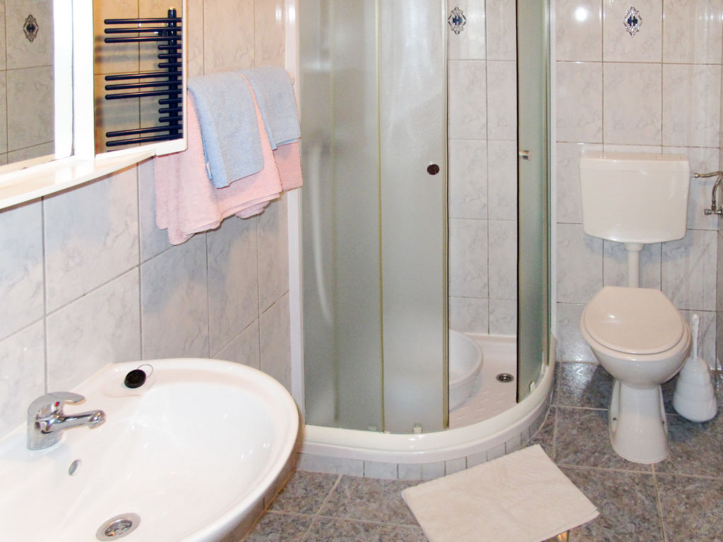 Haus KOSTRO mit 3 Wohnungen steht in einer Seitenstraße im kleinen Ort Nova Vas. Ortsmitte, Einkaufsmöglichkeit ca. 400 m, Restaurant ca. 500 m. Felsstrand 5 km. Porec 5 km. Durch Mauer und Hecke abgeschlossenes, schönes Gartengrundstück (ca. 1200 m²) mit Rasenflächen, Obst- und Olivenbäumen. Zur gemeinsamen Nutzung der Feriengäste: Ovaler Pool (8 x 4 m, 1,50 m tief; gesamte Saison geöffnet, 8-22 Uhr) mit Poolterrasse, 4 Sonnenliegen, Sonnenschirme, Außendusche. PRC 408 mit 2 möblierten Balkonen. PRC 409 mit überdachter, möblierter Terrasse (ca. 20 m²) und gemauertem Grill. Parkmöglichkeiten auf dem Grundstück. Die Vermieter wohnen in der 2. Etage mit völlig separatem Eingang. Freundliche, feriengerechte Einrichtung. Fliesen- und Laminatboden. Sat-TV (deutsche Programme). Internetzugang (WLAN, € 10 pro Woche). Klimaanlage im Wohnraum. Elektro-Zustellheizung. Öl-Zentralheizung. Hinweis: Rauchen ist in den Wohnungen nicht gestattet.