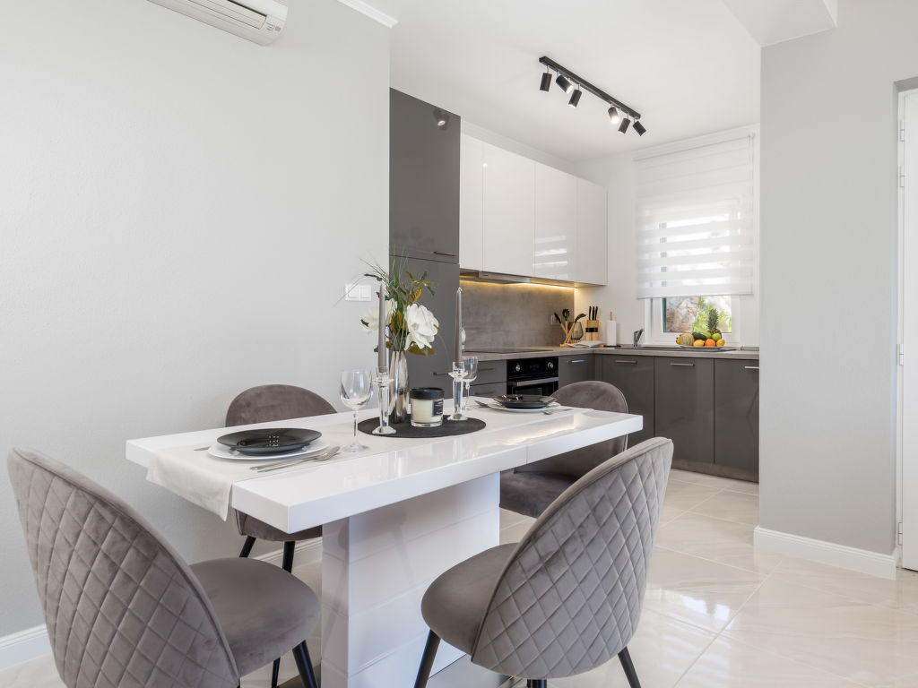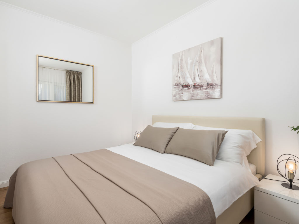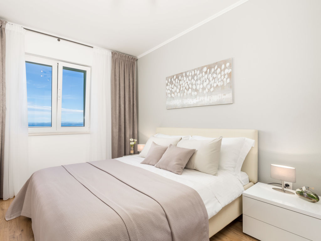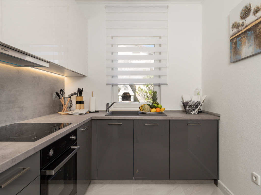 "Makvic (MOD310)", 3-Zimmer-Doppelhaushälfte 59 m2. Wohn-/Esszimmer mit Sat-TV und Klimaanlage. Ausgang zur Terrasse. 2 Zimmer, jedes Zimmer mit 1 franz. Bett (160 cm, Länge 200 cm). Offene Küche (Backofen, Geschirrspüler, 4 Glaskeramikherd Platten, Toaster, Wasserkocher, Tiefkühler, elektrische Kaffeemaschine). Dusche/Bidet/WC. E-Heizung. Terrasse 15 m2. Terrassenmöbel, Liegestühle (4), Abstellkammer. Sicht auf das Meer. Zur Verfügung: Internet (Wireless LAN, gratis). Bitte beachten: Nichtraucher-Haus. Eigener Eingang.
