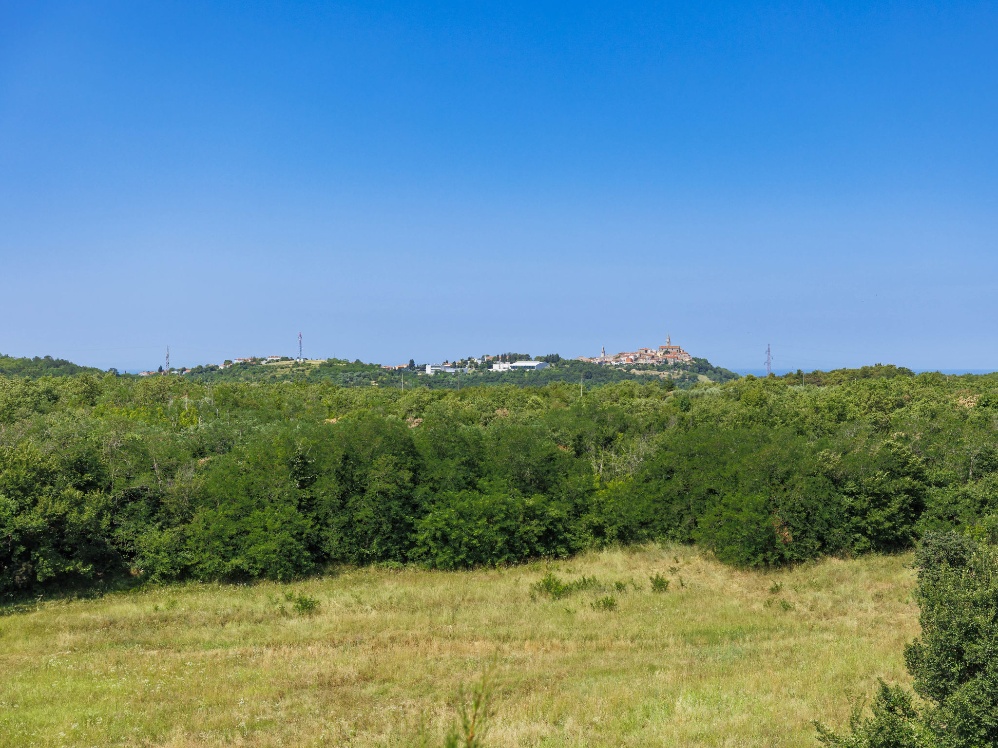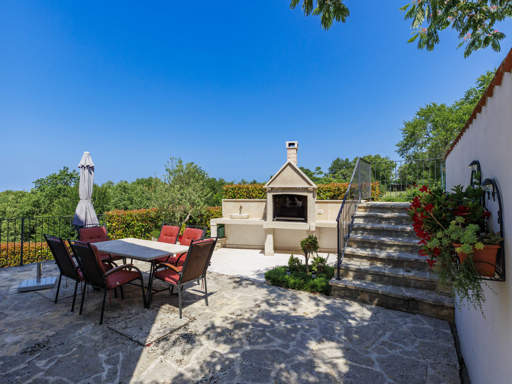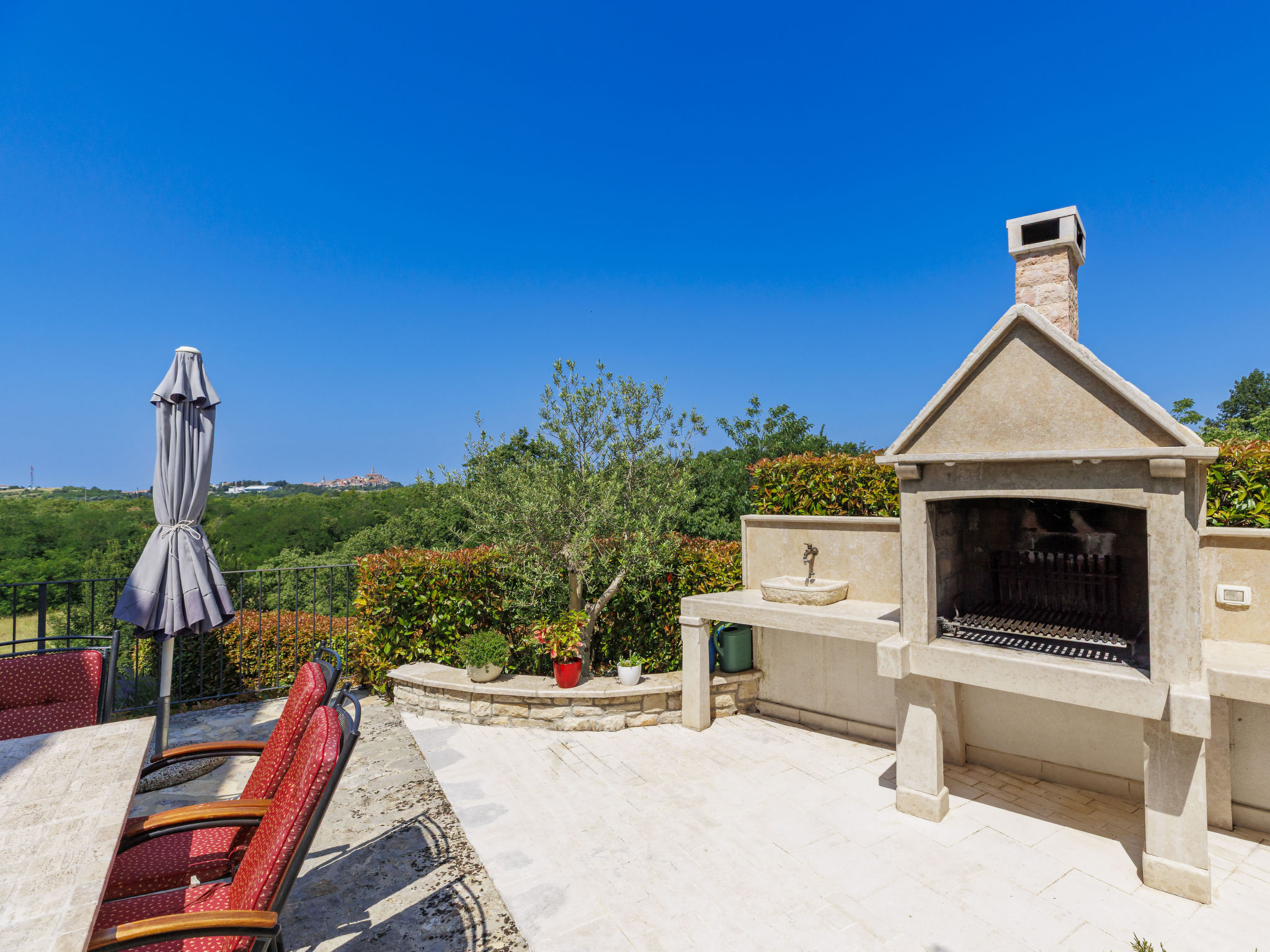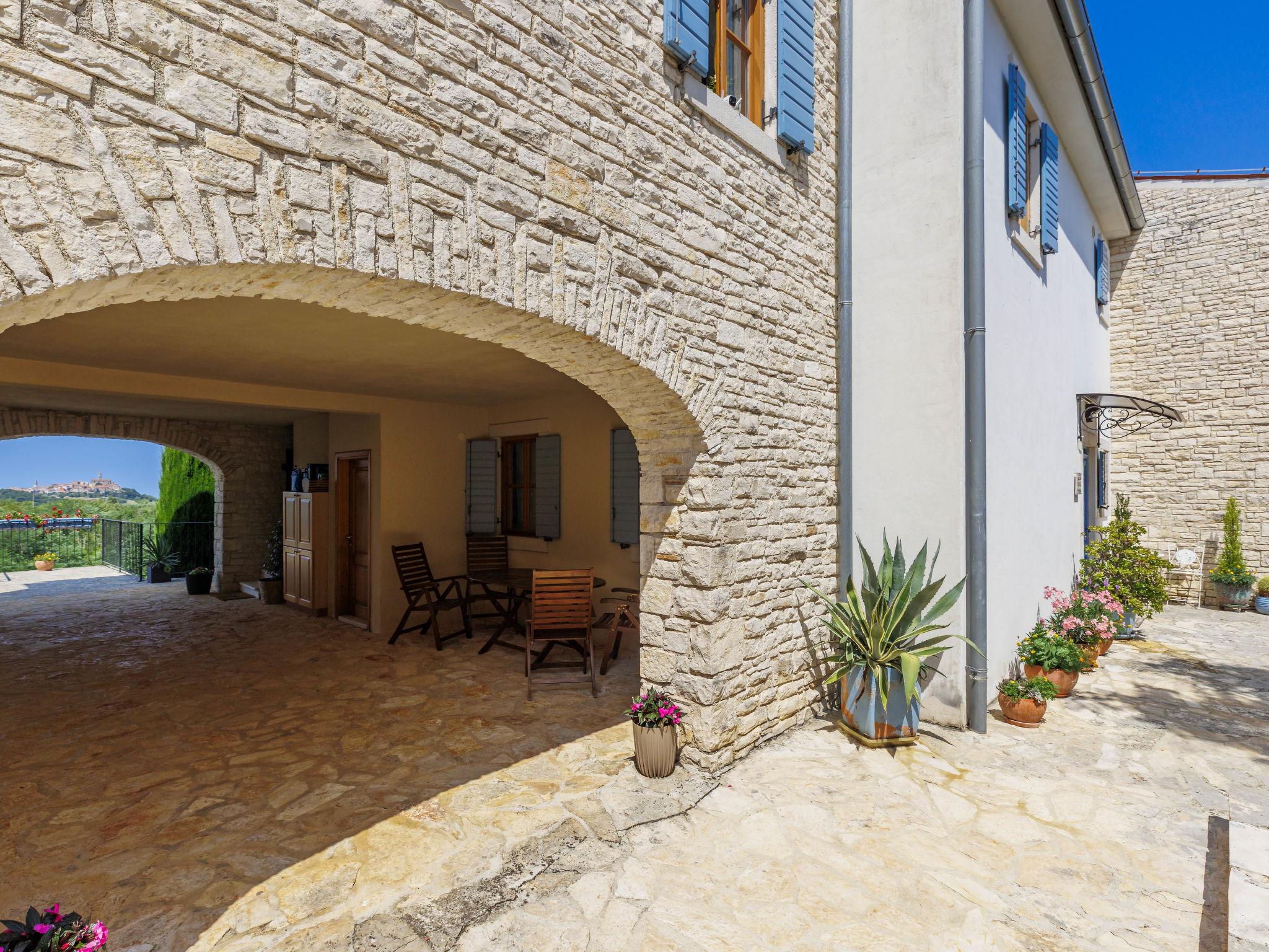 Schönes Reihenhaus "Bibali", auf 2 Stockwerken. Im Weiler Bibali, 2 km vom Zentrum von Buje, ruhige, sonnige Lage am Hang, 12 km vom Meer. Zur Mitbenutzung: Grundstück 2'000 m2 (eingezäunt), Garten, Schwimmbad eckig (11 x 8 m, 100 - 150 cm tief, saisonale Verfügbarkeit: 15.Apr.-15.Okt.) mit Innentreppe. Aussendusche, Grill. Im Hause: Internetzugang, Waschmaschine. Parkplatz beim Haus auf dem Grundstück. Einkaufsgeschäft 2 km, Restaurant 2 km, Kieselstrand 12 km. Golfplatz 17 km, Tennis 1 km, Reitstall 5 km, Wanderwege ab Haus 1 km, Radweg 1 km.
