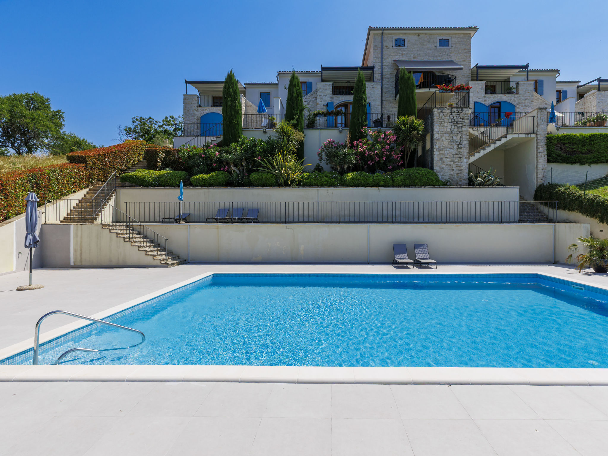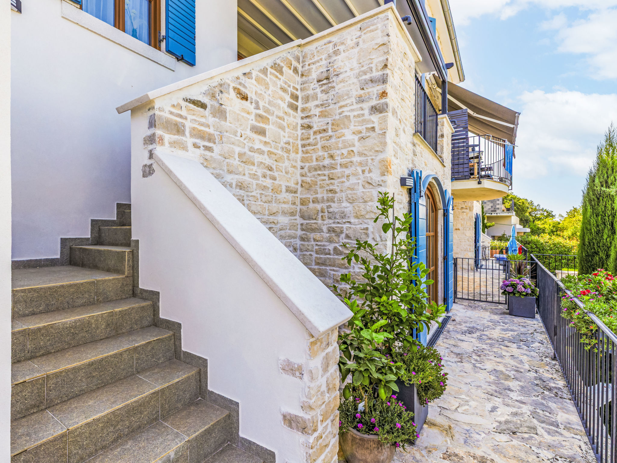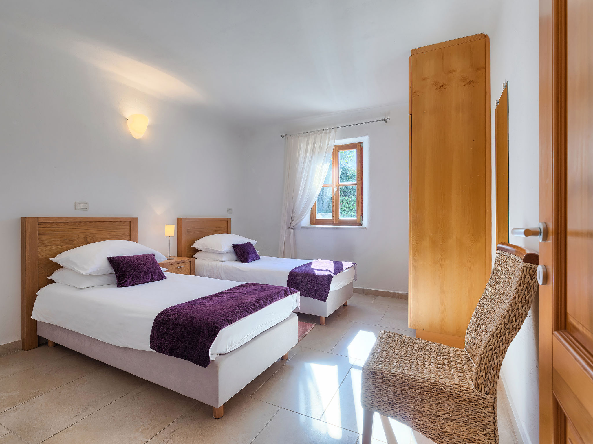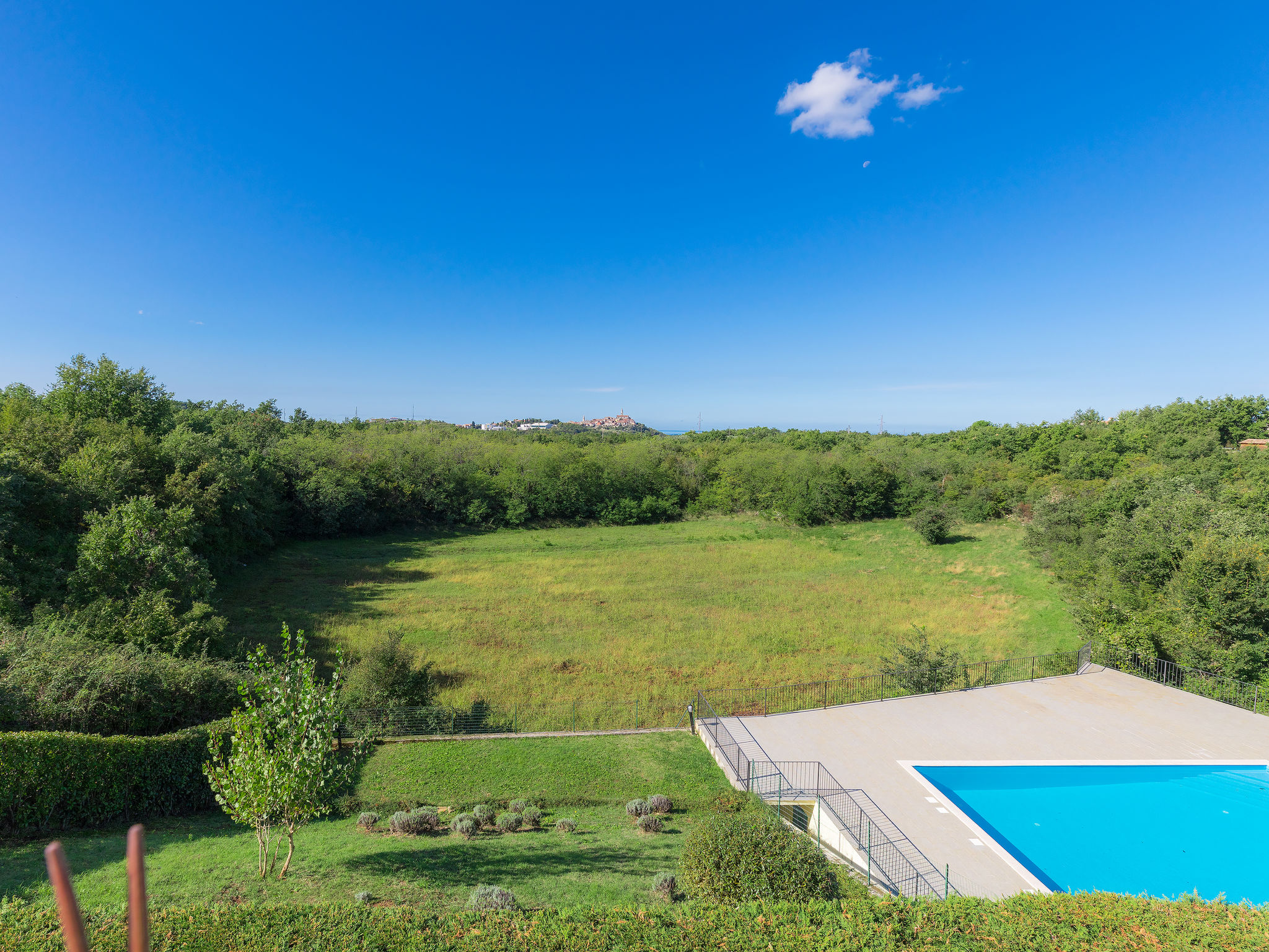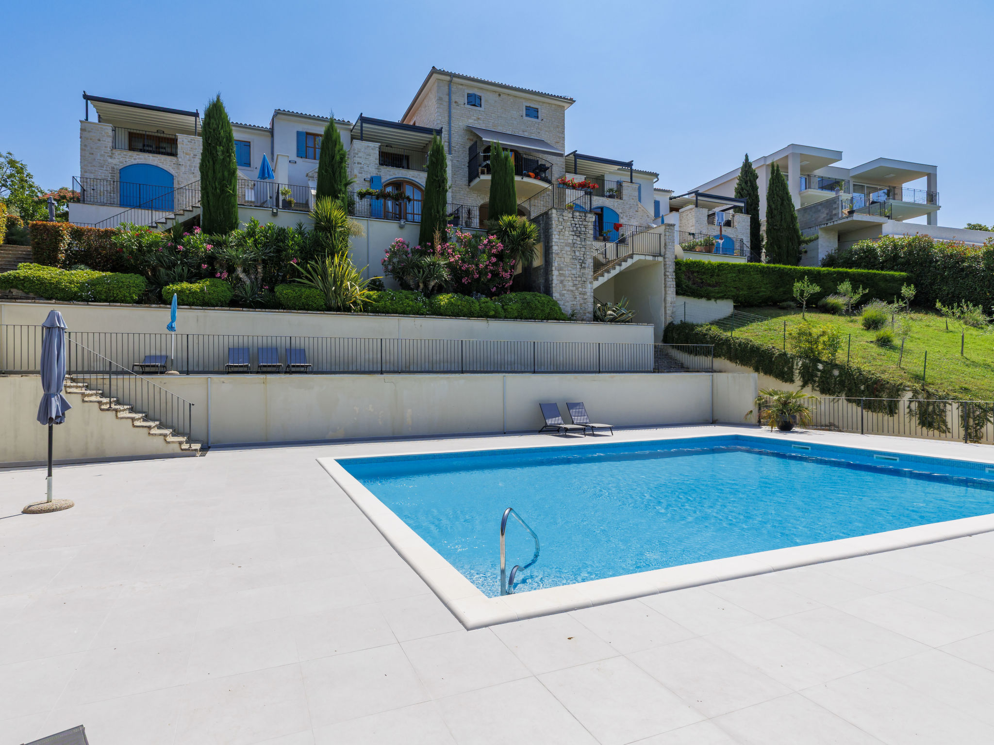 Schönes Reihenhaus "Bibali", auf 2 Stockwerken. Im Weiler Bibali, 2 km vom Zentrum von Buje, ruhige, sonnige Lage am Hang, 12 km vom Meer. Zur Mitbenutzung: Grundstück 2'000 m2 (eingezäunt), Garten, Schwimmbad eckig (11 x 8 m, 100 - 150 cm tief, saisonale Verfügbarkeit: 15.Apr.-15.Okt.) mit Innentreppe. Aussendusche, Grill. Im Hause: Internetzugang, Waschmaschine. Parkplatz beim Haus auf dem Grundstück. Einkaufsgeschäft 2 km, Restaurant 2 km, Kieselstrand 12 km. Golfplatz 17 km, Tennis 1 km, Reitstall 5 km, Wanderwege ab Haus 1 km, Radweg 1 km.