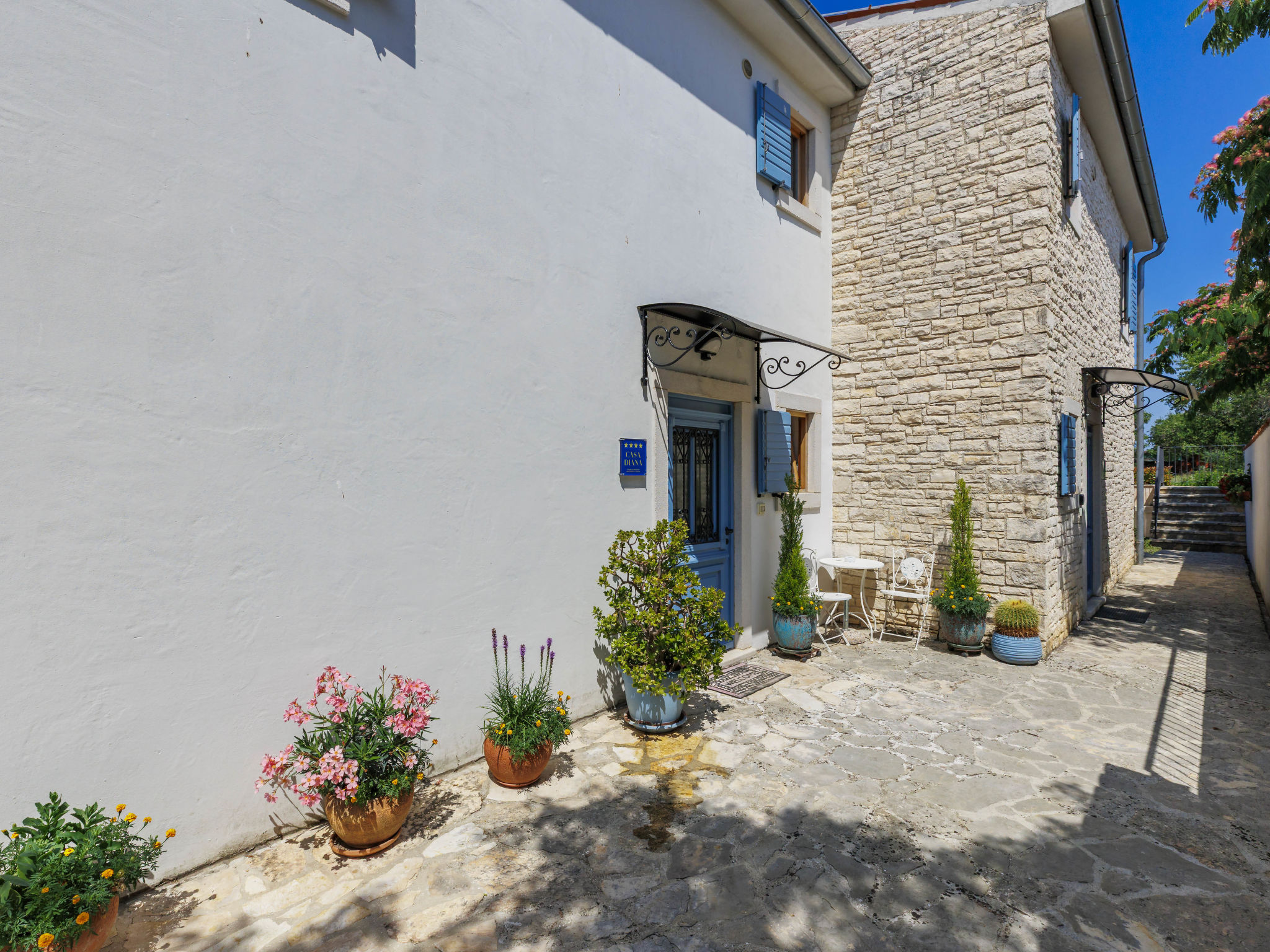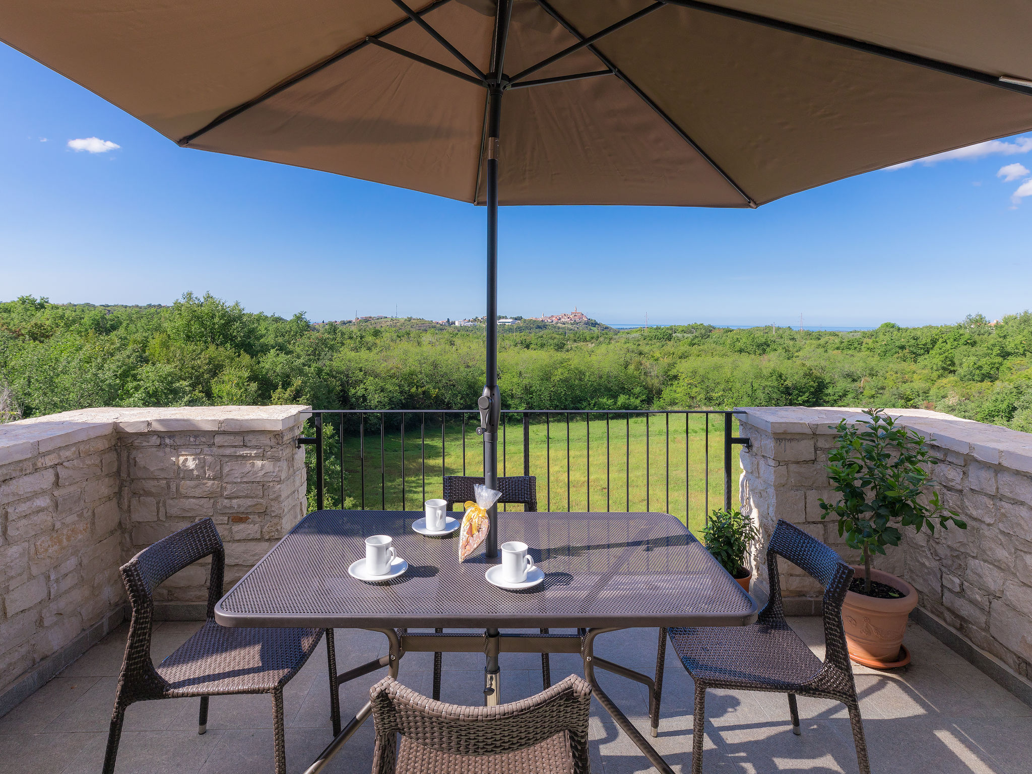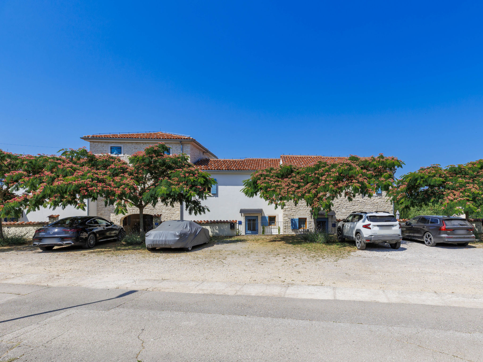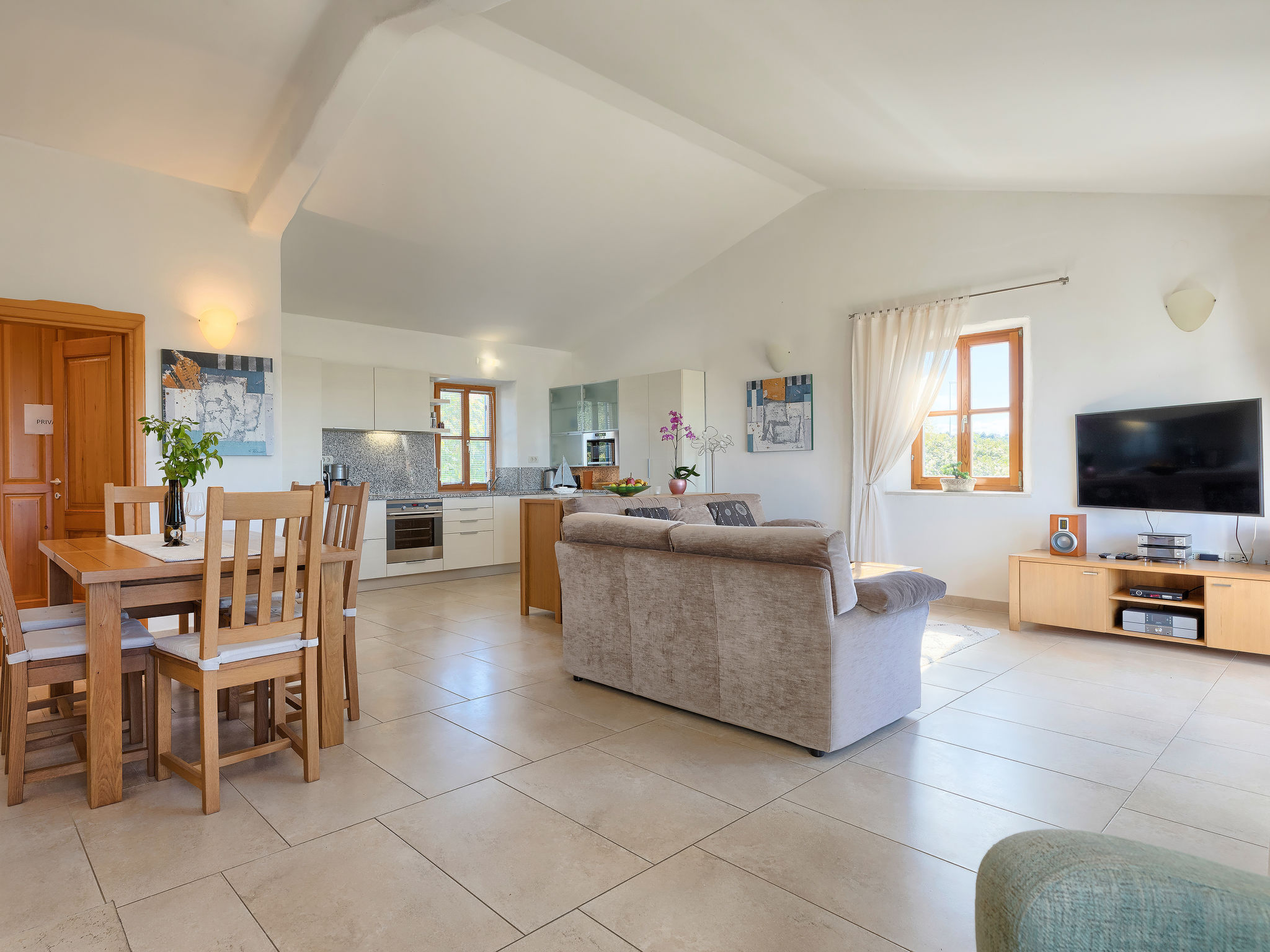 Schönes Reihenhaus "Bibali", auf 2 Stockwerken. Im Weiler Bibali, 2 km vom Zentrum von Buje, ruhige, sonnige Lage am Hang, 12 km vom Meer. Zur Mitbenutzung: Grundstück 2'000 m2 (eingezäunt), Garten, Schwimmbad eckig (11 x 8 m, 100 - 150 cm tief, saisonale Verfügbarkeit: 15.Apr.-15.Okt.) mit Innentreppe. Aussendusche, Grill. Im Hause: Internetzugang, Waschmaschine. Parkplatz beim Haus auf dem Grundstück. Einkaufsgeschäft 2 km, Restaurant 2 km, Kieselstrand 12 km. Golfplatz 17 km, Tennis 1 km, Reitstall 5 km, Wanderwege ab Haus 1 km, Radweg 1 km.