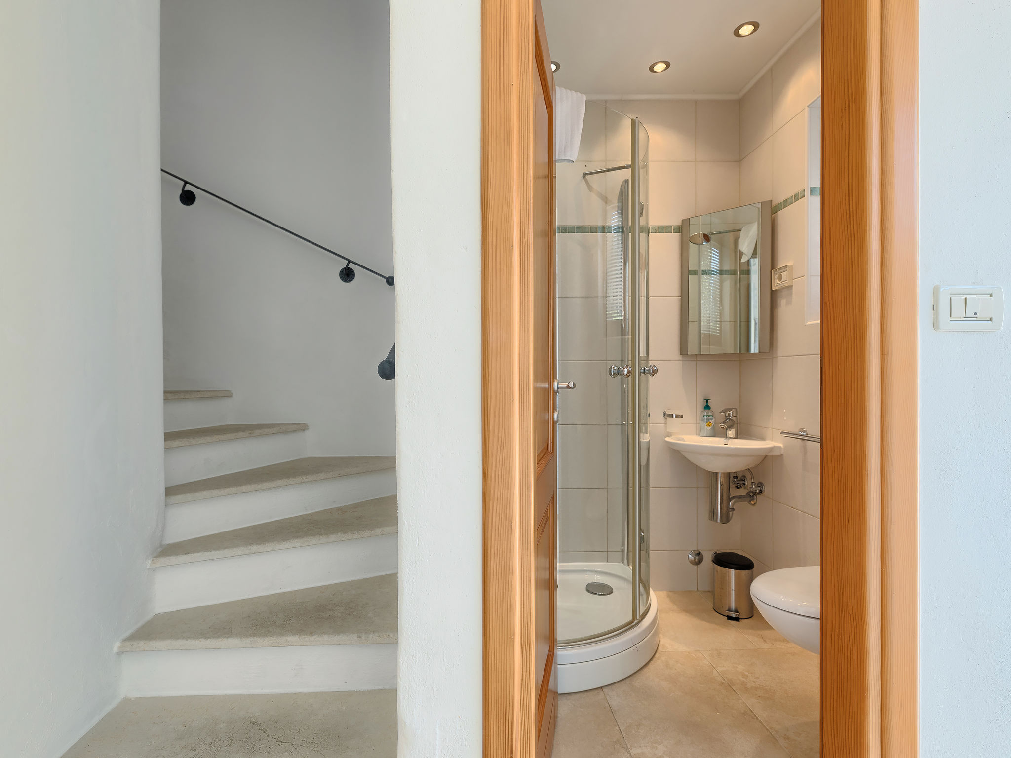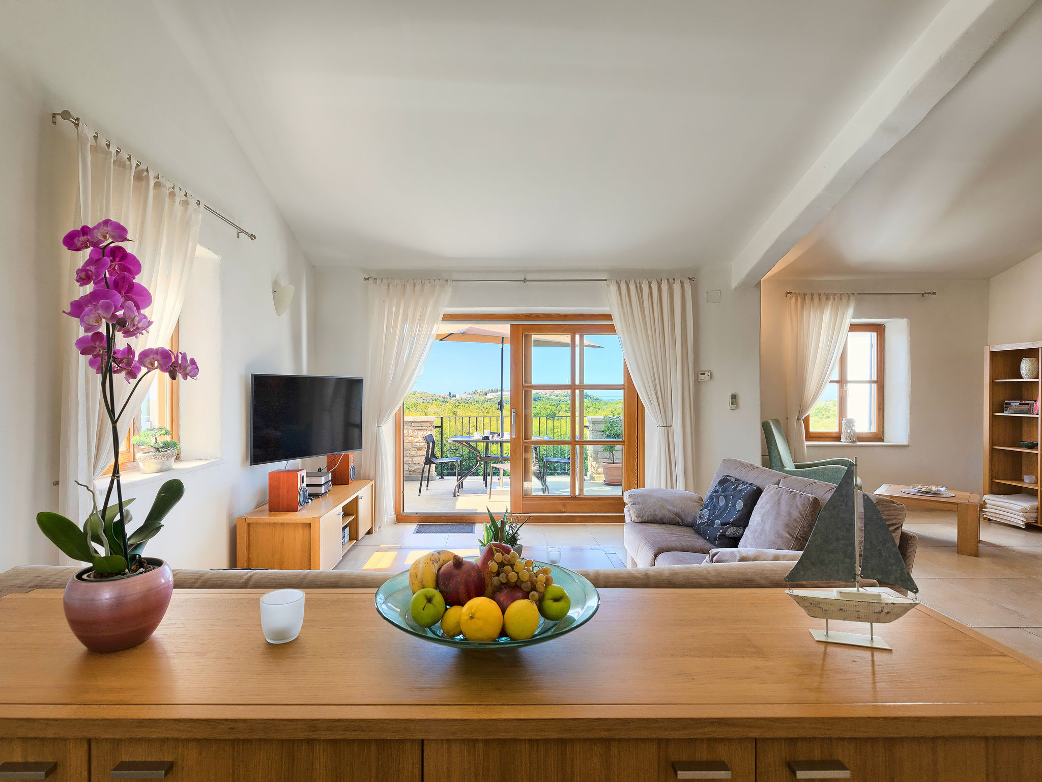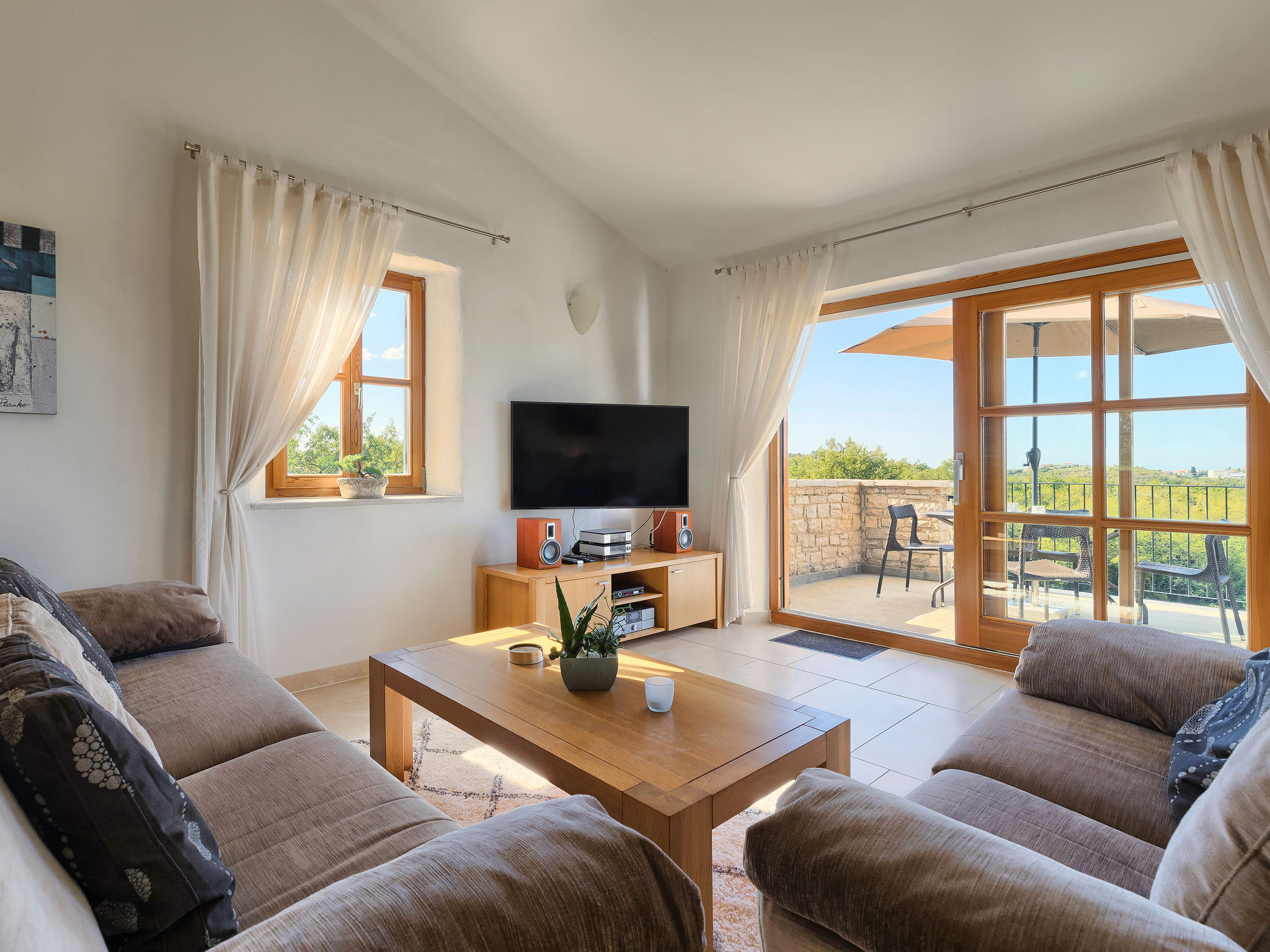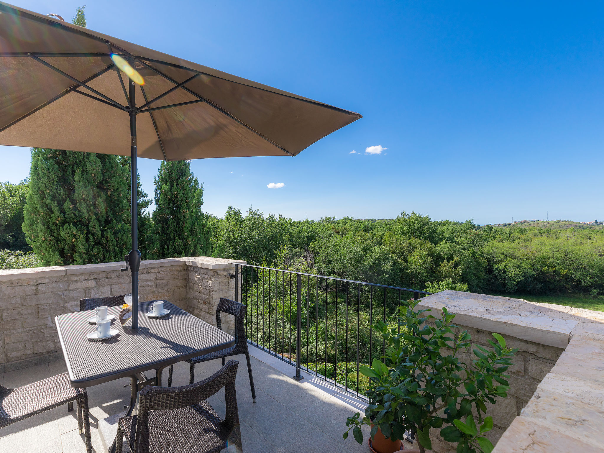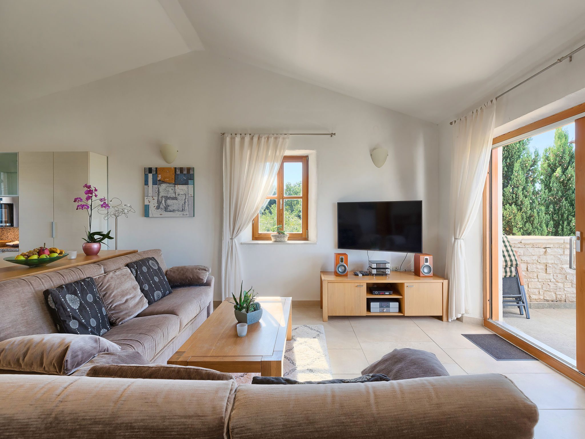 Schönes Reihenhaus "Bibali", auf 2 Stockwerken. Im Weiler Bibali, 2 km vom Zentrum von Buje, ruhige, sonnige Lage am Hang, 12 km vom Meer. Zur Mitbenutzung: Grundstück 2'000 m2 (eingezäunt), Garten, Schwimmbad eckig (11 x 8 m, 100 - 150 cm tief, saisonale Verfügbarkeit: 15.Apr.-15.Okt.) mit Innentreppe. Aussendusche, Grill. Im Hause: Internetzugang, Waschmaschine. Parkplatz beim Haus auf dem Grundstück. Einkaufsgeschäft 2 km, Restaurant 2 km, Kieselstrand 12 km. Golfplatz 17 km, Tennis 1 km, Reitstall 5 km, Wanderwege ab Haus 1 km, Radweg 1 km.