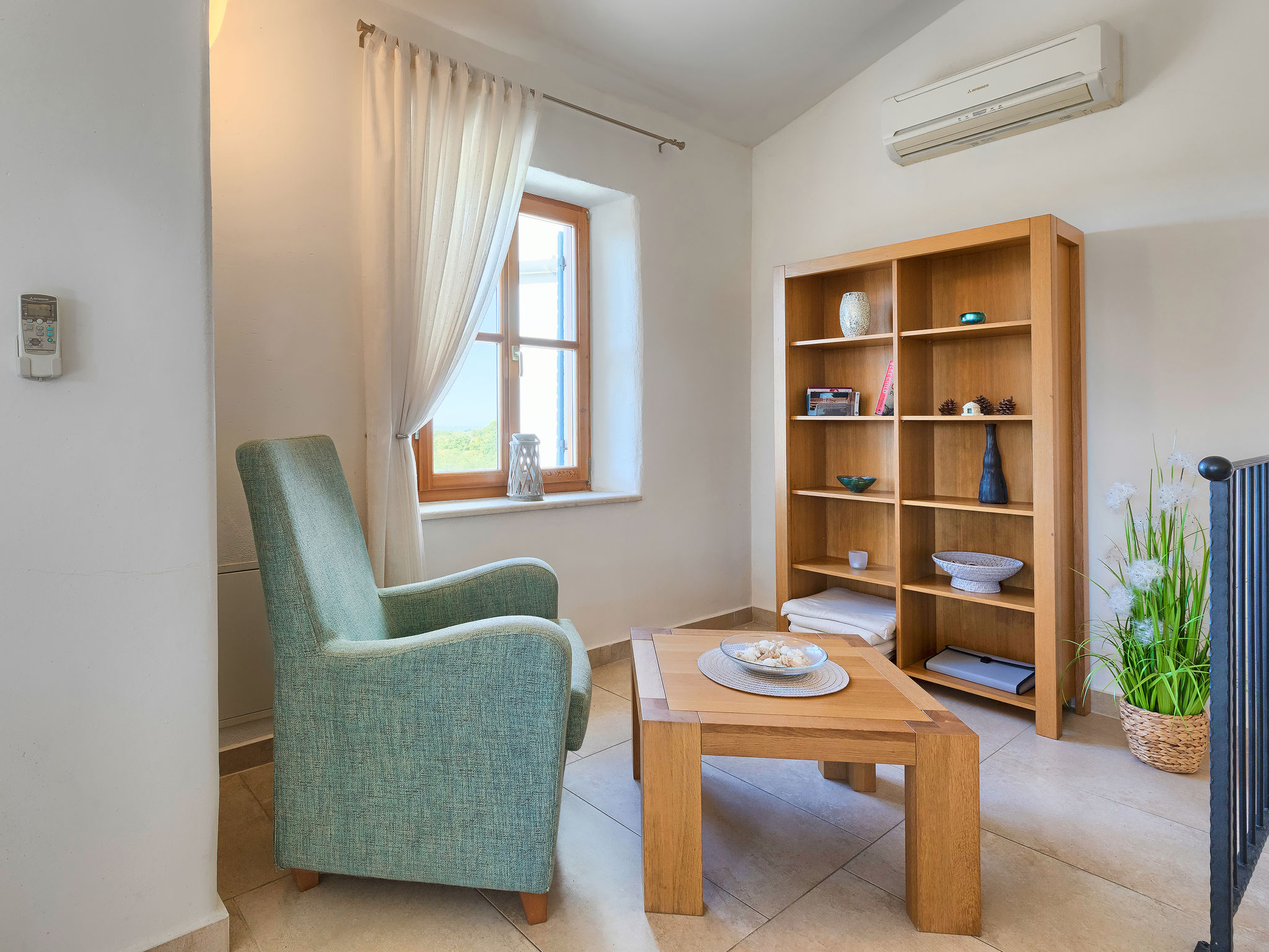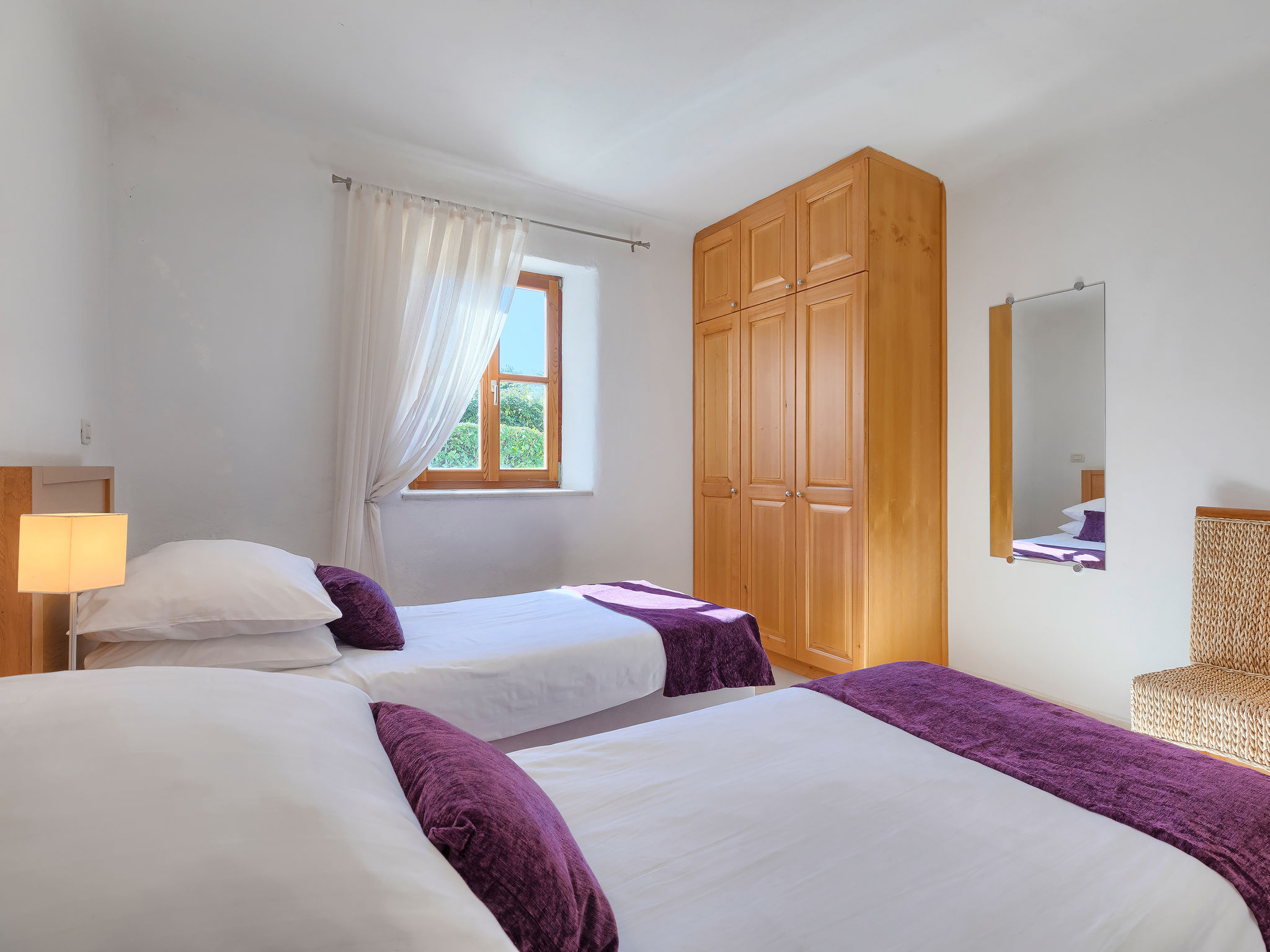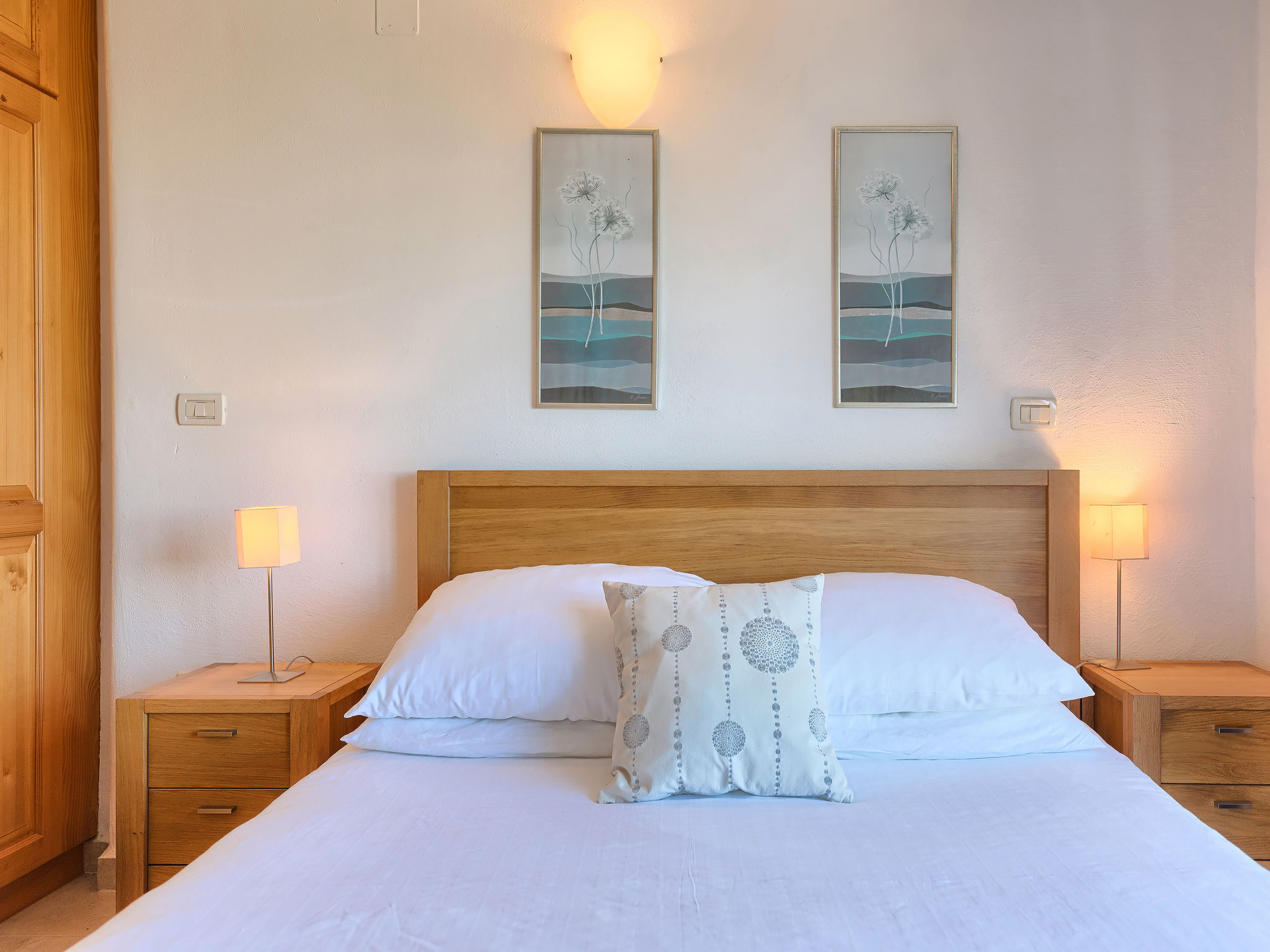 4-Zimmer-Reihenhaus 101 m2 auf 2 Stockwerken. Geschmackvoll und gemütlich eingerichtet: 1 Zimmer mit 1 franz. Bett (160 cm, Länge 200 cm), Klimaanlage. Ausgang zur Terrasse. 2 Zimmer, jedes Zimmer mit 2 Betten (80 cm, Länge 200 cm). Dusche/WC, Bad/Dusche/WC. Obergeschoss: Wohn-/Esszimmer 50 m2 mit Sat-TV (Flachbildschirm), Klimaanlage. Ausgang zur Terrasse. Offene Küche (Backofen, Geschirrspüler, 4 Glaskeramikherd Platten, Mikrowelle, Tiefkühler). Sep. WC. Bodenheizung. Terrasse 20 m2, Terrasse 12 m2. Terrassenmöbel, Liegestühle. Fernsicht auf das Meer. Zur Verfügung: Safe. Internet (Wireless LAN, gratis).