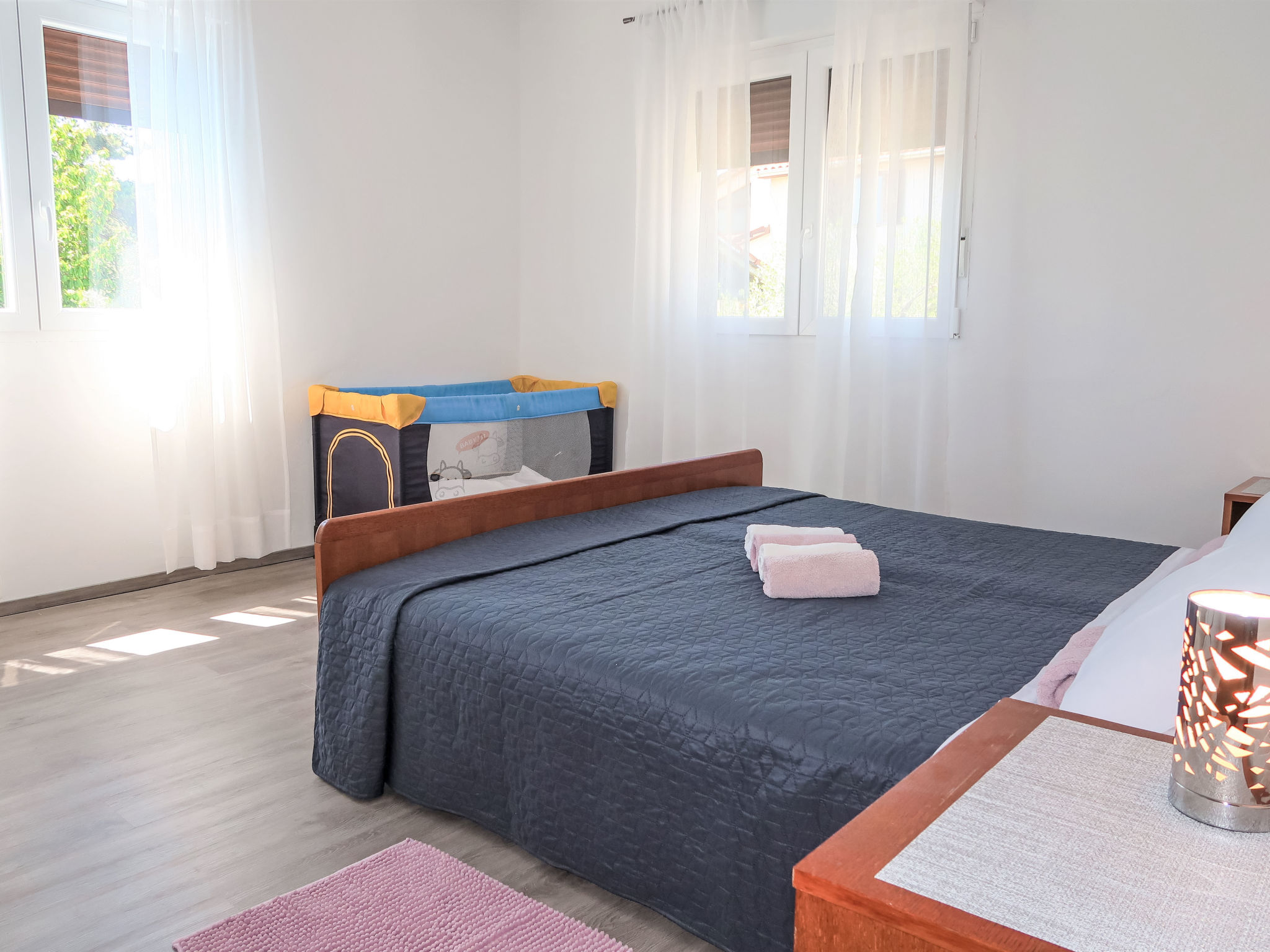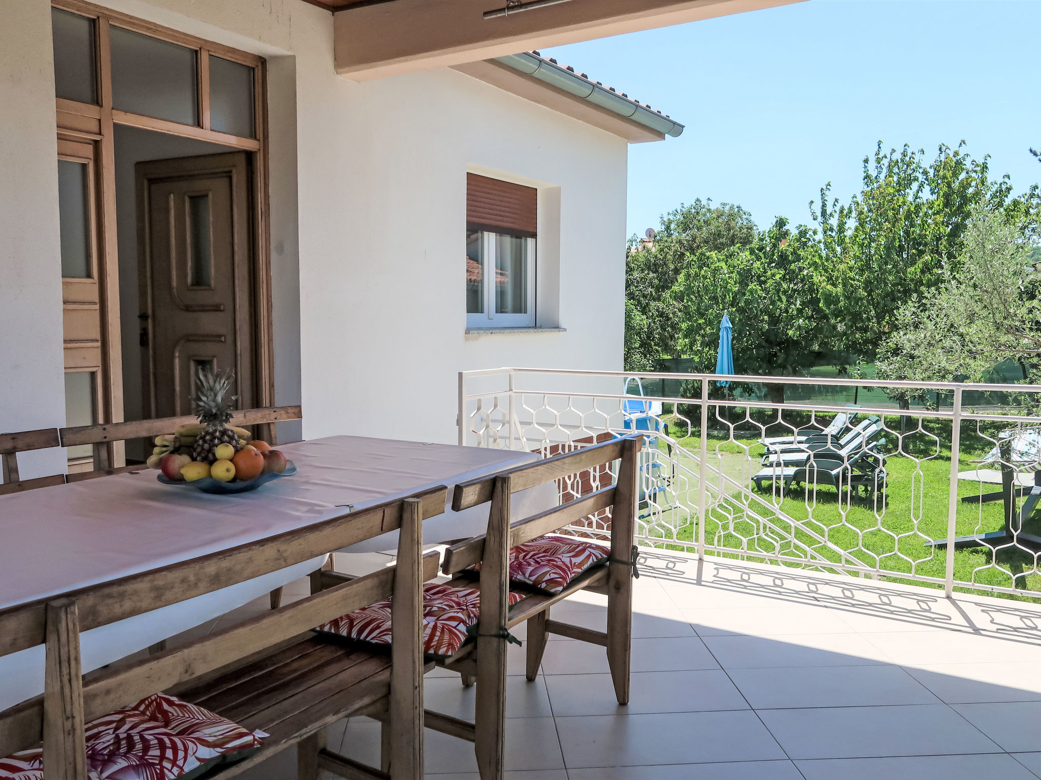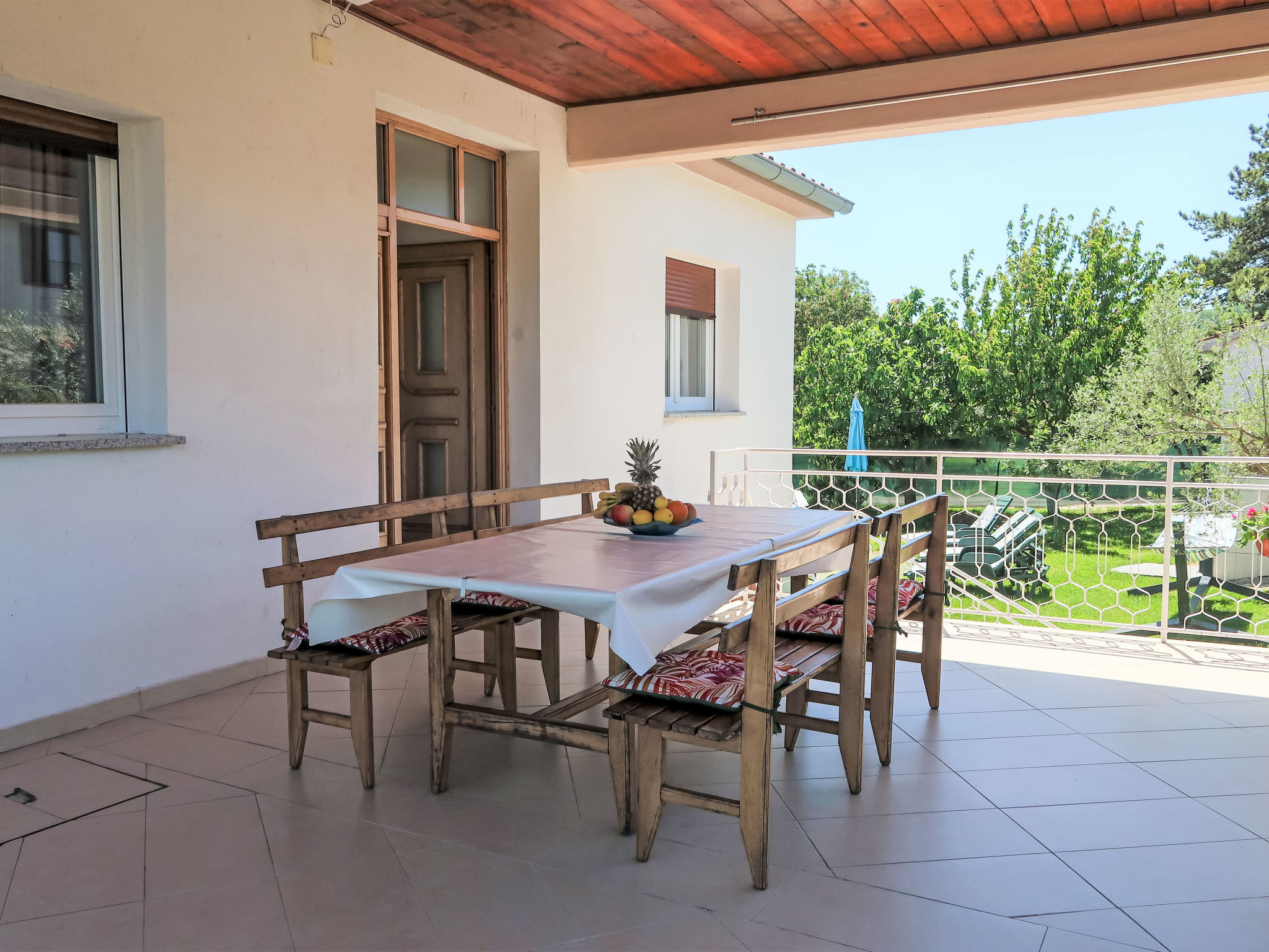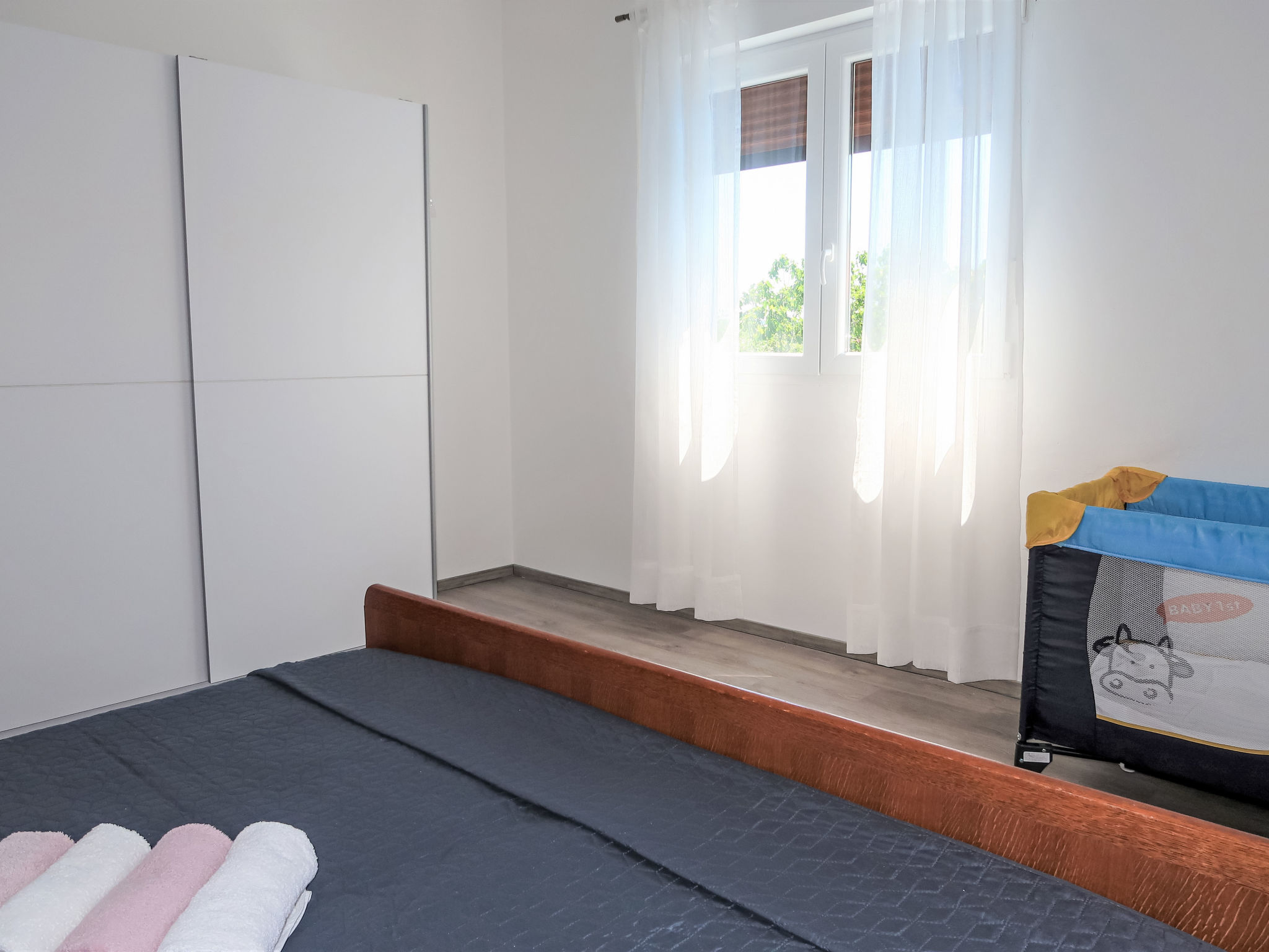 3-Zimmer-Haus 75 m2. Wohn-/Esszimmer mit 1 Doppeldiwanbett (140 cm, Länge 200 cm), Sat-TV und Klimaanlage. 2 Zimmer, jedes Zimmer mit 1 Doppelbett (2 x 80 cm, Länge 200 cm). Offene Küche (Backofen, Geschirrspüler, 4 Glaskeramikherd Platten, Toaster, Wasserkocher, Mikrowelle, Tiefkühler, elektrische Kaffeemaschine). Dusche/WC. Terrasse 30 m2 teilweise überdacht. Terrassenmöbel, Liegestühle. Zur Verfügung: Bügeleisen, Kinderhochstuhl, Babybett. Internet (Wireless LAN, gratis). Bitte beachten: Nichtraucher-Haus.