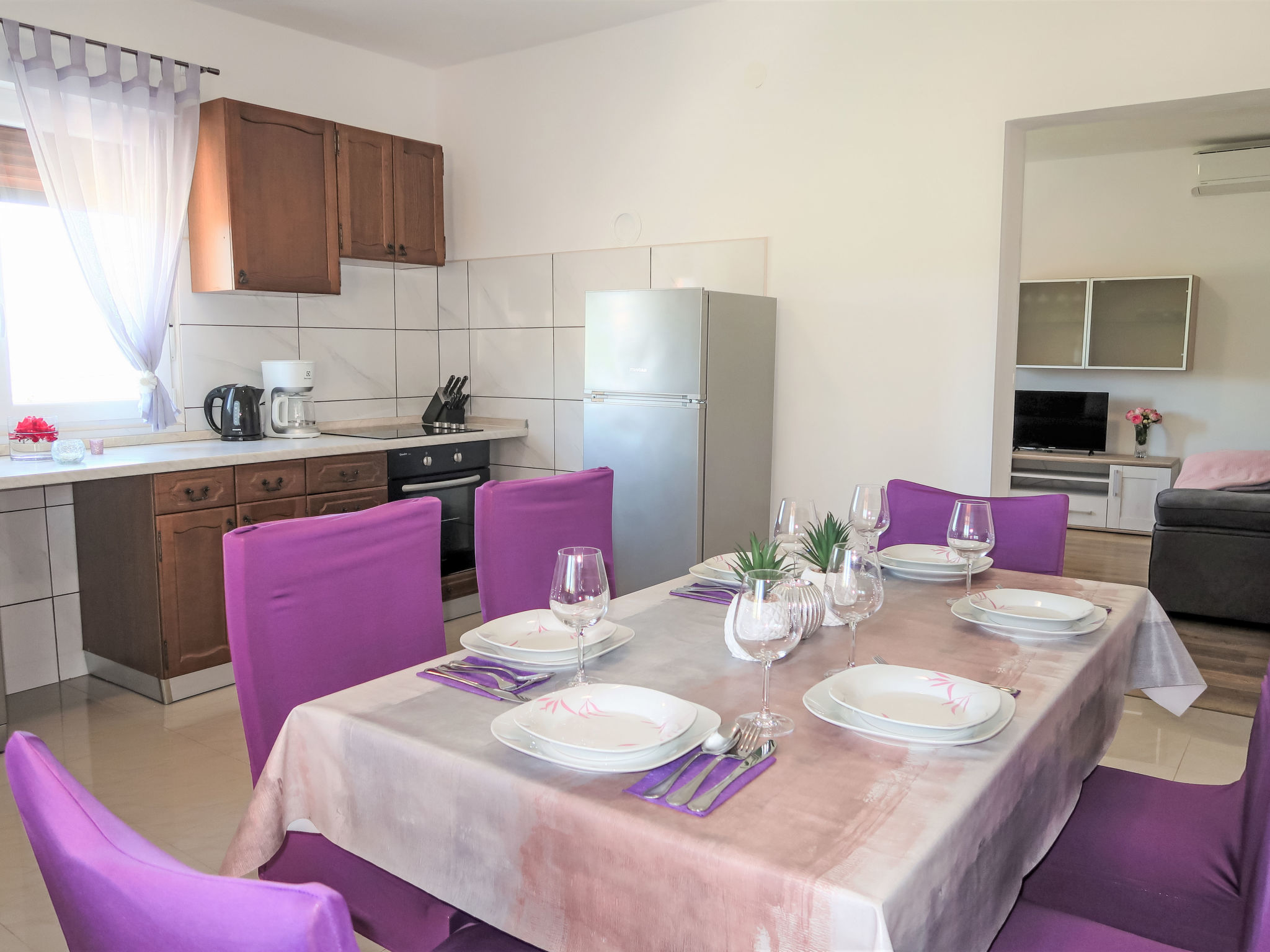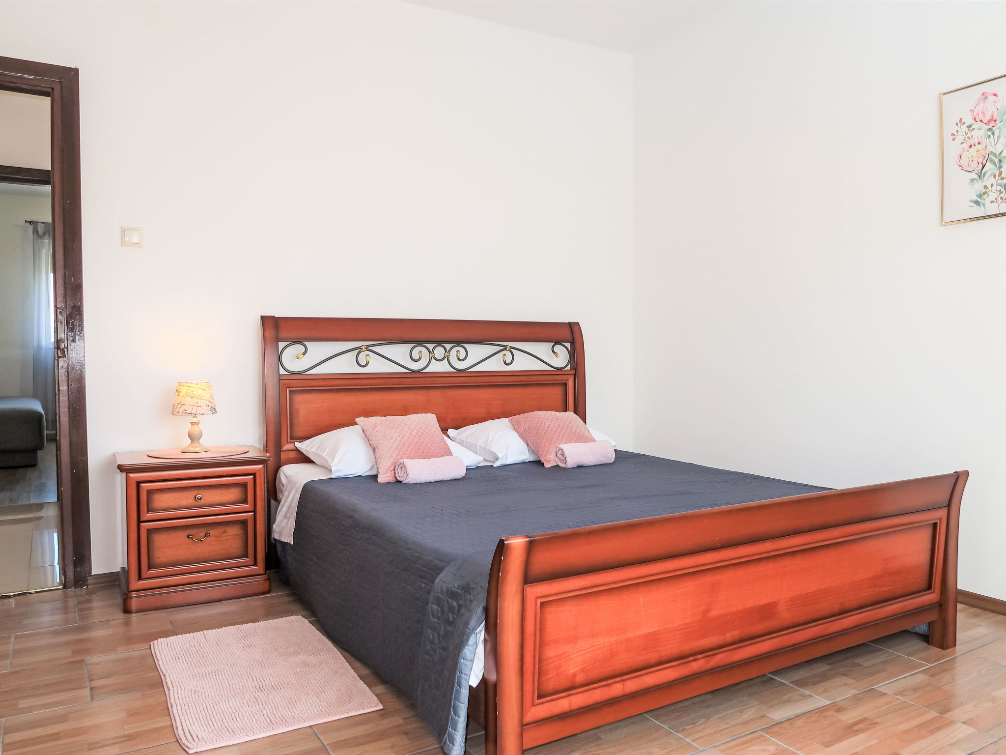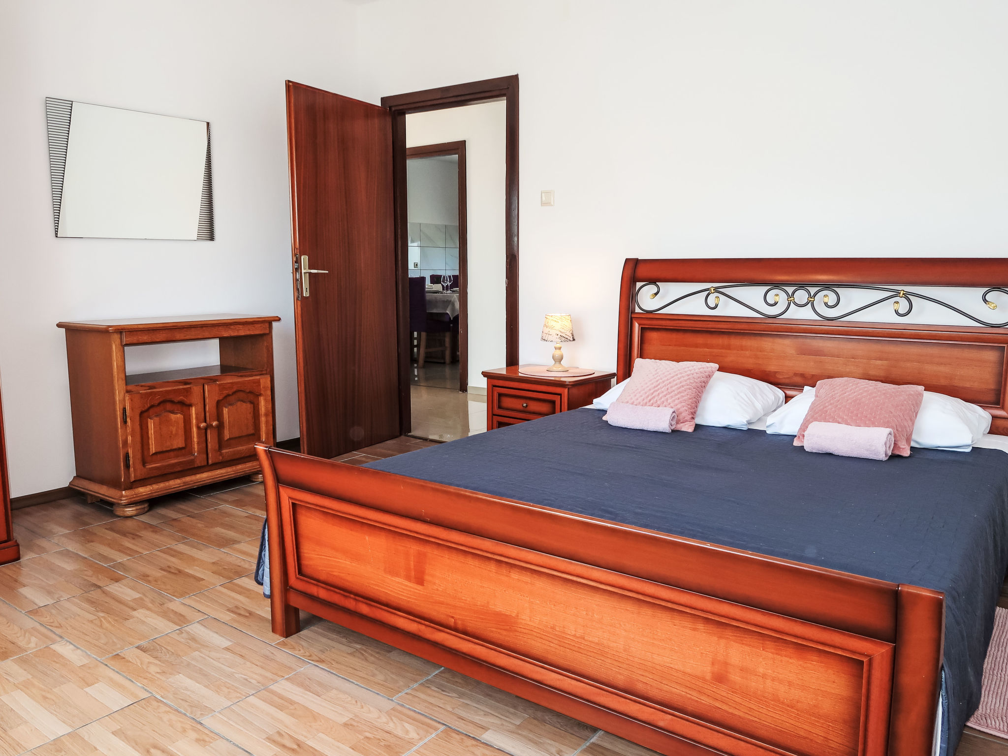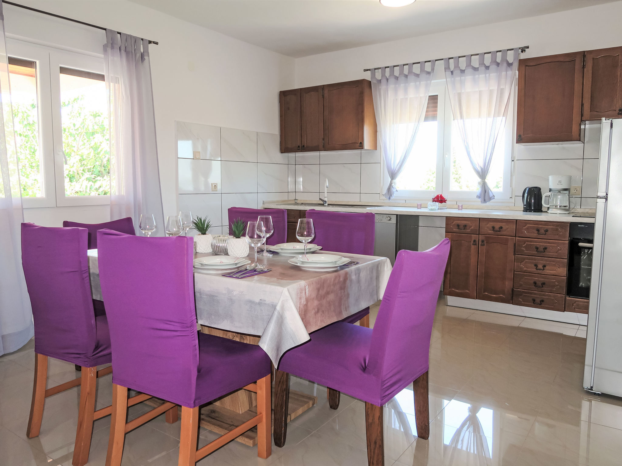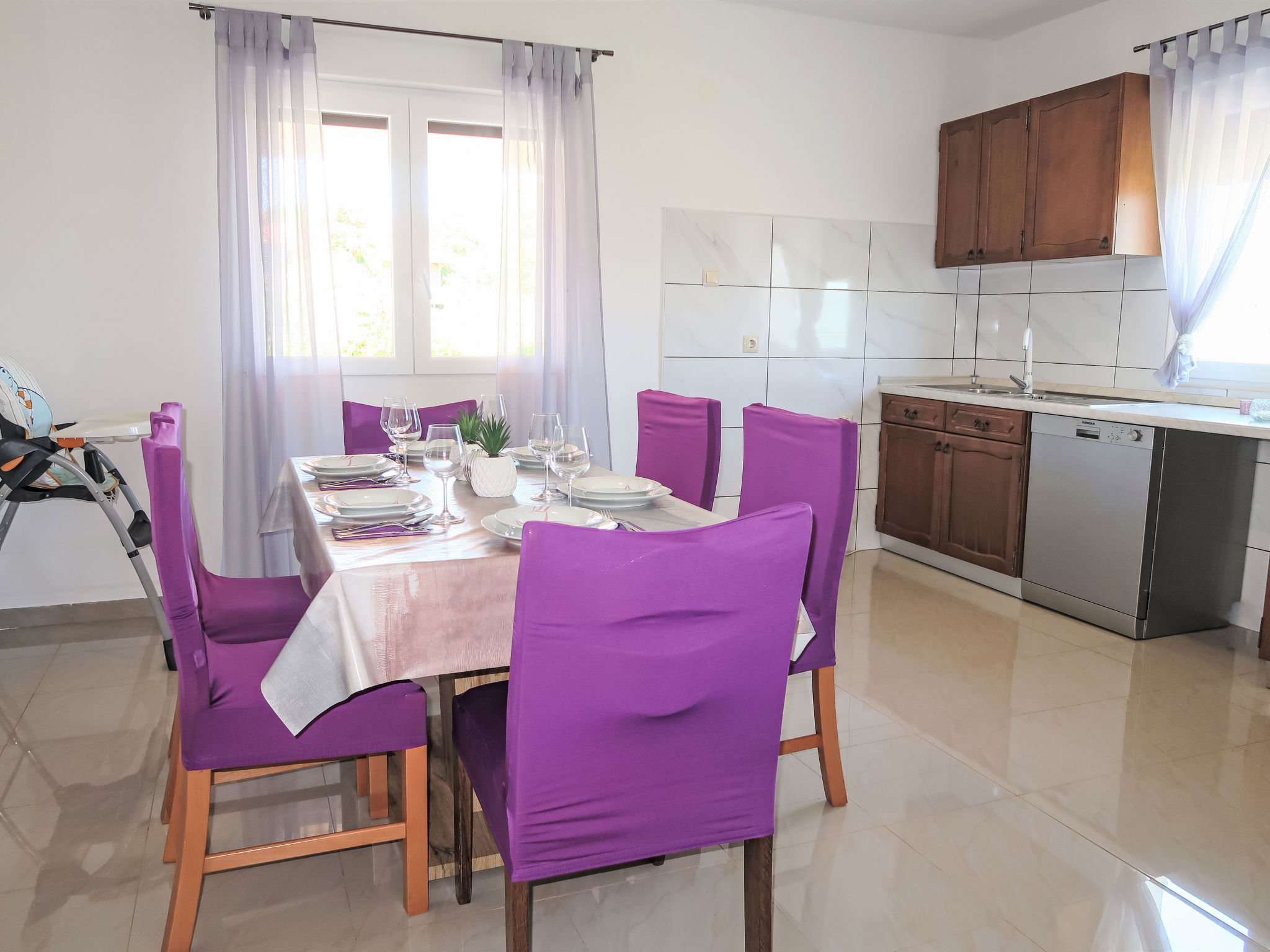 3-Zimmer-Haus 75 m2. Wohn-/Esszimmer mit 1 Doppeldiwanbett (140 cm, Länge 200 cm), Sat-TV und Klimaanlage. 2 Zimmer, jedes Zimmer mit 1 Doppelbett (2 x 80 cm, Länge 200 cm). Offene Küche (Backofen, Geschirrspüler, 4 Glaskeramikherd Platten, Toaster, Wasserkocher, Mikrowelle, Tiefkühler, elektrische Kaffeemaschine). Dusche/WC. Terrasse 30 m2 teilweise überdacht. Terrassenmöbel, Liegestühle. Zur Verfügung: Bügeleisen, Kinderhochstuhl, Babybett. Internet (Wireless LAN, gratis). Bitte beachten: Nichtraucher-Haus.