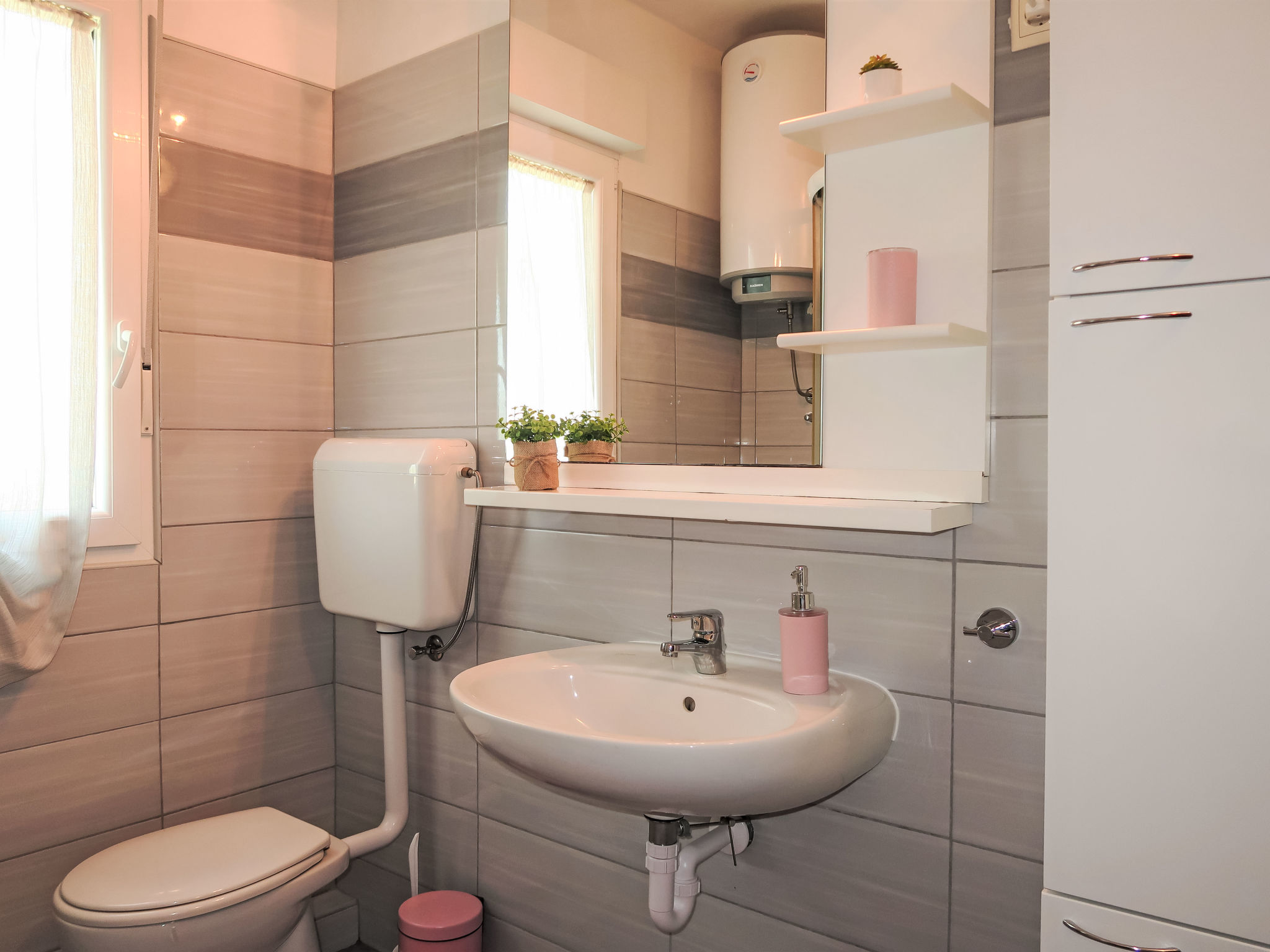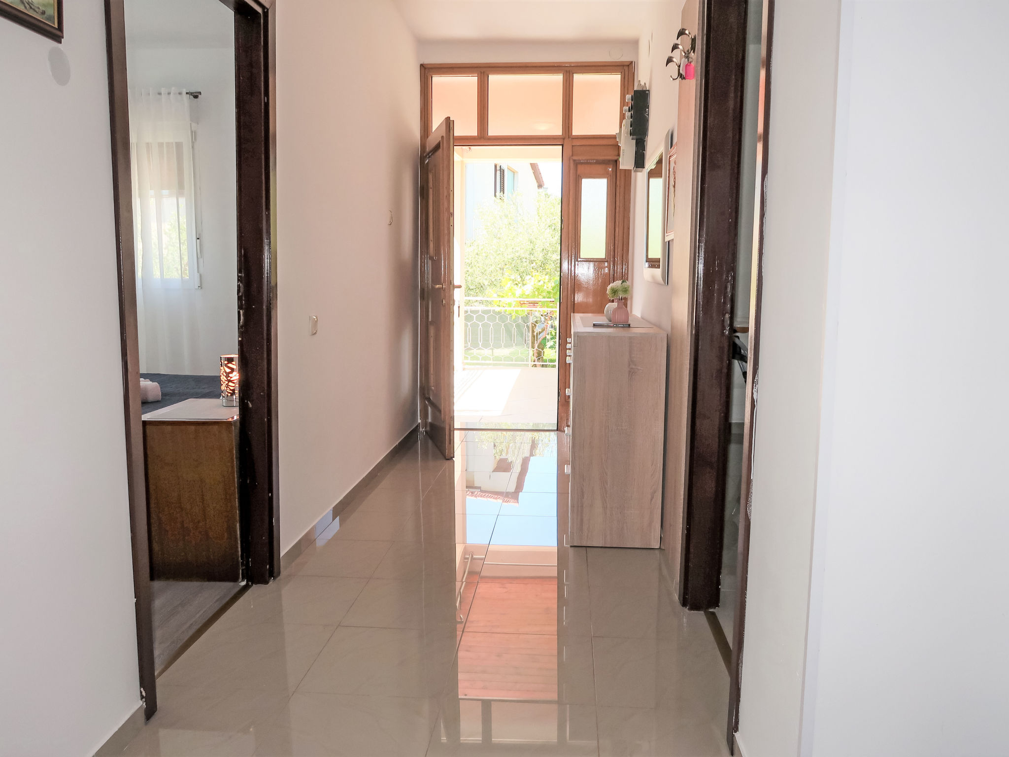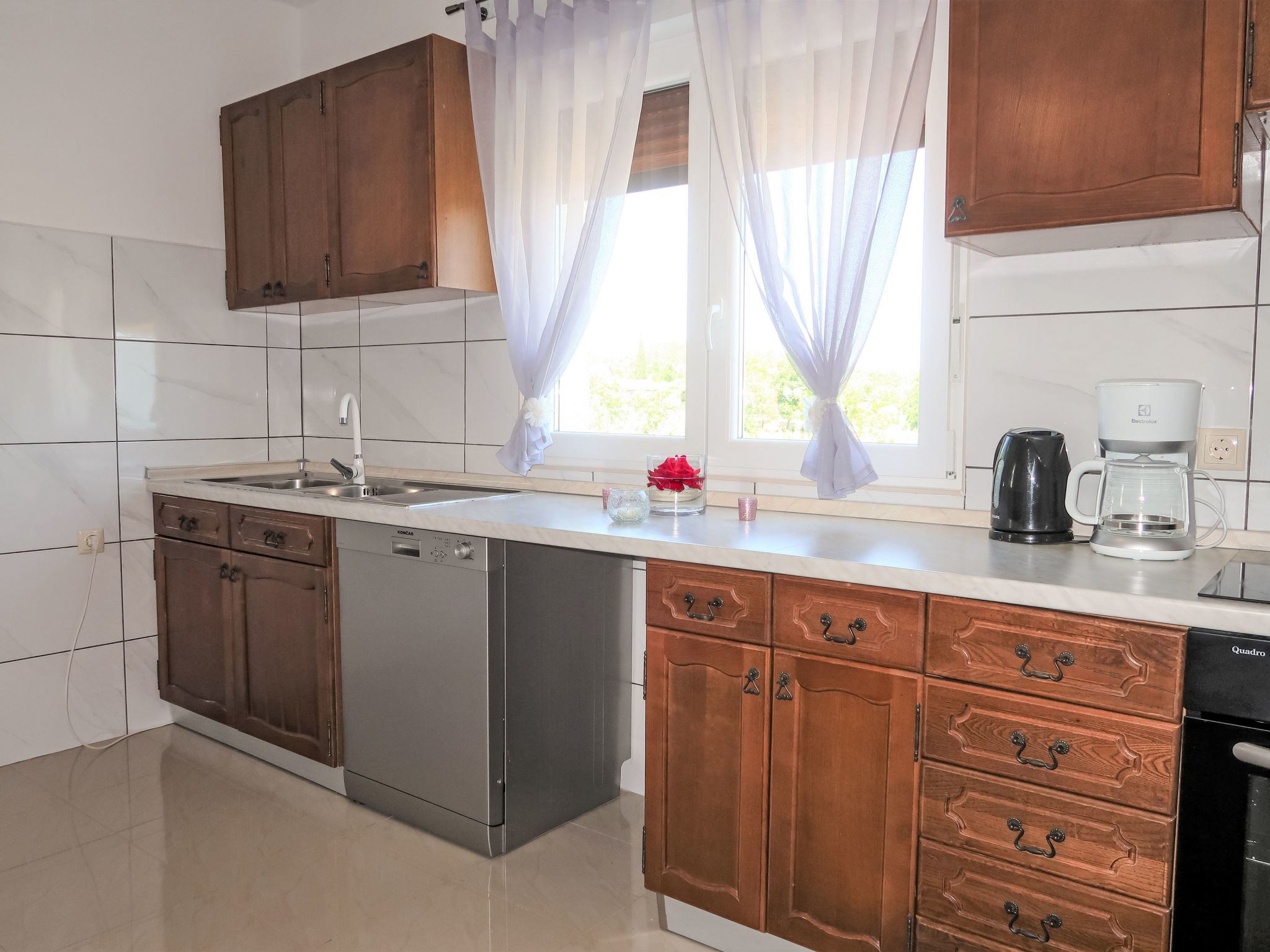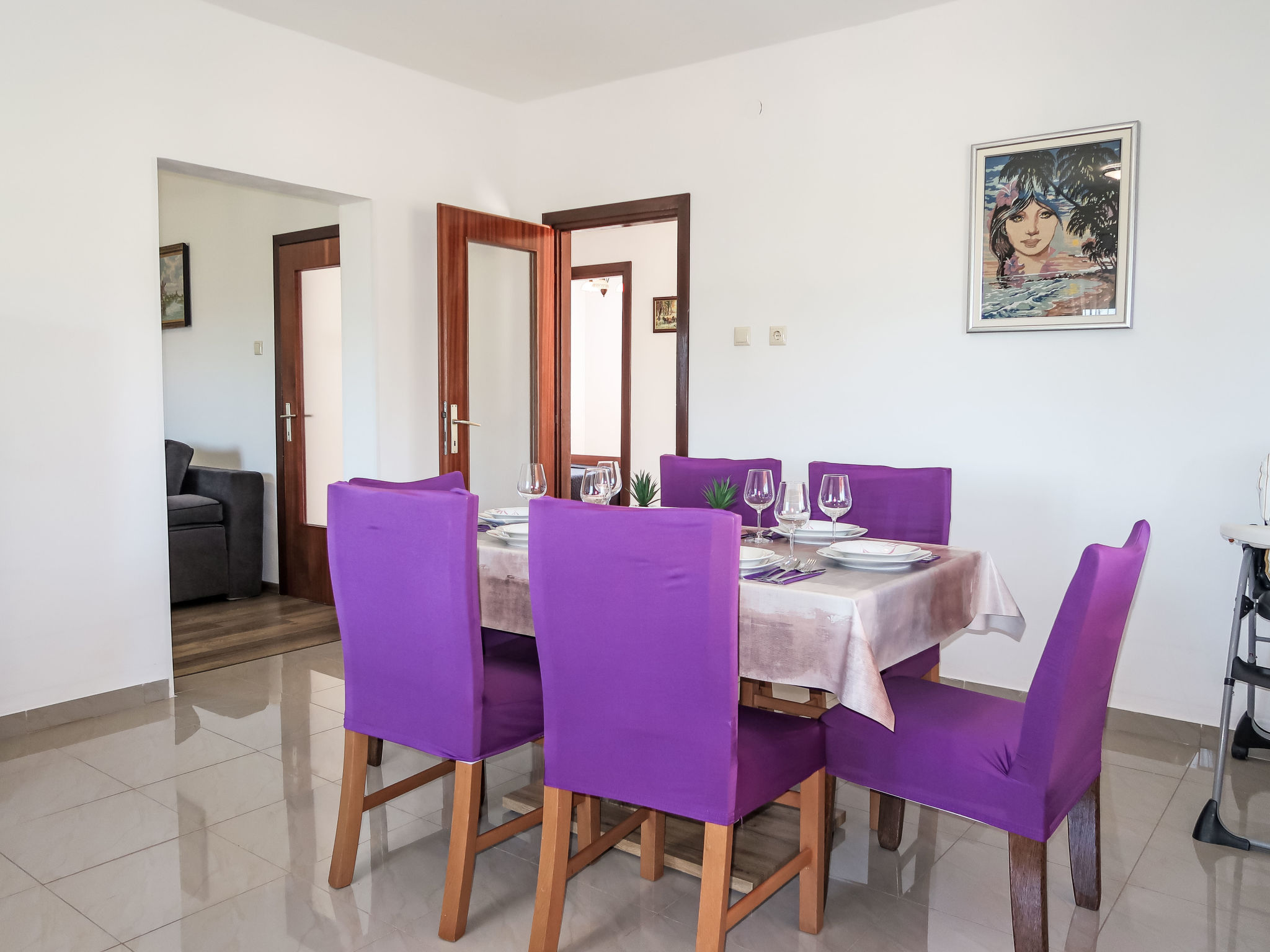 3-Zimmer-Haus 75 m2. Wohn-/Esszimmer mit 1 Doppeldiwanbett (140 cm, Länge 200 cm), Sat-TV und Klimaanlage. 2 Zimmer, jedes Zimmer mit 1 Doppelbett (2 x 80 cm, Länge 200 cm). Offene Küche (Backofen, Geschirrspüler, 4 Glaskeramikherd Platten, Toaster, Wasserkocher, Mikrowelle, Tiefkühler, elektrische Kaffeemaschine). Dusche/WC. Terrasse 30 m2 teilweise überdacht. Terrassenmöbel, Liegestühle. Zur Verfügung: Bügeleisen, Kinderhochstuhl, Babybett. Internet (Wireless LAN, gratis). Bitte beachten: Nichtraucher-Haus.