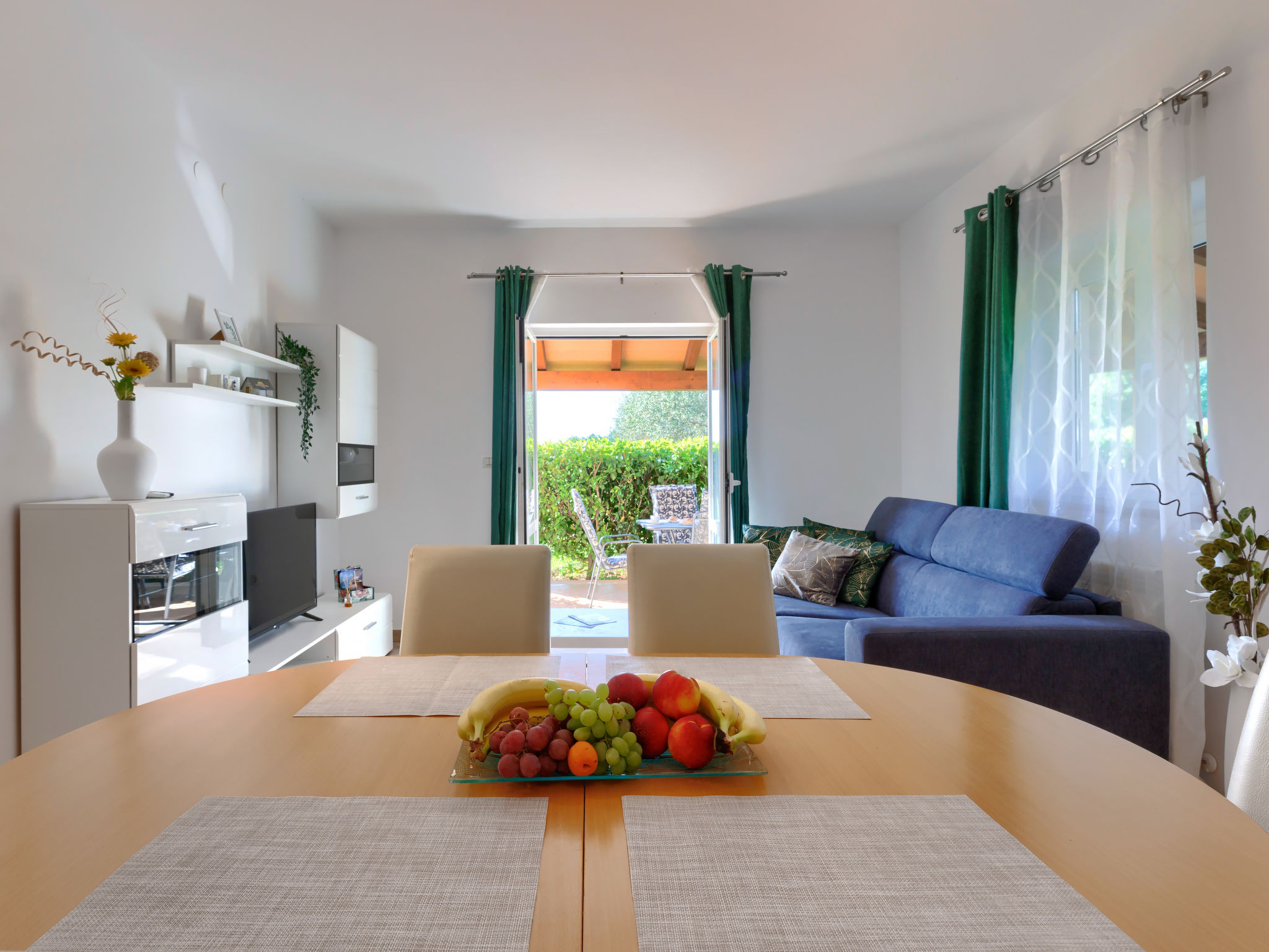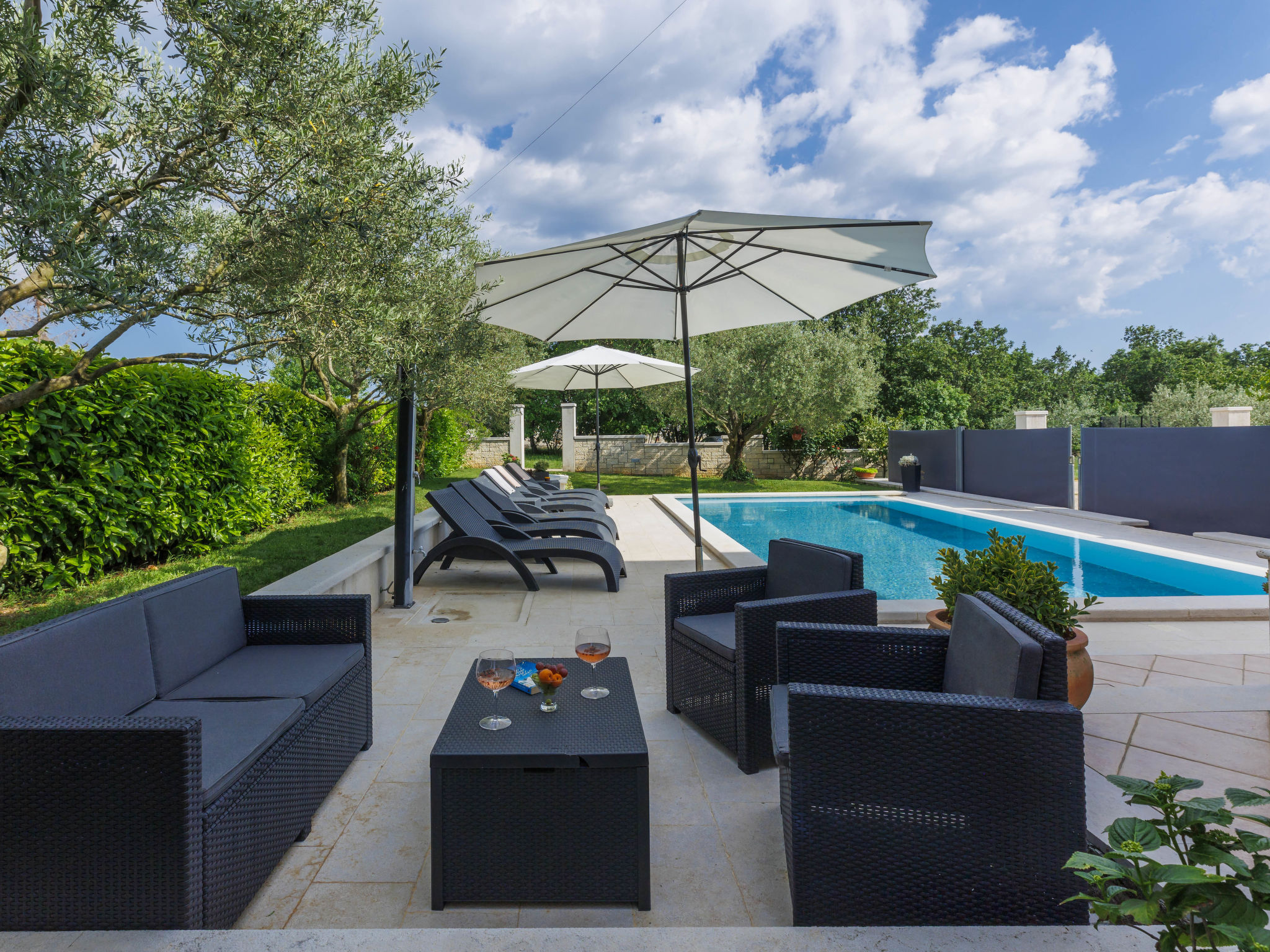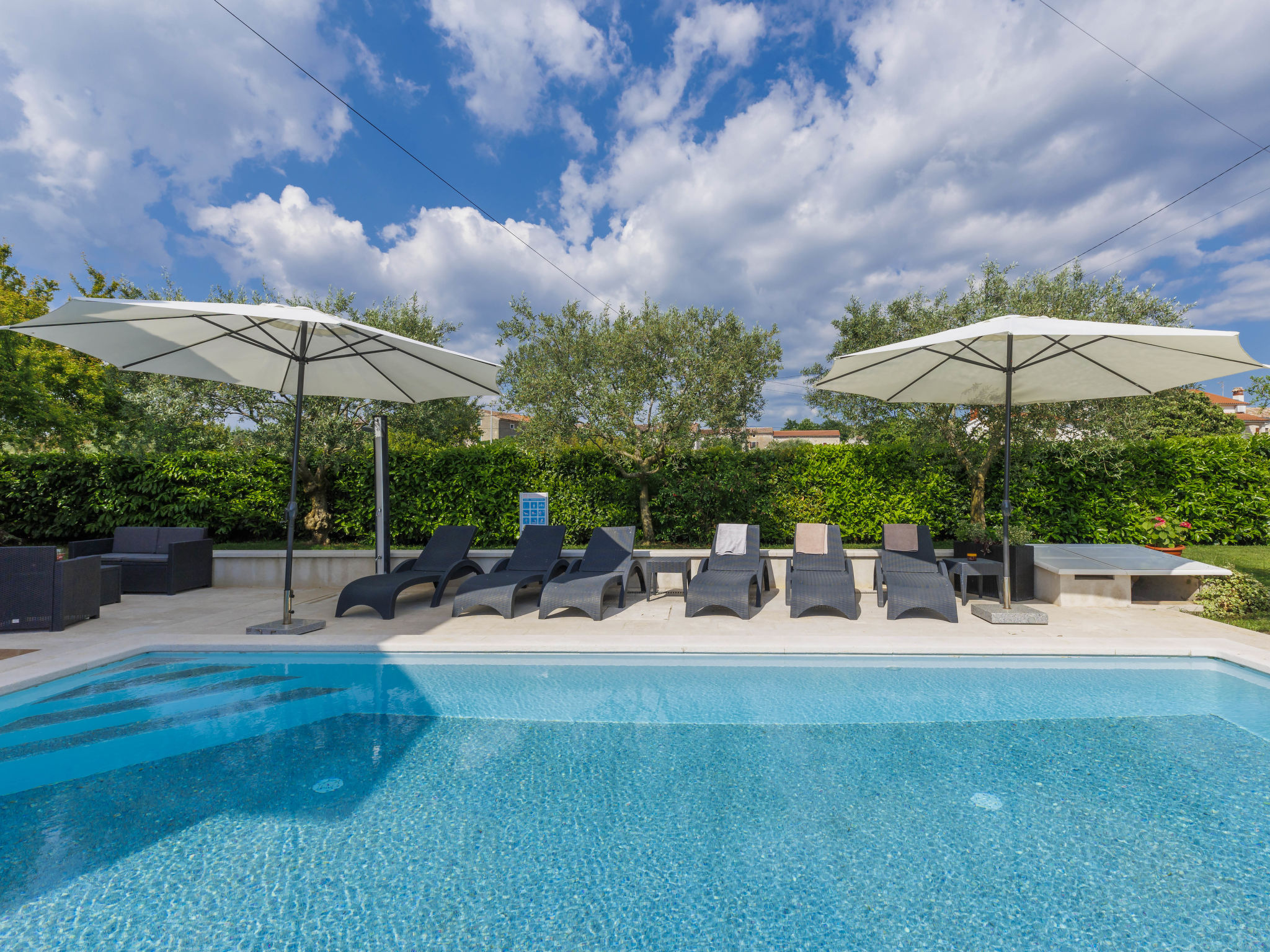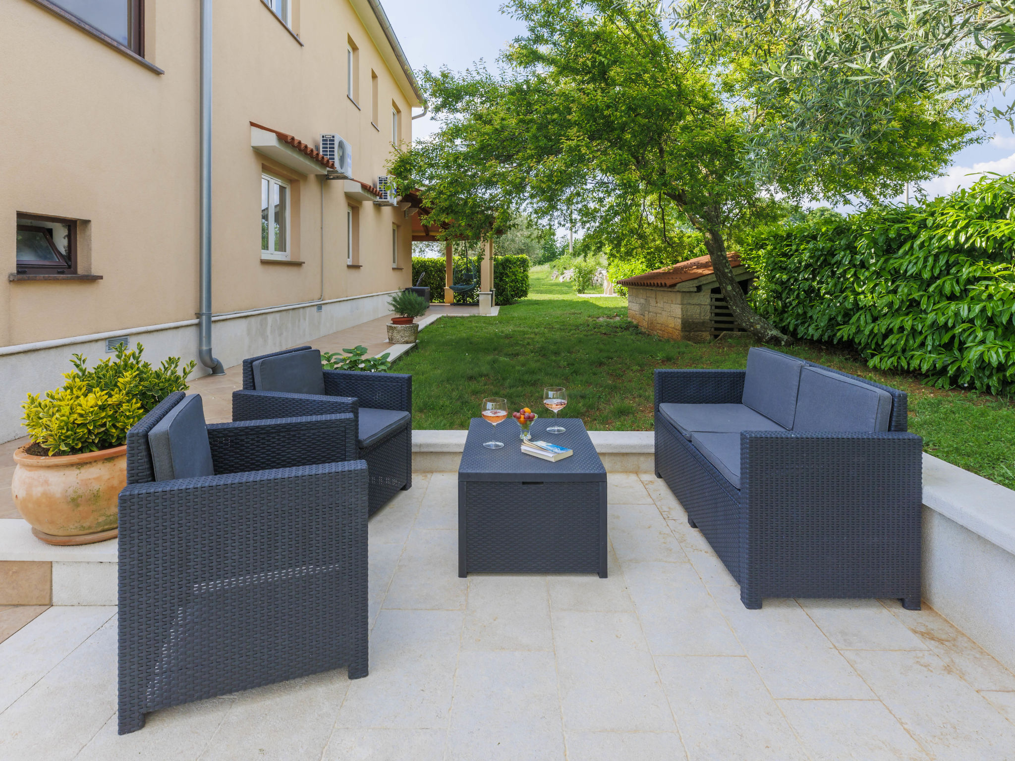 4-Zimmer-Wohnung 120 m2, im Erdgeschoss. Renoviert im Jahre 2018, geschmackvoll eingerichtet: Wohn-/Esszimmer 25 m2 mit Sat-TV (Flachbildschirm), Klimaanlage. Ausgang zur Terrasse. 1 Zimmer mit 1 Doppelbett (2 x 80 cm, Länge 200 cm), sep. WC und Klimaanlage. Ausgang zum Schwimmbad. 1 Zimmer mit 1 Doppelbett (2 x 80 cm, Länge 200 cm), Dusche/WC und Klimaanlage. 1 Zimmer mit 1 Doppelbett (2 x 80 cm, Länge 200 cm), Klimaanlage. Offene Küche (4 Kochplatten, Backofen, Geschirrspüler, Mikrowelle, Tiefkühler, elektrische Kaffeemaschine). Dusche/Bidet/WC. Heizung. Terrasse 15 m2, überdacht. Terrassenmöbel, Liegestühle. Sicht auf den Garten. Zur Verfügung: Waschmaschine, Bügeleisen, Kinderhochstuhl, Babybett, Haartrockner. Internet (Wireless LAN, gratis). Bitte beachten: eigener Eingang.