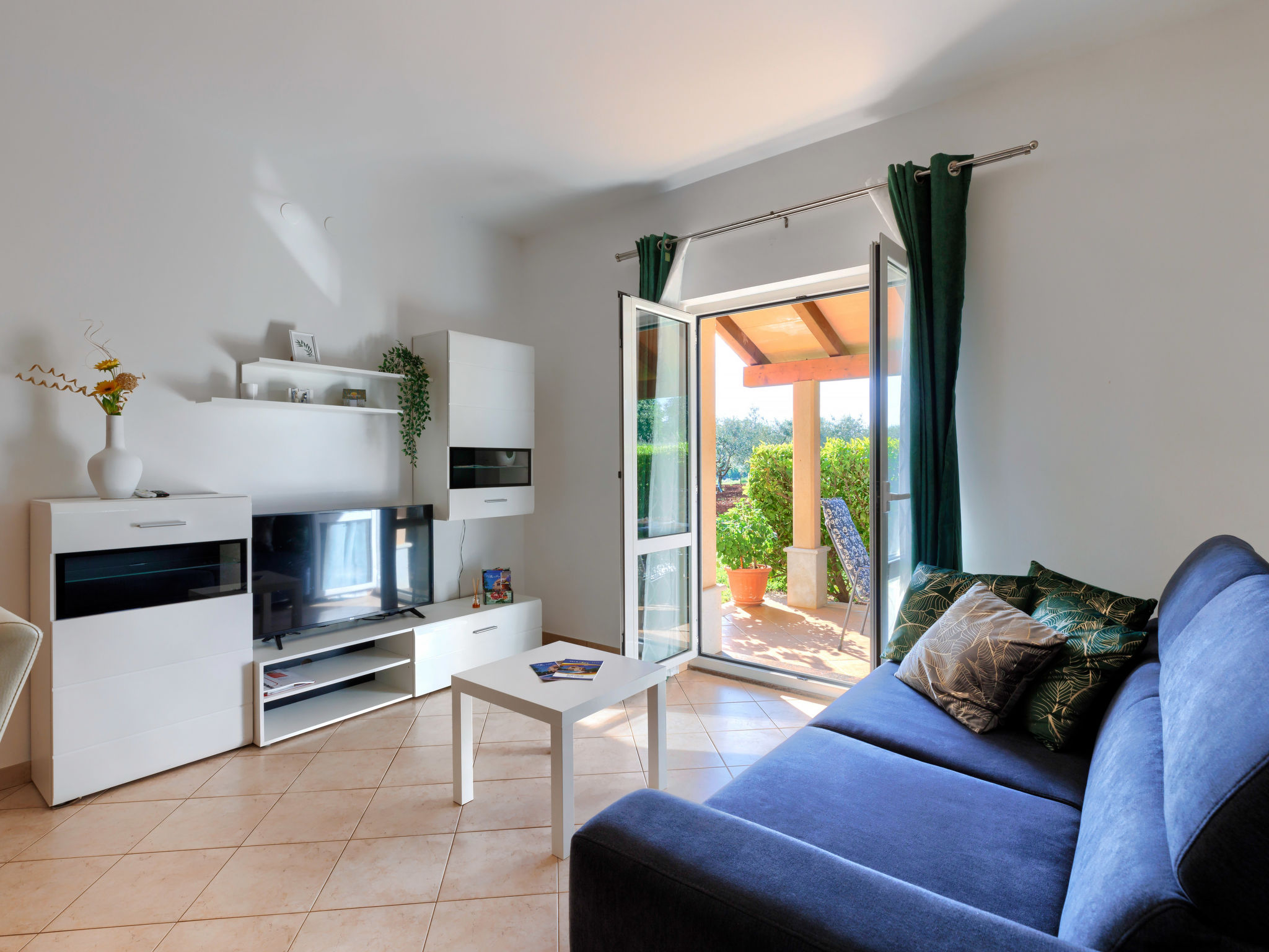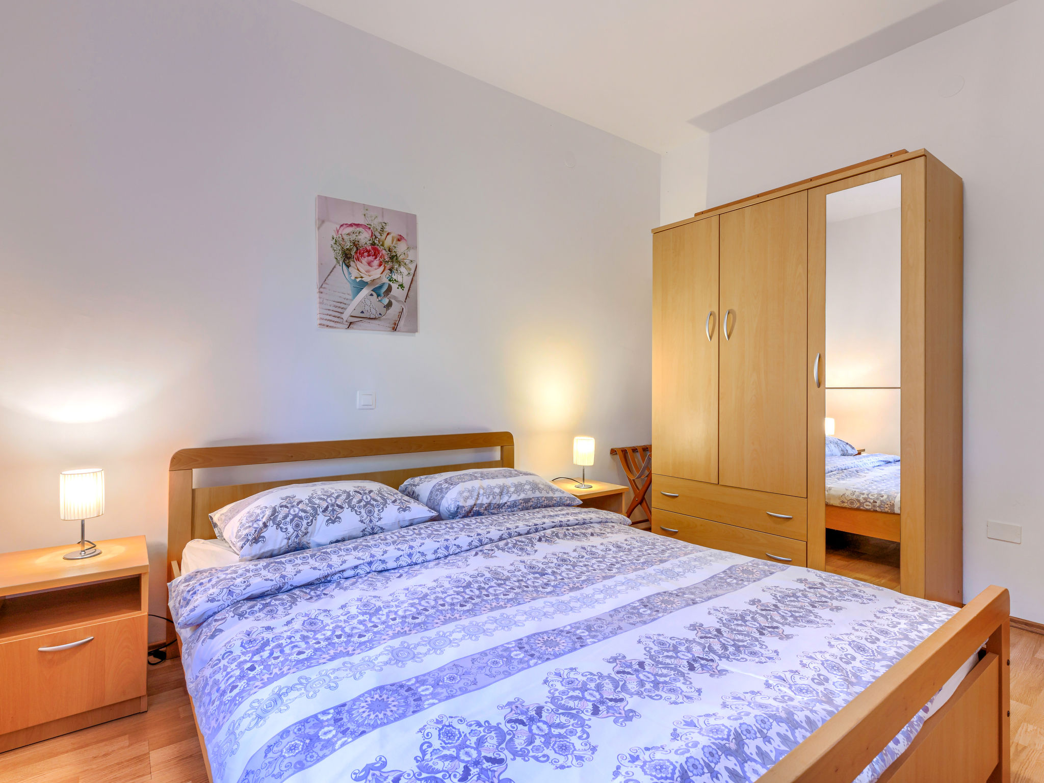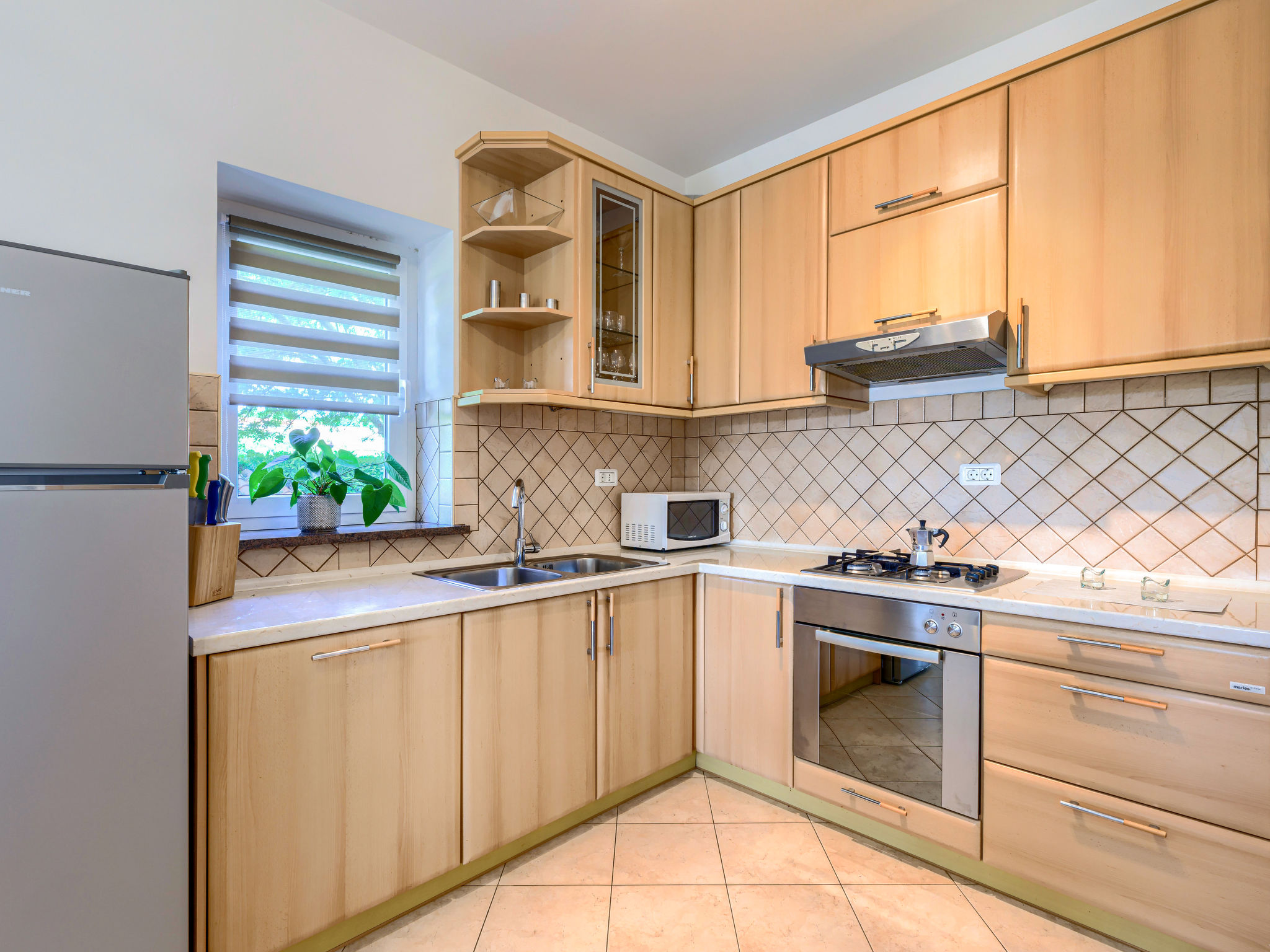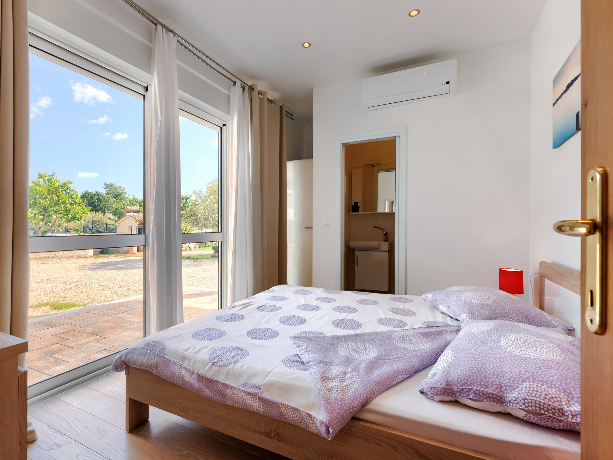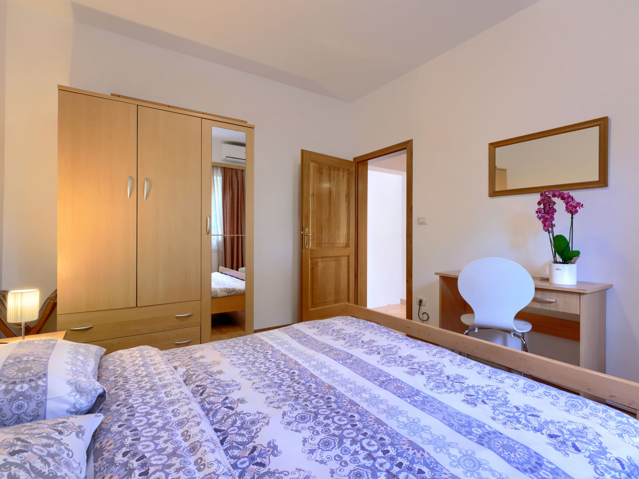 4-Zimmer-Wohnung 120 m2, im Erdgeschoss. Renoviert im Jahre 2018, geschmackvoll eingerichtet: Wohn-/Esszimmer 25 m2 mit Sat-TV (Flachbildschirm), Klimaanlage. Ausgang zur Terrasse. 1 Zimmer mit 1 Doppelbett (2 x 80 cm, Länge 200 cm), sep. WC und Klimaanlage. Ausgang zum Schwimmbad. 1 Zimmer mit 1 Doppelbett (2 x 80 cm, Länge 200 cm), Dusche/WC und Klimaanlage. 1 Zimmer mit 1 Doppelbett (2 x 80 cm, Länge 200 cm), Klimaanlage. Offene Küche (4 Kochplatten, Backofen, Geschirrspüler, Mikrowelle, Tiefkühler, elektrische Kaffeemaschine). Dusche/Bidet/WC. Heizung. Terrasse 15 m2, überdacht. Terrassenmöbel, Liegestühle. Sicht auf den Garten. Zur Verfügung: Waschmaschine, Bügeleisen, Kinderhochstuhl, Babybett, Haartrockner. Internet (Wireless LAN, gratis). Bitte beachten: eigener Eingang.
