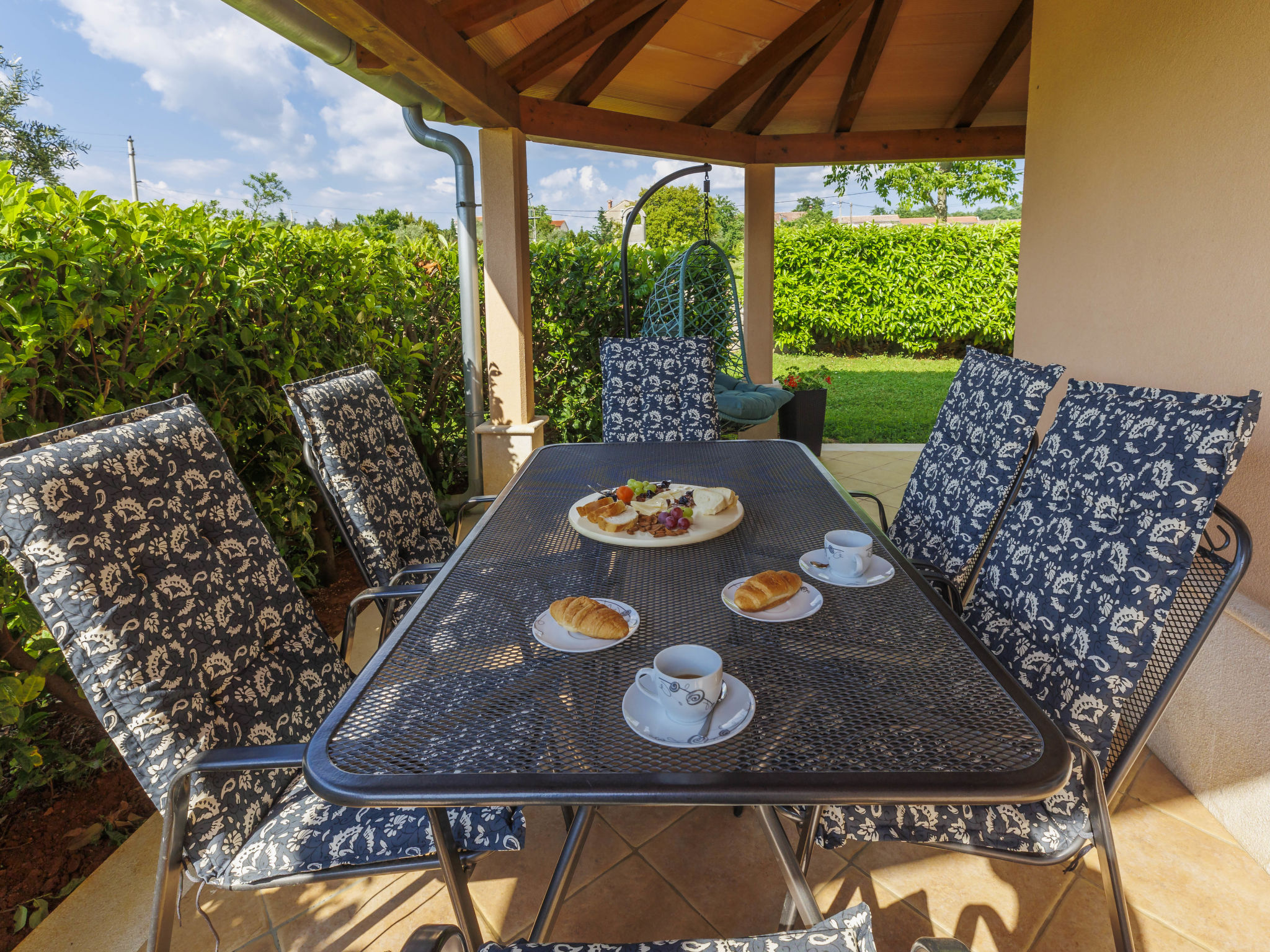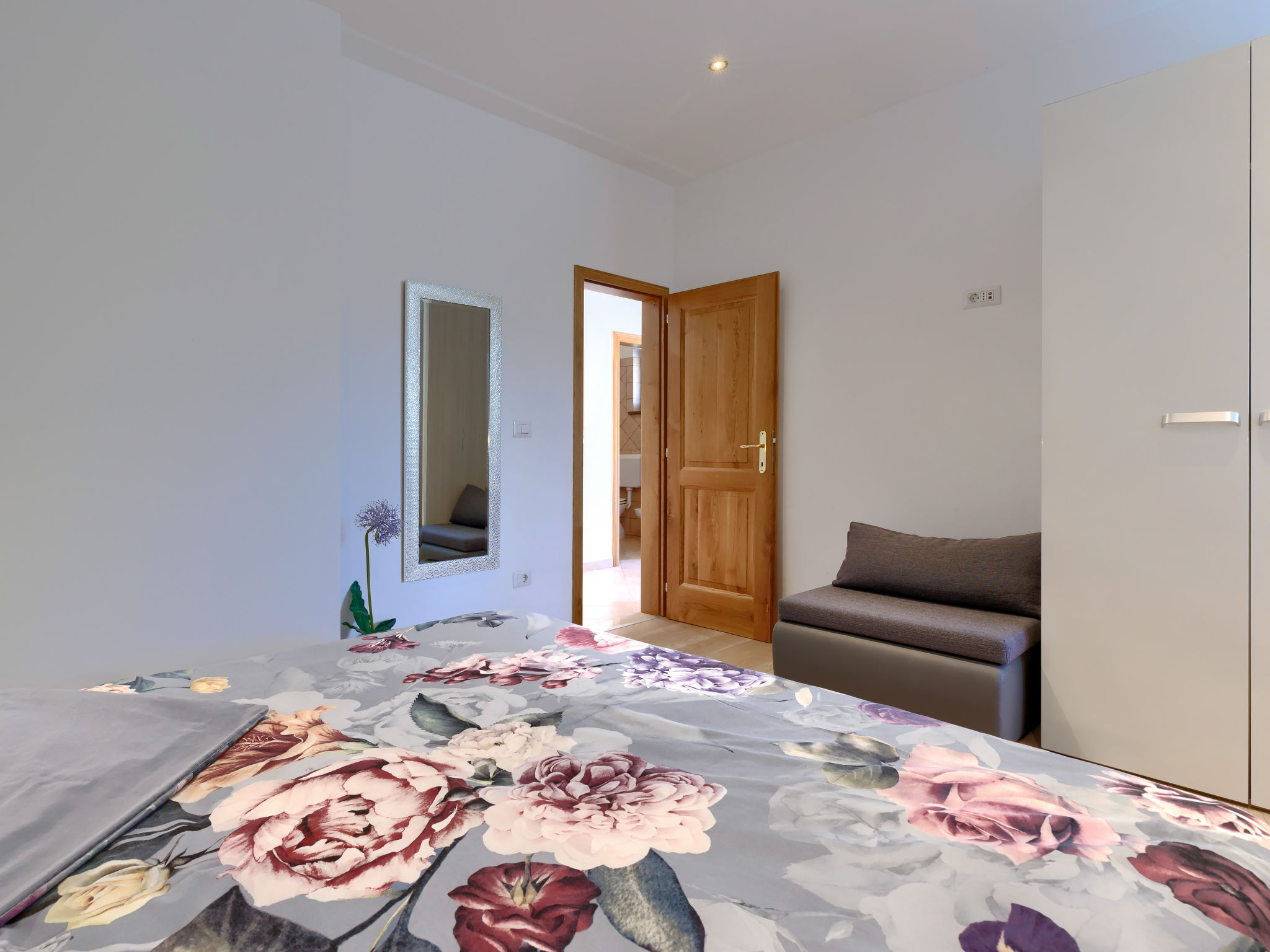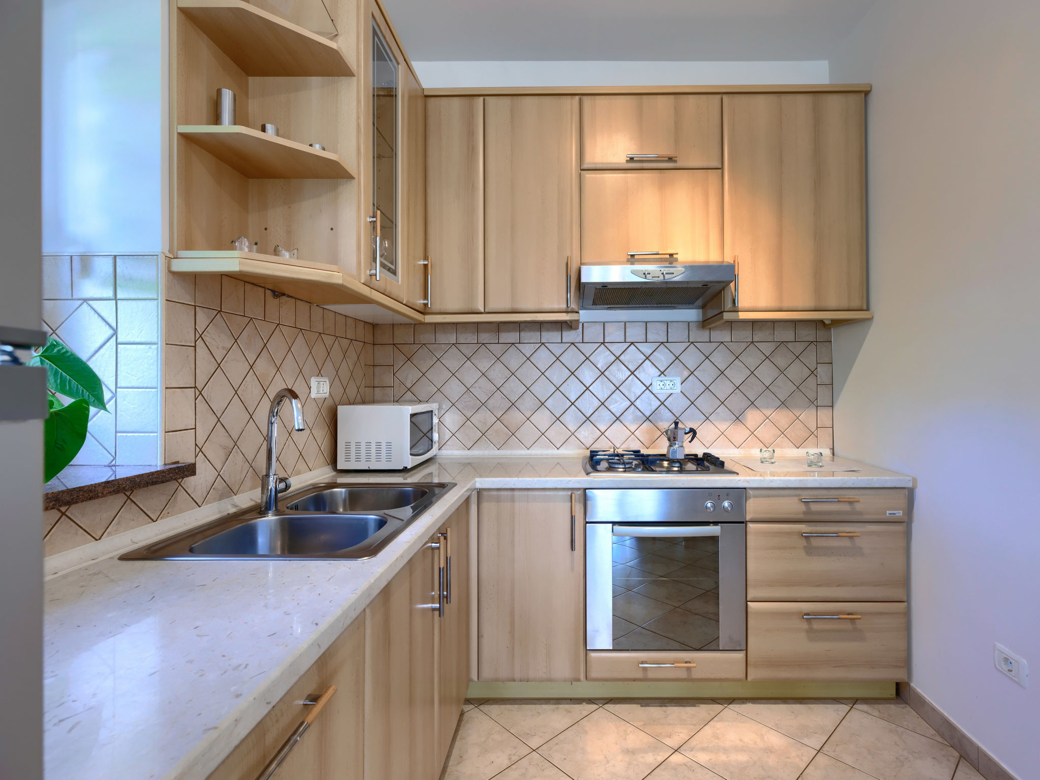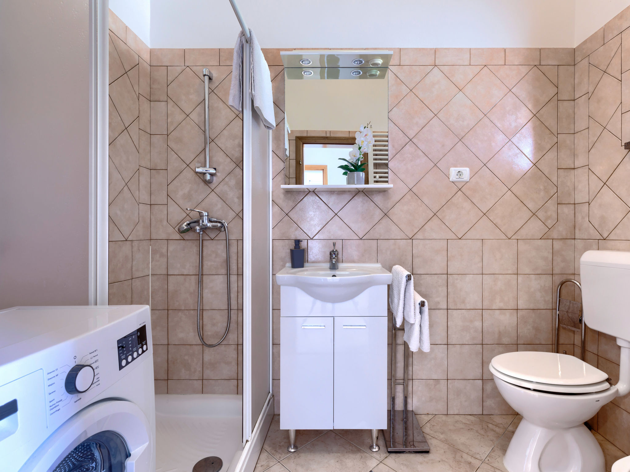 4-Zimmer-Wohnung 120 m2, im Erdgeschoss. Renoviert im Jahre 2018, geschmackvoll eingerichtet: Wohn-/Esszimmer 25 m2 mit Sat-TV (Flachbildschirm), Klimaanlage. Ausgang zur Terrasse. 1 Zimmer mit 1 Doppelbett (2 x 80 cm, Länge 200 cm), sep. WC und Klimaanlage. Ausgang zum Schwimmbad. 1 Zimmer mit 1 Doppelbett (2 x 80 cm, Länge 200 cm), Dusche/WC und Klimaanlage. 1 Zimmer mit 1 Doppelbett (2 x 80 cm, Länge 200 cm), Klimaanlage. Offene Küche (4 Kochplatten, Backofen, Geschirrspüler, Mikrowelle, Tiefkühler, elektrische Kaffeemaschine). Dusche/Bidet/WC. Heizung. Terrasse 15 m2, überdacht. Terrassenmöbel, Liegestühle. Sicht auf den Garten. Zur Verfügung: Waschmaschine, Bügeleisen, Kinderhochstuhl, Babybett, Haartrockner. Internet (Wireless LAN, gratis). Bitte beachten: eigener Eingang.
