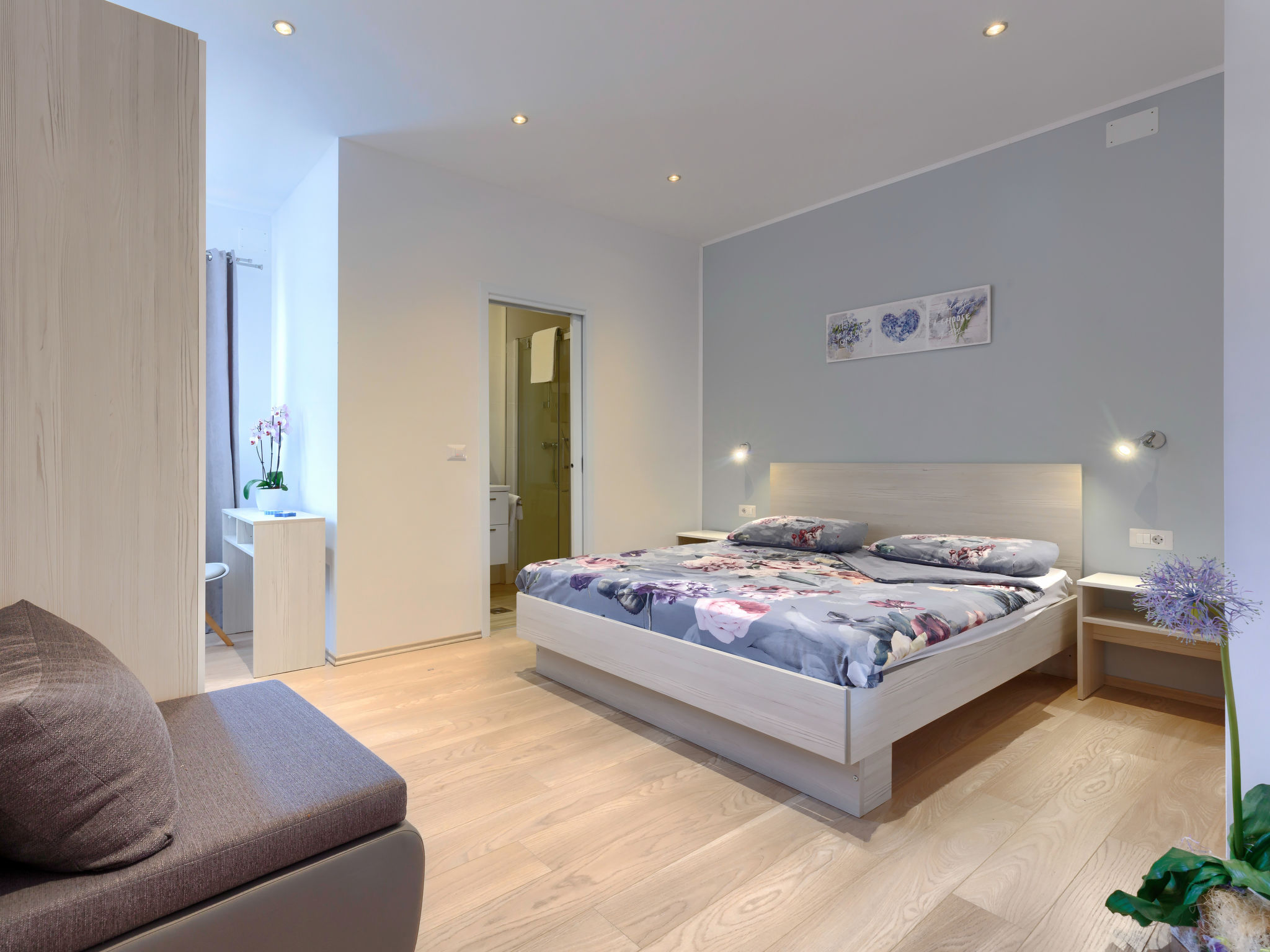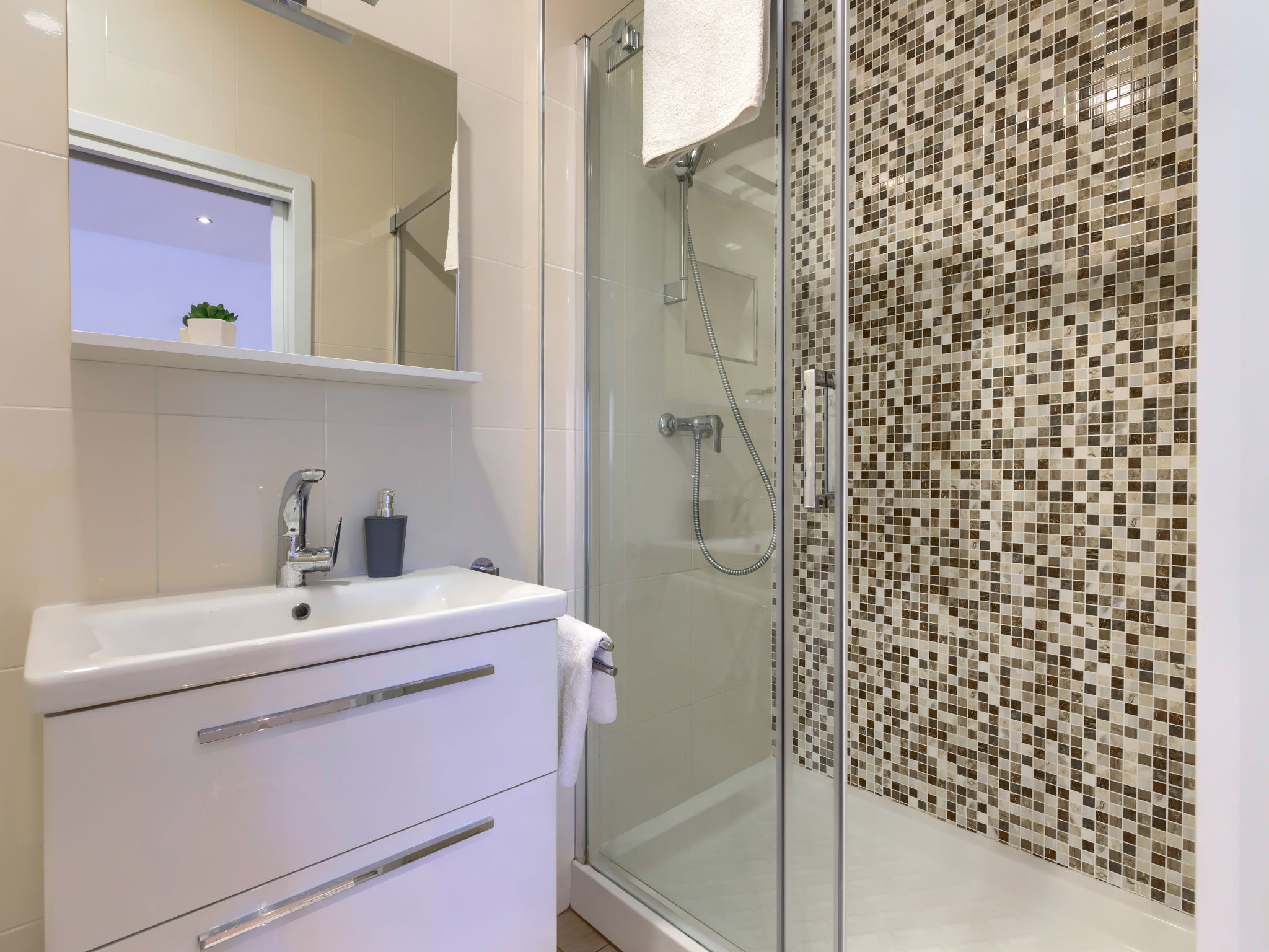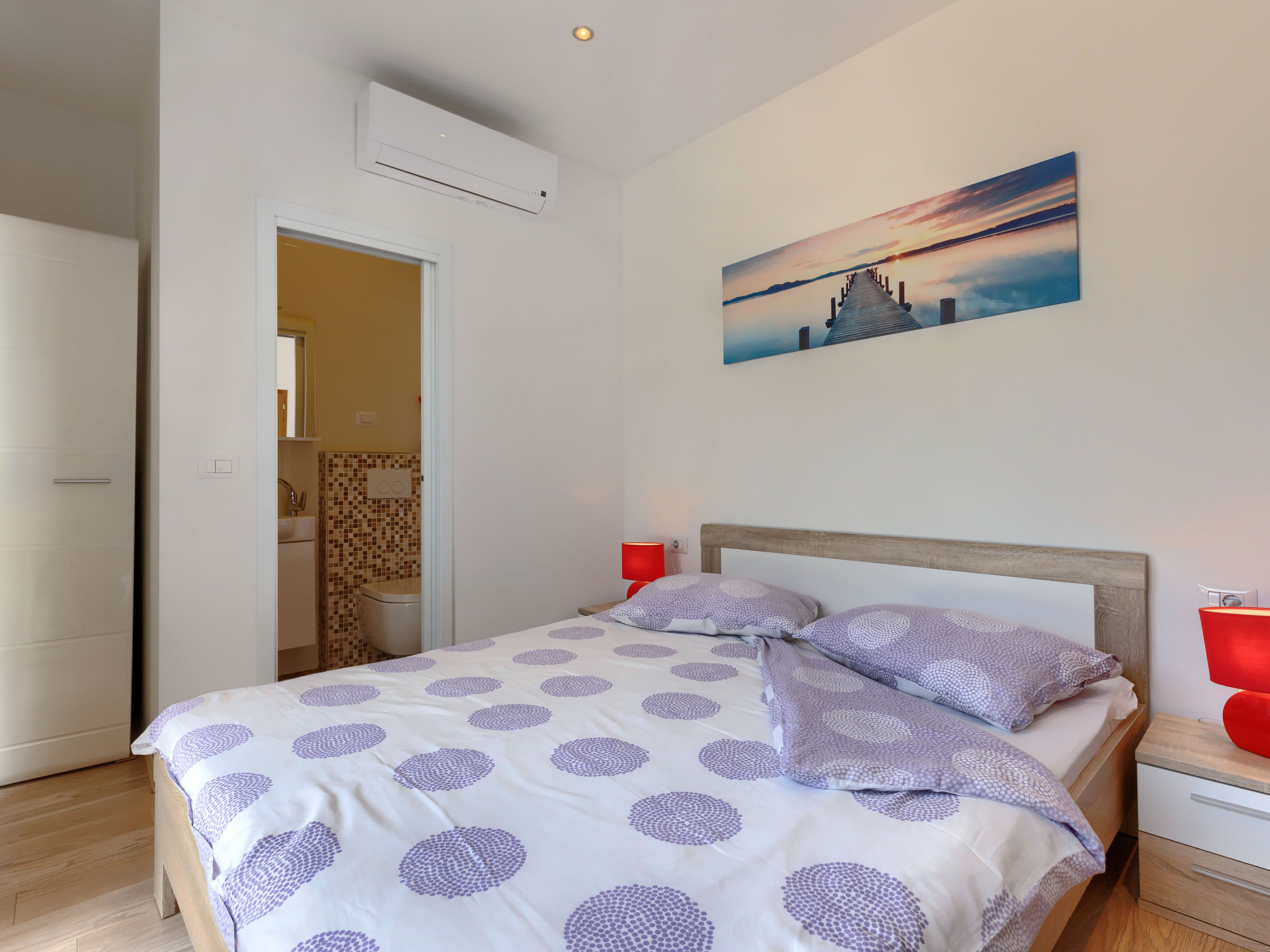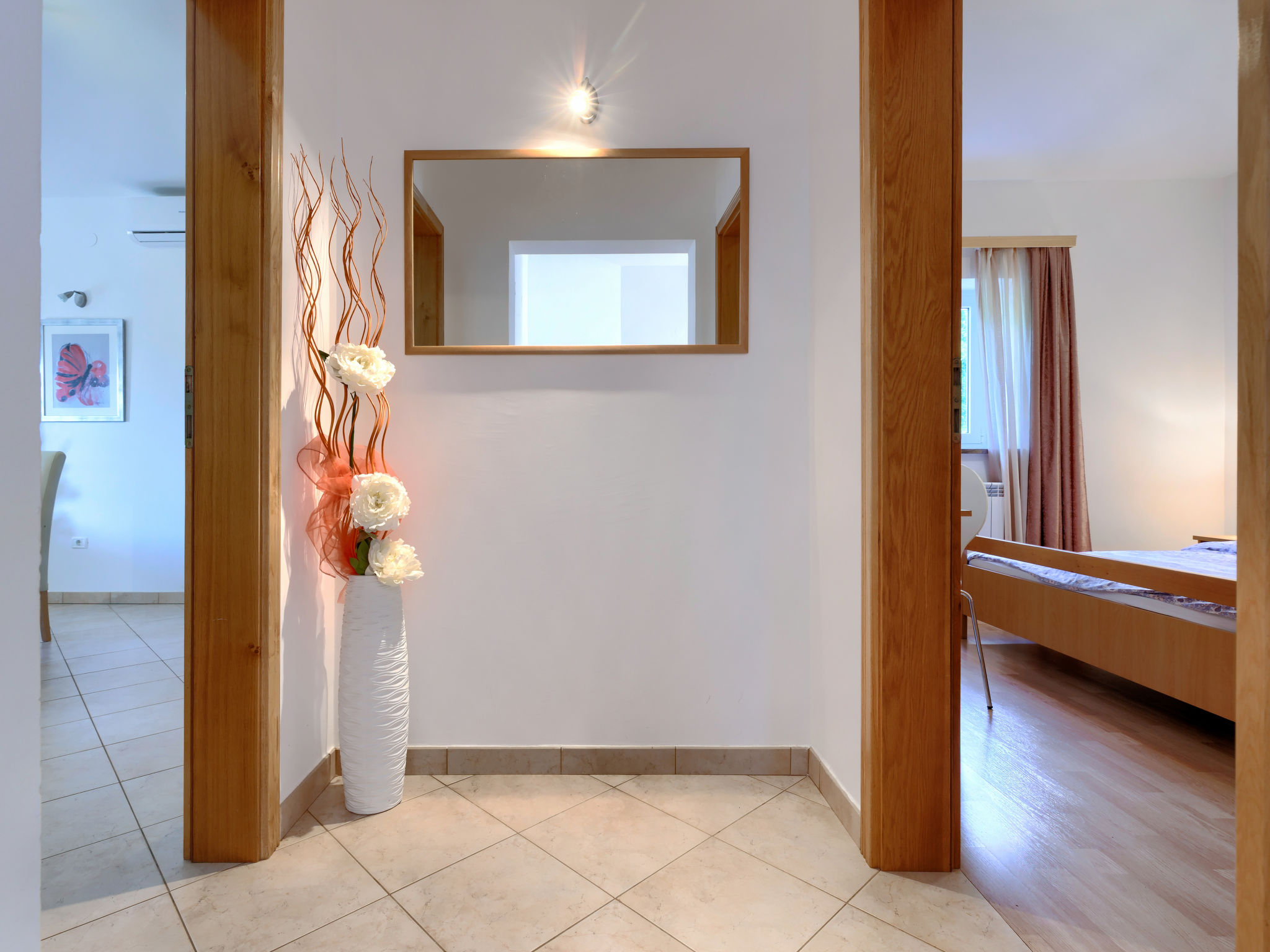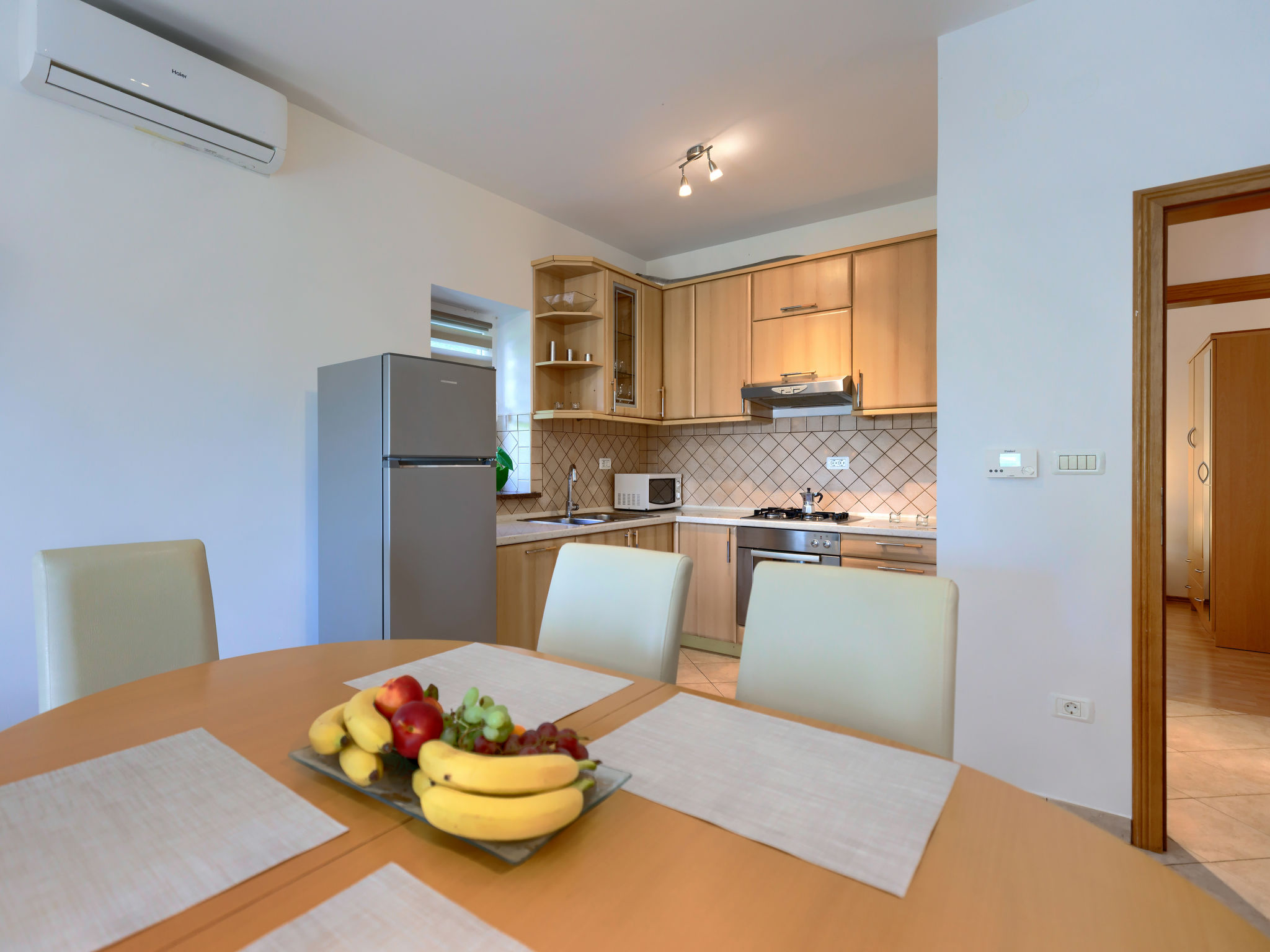4-Zimmer-Wohnung 120 m2, im Erdgeschoss. Renoviert im Jahre 2018, geschmackvoll eingerichtet: Wohn-/Esszimmer 25 m2 mit Sat-TV (Flachbildschirm), Klimaanlage. Ausgang zur Terrasse. 1 Zimmer mit 1 Doppelbett (2 x 80 cm, Länge 200 cm), sep. WC und Klimaanlage. Ausgang zum Schwimmbad. 1 Zimmer mit 1 Doppelbett (2 x 80 cm, Länge 200 cm), Dusche/WC und Klimaanlage. 1 Zimmer mit 1 Doppelbett (2 x 80 cm, Länge 200 cm), Klimaanlage. Offene Küche (4 Kochplatten, Backofen, Geschirrspüler, Mikrowelle, Tiefkühler, elektrische Kaffeemaschine). Dusche/Bidet/WC. Heizung. Terrasse 15 m2, überdacht. Terrassenmöbel, Liegestühle. Sicht auf den Garten. Zur Verfügung: Waschmaschine, Bügeleisen, Kinderhochstuhl, Babybett, Haartrockner. Internet (Wireless LAN, gratis). Bitte beachten: eigener Eingang.