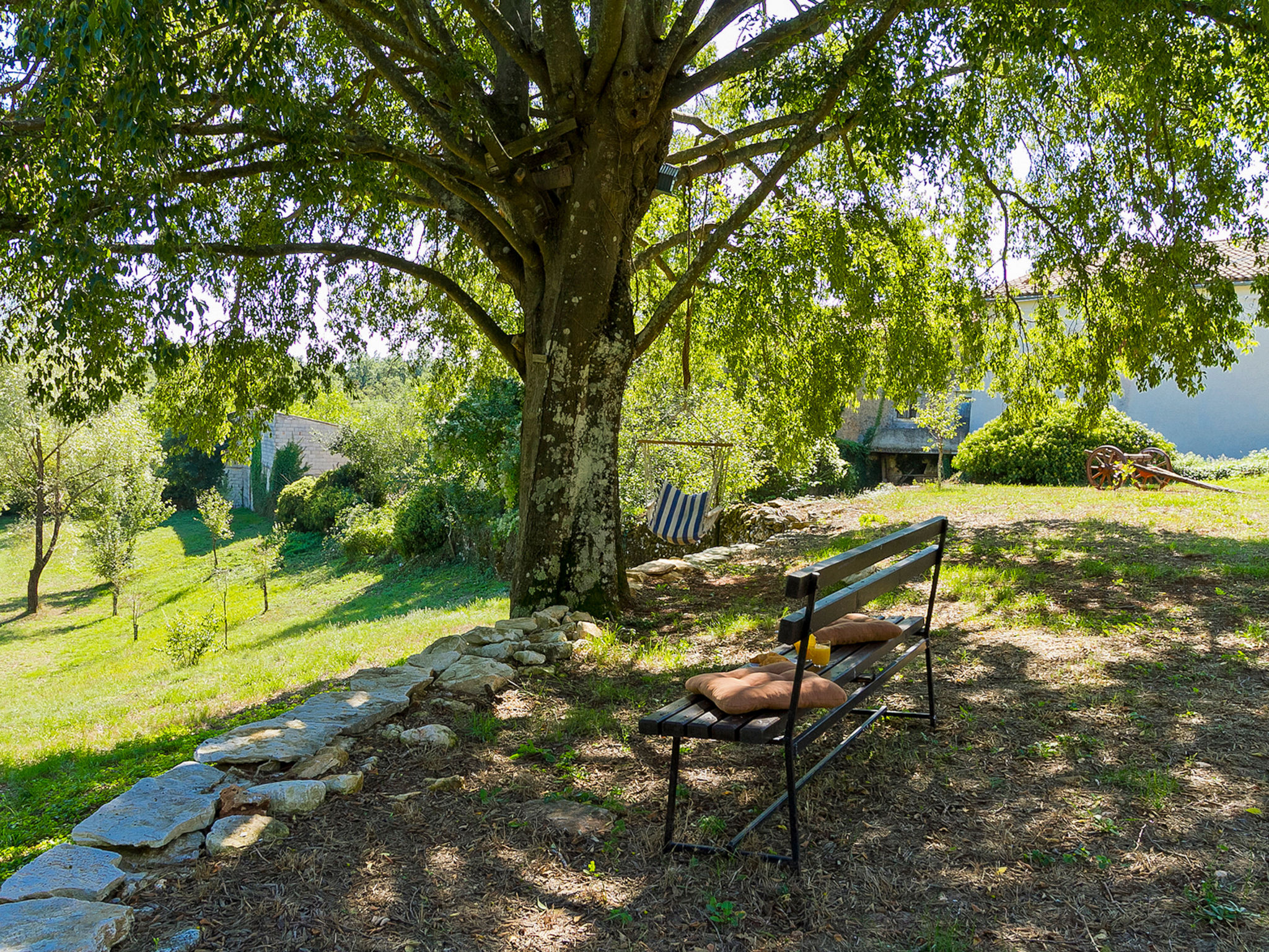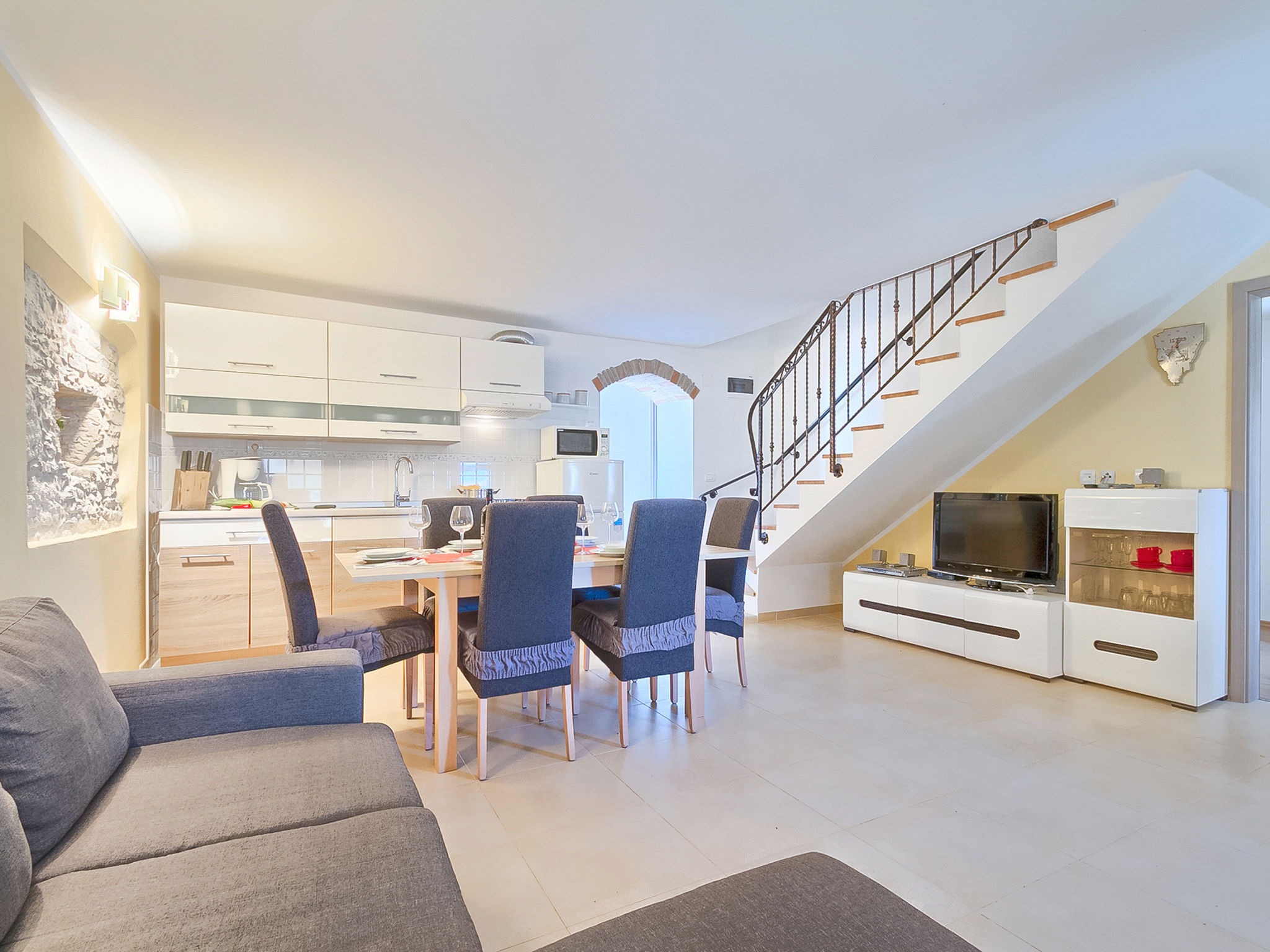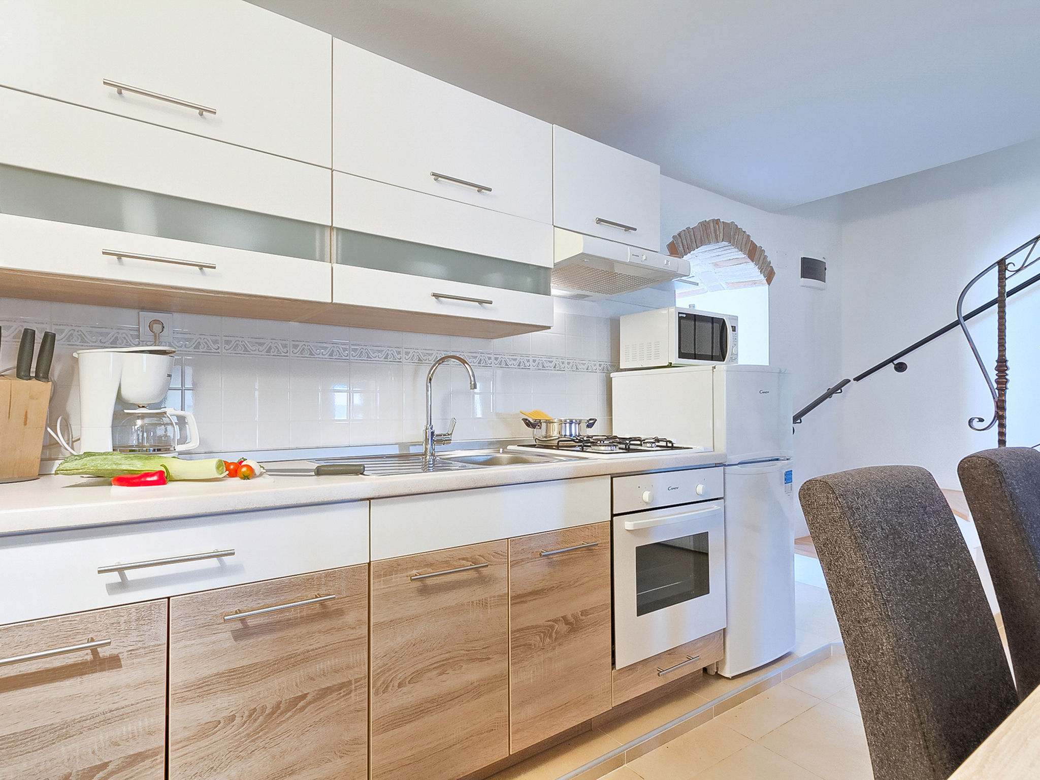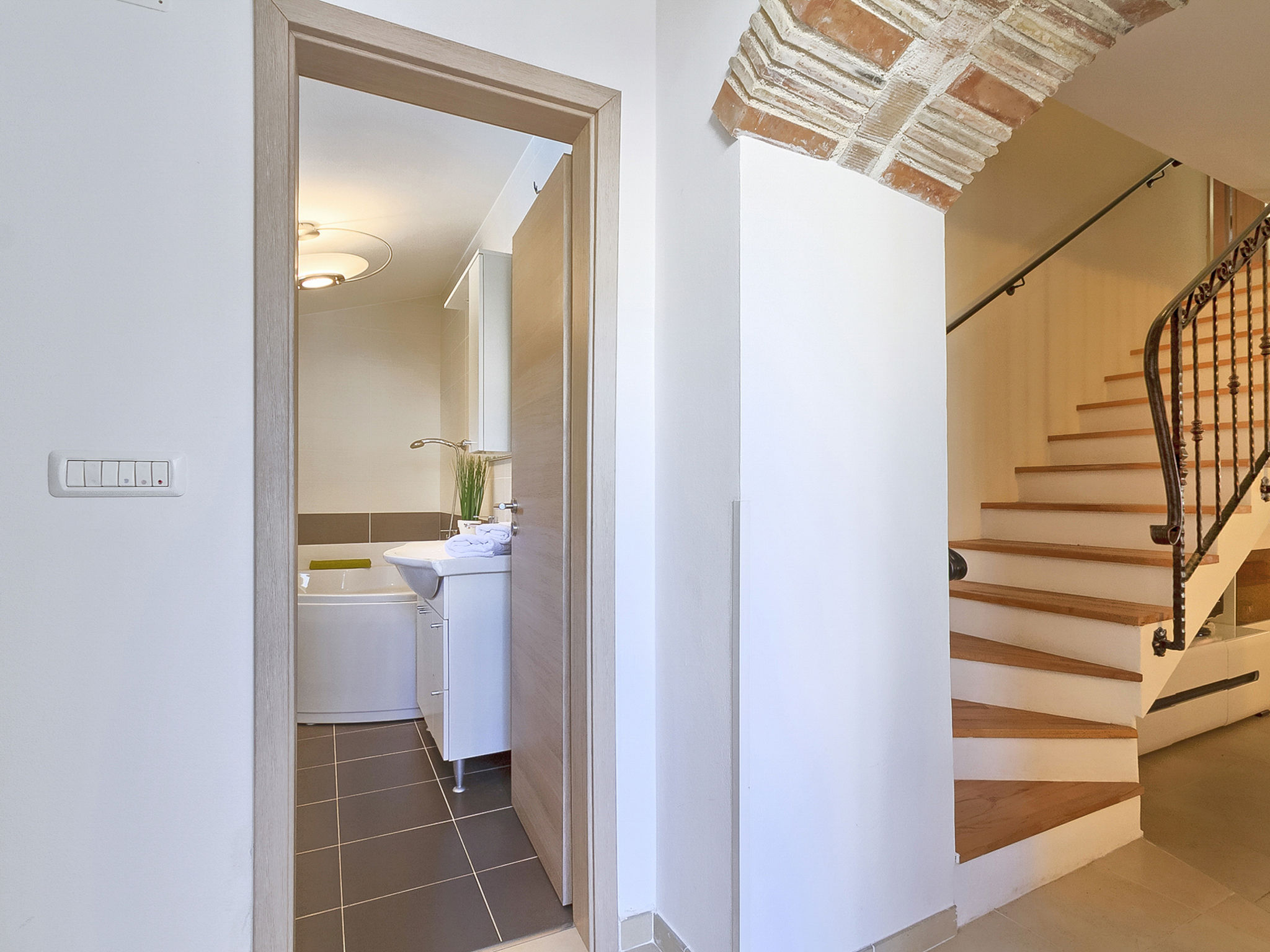 5-Zimmer-Doppelhaushälfte 160 m2 auf 2 Stockwerken. Wohn-/Esszimmer mit Sat-TV (Flachbildschirm), DVD und Klimaanlage. Ausgang zur Terrasse. 1 Zimmer mit 1 franz. Bett (160 cm, Länge 200 cm). Offene Küche (4 Kochplatten, Backofen, Mikrowelle, Tiefkühler, elektrische Kaffeemaschine). Ausgang zur Terrasse. Bad/WC, Dusche/WC. Obergeschoss: Eingang mit Klimaanlage. 1 Zimmer mit 1 franz. Bett (160 cm, Länge 200 cm). 1 Zimmer mit 1 franz. Bett (160 cm, Länge 200 cm), Dusche/WC. Abgeschrägte, offene Galerie, Deckenhöhe 140 - 250 cm mit 1 Doppeldiwanbett (160 cm, Länge 200 cm), TV (Flachbildschirm), Stereoanlage und Klimaanlage. Terrasse 10 m2, überdacht, Terrasse 15 m2, überdacht. Terrassenmöbel, Liegestühle. Schöne Sicht auf das Schwimmbad und die Landschaft. Zur Verfügung: Safe, Babybett, Haartrockner. Internet (Wireless LAN, gratis). 1 Haustier/Hund erlaubt. Das Haupthaus mit Wohn-/Essbereich, einer offenen Küche und einem Schlafzimmer im Erdgeschoss und mit 2 Schlafzimmern im ersten Stock. Im Ferienhaus gibt es ein Zimmer mit 2 Fitnessgeräten, eine Dusche/WC im Erdgeschoss und eine offene Galerie, eine Doppel-Schlafcouch, einen Fernseher (Flachbildschirm), eine Stereo-Anlage und Klimaanlage im ersten Stock.
