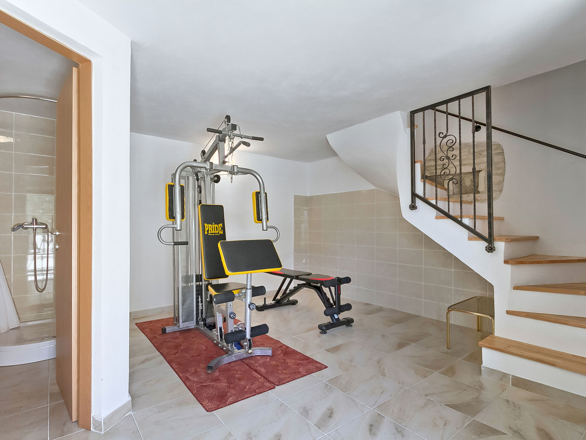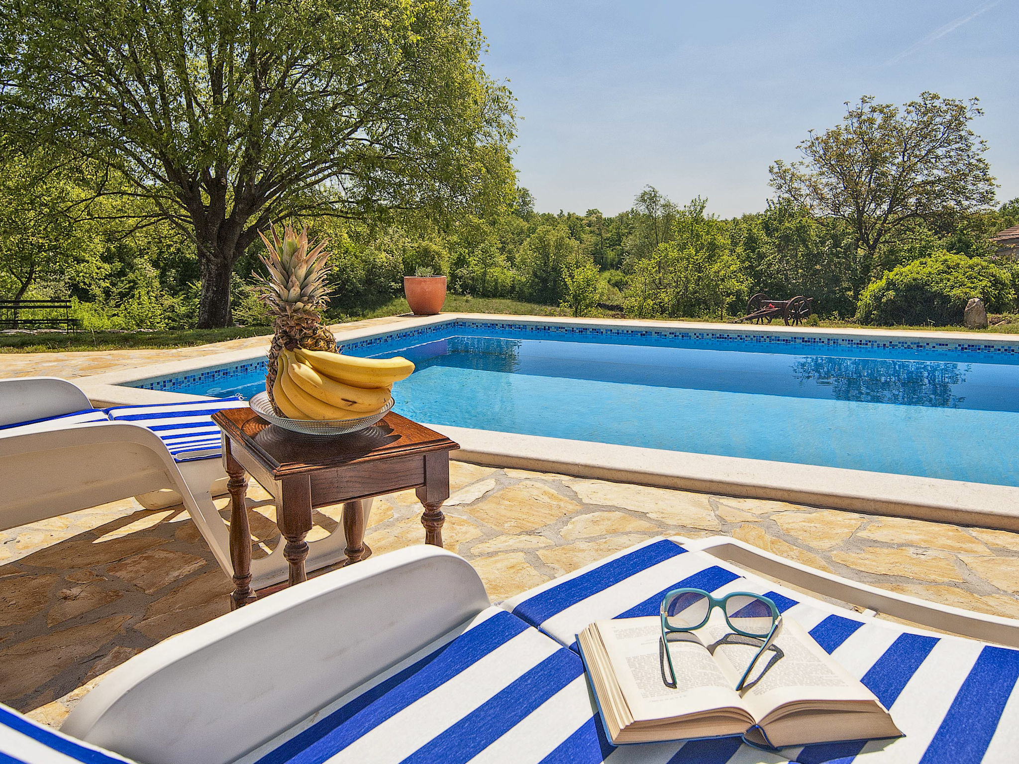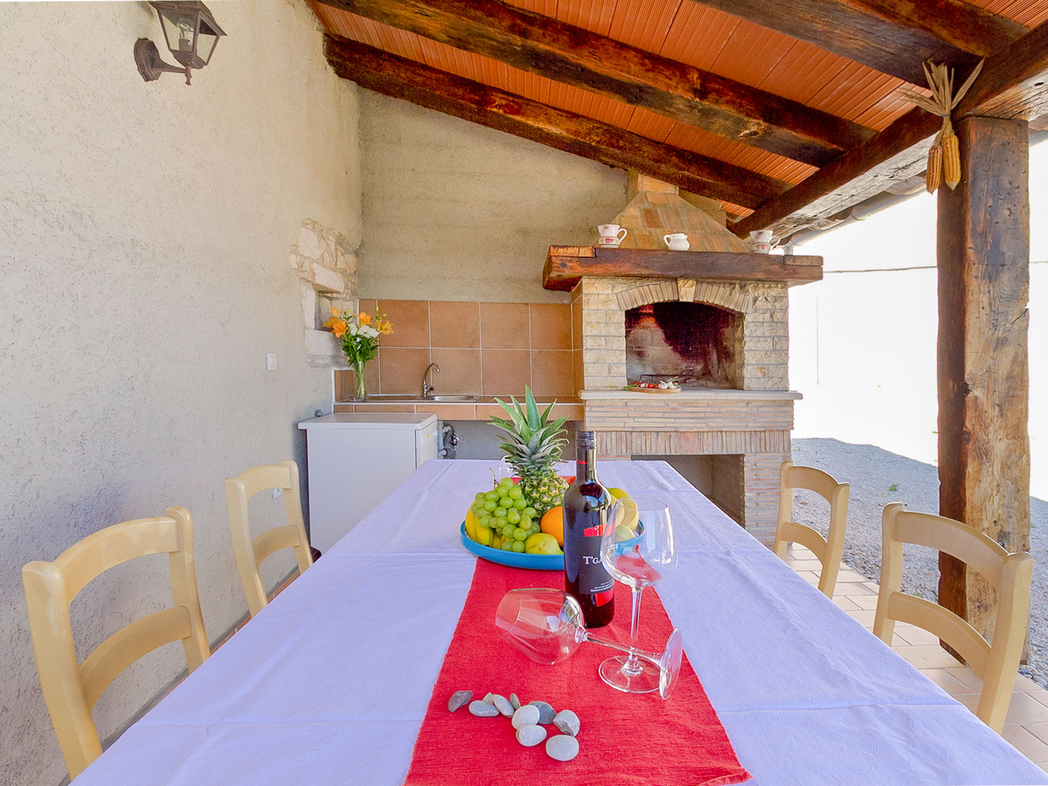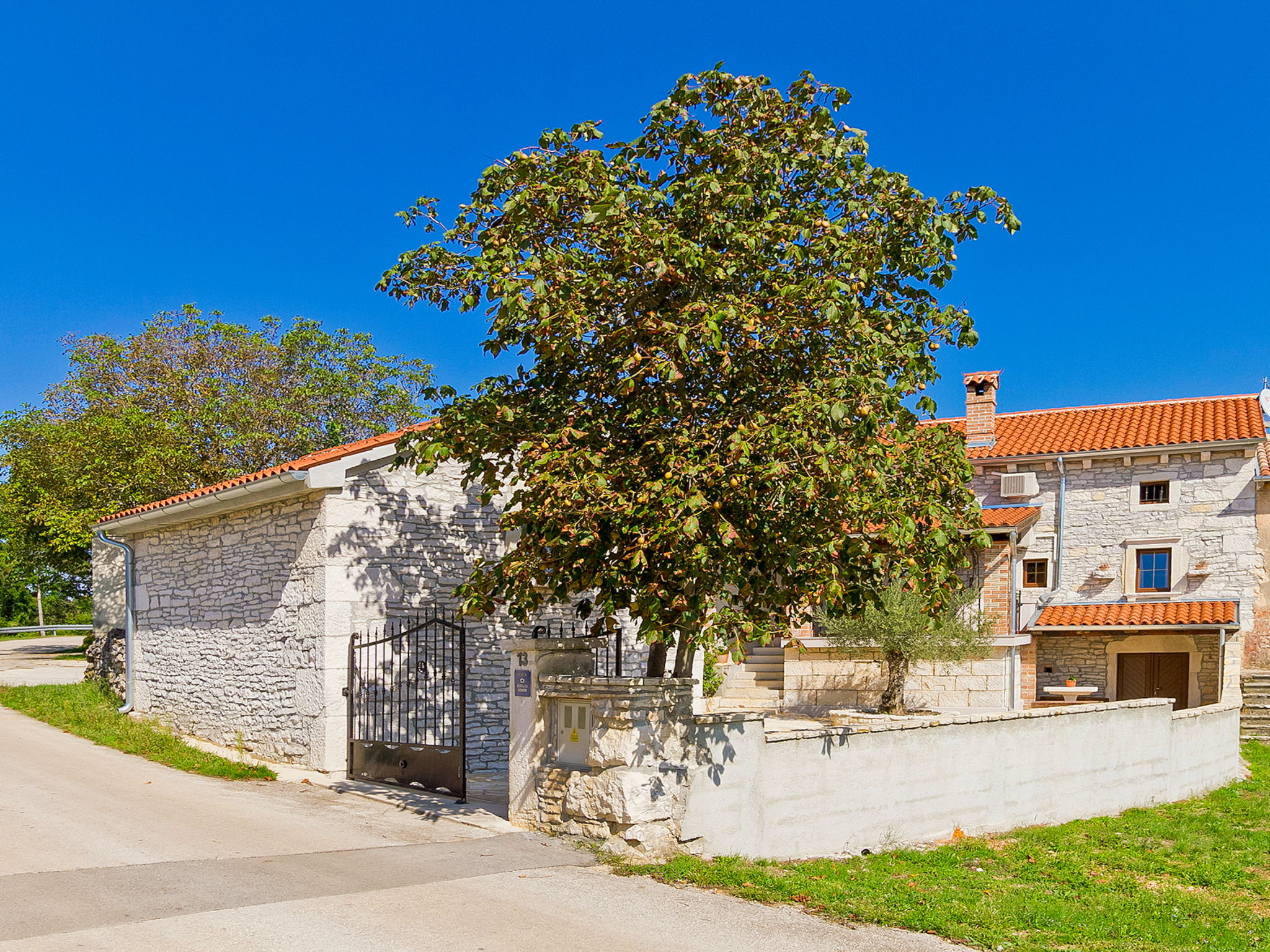 5-Zimmer-Doppelhaushälfte 160 m2 auf 2 Stockwerken. Wohn-/Esszimmer mit Sat-TV (Flachbildschirm), DVD und Klimaanlage. Ausgang zur Terrasse. 1 Zimmer mit 1 franz. Bett (160 cm, Länge 200 cm). Offene Küche (4 Kochplatten, Backofen, Mikrowelle, Tiefkühler, elektrische Kaffeemaschine). Ausgang zur Terrasse. Bad/WC, Dusche/WC. Obergeschoss: Eingang mit Klimaanlage. 1 Zimmer mit 1 franz. Bett (160 cm, Länge 200 cm). 1 Zimmer mit 1 franz. Bett (160 cm, Länge 200 cm), Dusche/WC. Abgeschrägte, offene Galerie, Deckenhöhe 140 - 250 cm mit 1 Doppeldiwanbett (160 cm, Länge 200 cm), TV (Flachbildschirm), Stereoanlage und Klimaanlage. Terrasse 10 m2, überdacht, Terrasse 15 m2, überdacht. Terrassenmöbel, Liegestühle. Schöne Sicht auf das Schwimmbad und die Landschaft. Zur Verfügung: Safe, Babybett, Haartrockner. Internet (Wireless LAN, gratis). 1 Haustier/Hund erlaubt. Das Haupthaus mit Wohn-/Essbereich, einer offenen Küche und einem Schlafzimmer im Erdgeschoss und mit 2 Schlafzimmern im ersten Stock. Im Ferienhaus gibt es ein Zimmer mit 2 Fitnessgeräten, eine Dusche/WC im Erdgeschoss und eine offene Galerie, eine Doppel-Schlafcouch, einen Fernseher (Flachbildschirm), eine Stereo-Anlage und Klimaanlage im ersten Stock.