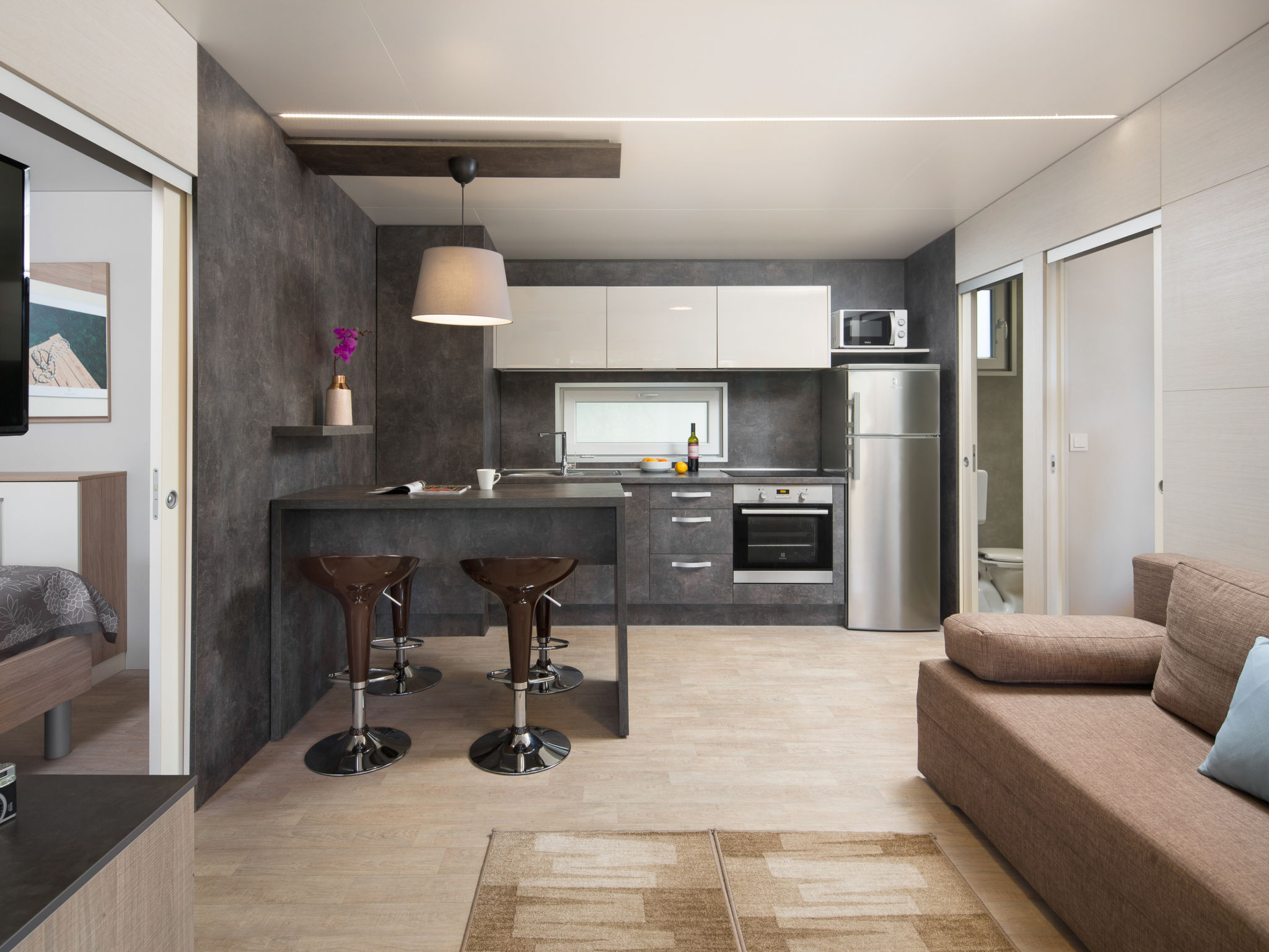 "Mon Perin (ROJ610)", 3-Zimmer-Mobilheim 40 m2. Wohn-/Esszimmer mit 1 Doppeldiwanbett und Sat-TV (Flachbildschirm), Klimaanlage. Ausgang zur Terrasse. 1 Zimmer mit 1 franz. Bett. Ausgang zur Terrasse. 1 Zimmer mit 2 Betten. Ausgang zur Terrasse. Offene Küche (4 Glaskeramikherd Platten, Mikrowelle, elektrische Kaffeemaschine). 2 Duschen/WC. Terrasse 25 m2, überdacht. Terrassenmöbel, Liegestühle (2). Zur Verfügung: Internet (Wireless LAN, gratis). Bitte beachten: Nichtraucher-Haus. Maximal 1 Haustier/Hund erlaubt. Meer, Strand sind 50-200 m von den Mobilheimen entfernt.