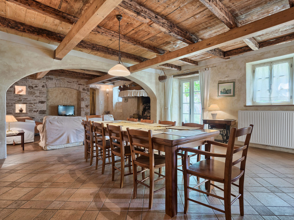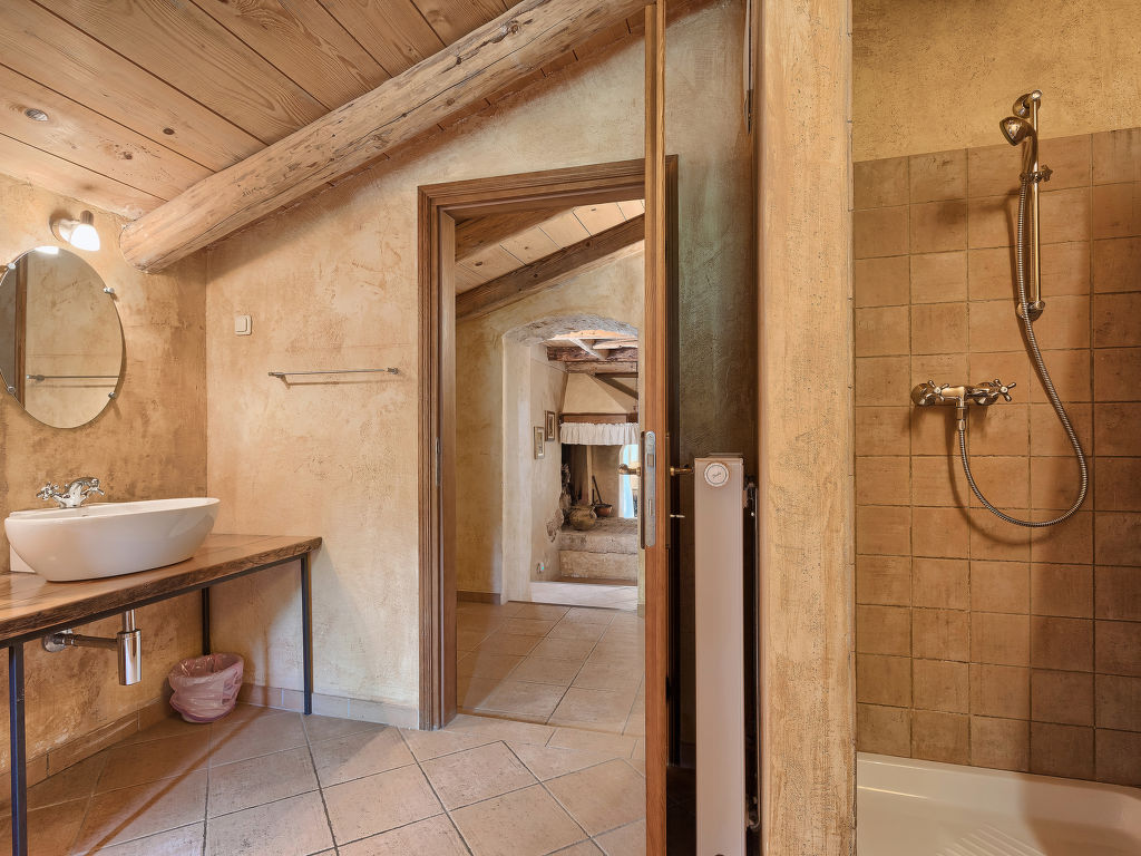 5-Zimmer-Haus 235 m2 auf 3 Stockwerken. Komfortabel und rustikal eingerichtet: Wohn-/Esszimmer 58 m2 mit offenem Kamin und Sat-TV (Flachbildschirm). Ausgang zum Garten. Küche (4 Kochplatten, Backofen, Geschirrspüler, Tiefkühler) mit Esstisch, offenem Kamin. Ausgang zum Garten, zur Terrasse. Dusche/WC. Obergeschoss: 1 Zimmer mit 1 franz. Bett (160 cm, Länge 190 cm). 1 Zimmer mit 2 Betten (80 cm, Länge 190 cm). 1 Zimmer mit 1 franz. Bett (160 cm, Länge 190 cm), Dusche/WC. Bad/Dusche/WC. Dachgeschoss: 1 abgeschrägtes Zimmer, Deckenhöhe 120 - 230 cm mit 1 franz. Bett (160 cm, Länge 190 cm), Bad/WC. Heizung (extra). Terrasse 20 m2, überdacht. Terrassenmöbel, Liegestühle. Schöne Sicht auf die Landschaft. Zur Verfügung: Internet (Wireless LAN, gratis). 1 kleines Haustier/Hund erlaubt.