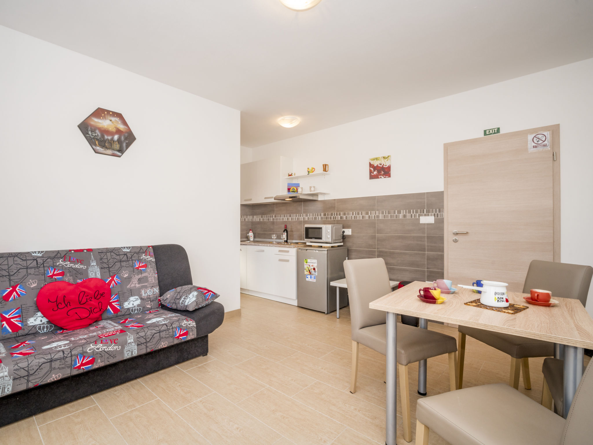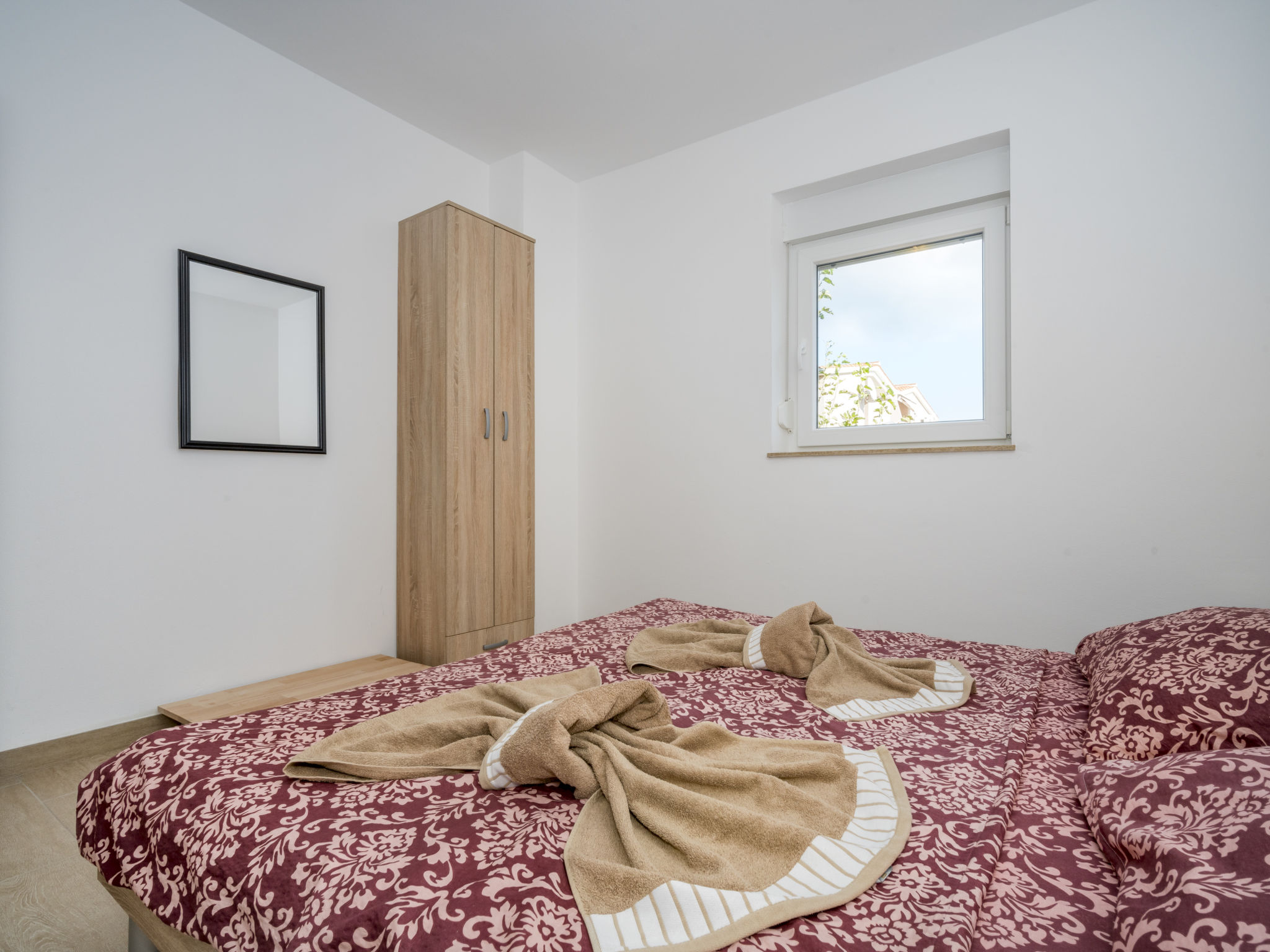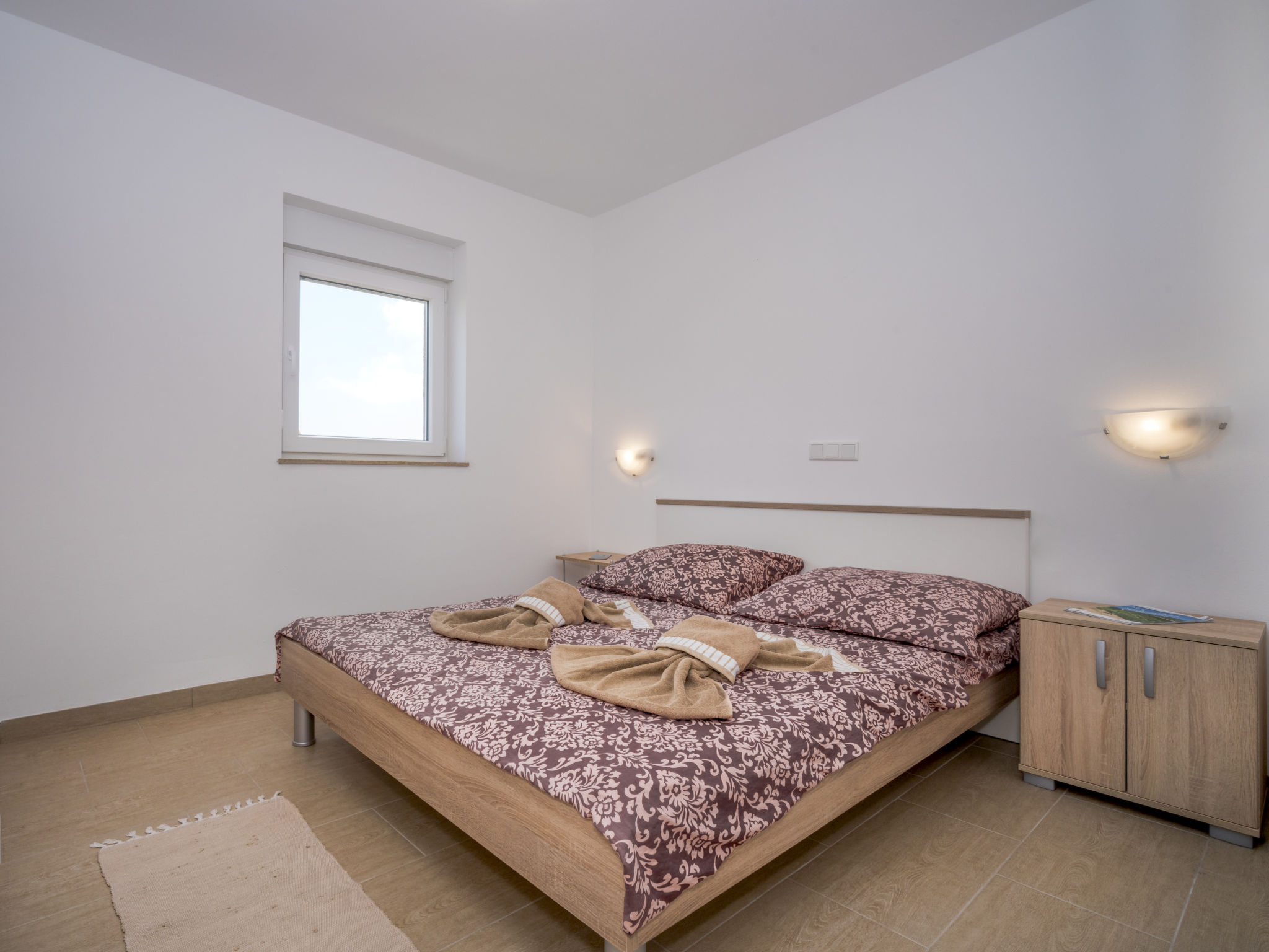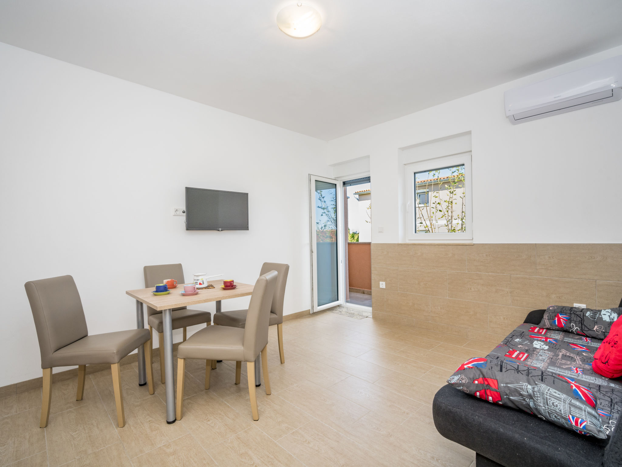 2-Zimmer-Wohnung 35 m2 im 1. Stock. Wohn-/Esszimmer mit 1 Diwanbett (150 cm, Länge 200 cm), Sat-TV (Flachbildschirm), Klimaanlage. Ausgang zur Terrasse. 1 Zimmer mit 1 Doppelbett (2 x 80 cm, Länge 200 cm). Offene Küche (2 Kochplatten, Mikrowelle, elektrische Kaffeemaschine). Dusche/WC. Warmluftheizung (extra). Terrasse 5 m2. Terrassenmöbel. Eingeschränkte Sicht auf das Meer. Zur Verfügung: Haartrockner. Internet (Wireless LAN, gratis).