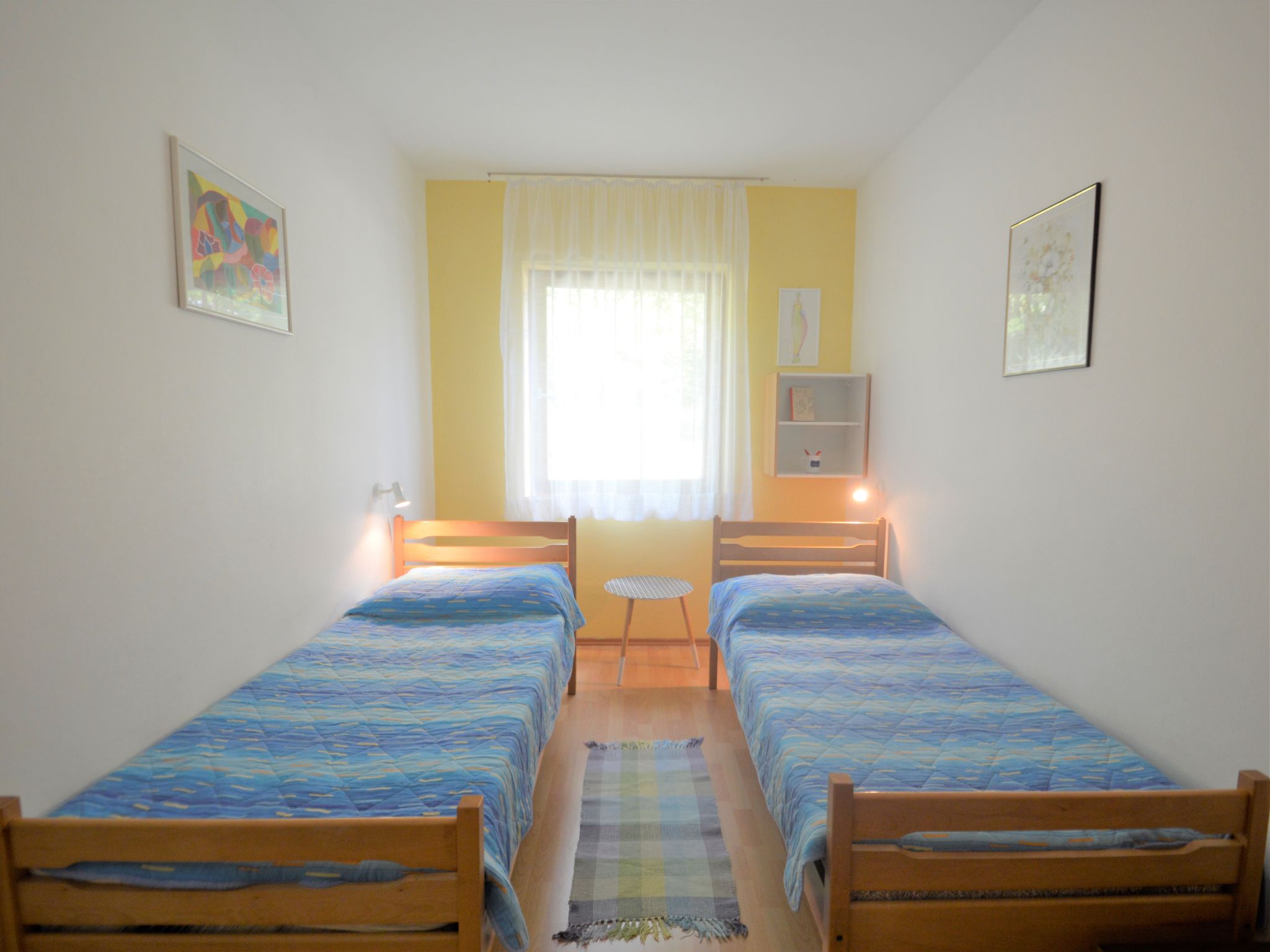 3-Zimmer-Wohnung 50 m2, im Erdgeschoss. Zweckmässig und gemütlich eingerichtet: Wohn-/Esszimmer mit Sat-TV und Klimaanlage. Ausgang zur Terrasse. 1 Zimmer mit 1 Doppelbett (2 x 90 cm, Länge 200 cm). 1 Zimmer mit 2 Betten (90 cm, Länge 190 cm). Offene Küche (2 Kochplatten). Dusche/WC. Klimaanlage (extra). Terrasse 20 m2, überdacht. Terrassenmöbel. Sicht auf den Garten und den Wald. Zur Verfügung: Internet (Wireless LAN, gratis). 1 kleines Haustier/Hund erlaubt.