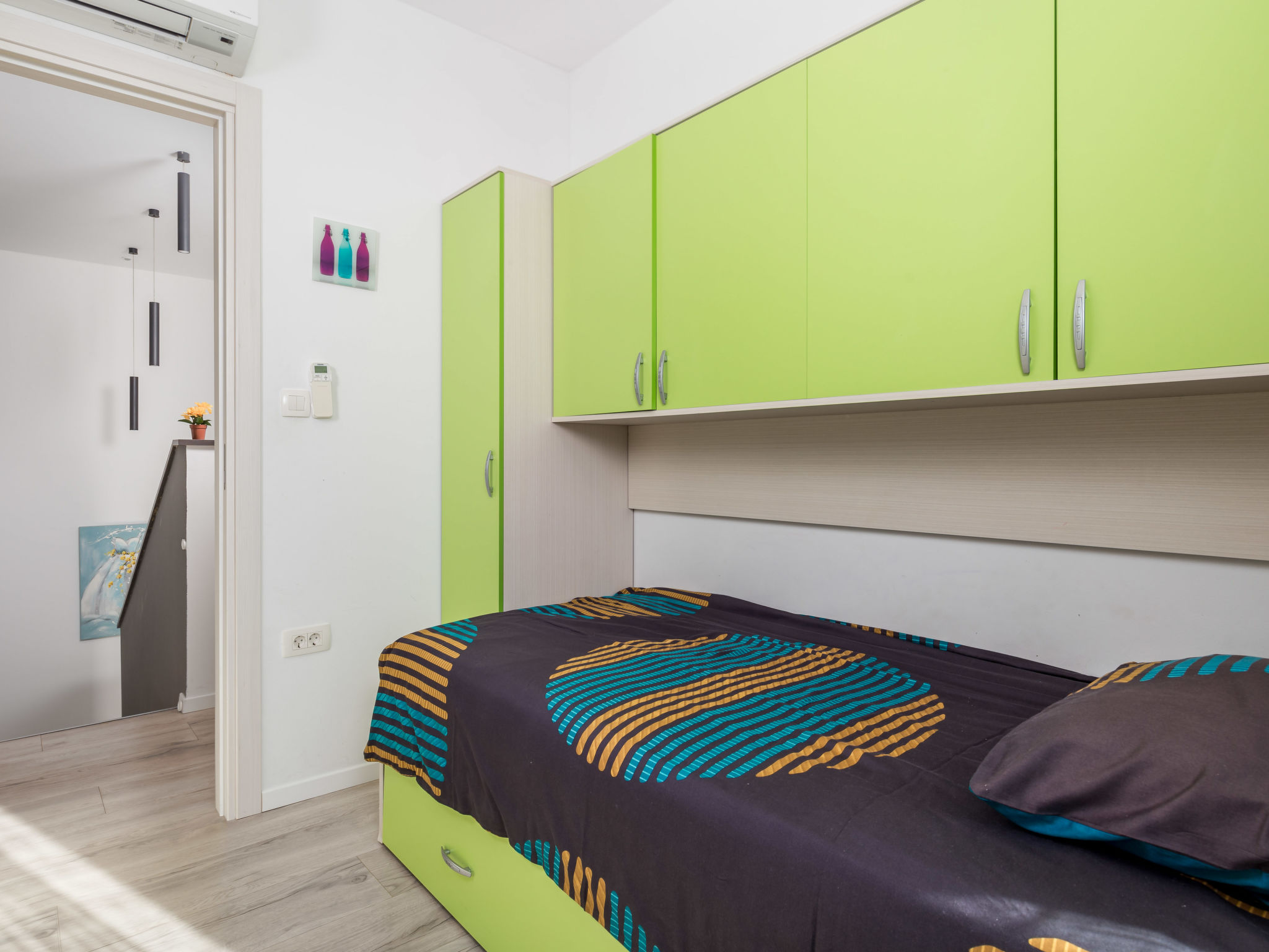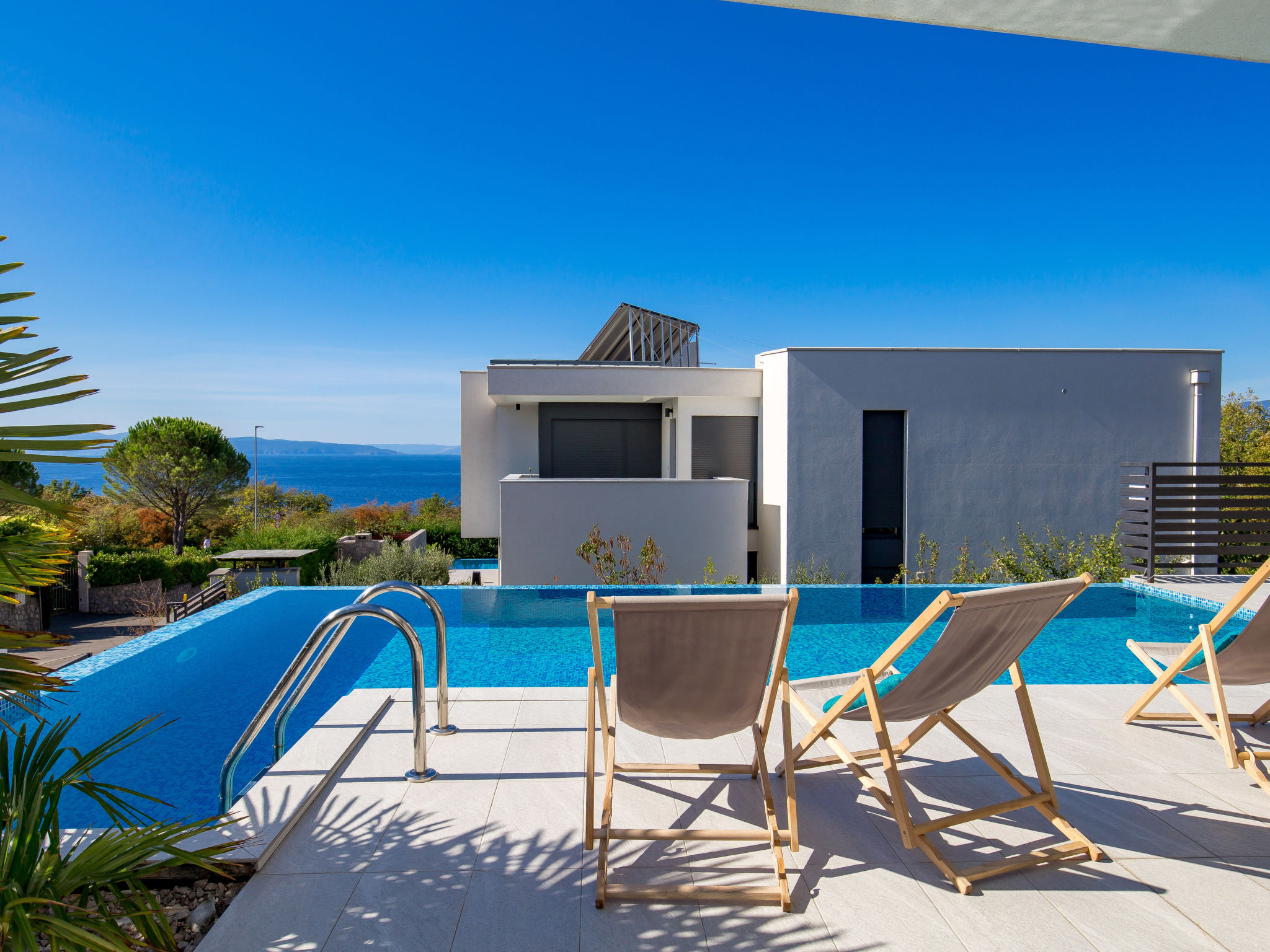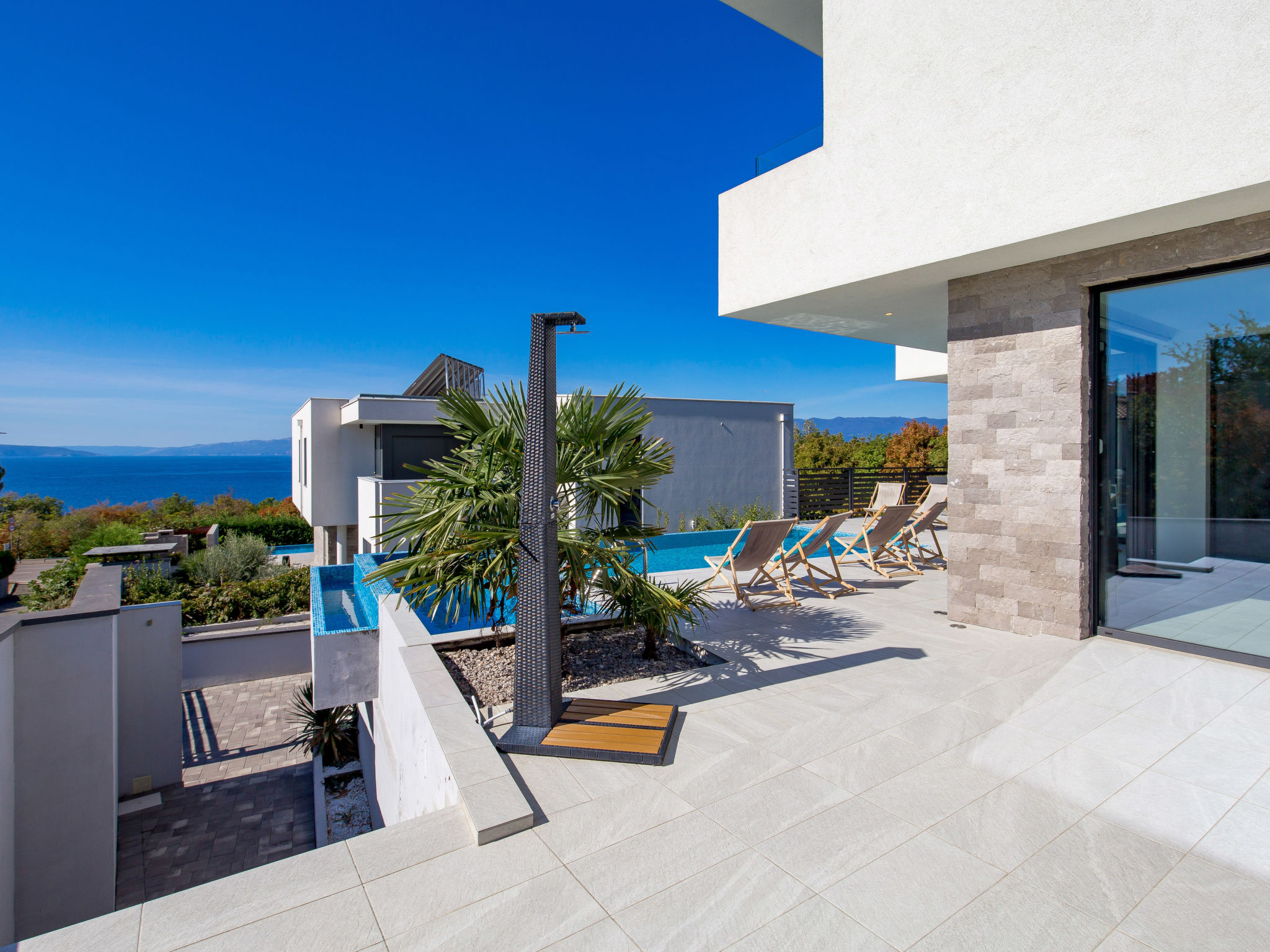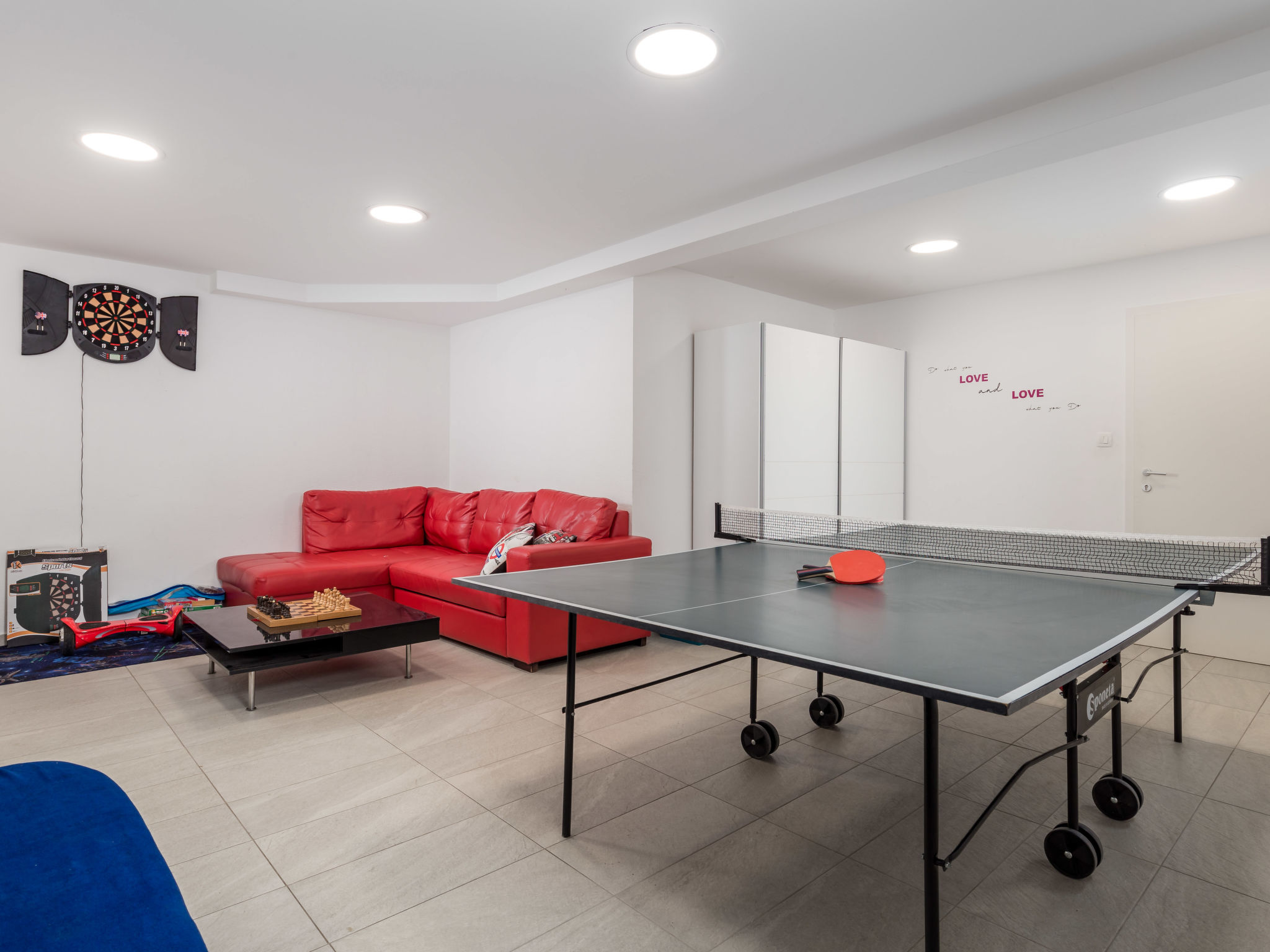 5-Zimmer-Wohnung 250 m2 auf 2 Stockwerken, im Erdgeschoss. Wohn-/Esszimmer mit Internationale TV-Sender, Flachbildschirm und Klimaanlage. Ausgang zur Terrasse, zum Schwimmbad. Offene Küche (Backofen, Geschirrspüler, 4 Glaskeramikherd Platten, Mikrowelle, Tiefkühler, elektrische Kaffeemaschine). Sep. WC. Obergeschoss: 1 Zimmer mit 1 franz. Bett (160 cm, Länge 200 cm), Klimaanlage. 1 Zimmer mit 1 franz. Bett (160 cm, Länge 200 cm), Klimaanlage. Ausgang zum Balkon. 1 Zimmer mit 1 franz. Bett (180 cm, Länge 200 cm), Bad/Bidet/WC und Klimaanlage. Ausgang zum Balkon. 1 Zimmer mit 1 Bett (90 cm, Länge 200 cm), 1 Ausziehbett (Länge 200 cm), Klimaanlage. Dusche/Bidet/WC, Doppelwaschbecken. Bodenheizung, Warmluftheizung. Liegestühle. Sicht auf das Meer. Zur Verfügung: Waschmaschine, Wäschetrockner, Haartrockner. Internet (Wireless LAN, gratis). Parkplatz (3 Autos). Bitte beachten: 2 Haustiere/Hunde erlaubt. Eigener Eingang. Unteres Geschoss: Unterhaltungsraum (TV, Playstation, Tischfußball, Darts, Tischtennis).