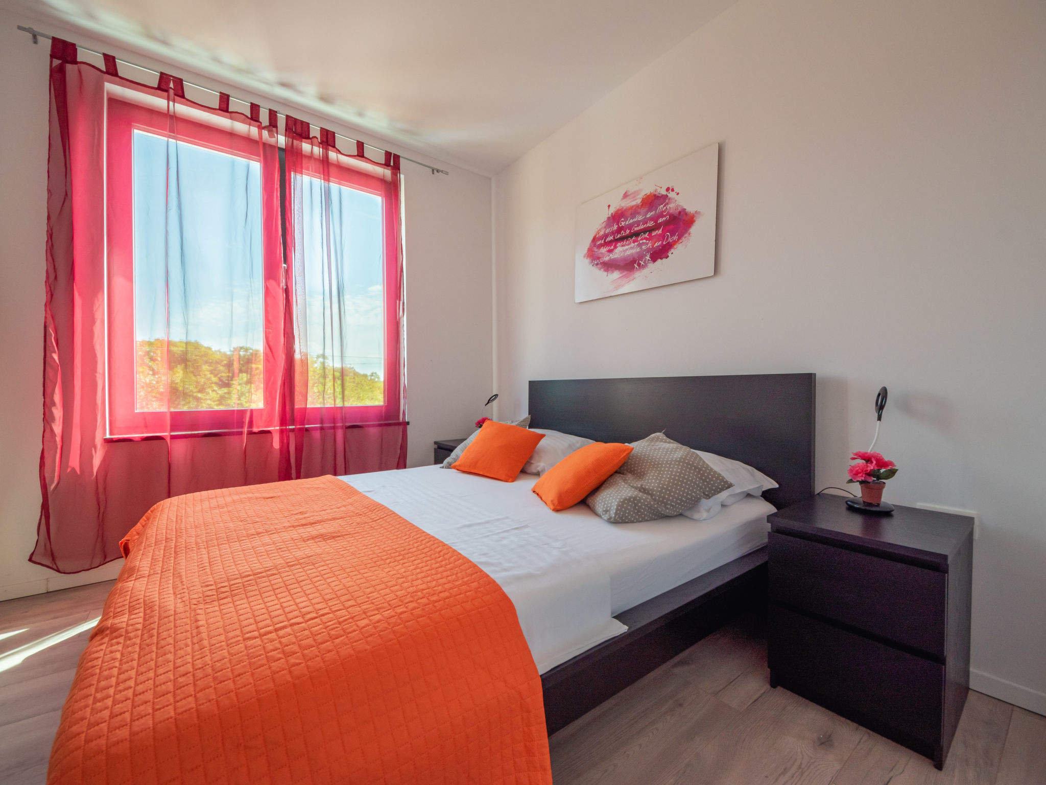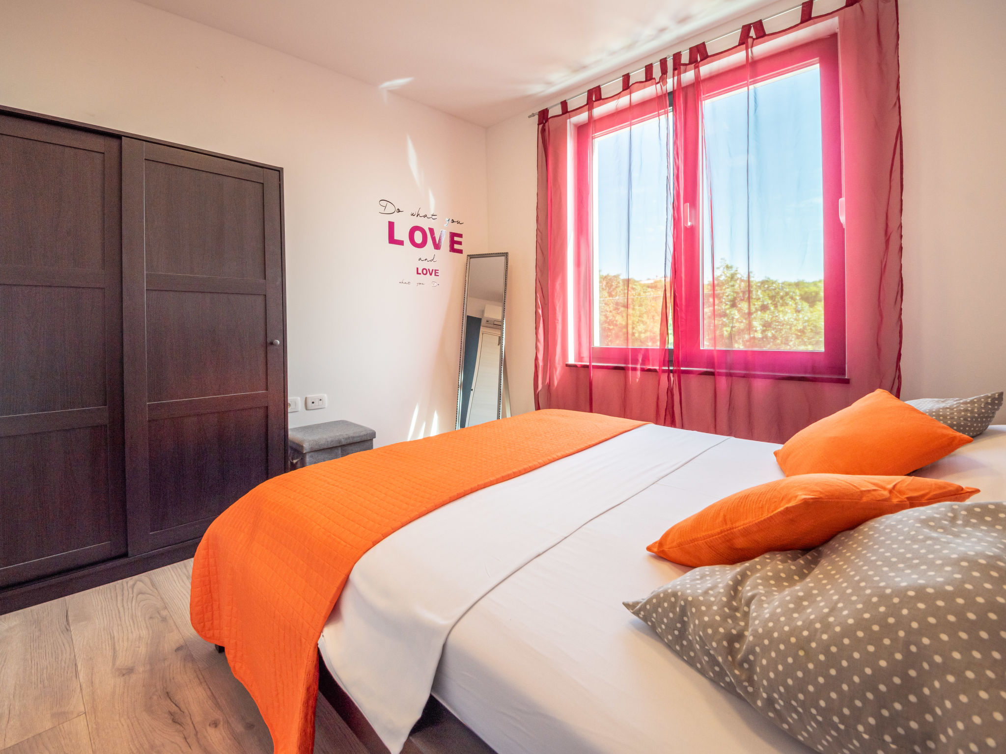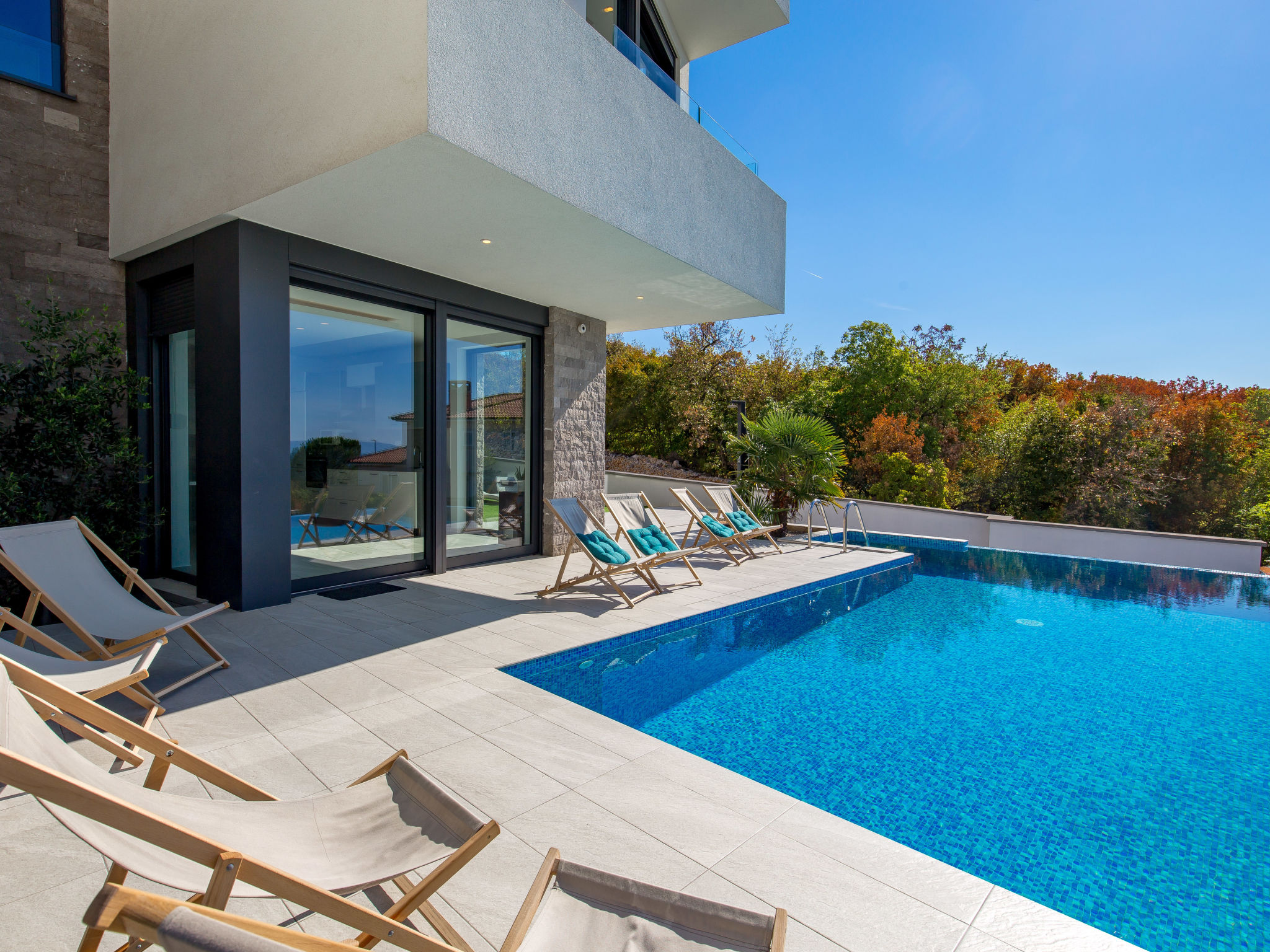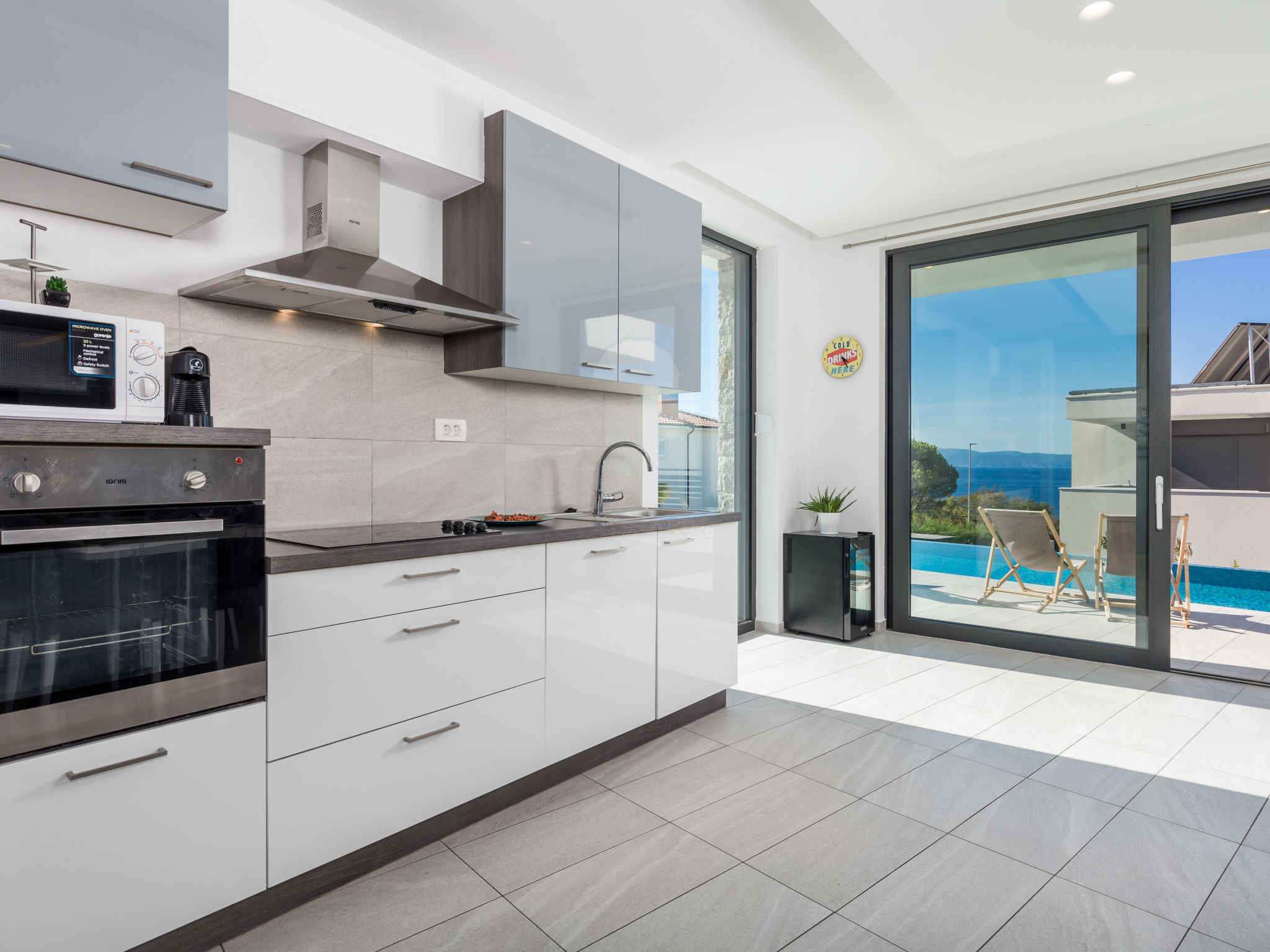 5-Zimmer-Wohnung 250 m2 auf 2 Stockwerken, im Erdgeschoss. Wohn-/Esszimmer mit Internationale TV-Sender, Flachbildschirm und Klimaanlage. Ausgang zur Terrasse, zum Schwimmbad. Offene Küche (Backofen, Geschirrspüler, 4 Glaskeramikherd Platten, Mikrowelle, Tiefkühler, elektrische Kaffeemaschine). Sep. WC. Obergeschoss: 1 Zimmer mit 1 franz. Bett (160 cm, Länge 200 cm), Klimaanlage. 1 Zimmer mit 1 franz. Bett (160 cm, Länge 200 cm), Klimaanlage. Ausgang zum Balkon. 1 Zimmer mit 1 franz. Bett (180 cm, Länge 200 cm), Bad/Bidet/WC und Klimaanlage. Ausgang zum Balkon. 1 Zimmer mit 1 Bett (90 cm, Länge 200 cm), 1 Ausziehbett (Länge 200 cm), Klimaanlage. Dusche/Bidet/WC, Doppelwaschbecken. Bodenheizung, Warmluftheizung. Liegestühle. Sicht auf das Meer. Zur Verfügung: Waschmaschine, Wäschetrockner, Haartrockner. Internet (Wireless LAN, gratis). Parkplatz (3 Autos). Bitte beachten: 2 Haustiere/Hunde erlaubt. Eigener Eingang. Unteres Geschoss: Unterhaltungsraum (TV, Playstation, Tischfußball, Darts, Tischtennis).