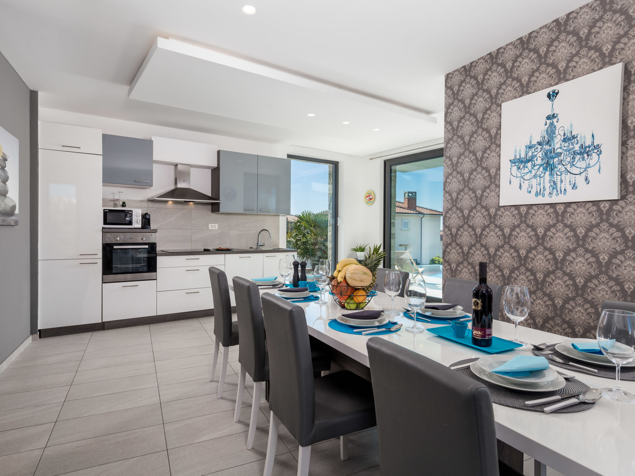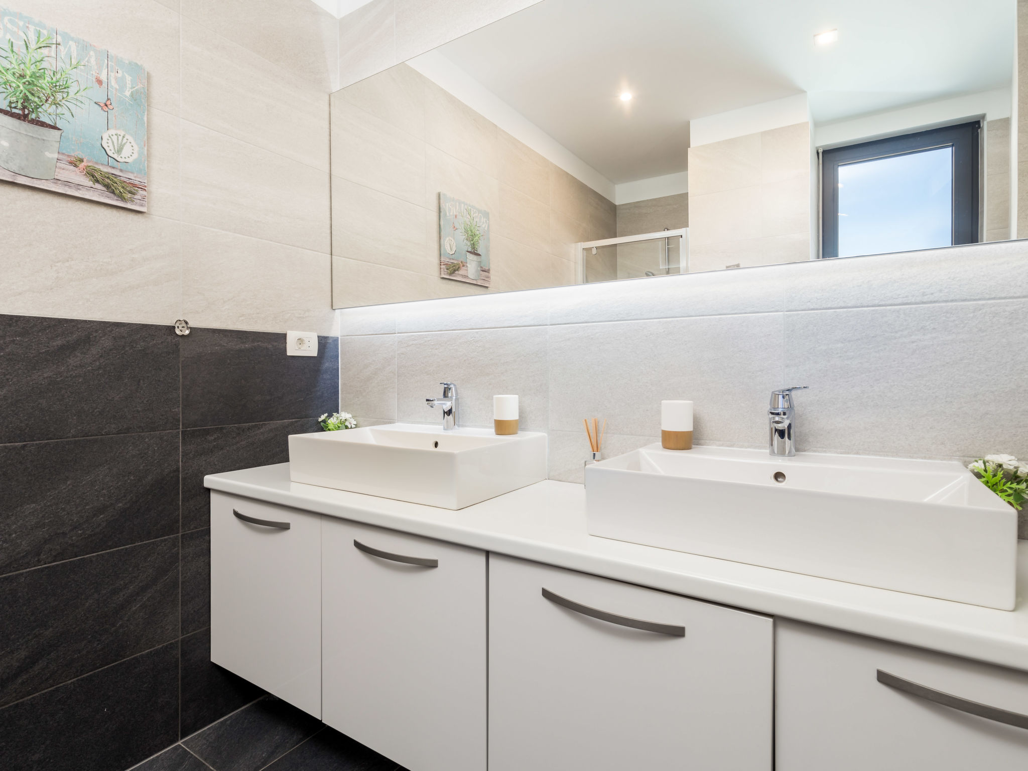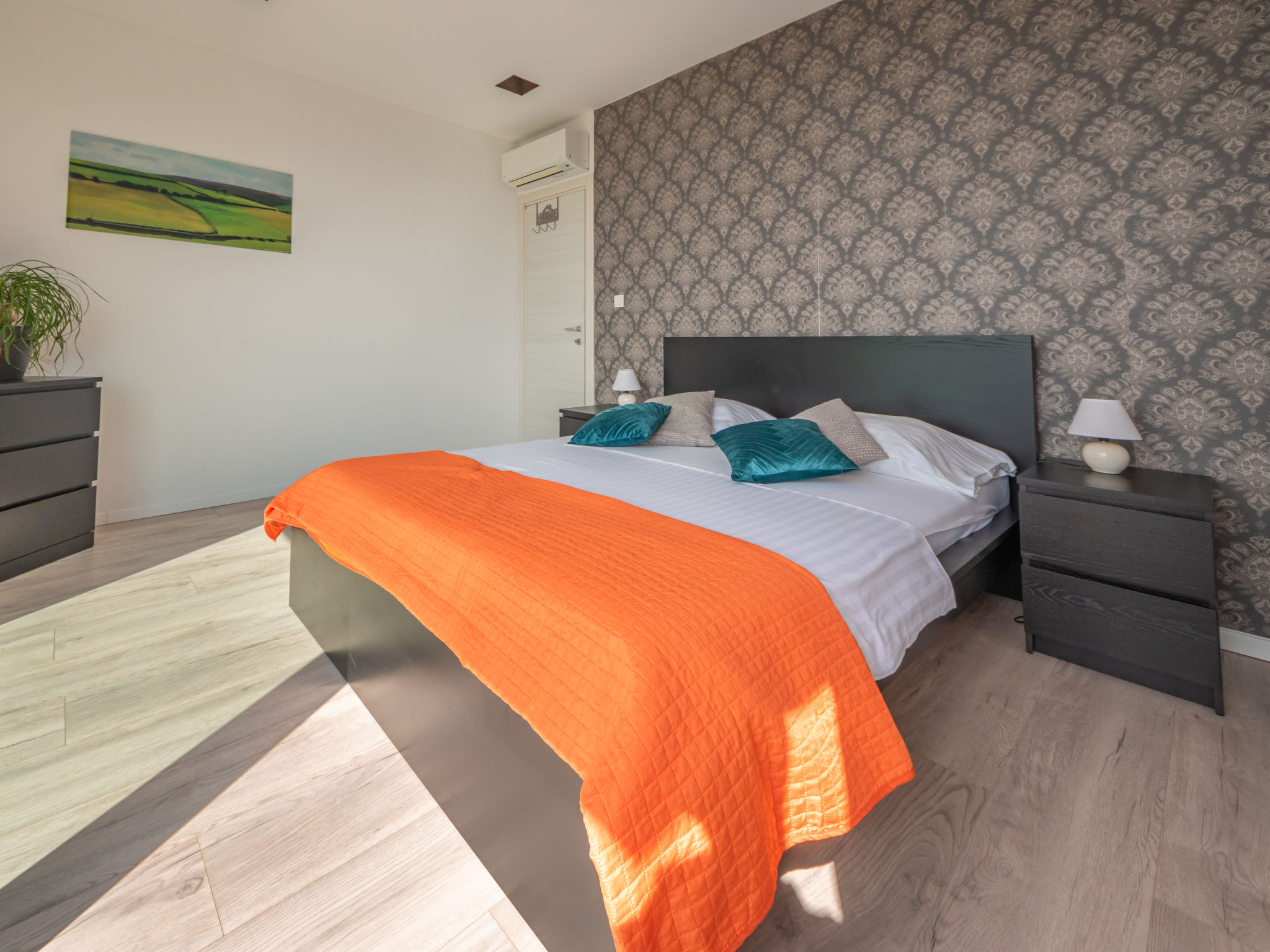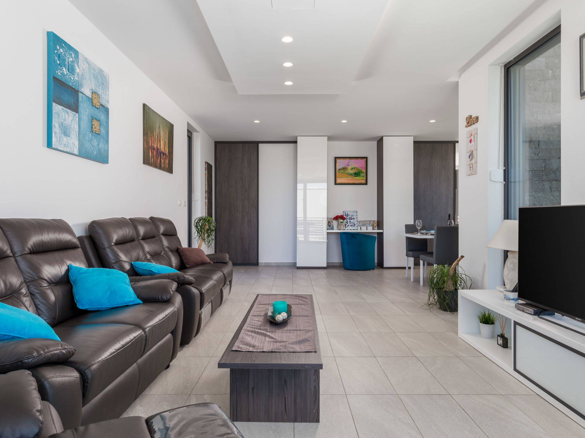 5-Zimmer-Wohnung 250 m2 auf 2 Stockwerken, im Erdgeschoss. Wohn-/Esszimmer mit Internationale TV-Sender, Flachbildschirm und Klimaanlage. Ausgang zur Terrasse, zum Schwimmbad. Offene Küche (Backofen, Geschirrspüler, 4 Glaskeramikherd Platten, Mikrowelle, Tiefkühler, elektrische Kaffeemaschine). Sep. WC. Obergeschoss: 1 Zimmer mit 1 franz. Bett (160 cm, Länge 200 cm), Klimaanlage. 1 Zimmer mit 1 franz. Bett (160 cm, Länge 200 cm), Klimaanlage. Ausgang zum Balkon. 1 Zimmer mit 1 franz. Bett (180 cm, Länge 200 cm), Bad/Bidet/WC und Klimaanlage. Ausgang zum Balkon. 1 Zimmer mit 1 Bett (90 cm, Länge 200 cm), 1 Ausziehbett (Länge 200 cm), Klimaanlage. Dusche/Bidet/WC, Doppelwaschbecken. Bodenheizung, Warmluftheizung. Liegestühle. Sicht auf das Meer. Zur Verfügung: Waschmaschine, Wäschetrockner, Haartrockner. Internet (Wireless LAN, gratis). Parkplatz (3 Autos). Bitte beachten: 2 Haustiere/Hunde erlaubt. Eigener Eingang. Unteres Geschoss: Unterhaltungsraum (TV, Playstation, Tischfußball, Darts, Tischtennis).