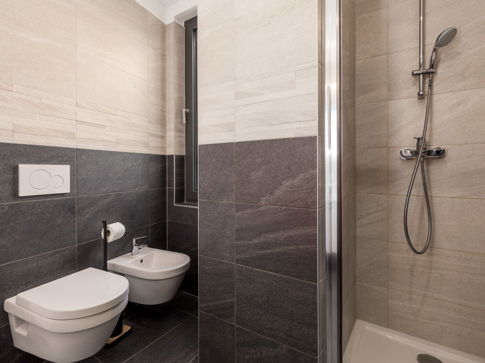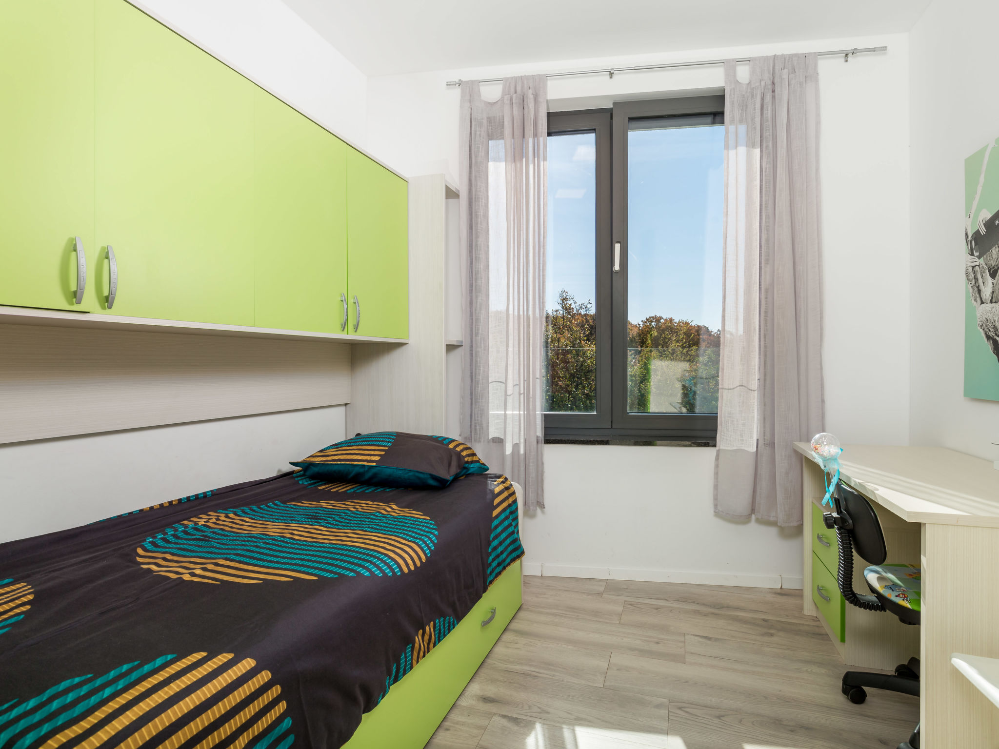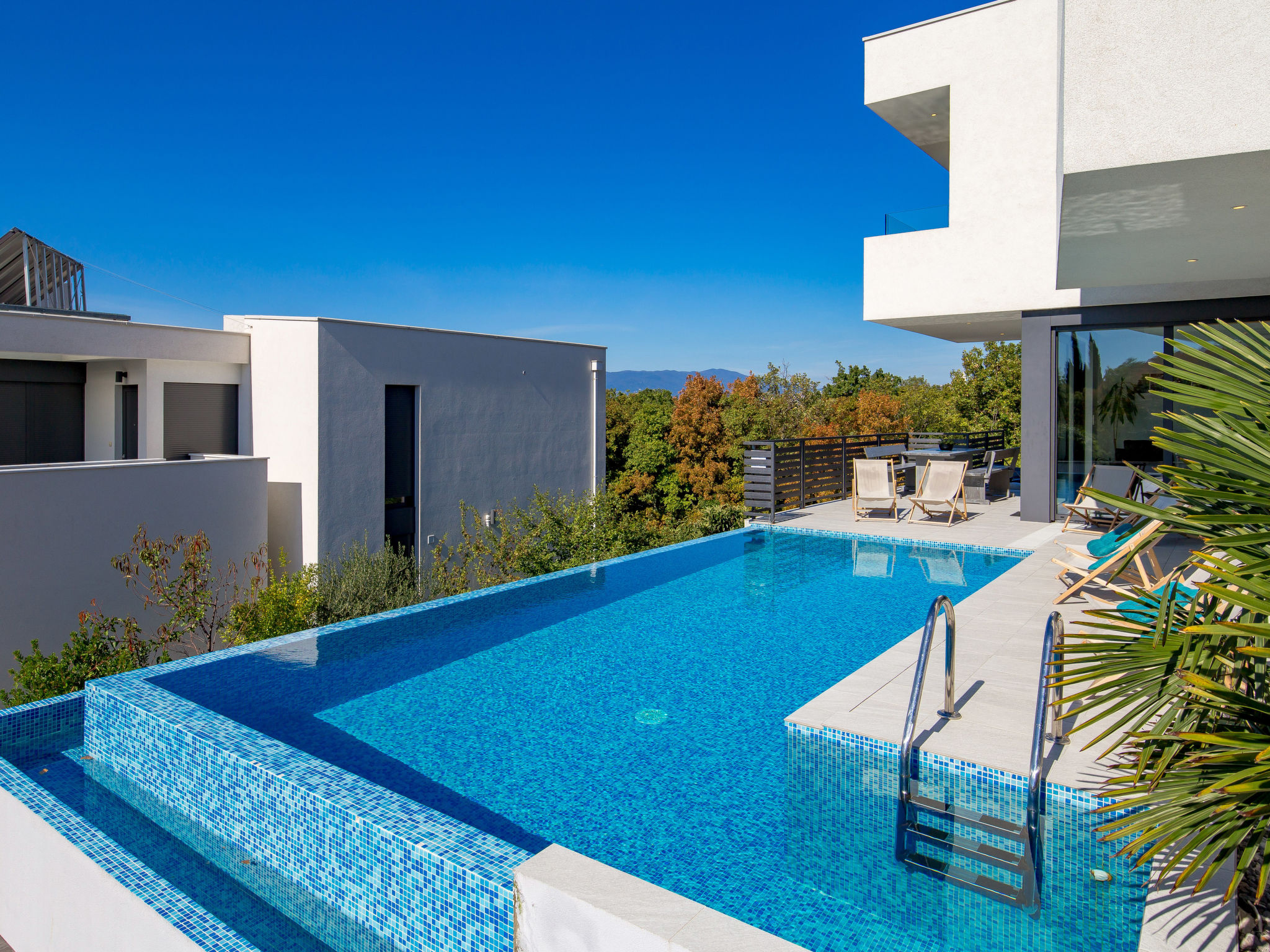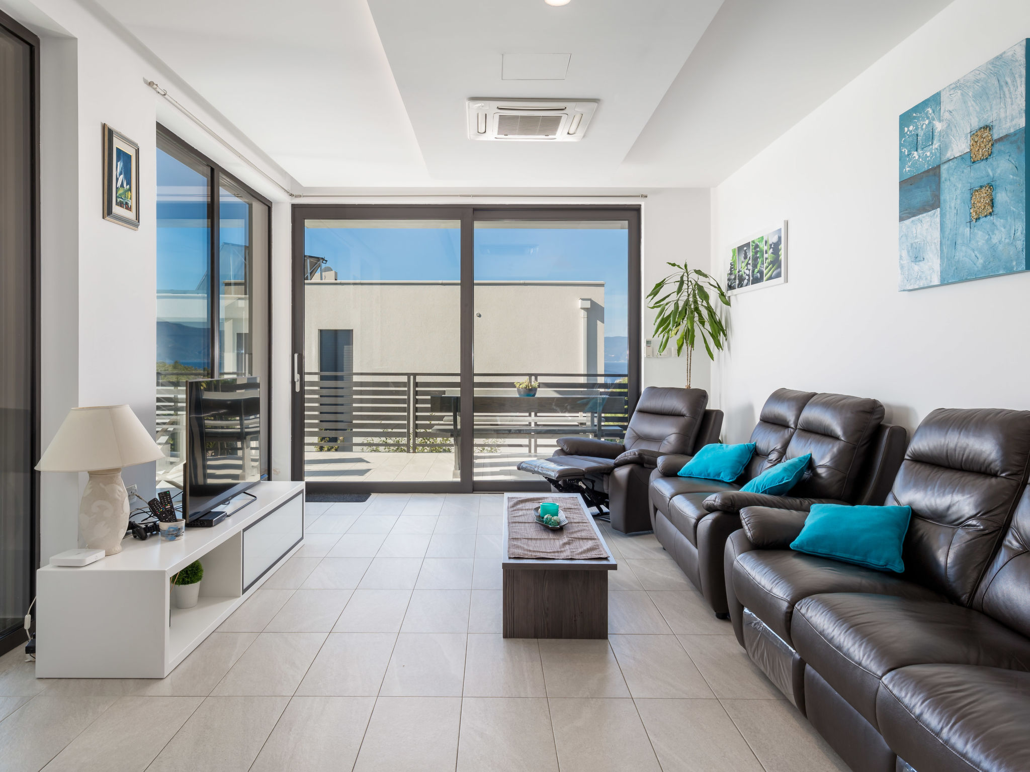 5-Zimmer-Wohnung 250 m2 auf 2 Stockwerken, im Erdgeschoss. Wohn-/Esszimmer mit Internationale TV-Sender, Flachbildschirm und Klimaanlage. Ausgang zur Terrasse, zum Schwimmbad. Offene Küche (Backofen, Geschirrspüler, 4 Glaskeramikherd Platten, Mikrowelle, Tiefkühler, elektrische Kaffeemaschine). Sep. WC. Obergeschoss: 1 Zimmer mit 1 franz. Bett (160 cm, Länge 200 cm), Klimaanlage. 1 Zimmer mit 1 franz. Bett (160 cm, Länge 200 cm), Klimaanlage. Ausgang zum Balkon. 1 Zimmer mit 1 franz. Bett (180 cm, Länge 200 cm), Bad/Bidet/WC und Klimaanlage. Ausgang zum Balkon. 1 Zimmer mit 1 Bett (90 cm, Länge 200 cm), 1 Ausziehbett (Länge 200 cm), Klimaanlage. Dusche/Bidet/WC, Doppelwaschbecken. Bodenheizung, Warmluftheizung. Liegestühle. Sicht auf das Meer. Zur Verfügung: Waschmaschine, Wäschetrockner, Haartrockner. Internet (Wireless LAN, gratis). Parkplatz (3 Autos). Bitte beachten: 2 Haustiere/Hunde erlaubt. Eigener Eingang. Unteres Geschoss: Unterhaltungsraum (TV, Playstation, Tischfußball, Darts, Tischtennis).