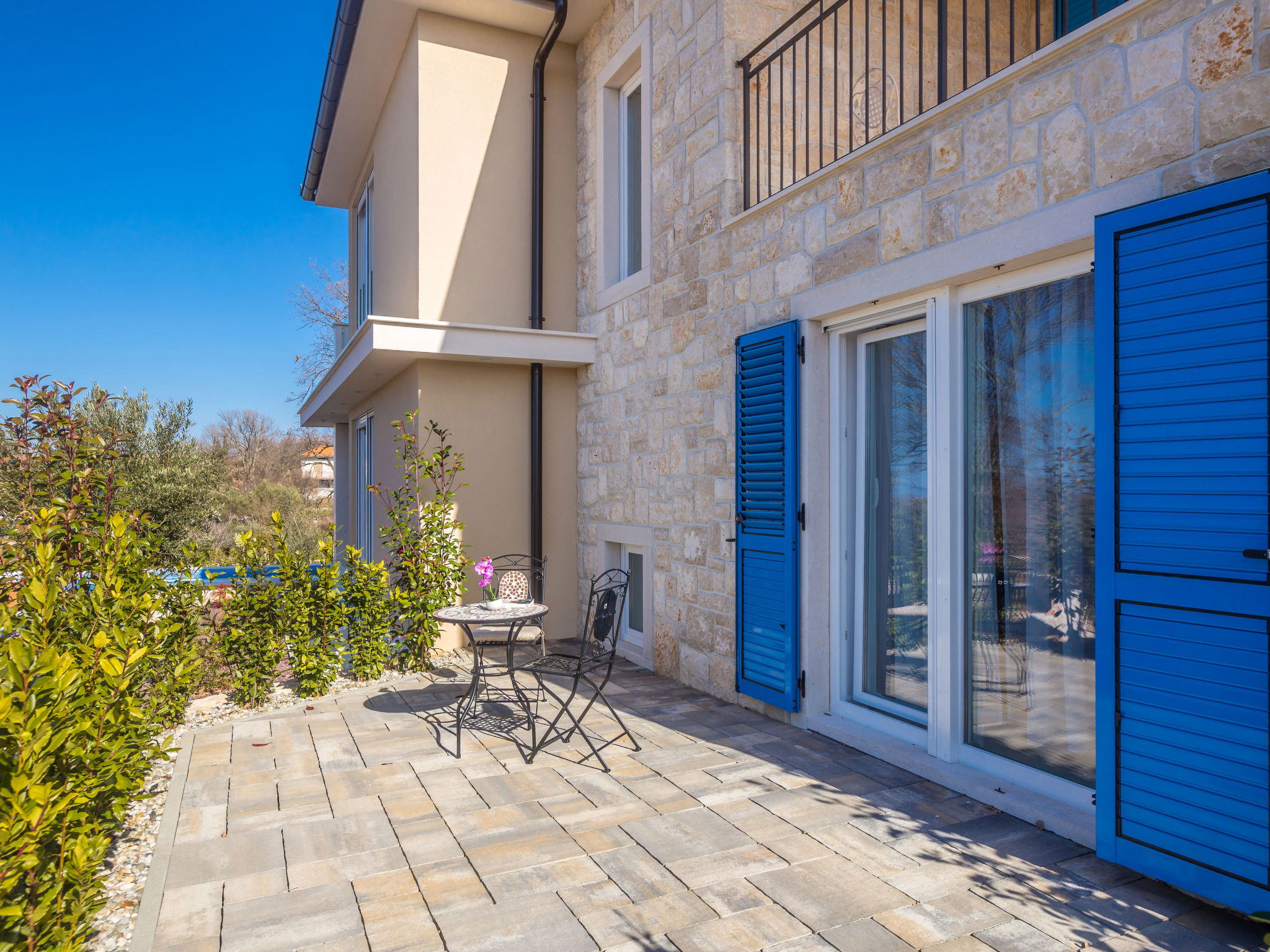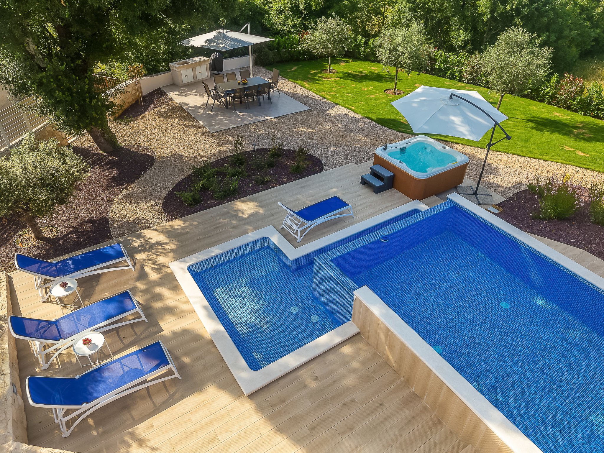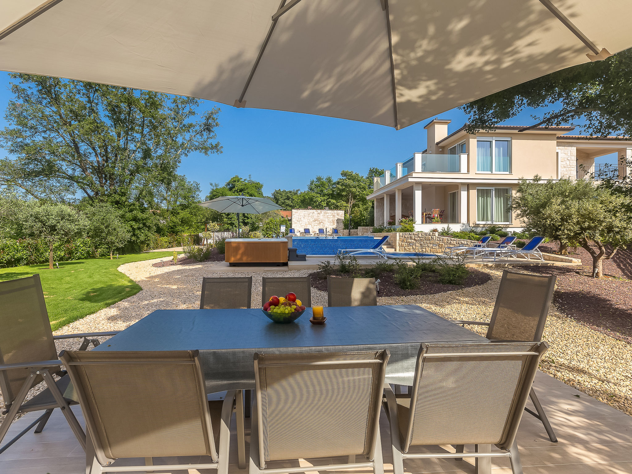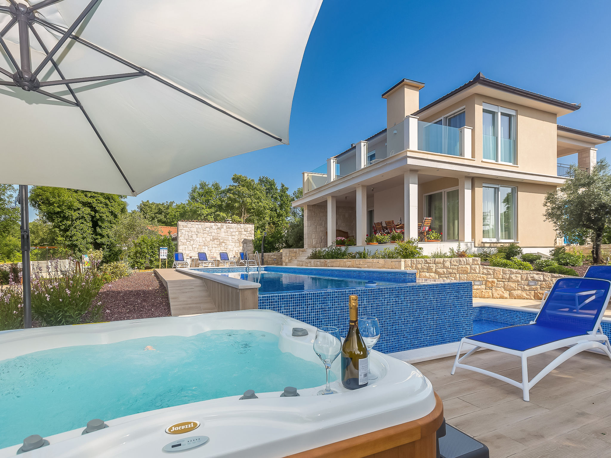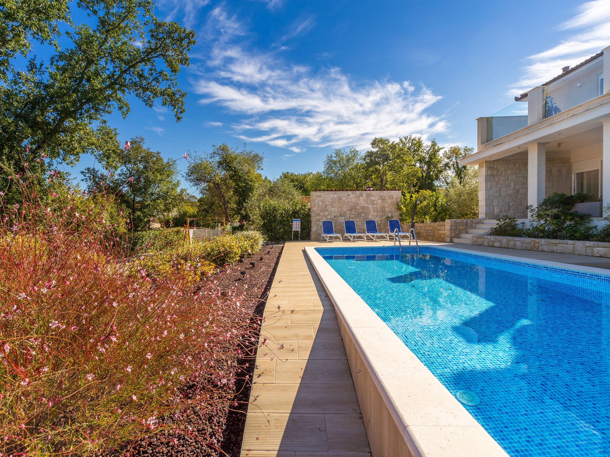 7-Zimmer-Villa 250 m2 auf 3 Stockwerken, Südlage. Sehr schön und luxuriös eingerichtet: Wohn-/Esszimmer 35 m2 mit 1 Doppeldiwanbett (160 cm, Länge 240 cm), Sat-TV (Flachbildschirm), Klimaanlage. Ausgang zur Terrasse. 1 Zimmer mit 1 franz. Bett (200 cm, Länge 210 cm), Dusche/Bidet/WC und Sat-TV (Flachbildschirm), Klimaanlage. Ausgang zur Terrasse. Offene Küche (Backofen, Geschirrspüler, 4 Induktionskochplatten, Mikrowelle, Tiefkühler, elektrische Kaffeemaschine). Sep. WC. Unteres Geschoss: Wohnzimmer mit Küchenblock und Sat-TV (Flachbildschirm). Dusche/WC. Obergeschoss: 1 Zimmer mit 1 franz. Bett (200 cm, Länge 210 cm), Sat-TV (Flachbildschirm), Klimaanlage. Ausgang zum Balkon. 1 Zimmer mit 2 Betten (90 cm, Länge 200 cm), Sat-TV (Flachbildschirm), Klimaanlage. 1 grosses Zimmer 30 m2 mit 1 franz. Bett (200 cm, Länge 210 cm), Dusche/Bidet/WC und Sat-TV (Flachbildschirm), Klimaanlage. Ausgang zur Terrasse. Bad/Bidet/WC. Bodenheizung. Balkon 10 m2, 2 Terrassen 25 m2, Terrasse 22 m2, überdacht. Terrassenmöbel, Gartengrill (mobil), Liegestühle. Fernsicht auf das Meer. Zur Verfügung: Safe, Haartrockner. Internet (Wireless LAN, gratis). Terrasse 15 m2. Im Untergeschoss: Wohnzimmer mit Küchenecke (Waschbecken, Kühlschrank, elektrische Kaffeemaschine) und Billardtisch, Ruheraum mit finnischer Sauna.