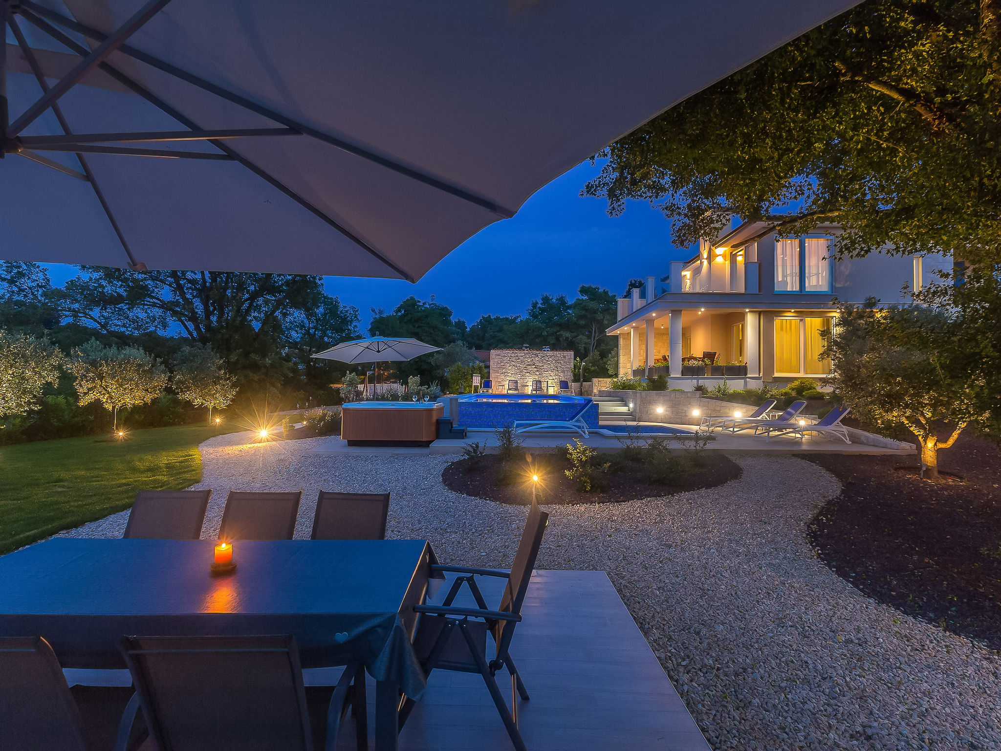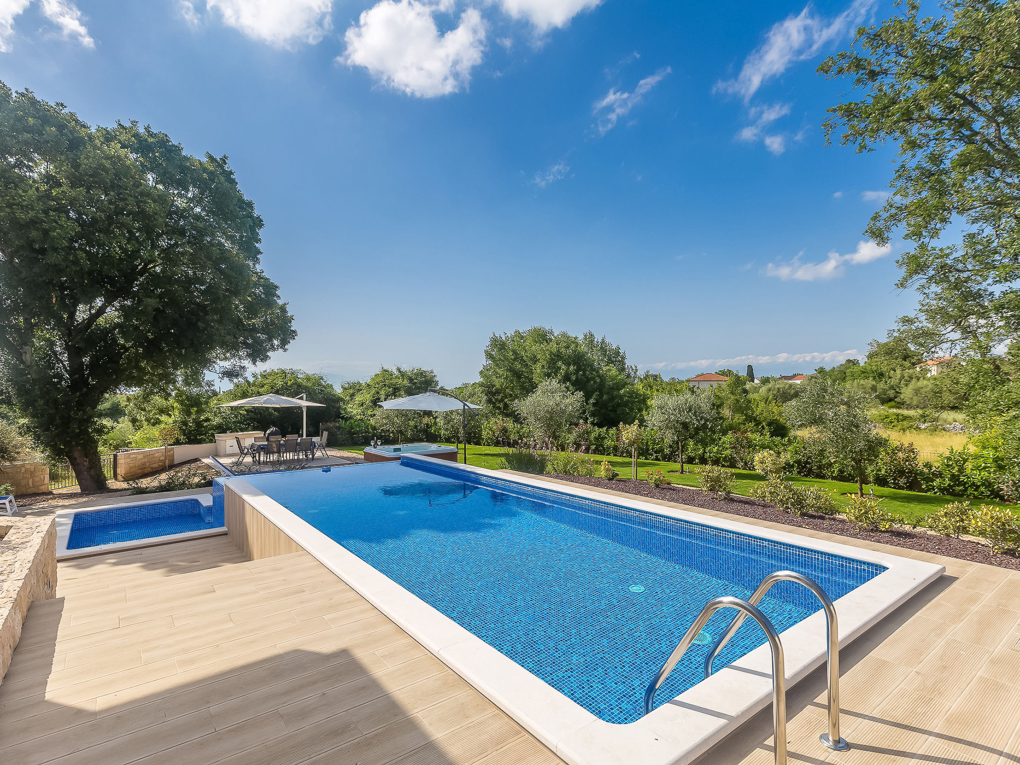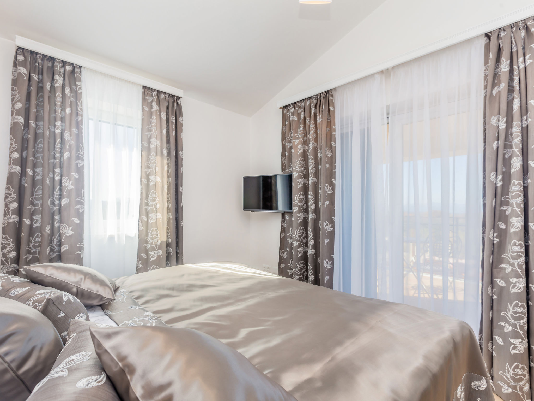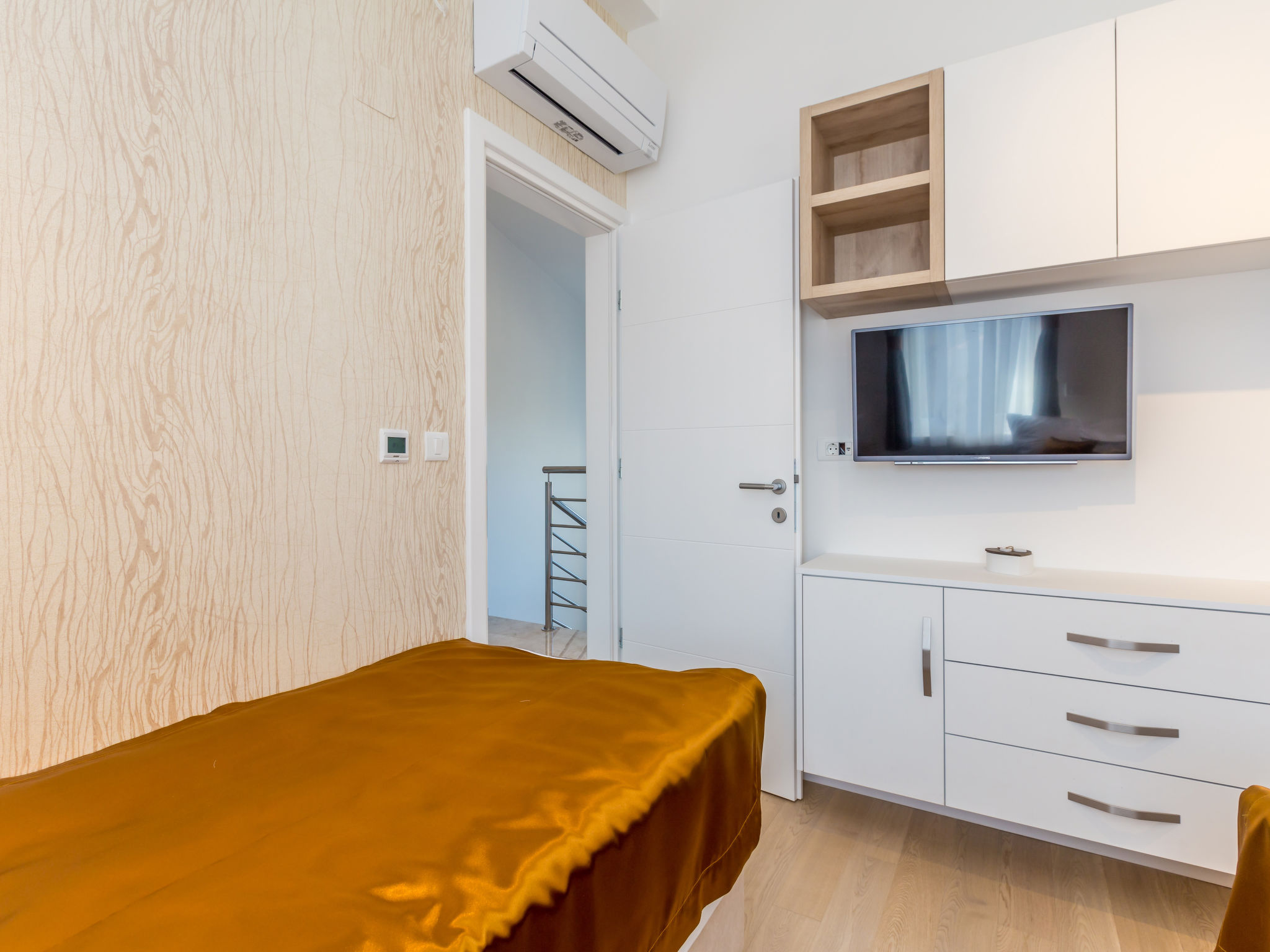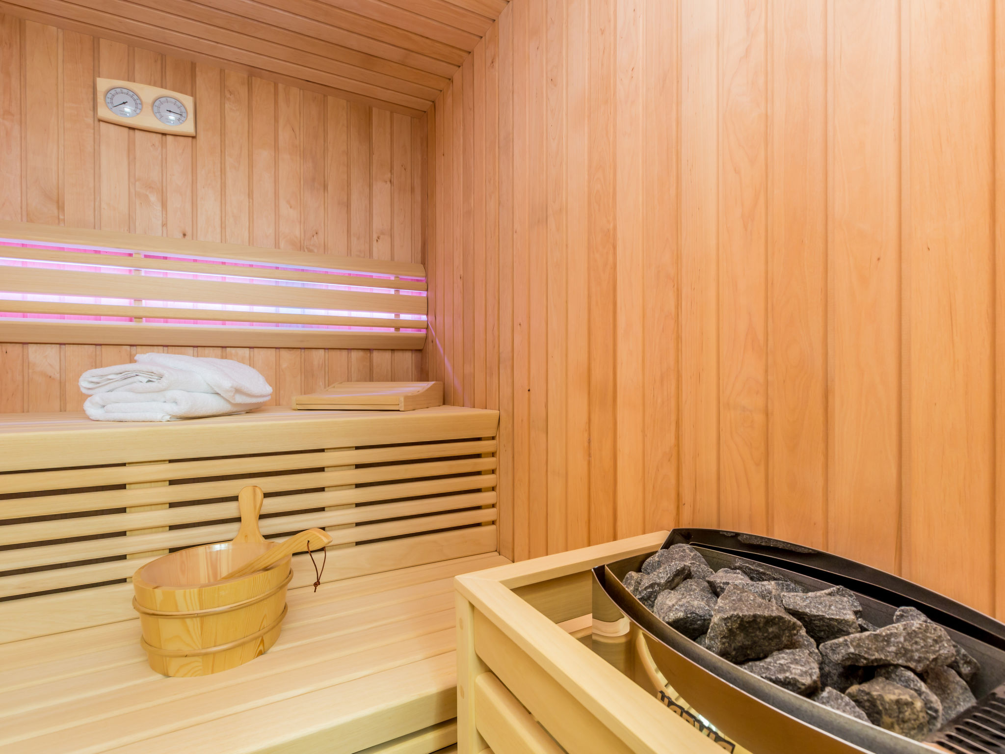 7-Zimmer-Villa 250 m2 auf 3 Stockwerken, Südlage. Sehr schön und luxuriös eingerichtet: Wohn-/Esszimmer 35 m2 mit 1 Doppeldiwanbett (160 cm, Länge 240 cm), Sat-TV (Flachbildschirm), Klimaanlage. Ausgang zur Terrasse. 1 Zimmer mit 1 franz. Bett (200 cm, Länge 210 cm), Dusche/Bidet/WC und Sat-TV (Flachbildschirm), Klimaanlage. Ausgang zur Terrasse. Offene Küche (Backofen, Geschirrspüler, 4 Induktionskochplatten, Mikrowelle, Tiefkühler, elektrische Kaffeemaschine). Sep. WC. Unteres Geschoss: Wohnzimmer mit Küchenblock und Sat-TV (Flachbildschirm). Dusche/WC. Obergeschoss: 1 Zimmer mit 1 franz. Bett (200 cm, Länge 210 cm), Sat-TV (Flachbildschirm), Klimaanlage. Ausgang zum Balkon. 1 Zimmer mit 2 Betten (90 cm, Länge 200 cm), Sat-TV (Flachbildschirm), Klimaanlage. 1 grosses Zimmer 30 m2 mit 1 franz. Bett (200 cm, Länge 210 cm), Dusche/Bidet/WC und Sat-TV (Flachbildschirm), Klimaanlage. Ausgang zur Terrasse. Bad/Bidet/WC. Bodenheizung. Balkon 10 m2, 2 Terrassen 25 m2, Terrasse 22 m2, überdacht. Terrassenmöbel, Gartengrill (mobil), Liegestühle. Fernsicht auf das Meer. Zur Verfügung: Safe, Haartrockner. Internet (Wireless LAN, gratis). Terrasse 15 m2. Im Untergeschoss: Wohnzimmer mit Küchenecke (Waschbecken, Kühlschrank, elektrische Kaffeemaschine) und Billardtisch, Ruheraum mit finnischer Sauna.