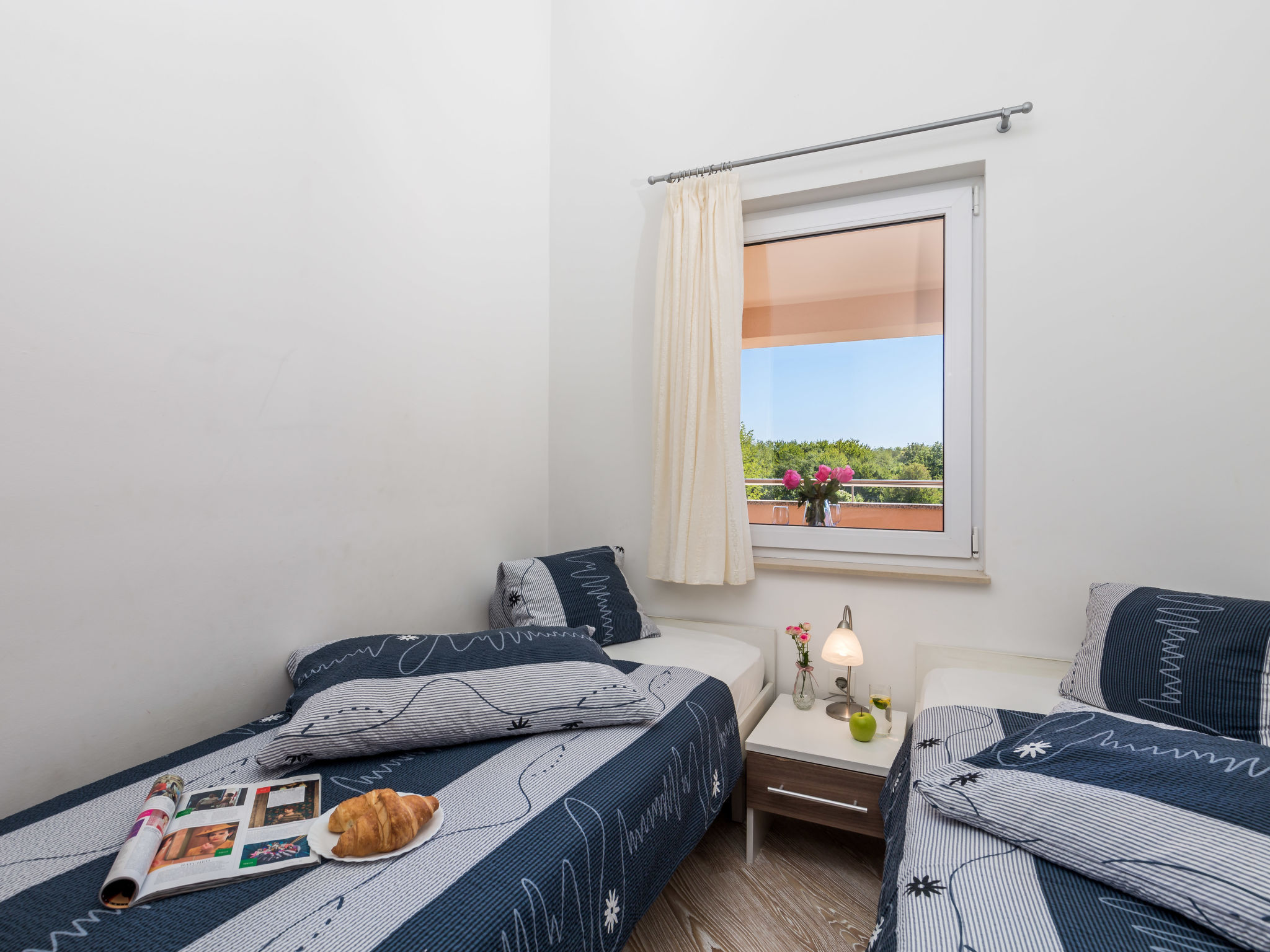 3-Zimmer-Wohnung 43 m2 im 2. Stock, Nordlage. Wohn-/Esszimmer 22 mit Sat-TV und Klimaanlage. Ausgang zum Balkon. 1 Zimmer mit 1 franz. Bett (140 cm, Länge 200 cm). 1 Zimmer mit 2 Betten (90 cm, Länge 200 cm). Offene Küche (Geschirrspüler, 4 Glaskeramikherd Platten, Mikrowelle, elektrische Kaffeemaschine). Dusche/WC. Balkon 13 m2. Balkonmöbel. Sicht auf das Meer und das Schwimmbad.