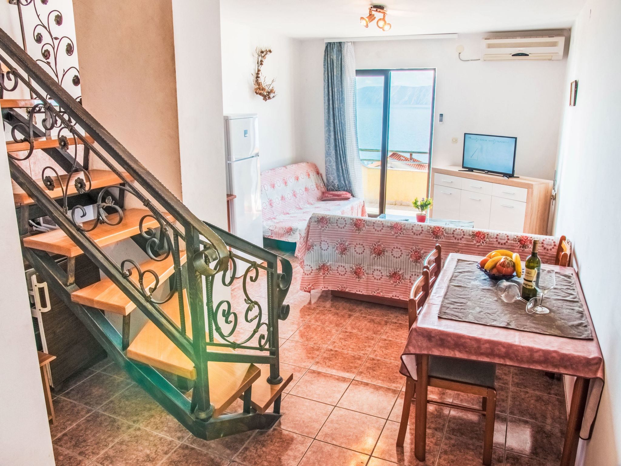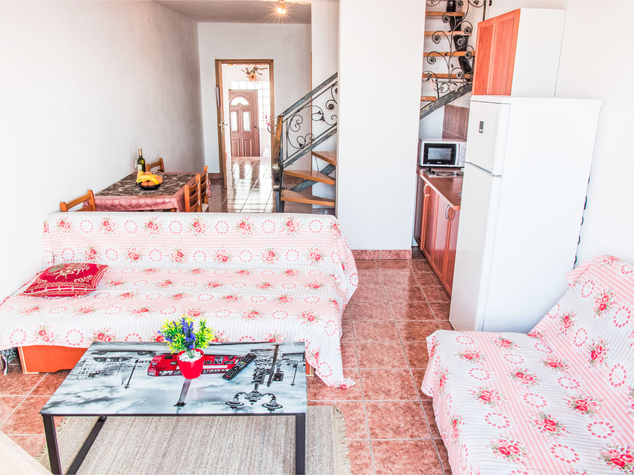 3-Zimmer-Wohnung 70 m2 auf 2 Stockwerken im 2. Stock, Südlage. Wohn-/Esszimmer 20 m2 mit 2 Diwanbetten (110 cm, Länge 190 cm), Sat-TV (Flachbildschirm), Klimaanlage. Ausgang zum Balkon. Offene Küche (2 Kochplatten, Mikrowelle, Tiefkühler, elektrische Kaffeemaschine). Dusche/WC. Dachgeschoss: 2 abgeschrägte Zimmer, Deckenhöhe 150 - 245 cm, jedes Zimmer mit 1 Doppelbett (2 x 90 cm, Länge 190 cm). Balkon 5 m2. Balkonmöbel. Herrliche Sicht auf das Meer. Zur Verfügung: Internet (Wireless LAN, gratis). 1 Haustier/Hund erlaubt.
