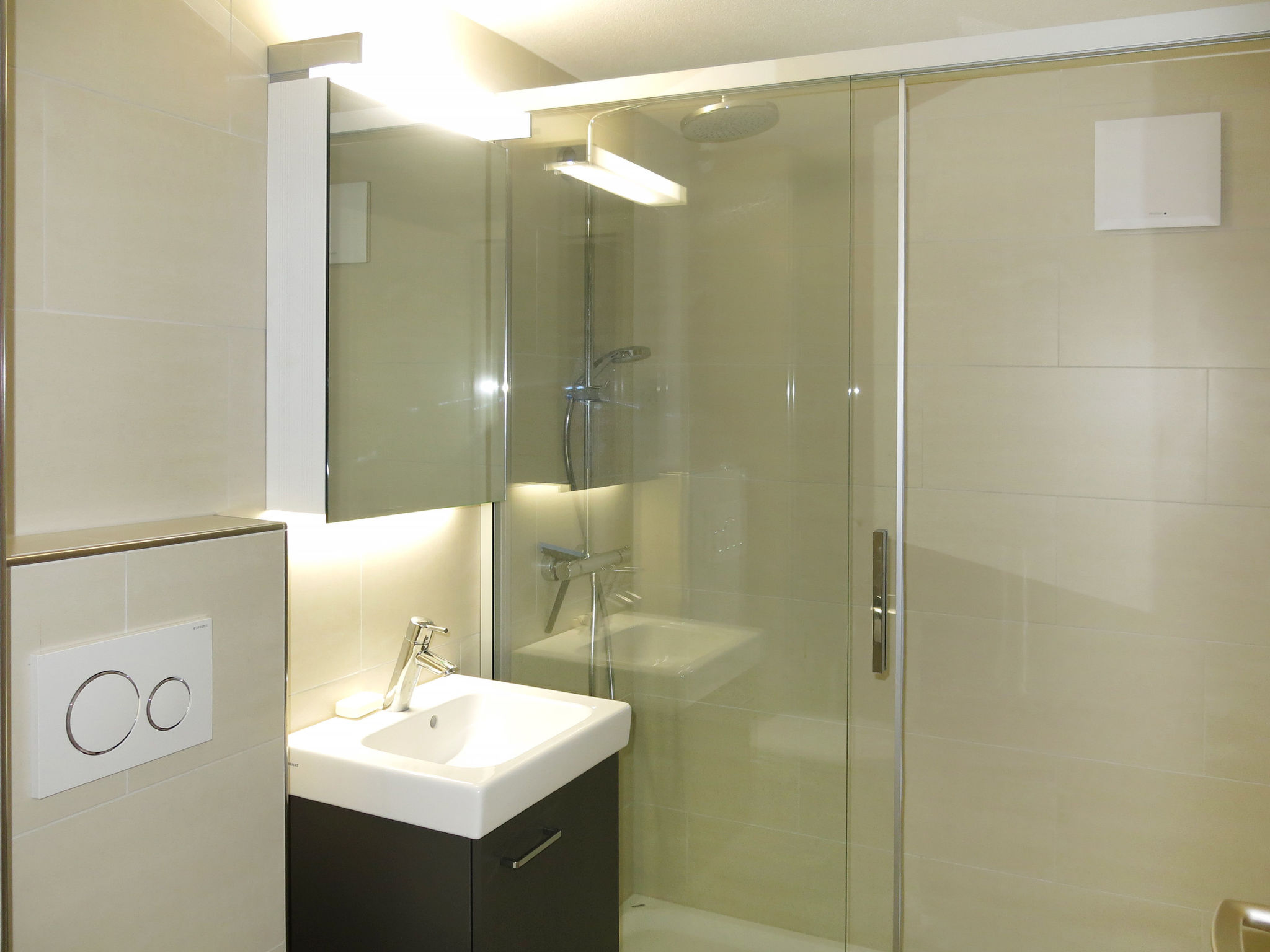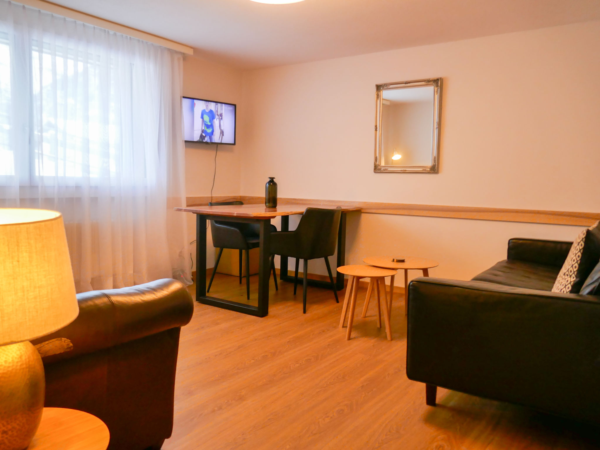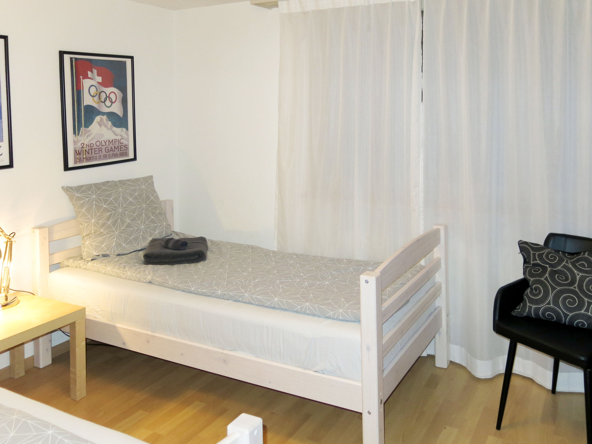 3-Zimmer-Wohnung 65 m2, unteres Geschoss. Zweckmässig eingerichtet: Wohn-/Schlafzimmer mit 1 Klappbett, Esstisch und Sat-TV. 1 Doppelzimmer. 1 Zimmer mit 2 Betten (90 cm, Länge 200 cm). Kleine Küche (Backofen, Geschirrspüler, 2 Glaskeramikherd Platten, Mikrowelle, elektrische Kaffeemaschine, Racletteofen, Fondue Set (Chinoise)). Dusche/WC. Parkettböden. Keine Sicht. Zur Verfügung: Kinderhochstuhl, Babybett. Internet (Wireless LAN, gratis). Parkplatz Nr. 4 bei Motel Alfa in 50 m. Bitte beachten: Nichtraucher-Unterkunft. Zugang über Außen- und Innentreppe. Mit Fensterschacht zum Berg (keine Aussicht).
