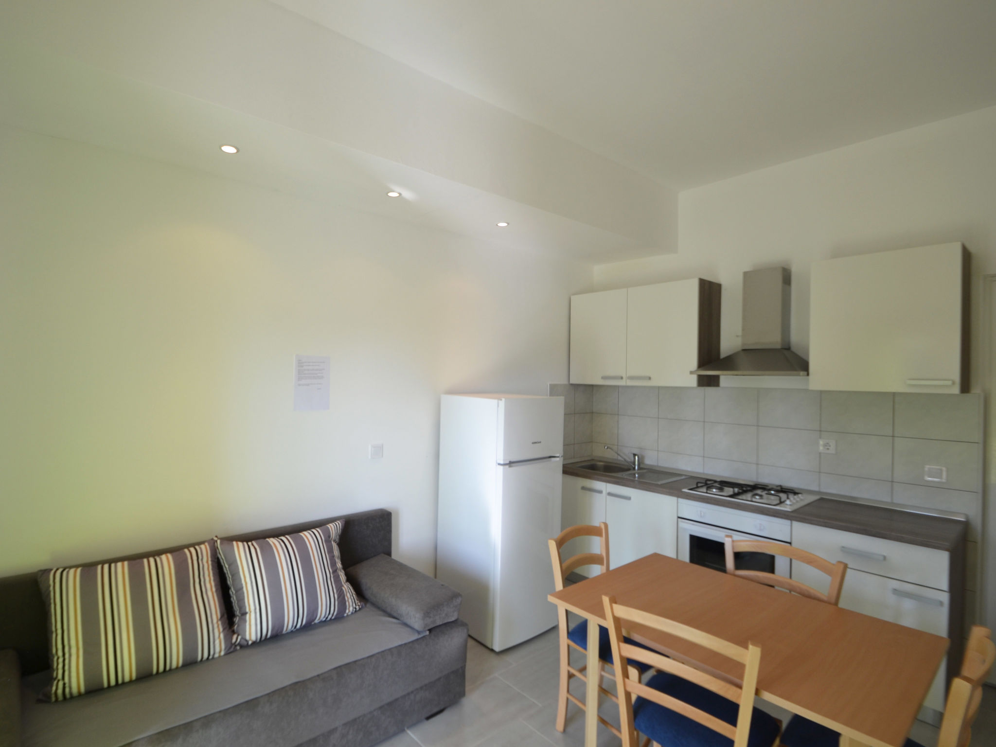 2-Zimmer-Wohnung 32 m2, im Erdgeschoss, Südwestlage. Wohn-/Esszimmer 14 m2 mit 1 Doppeldiwanbett (130 cm, Länge 200 cm), Sat-TV (Flachbildschirm), Klimaanlage. Ausgang zur Terrasse. 1 Zimmer mit 1 Doppelbett (2 x 80 cm, Länge 200 cm). Offene Küche (4 Kochplatten, Backofen, Tiefkühler). Dusche/WC. Terrasse 4 m2, überdacht. Terrassenmöbel. Zur Verfügung: Internet (Wireless LAN, gratis).