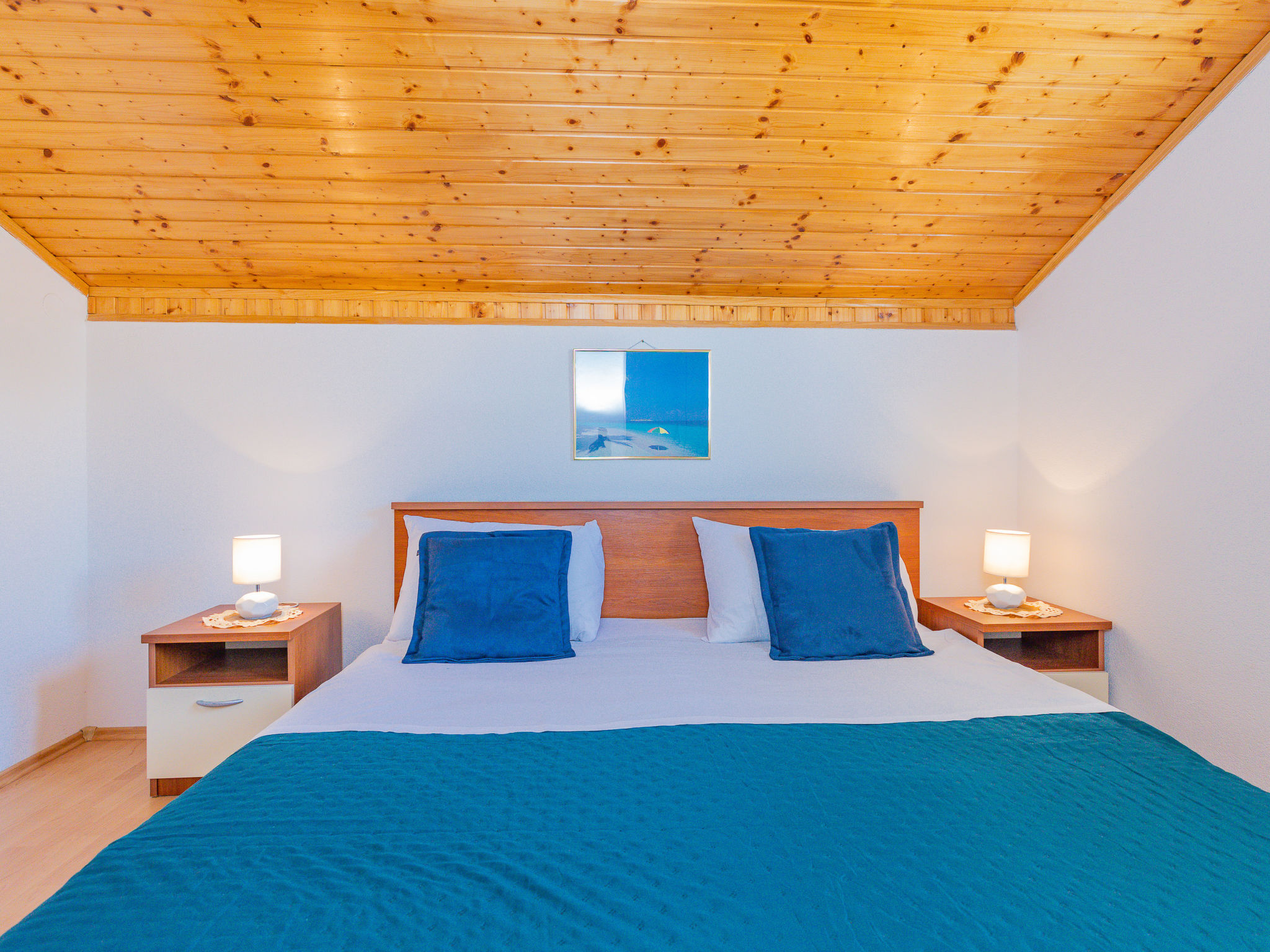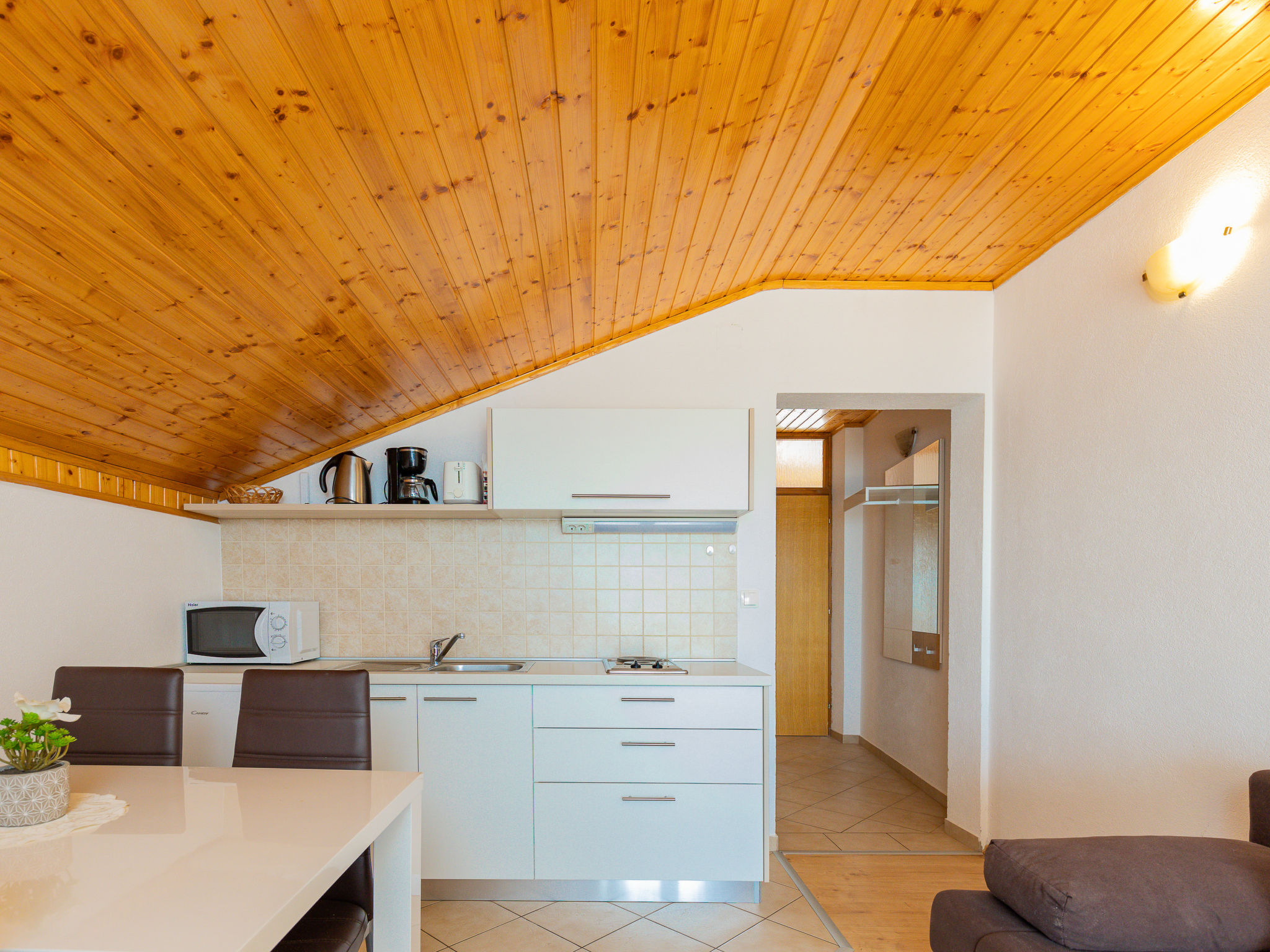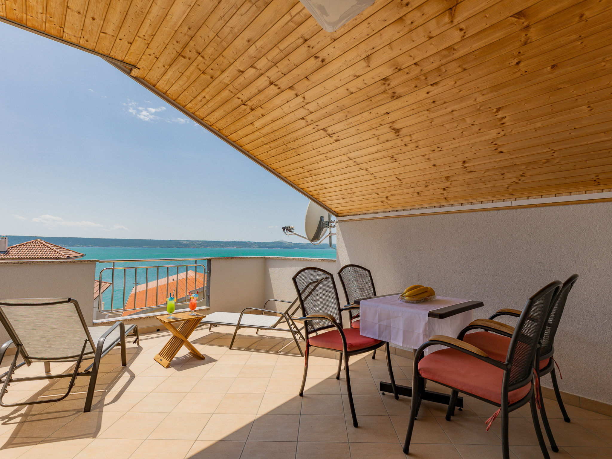 "Maja (SRD420)", 2-Zimmer-Wohnung 34 m2, im Dachgeschoss. Abgeschrägtes Wohn-/Esszimmer mit 1 Doppeldiwanbett (140 cm, Länge 190 cm), Sat-TV und Klimaanlage. Ausgang zum Balkon. 1 abgeschrägtes Zimmer mit 1 Doppelbett (2 x 90 cm, Länge 200 cm). Abgeschrägte, offene Küche (2 Kochplatten, Toaster, Wasserkocher, Mikrowelle, elektrische Kaffeemaschine). Dusche/WC. E-Heizung. Balkon 17 m2. Balkonmöbel, Liegestühle. Sicht auf das Meer. Zur Verfügung: Waschmaschine. Internet (Wireless LAN, gratis). Bitte beachten: Nichtraucher-Haus. Eigener Eingang.