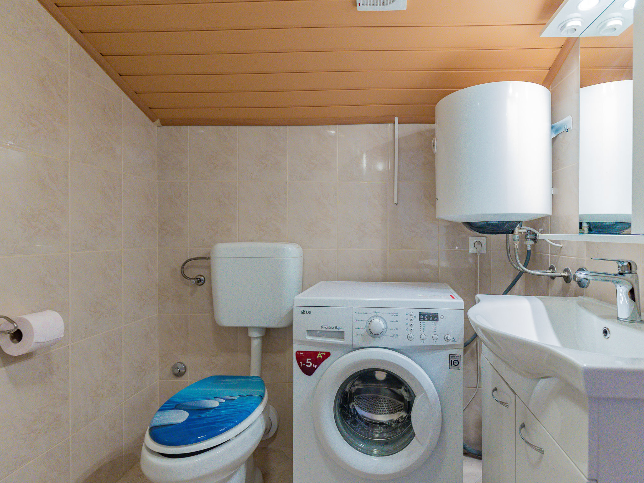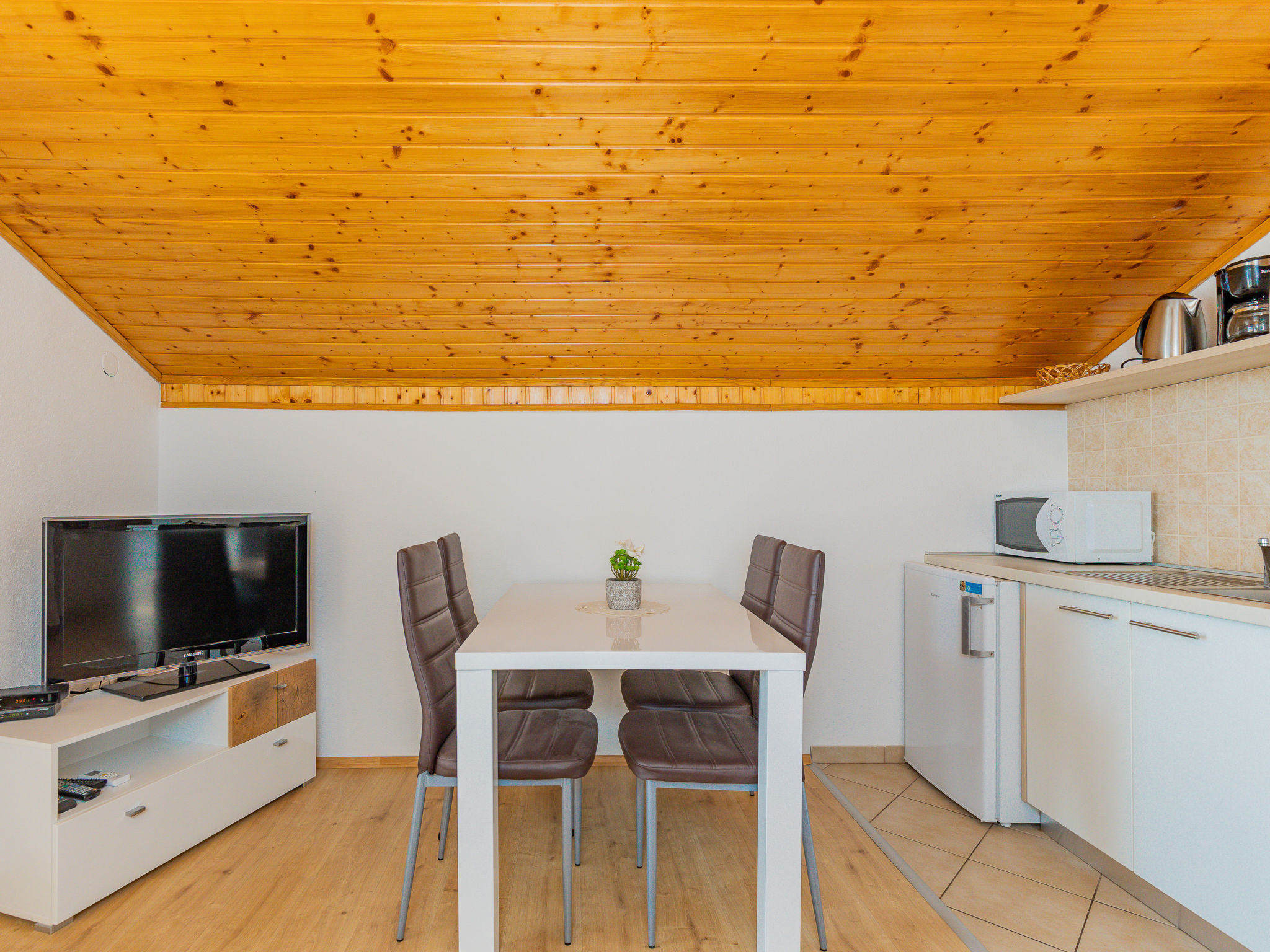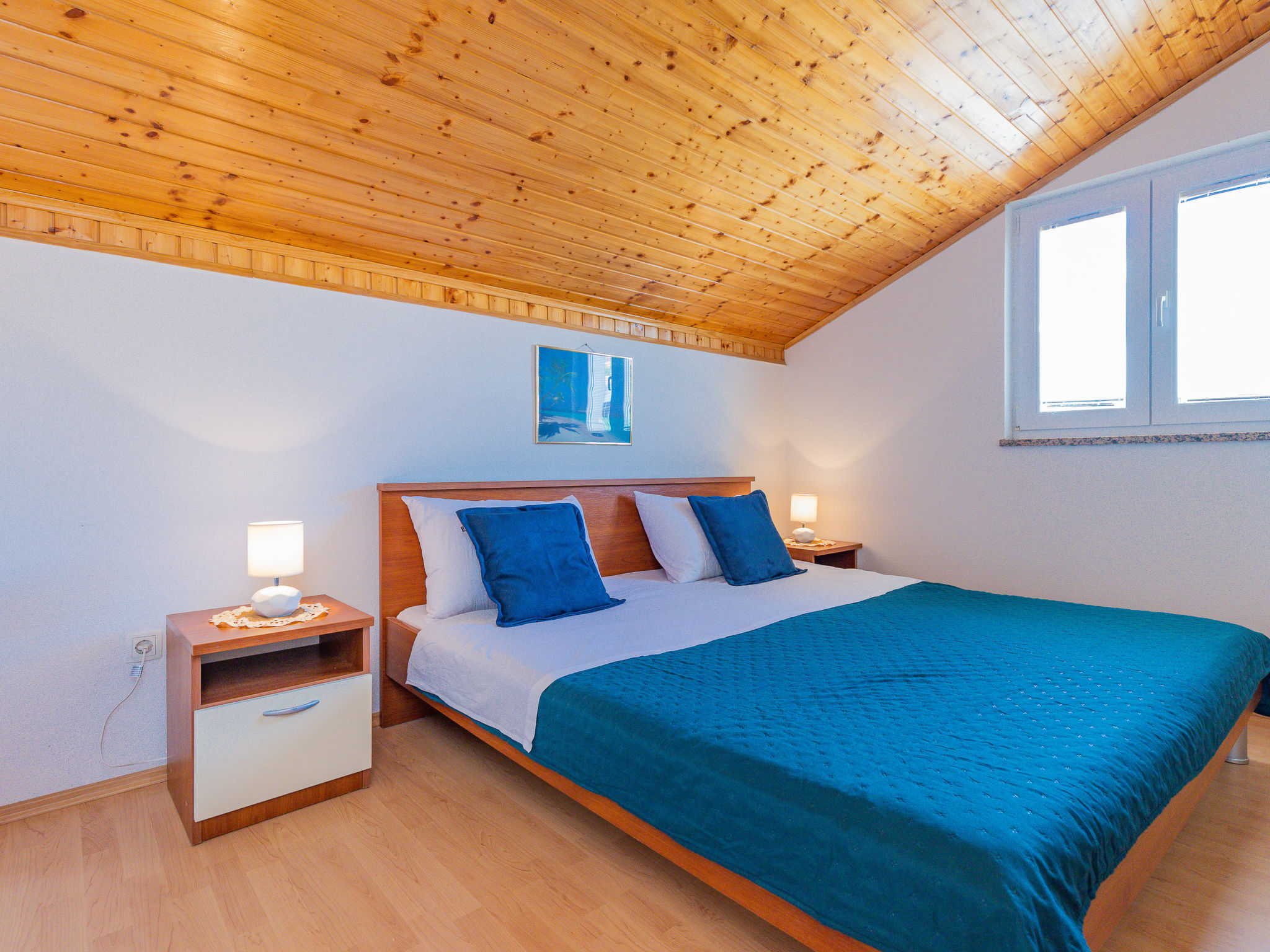 "Maja (SRD420)", 2-Zimmer-Wohnung 34 m2, im Dachgeschoss. Abgeschrägtes Wohn-/Esszimmer mit 1 Doppeldiwanbett (140 cm, Länge 190 cm), Sat-TV und Klimaanlage. Ausgang zum Balkon. 1 abgeschrägtes Zimmer mit 1 Doppelbett (2 x 90 cm, Länge 200 cm). Abgeschrägte, offene Küche (2 Kochplatten, Toaster, Wasserkocher, Mikrowelle, elektrische Kaffeemaschine). Dusche/WC. E-Heizung. Balkon 17 m2. Balkonmöbel, Liegestühle. Sicht auf das Meer. Zur Verfügung: Waschmaschine. Internet (Wireless LAN, gratis). Bitte beachten: Nichtraucher-Haus. Eigener Eingang.