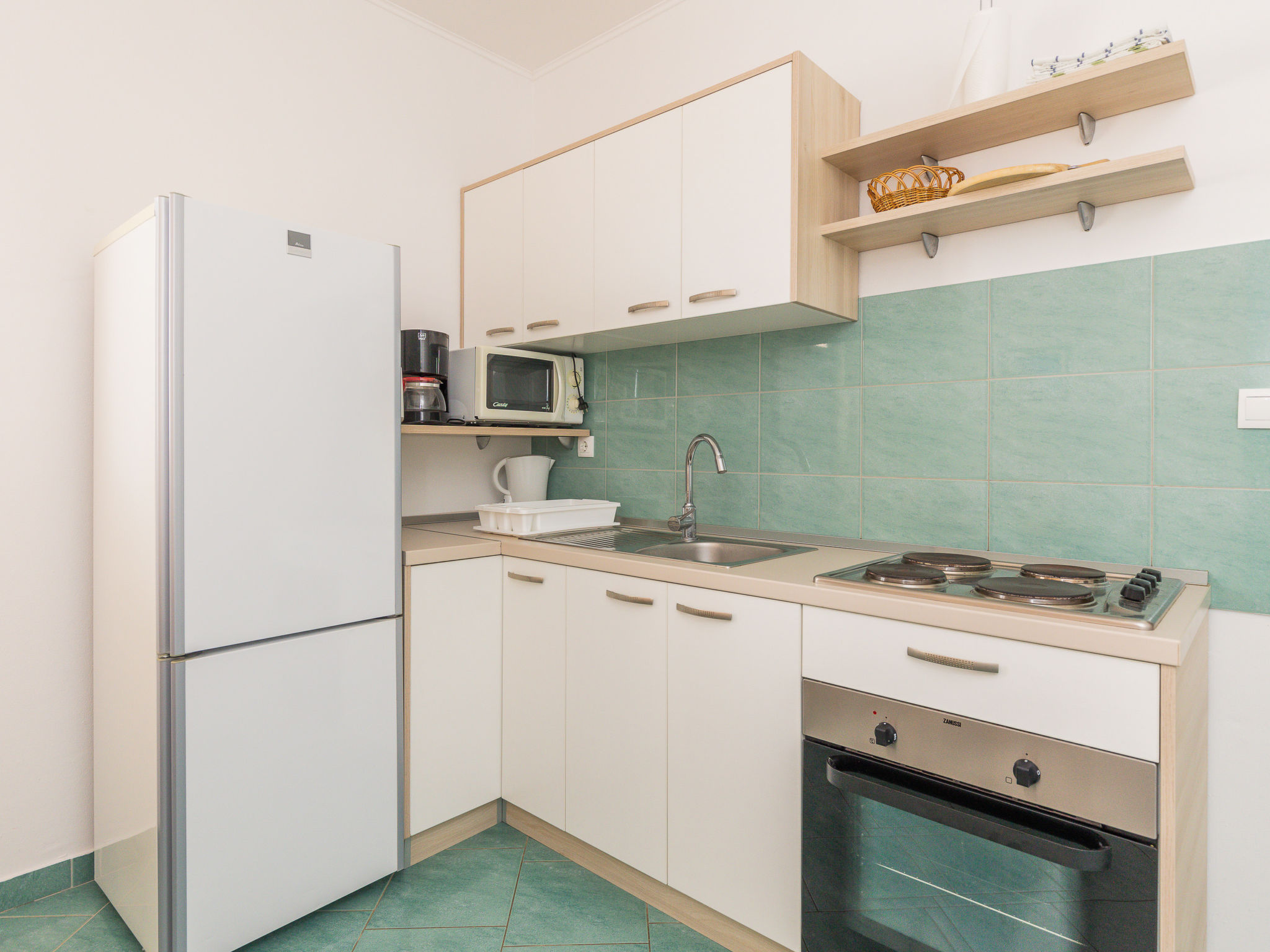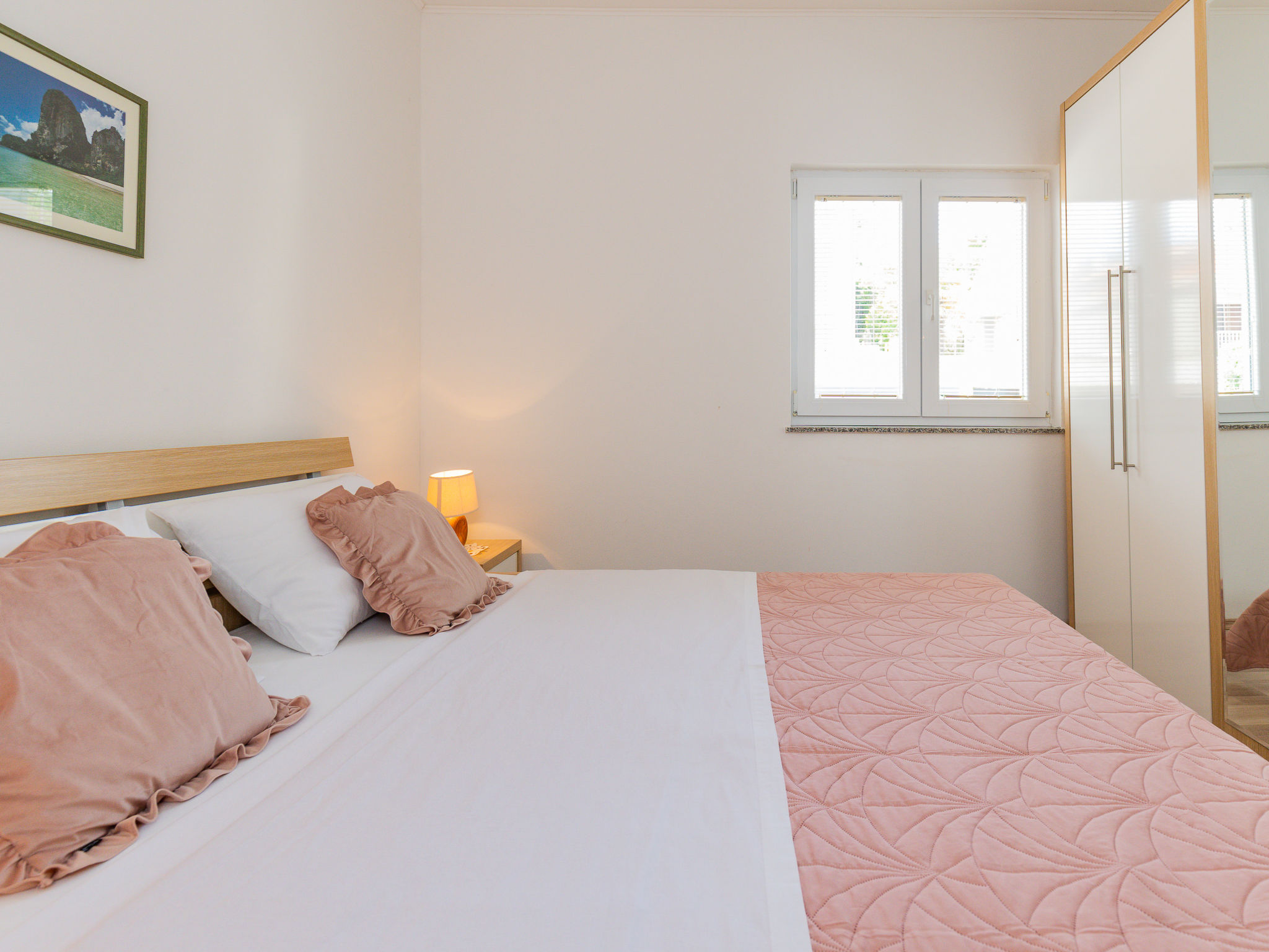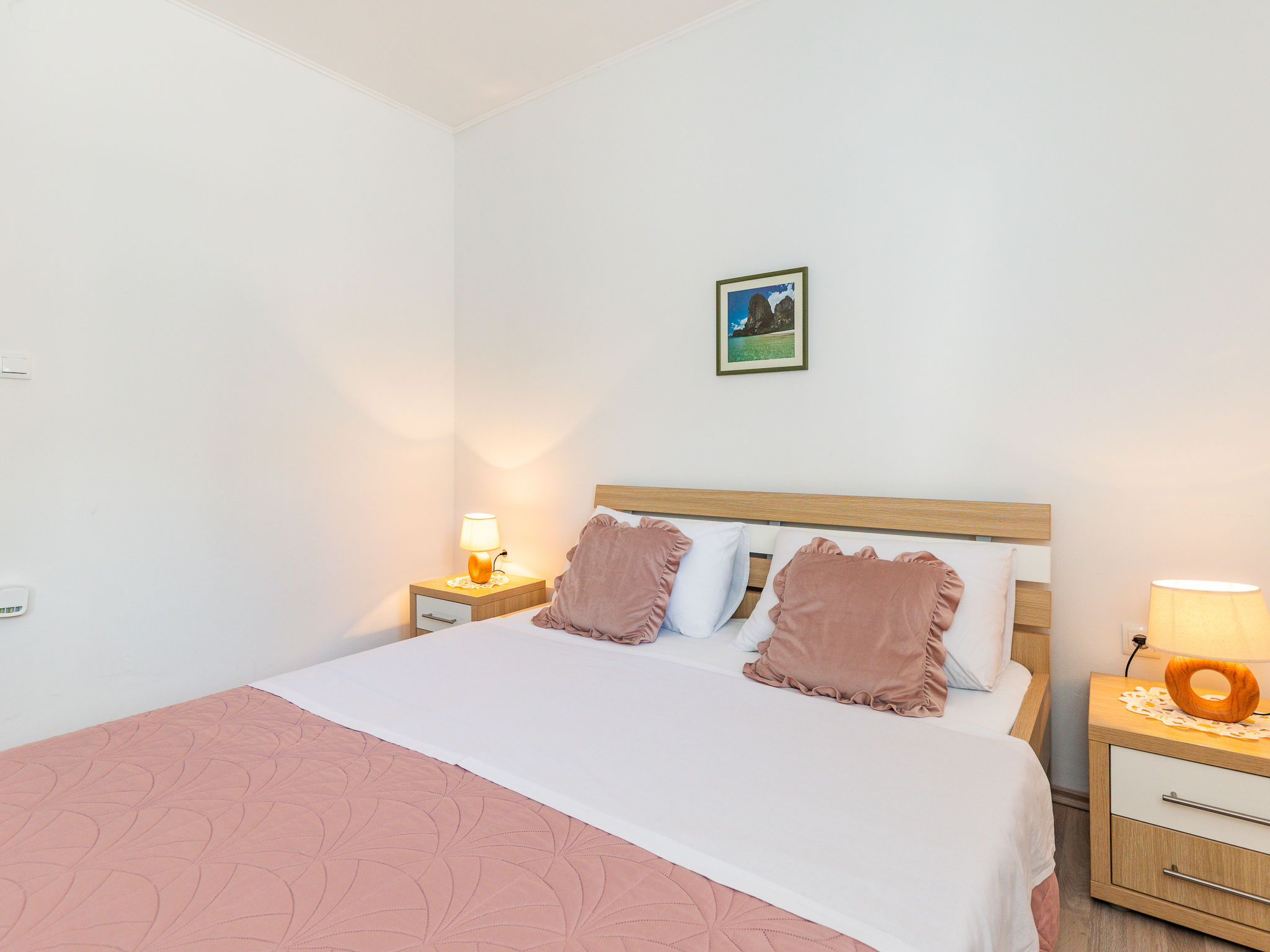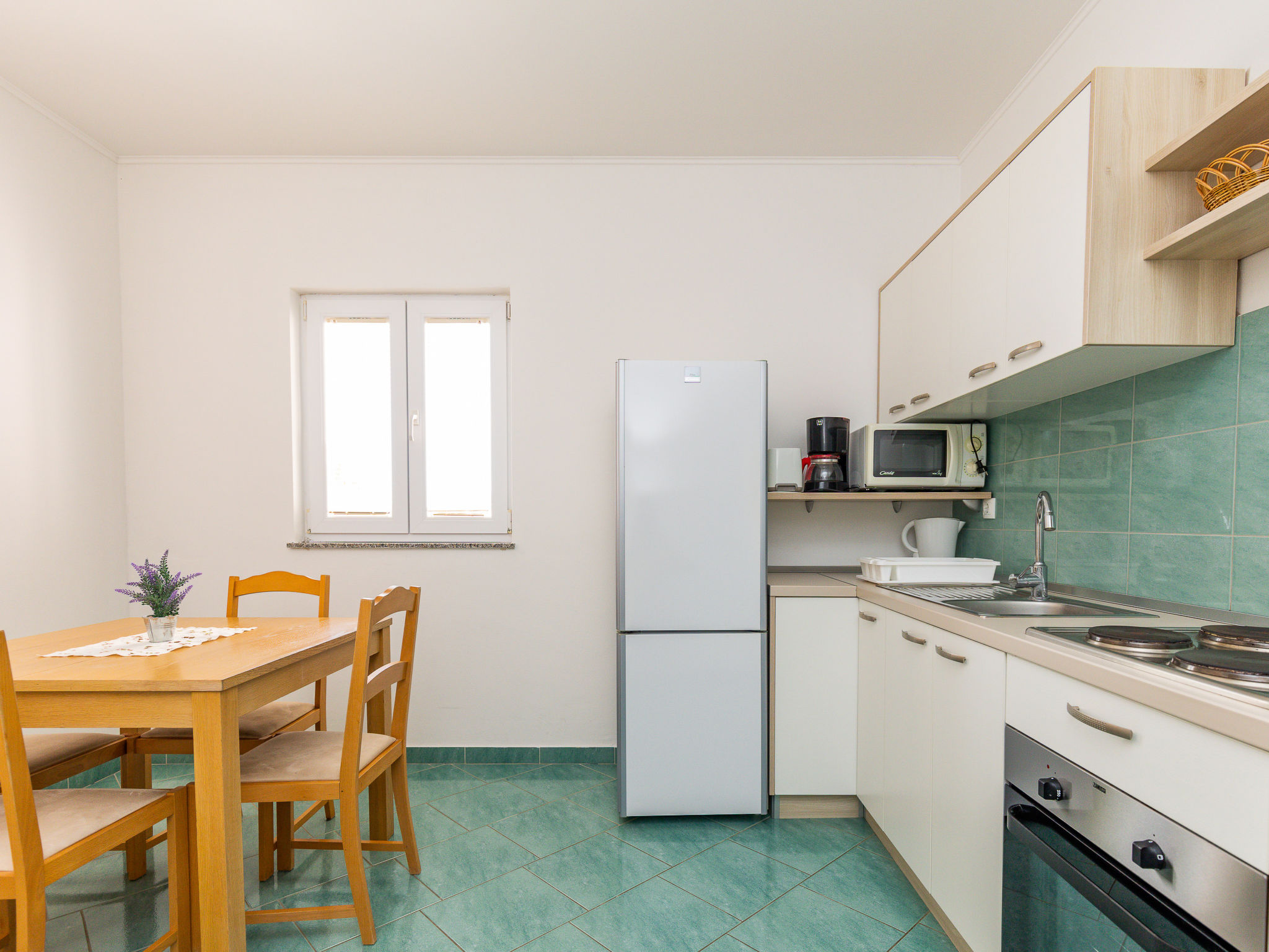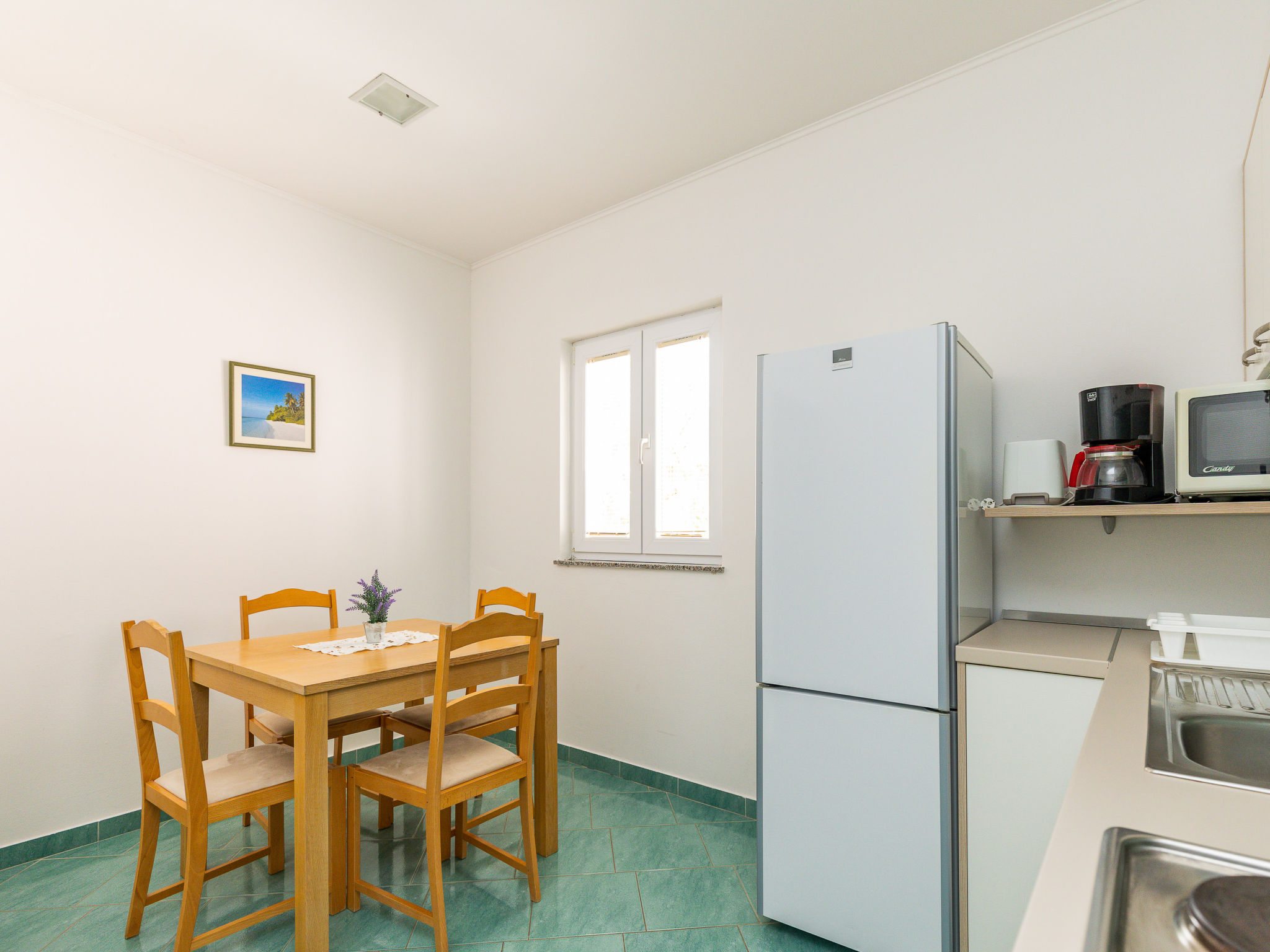 "Maja (SRD422)", 2-Zimmer-Wohnung 40 m2 im 1. Stock. Wohn-/Esszimmer mit 1 Doppeldiwanbett (155 cm, Länge 190 cm), Sat-TV und Klimaanlage. Ausgang zum Balkon. 1 Zimmer mit 1 Doppelbett (160 cm, Länge 200 cm). Offene Küche (4 Kochplatten, Backofen, Toaster, Wasserkocher, Mikrowelle, Tiefkühler, elektrische Kaffeemaschine). Dusche/WC. E-Heizung. Balkon 6 m2. Balkonmöbel. Sicht auf das Meer. Zur Verfügung: Waschmaschine. Internet (Wireless LAN, gratis). Bitte beachten: Nichtraucher-Haus. Eigener Eingang.