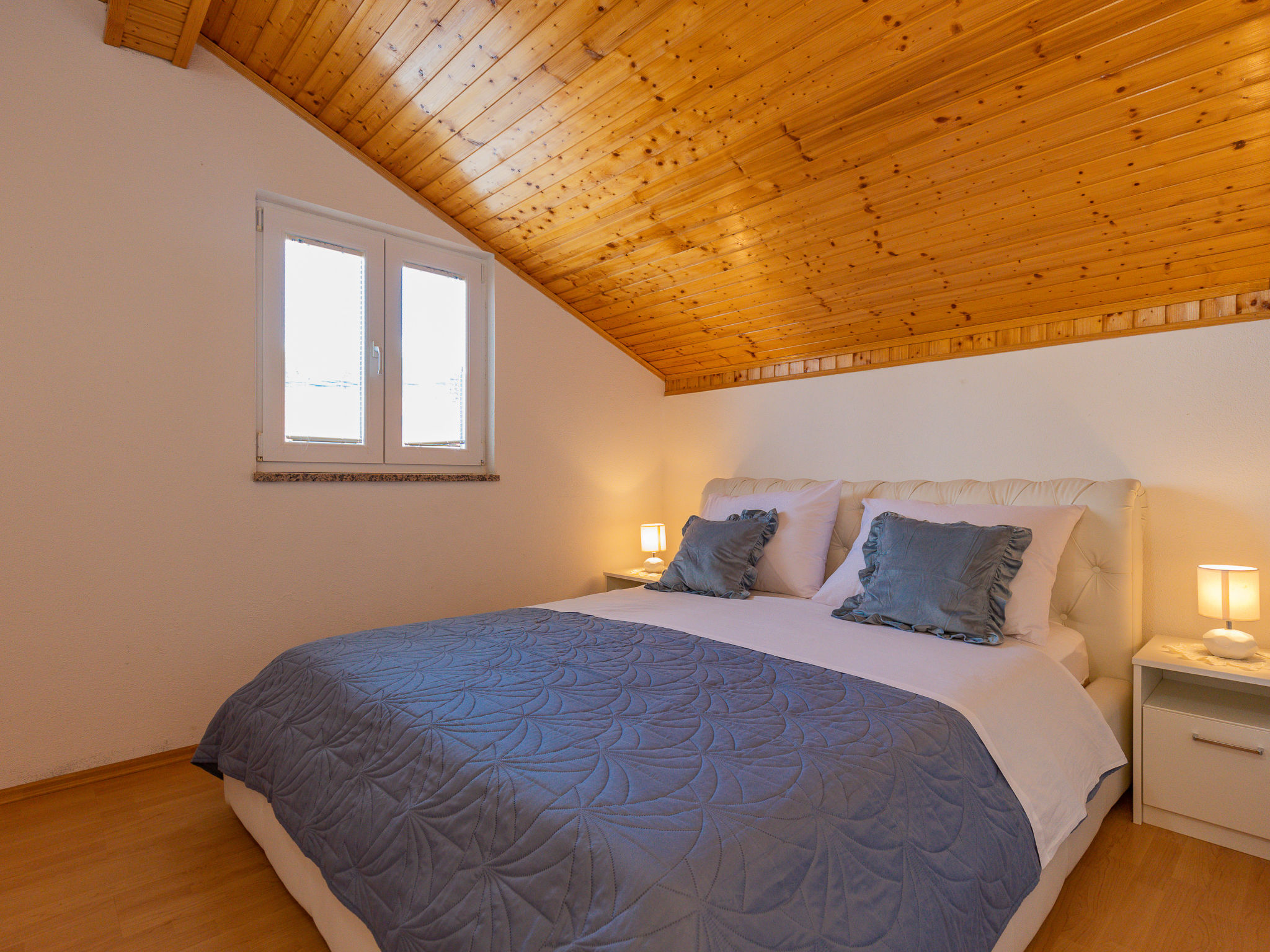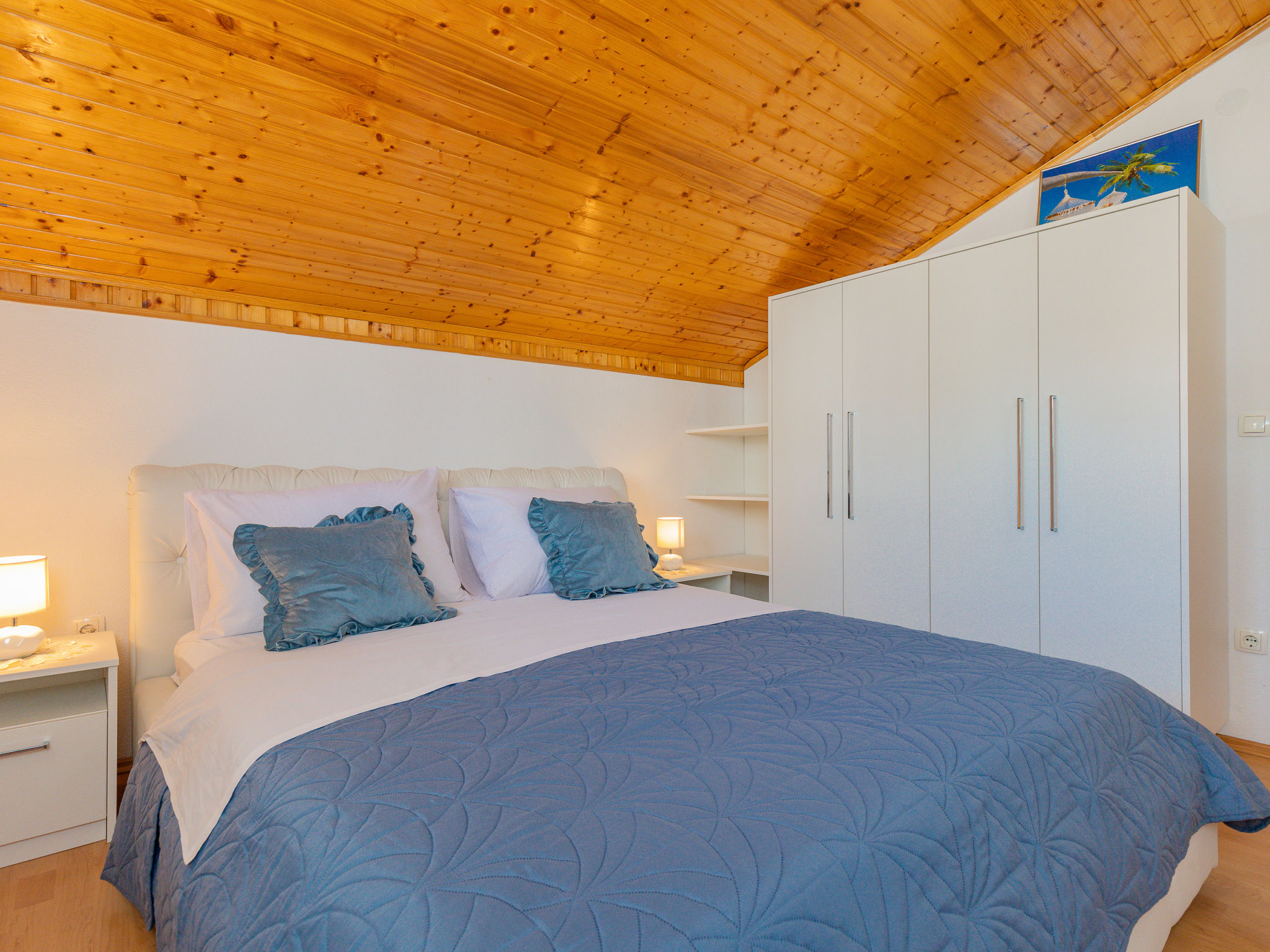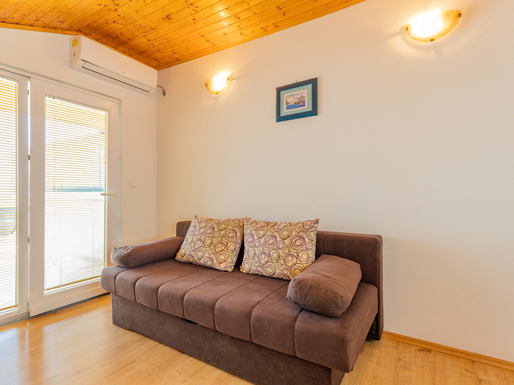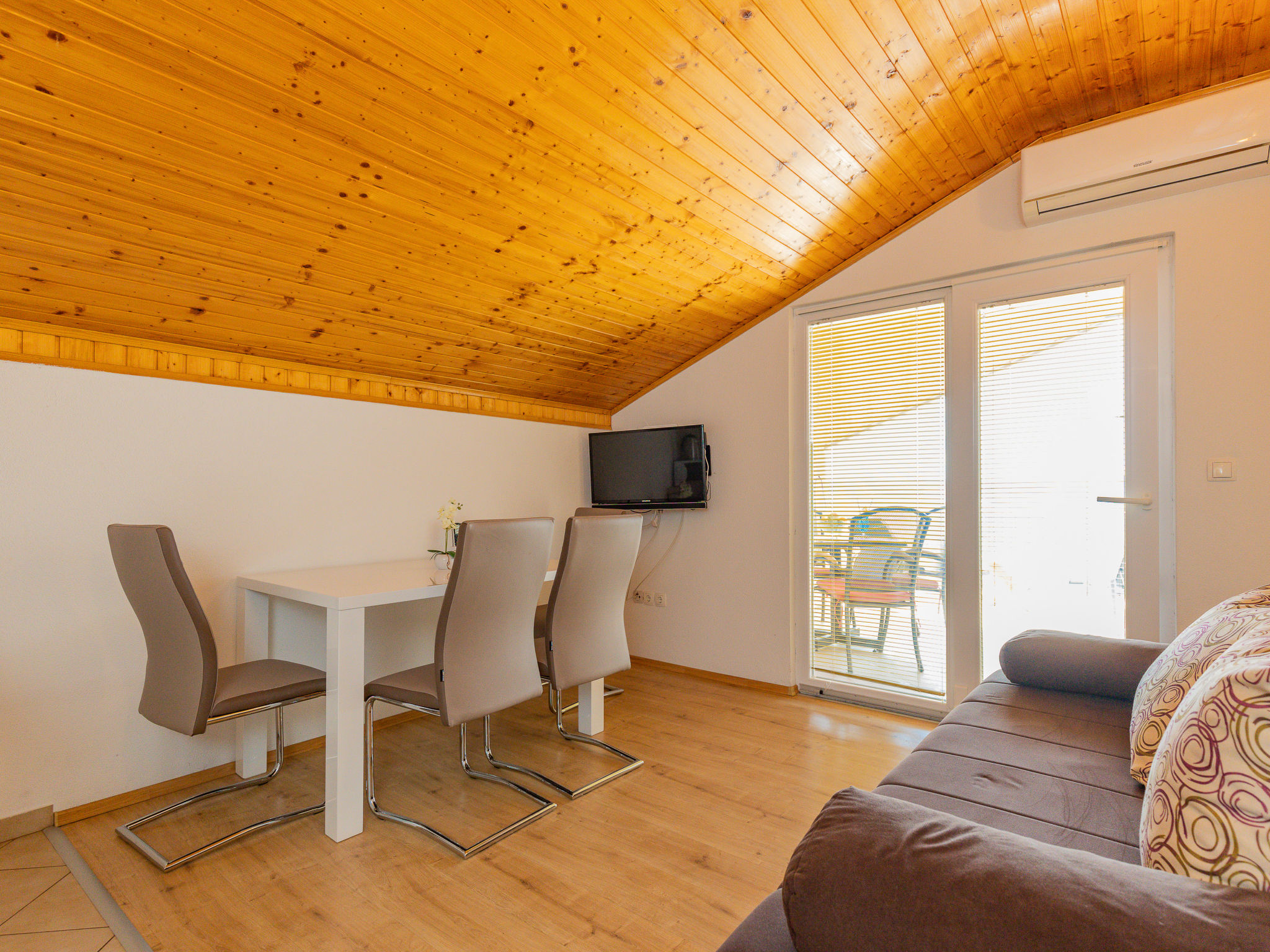 "Maja (SRD423)", 2-Zimmer-Wohnung 34 m2, im Dachgeschoss. Abgeschrägtes Wohn-/Esszimmer mit 1 Doppeldiwanbett (140 cm, Länge 190 cm), Sat-TV und Klimaanlage. Ausgang zum Balkon. 1 abgeschrägtes Zimmer mit 1 franz. Bett (160 cm, Länge 200 cm). Abgeschrägte, offene Küche (2 Kochplatten, Toaster, Wasserkocher, Mikrowelle, elektrische Kaffeemaschine). Dusche/WC. E-Heizung. Balkon 17 m2. Balkonmöbel, Liegestühle. Sicht auf das Meer. Zur Verfügung: Waschmaschine. Internet (Wireless LAN, gratis). Bitte beachten: Nichtraucher-Haus. Eigener Eingang.