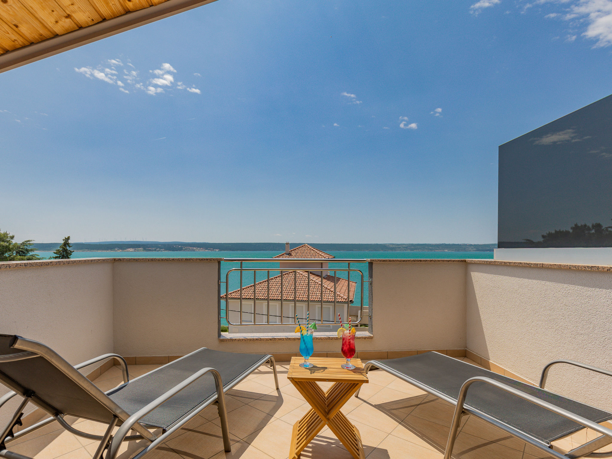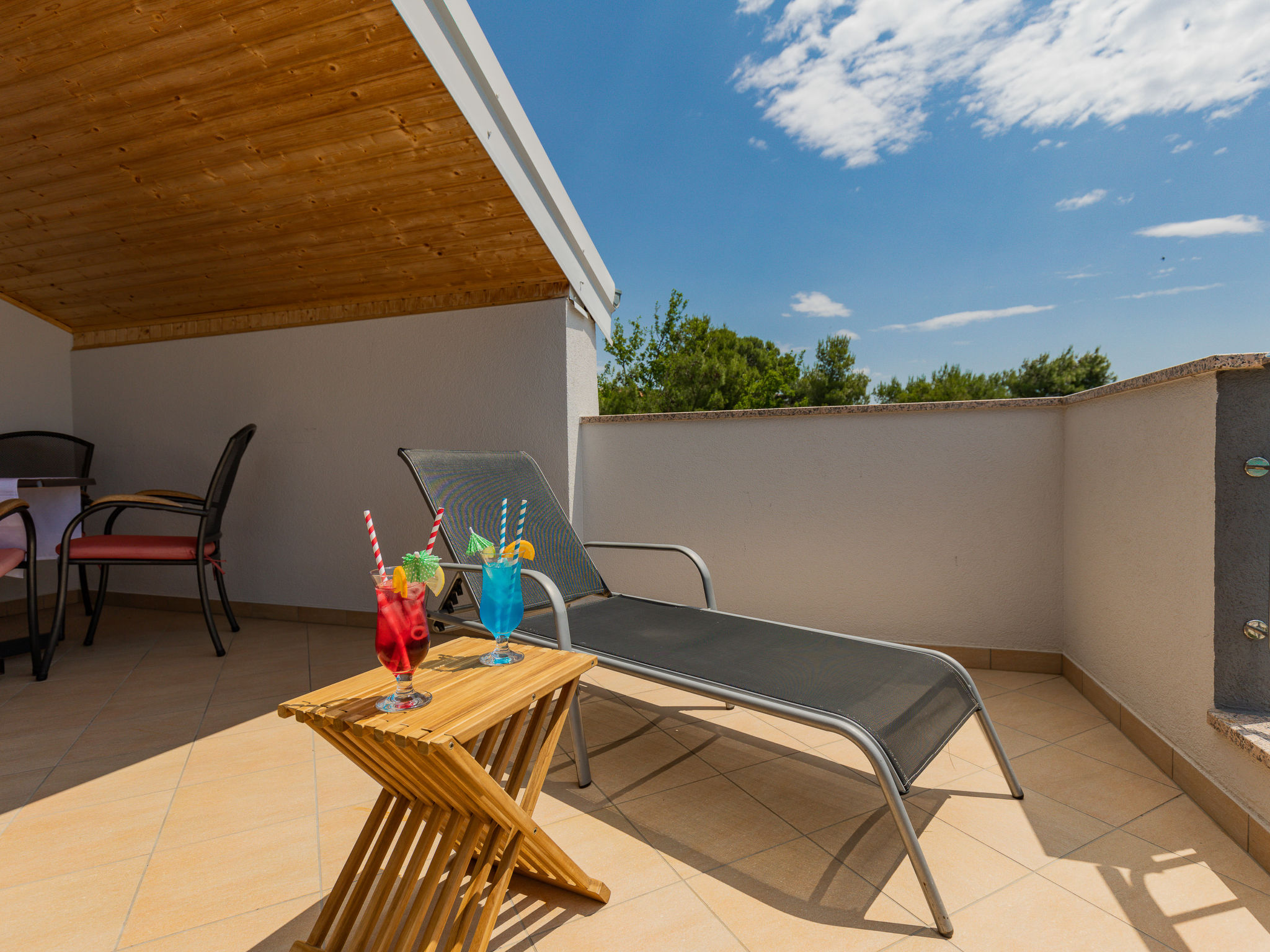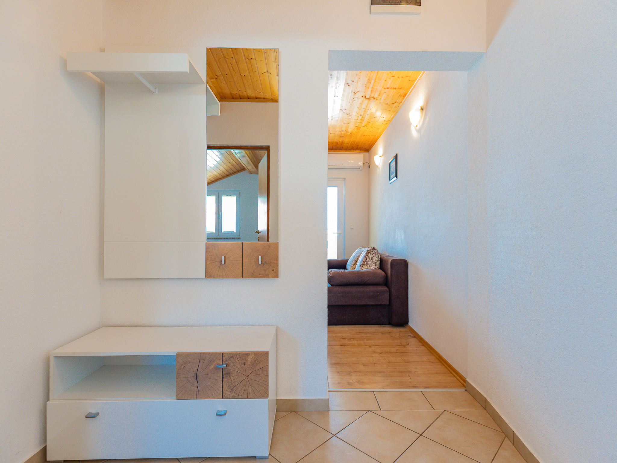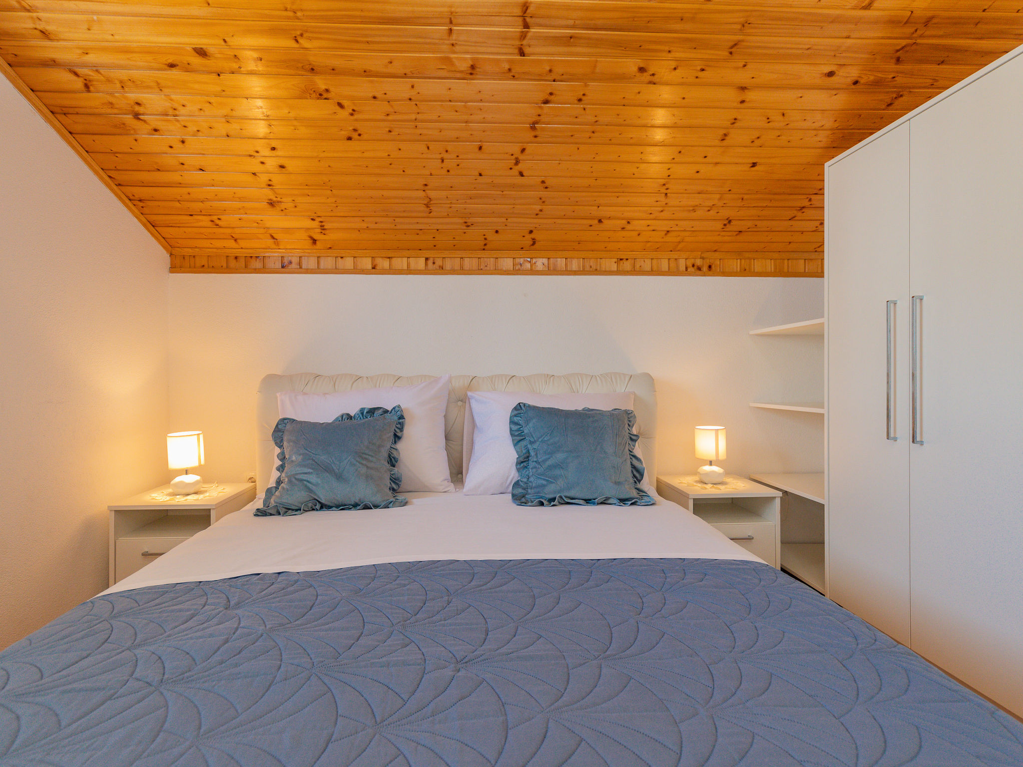 "Maja (SRD423)", 2-Zimmer-Wohnung 34 m2, im Dachgeschoss. Abgeschrägtes Wohn-/Esszimmer mit 1 Doppeldiwanbett (140 cm, Länge 190 cm), Sat-TV und Klimaanlage. Ausgang zum Balkon. 1 abgeschrägtes Zimmer mit 1 franz. Bett (160 cm, Länge 200 cm). Abgeschrägte, offene Küche (2 Kochplatten, Toaster, Wasserkocher, Mikrowelle, elektrische Kaffeemaschine). Dusche/WC. E-Heizung. Balkon 17 m2. Balkonmöbel, Liegestühle. Sicht auf das Meer. Zur Verfügung: Waschmaschine. Internet (Wireless LAN, gratis). Bitte beachten: Nichtraucher-Haus. Eigener Eingang.