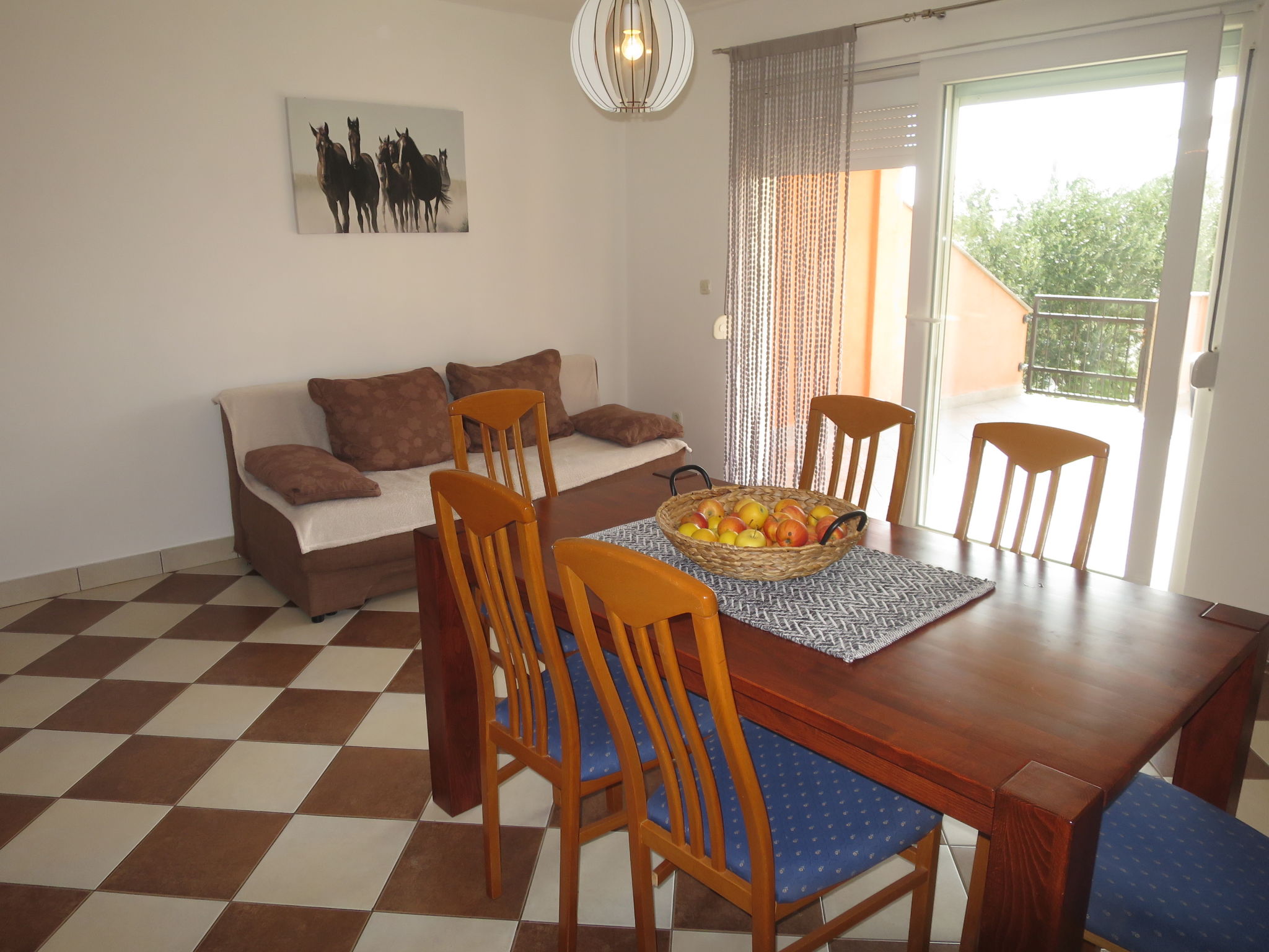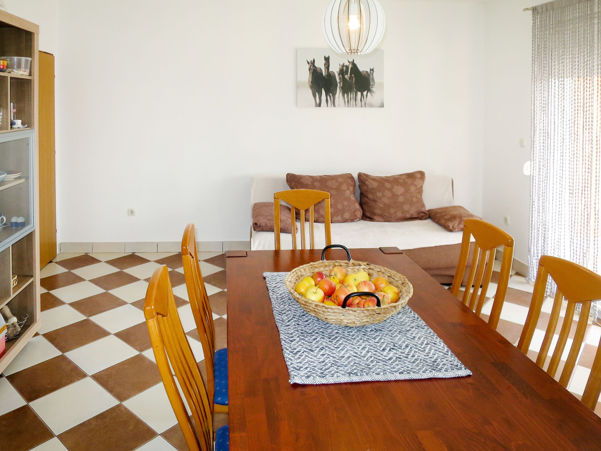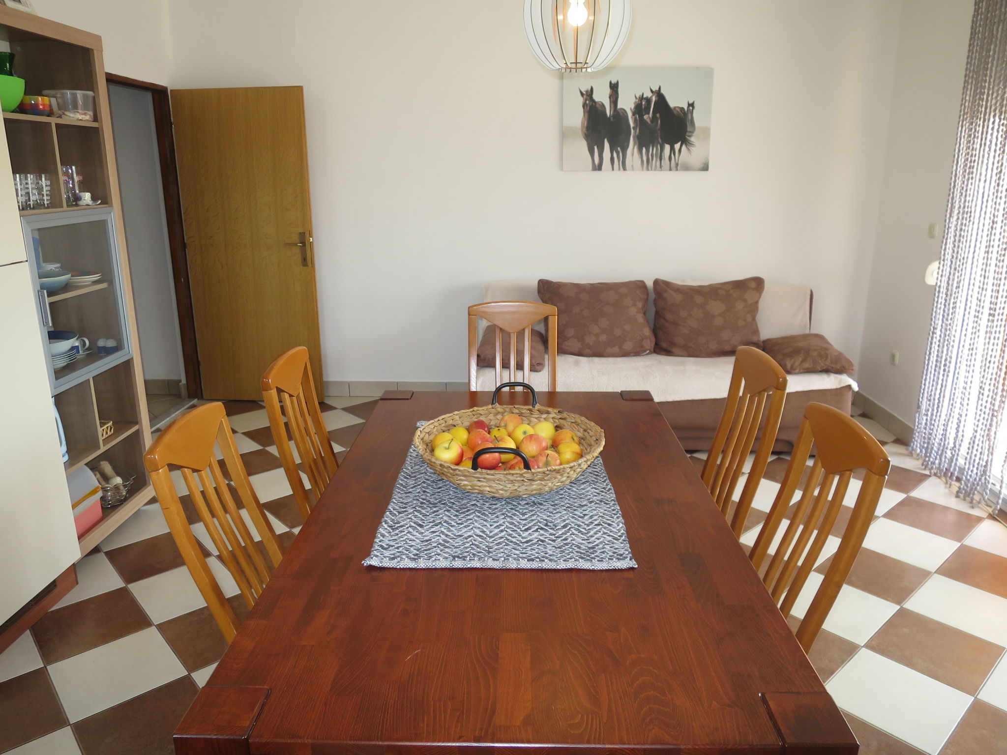 "Tomislav (SRD453)", 3-Zimmer-Wohnung 60 m2, im erhöhten Erdgeschoss. Wohn-/Esszimmer mit 1 Doppeldiwanbett, Sat-TV und Klimaanlage. Ausgang zur Terrasse. 1 Zimmer mit 2 Betten. 1 Zimmer mit 1 franz. Bett (160 cm, Länge 200 cm). Offene Küche (1 Kochplatte, Backofen, 3 Flammen, Toaster, Wasserkocher, Mikrowelle, Tiefkühler, elektrische Kaffeemaschine). Dusche/WC. Terrasse 25 m2 teilweise. Terrassenmöbel. Zur Verfügung: Waschmaschine. Internet (Wireless LAN, gratis). Maximal 2 Haustiere/Hunde erlaubt.