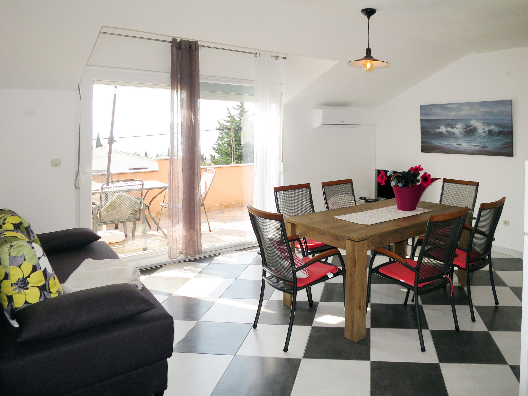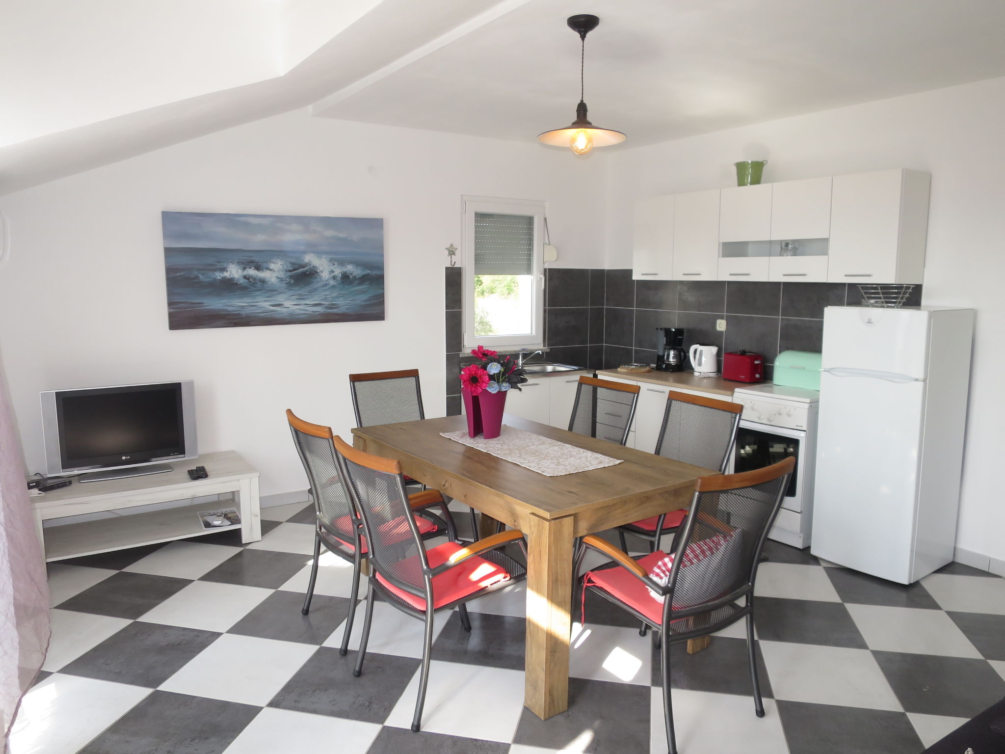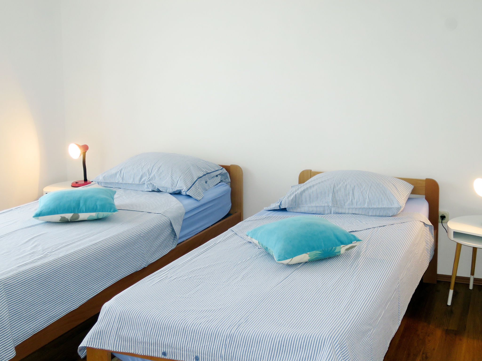 "Tomislav (SRD454)", 3-Zimmer-Wohnung 60 m2 im 1. Stock. Wohn-/Esszimmer mit 1 Doppeldiwanbett, Sat-TV und Klimaanlage. Ausgang zum Balkon. 1 Zimmer mit 2 Betten. Ausgang zum Balkon. 1 Zimmer mit 1 franz. Bett (160 cm, Länge 200 cm). Ausgang zum Balkon. Offene Küche (2 Kochplatten, Backofen, 2 Flammen, Toaster, Wasserkocher, Mikrowelle, Tiefkühler, elektrische Kaffeemaschine). Dusche/WC. Balkon 15 m2, Balkon 5 m2. Balkonmöbel. Sicht auf das Meer. Zur Verfügung: Waschmaschine. Internet (Wireless LAN, gratis). Maximal 2 Haustiere/Hunde erlaubt.
