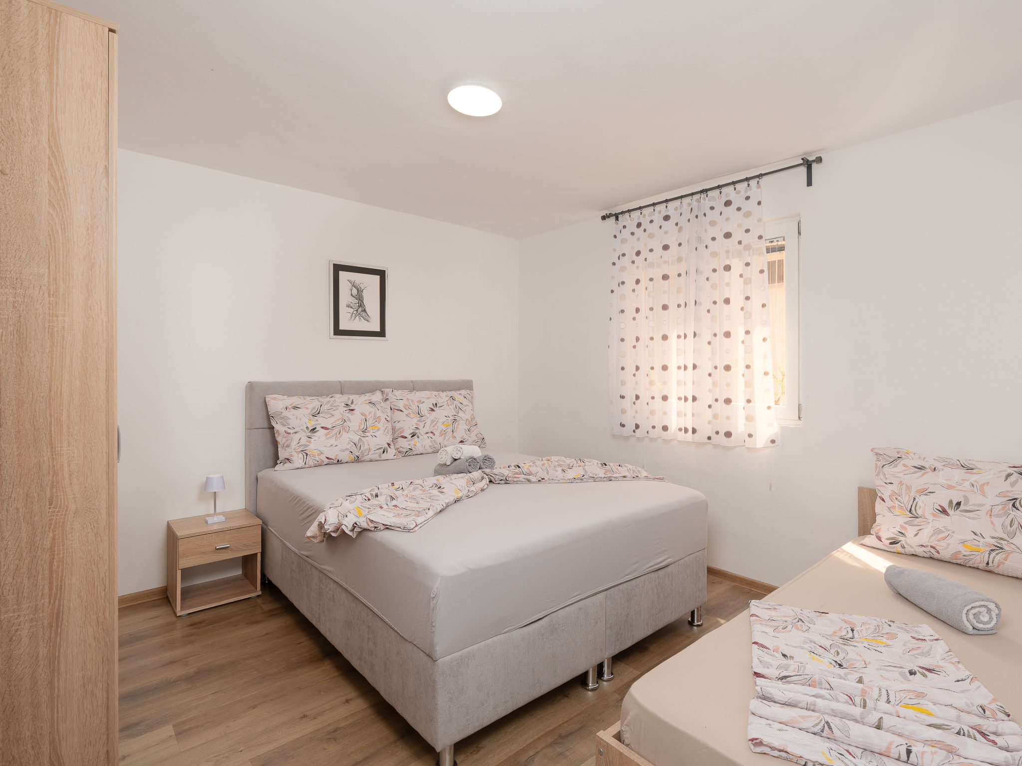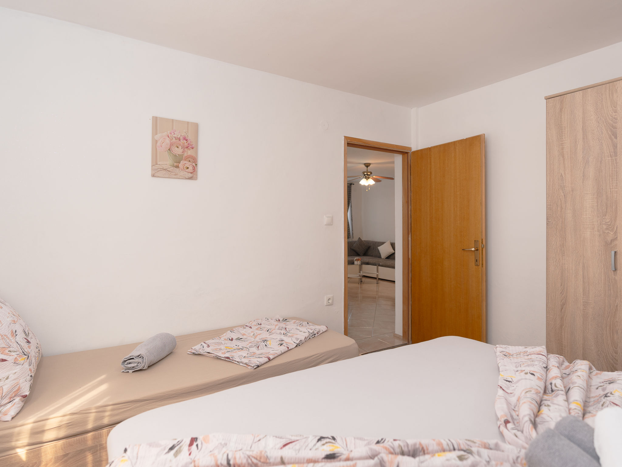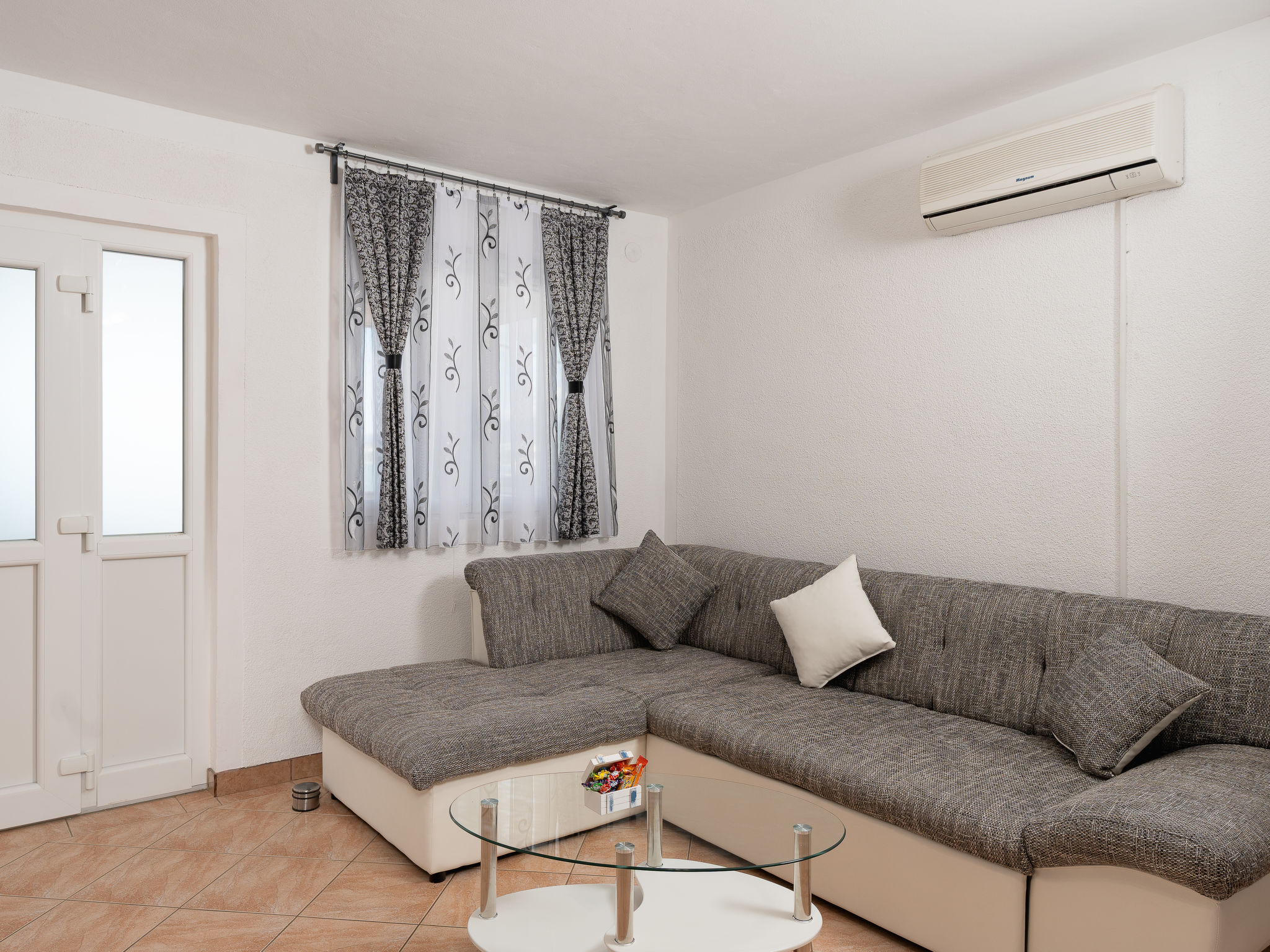 3-Zimmer-Wohnung 80 m2, im Erdgeschoss, Südwestlage. Wohnzimmer mit 1 Diwanbett (140 cm, Länge 200 cm), Sat-TV (Flachbildschirm). Ausgang zur Terrasse. 1 Zimmer mit 1 franz. Bett (160 cm, Länge 200 cm). 1 Zimmer mit 1 Bett (90 cm, Länge 200 cm), 1 franz. Bett (180 cm, Länge 200 cm). Küche (Backofen, 4 Flammen, Mikrowelle, Tiefkühler, elektrische Kaffeemaschine) mit Esstisch. Dusche/WC. Terrasse 10 m2, überdacht. Terrassenmöbel. Zur Verfügung: Internet (Wireless LAN, gratis).