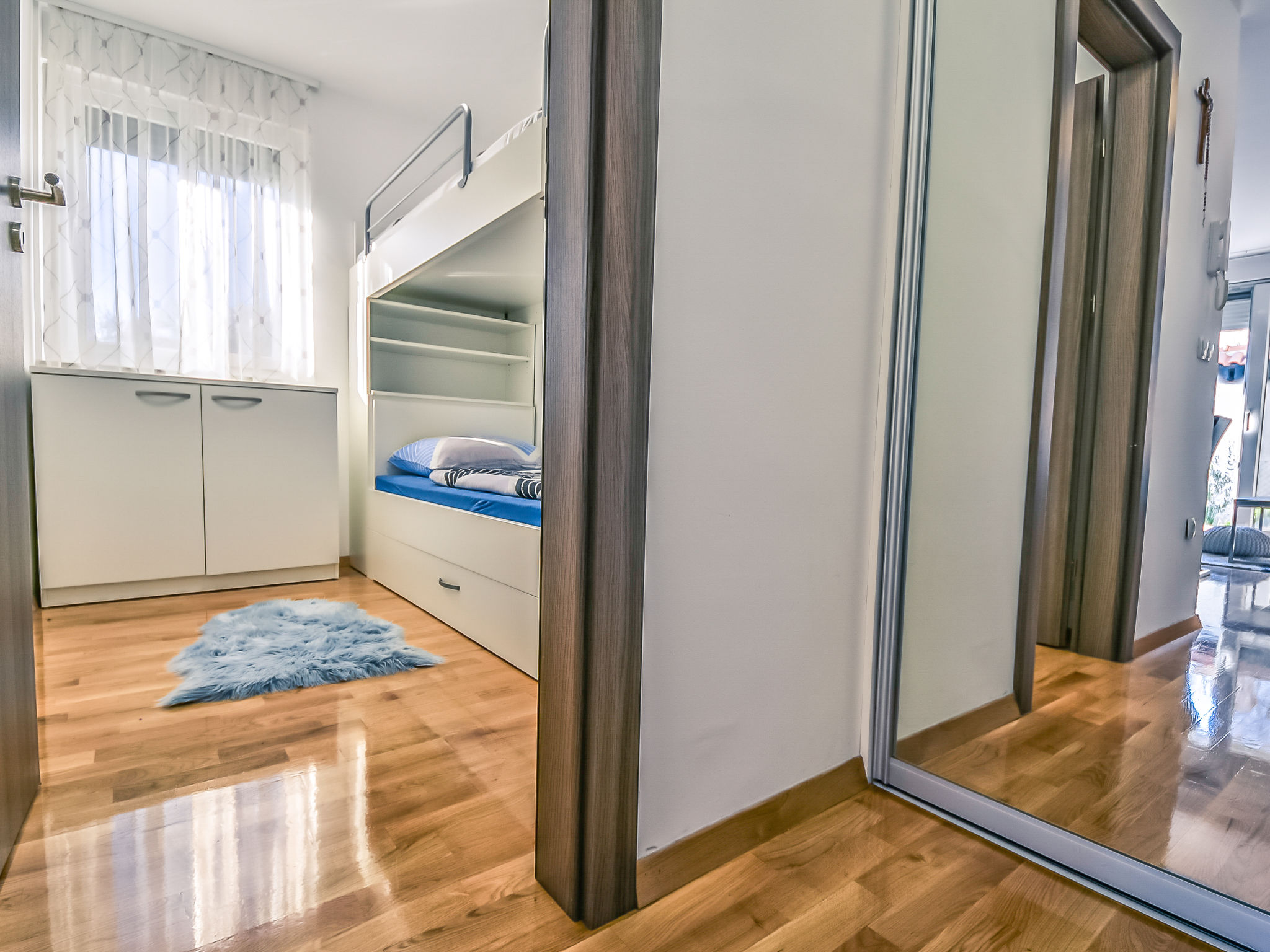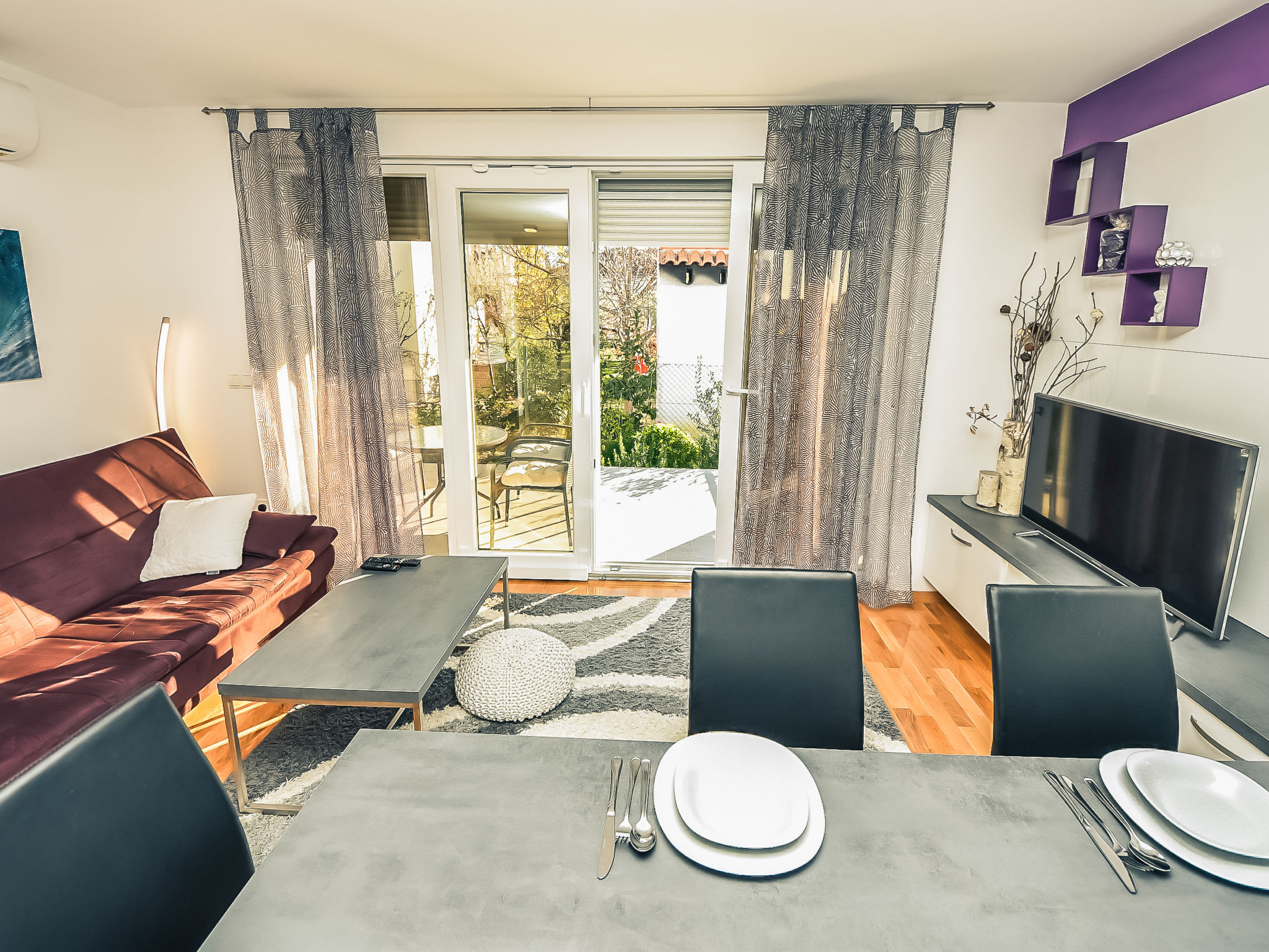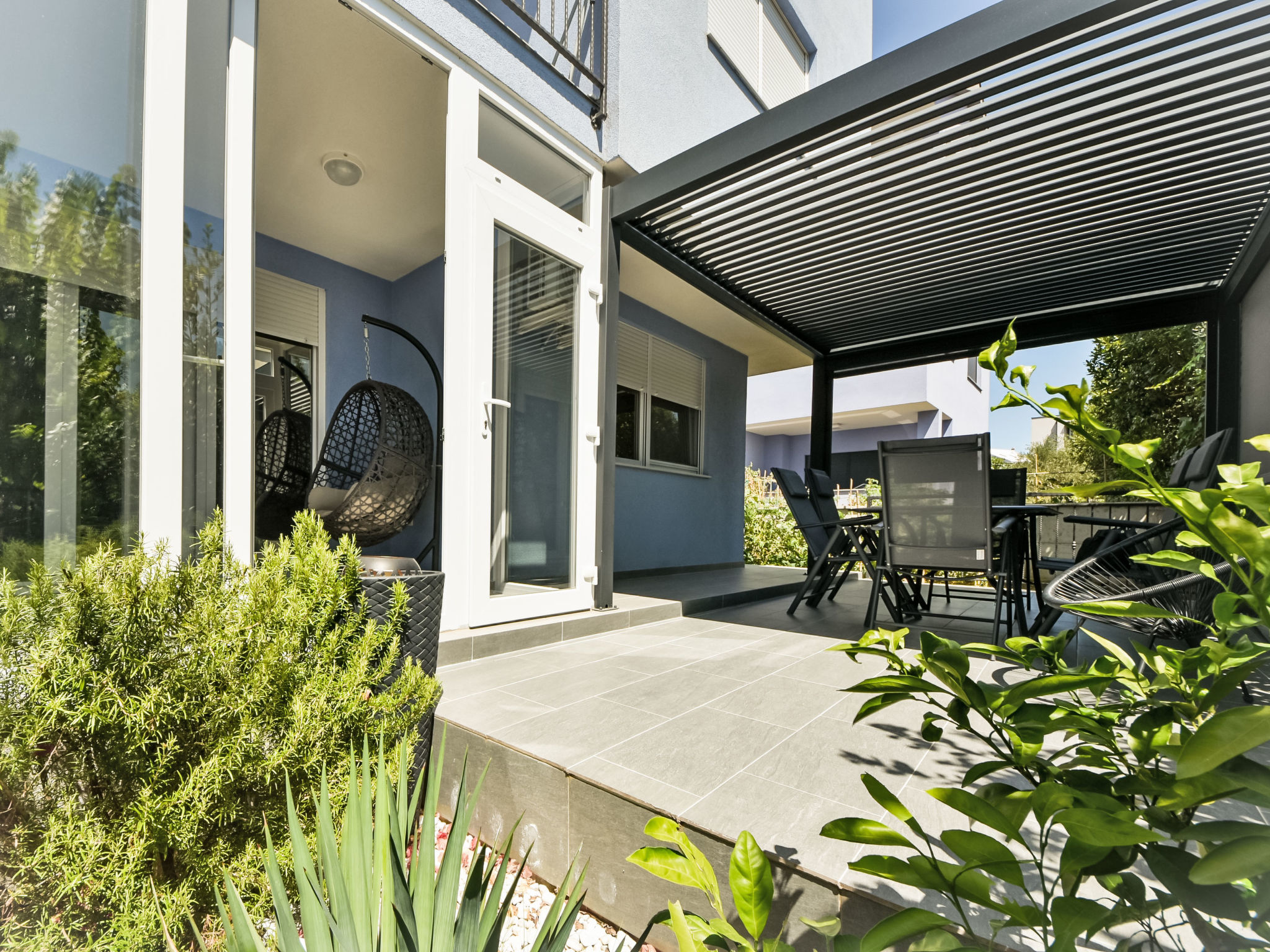 Kleines Appartementhaus, Baujahr 2021. Im Ortsteil Belafuža, 3.5 km vom Zentrum, sonnige, erhöhte Lage, 3 km vom Meer, 3 km vom Strand. Im Hause: Internetzugang. Parkplatz beim Haus. Einkaufsgeschäft, Restaurant 500 m, Kieselstrand 3 km. Tennis 3.5 km. Bitte beachten: Flugplatz 20 km vom Haus.