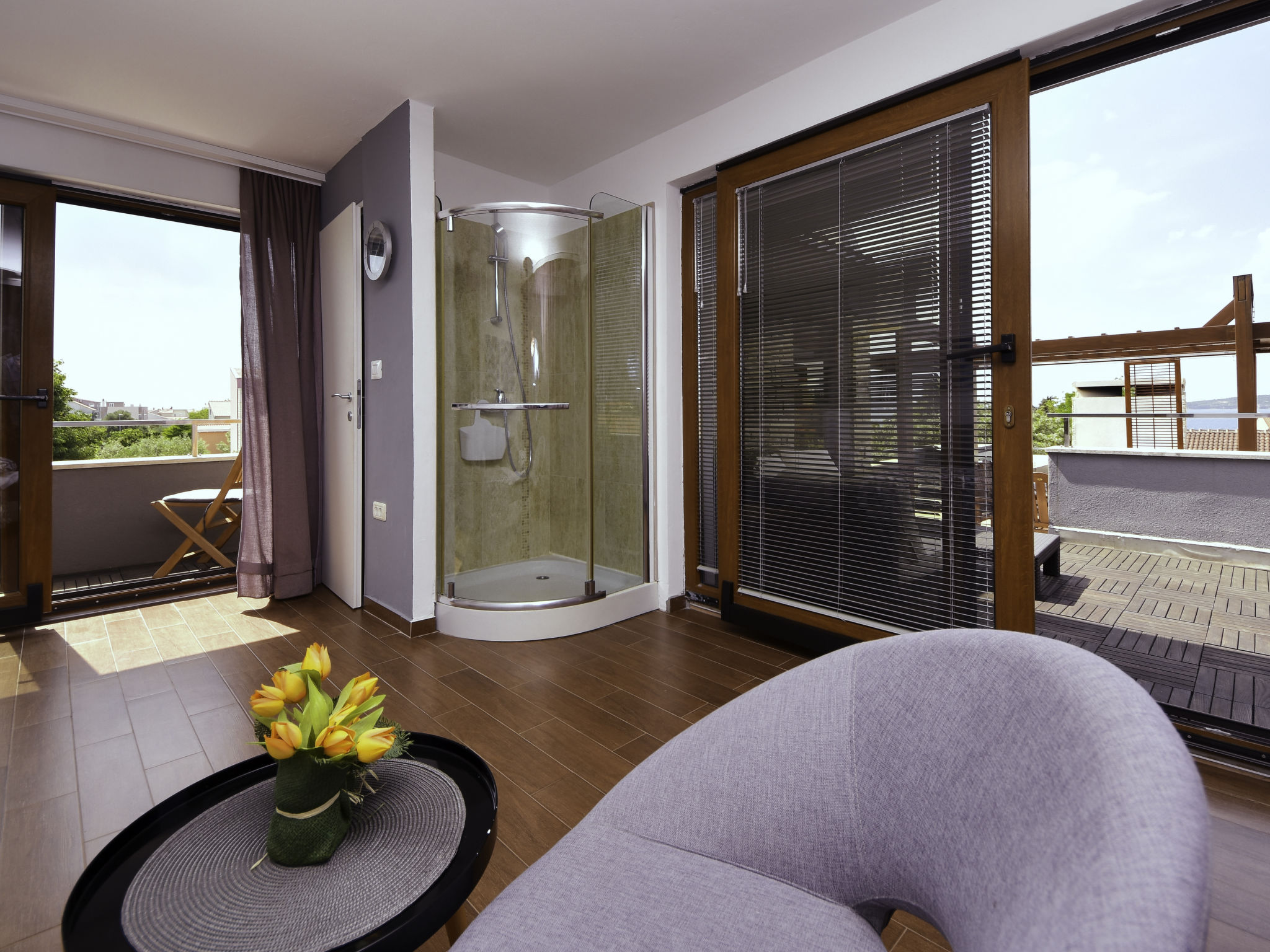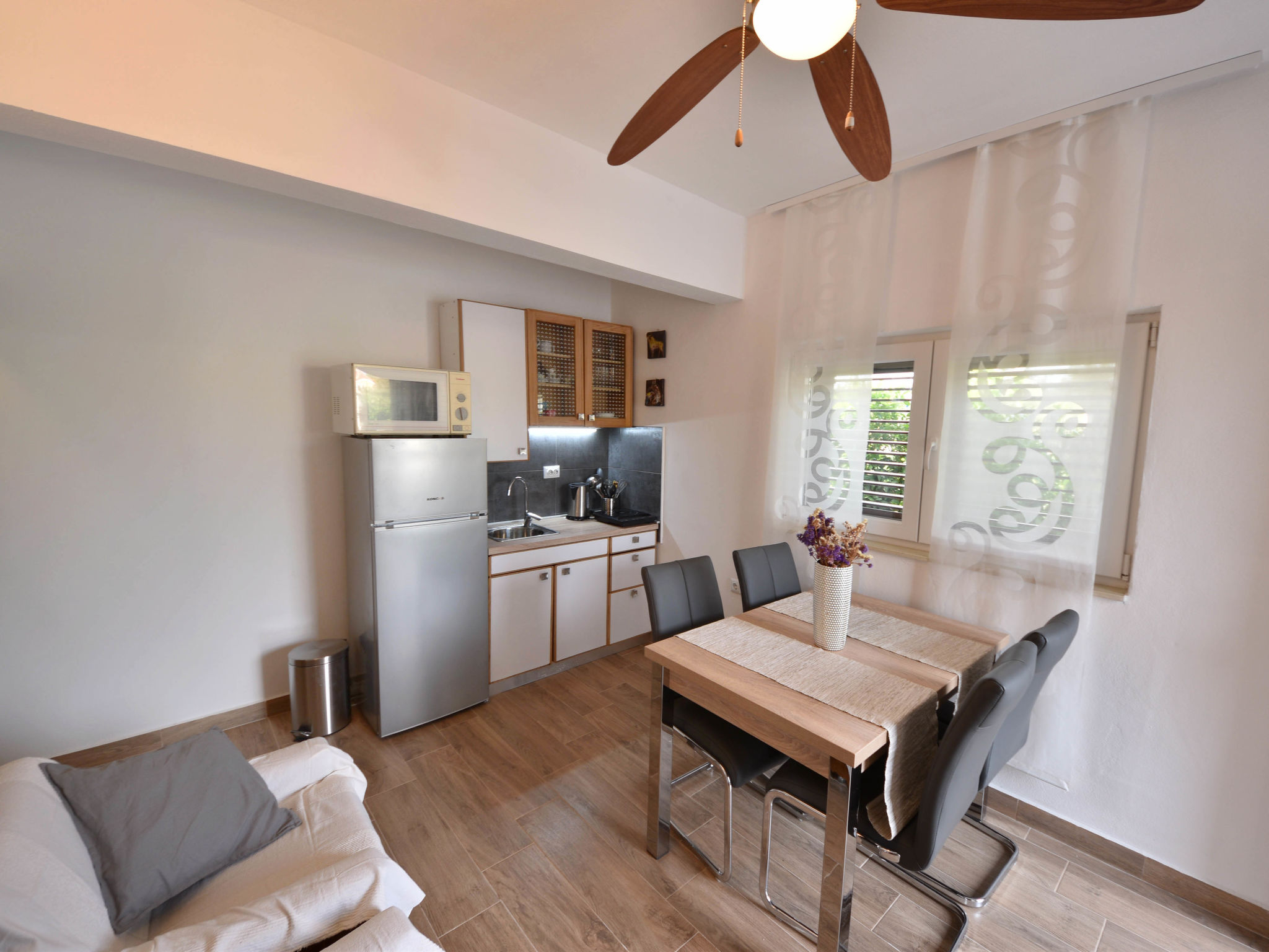 6-Zimmer-Haus 180 m2 auf 3 Stockwerken, Südwestlage. Wohn-/Esszimmer 45 m2 mit offenem Kamin und Sat-TV (Flachbildschirm), Klimaanlage. Ausgang zur Terrasse. 1 Zimmer mit 1 franz. Bett (160 cm, Länge 200 cm), Klimaanlage. 1 Zimmer mit 1 franz. Bett (140 cm, Länge 200 cm), Klimaanlage. Offene Küche (Backofen, Geschirrspüler, 4 Glaskeramikherd Platten, Mikrowelle, Tiefkühler, elektrische Kaffeemaschine) mit Klimaanlage. Dusche/WC, Dusche/Bidet/WC. Unteres Geschoss: Wohn-/Esszimmer 18 m2 mit Ventilator. 1 Zimmer mit 1 franz. Bett (160 cm, Länge 200 cm), Sat-TV (Flachbildschirm). Offene Küche (1 Induktionskochplatten, elektrische Kaffeemaschine). Dusche/WC. Obergeschoss: 1 Zimmer mit 1 Doppeldiwanbett (140 cm, Länge 200 cm), sep. WC und Dusche. Ausgang zur Terrasse. Terrasse 21 m2, überdacht, Terrasse 3 m2. Terrassenmöbel, Elektrogrill, Liegestühle. Fernsicht auf das Meer. Zur Verfügung: Haartrockner. Internet (Wireless LAN, gratis). Zugang auf die Dachterrasse vom Zimmer mit 1 Doppelschlafsofa im ersten Stock.