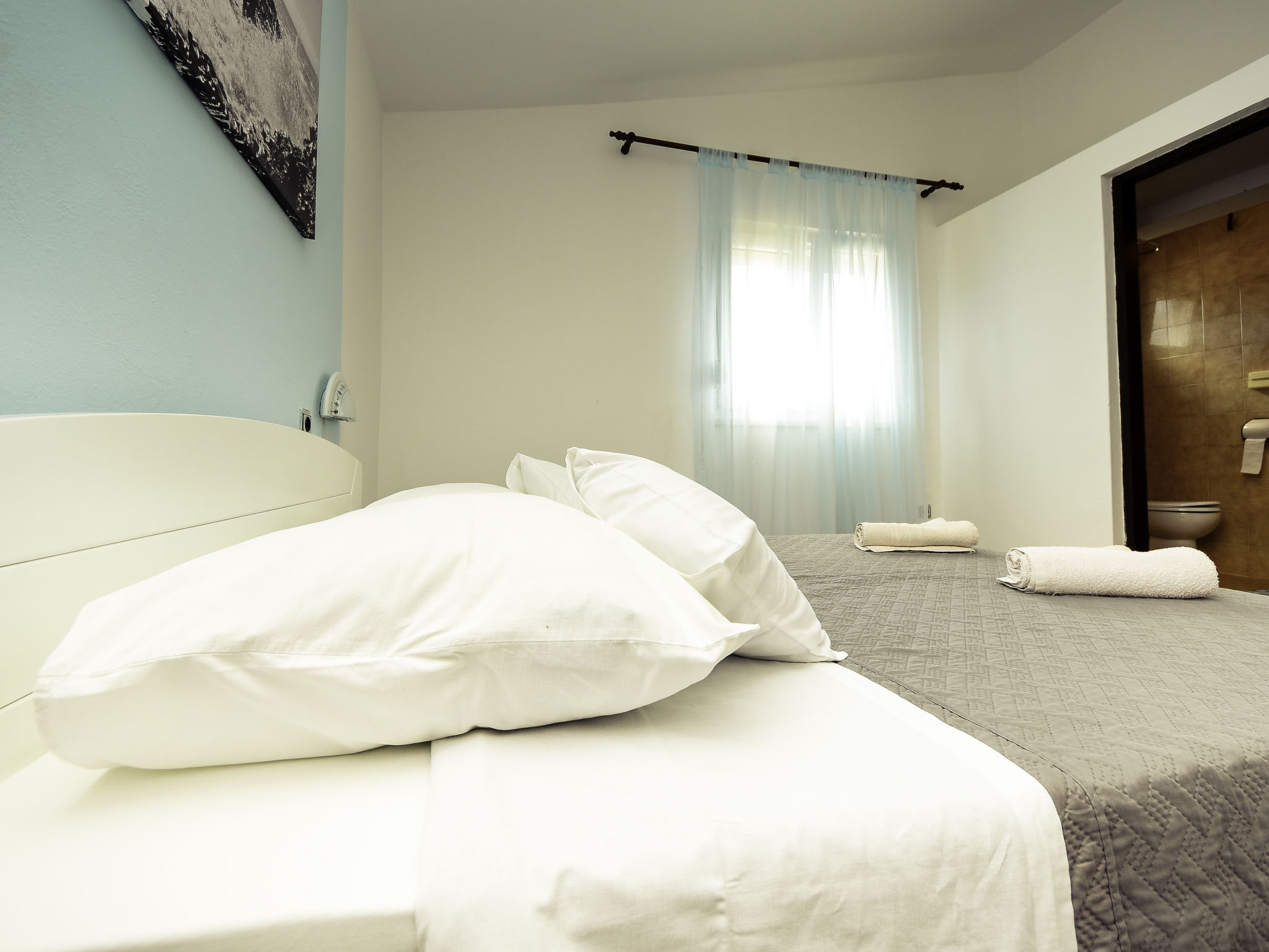 3-Zimmer-Wohnung 40 m2 im 2. Stock. Studio mit 1 franz. Bett (160 cm, Länge 200 cm), Küchenblock, Dusche/WC und Sat-TV (Flachbildschirm), Klimaanlage. Wohn-/Esszimmer 17 m2 mit 1 Doppeldiwanbett (140 cm, Länge 200 cm), Sat-TV (Flachbildschirm). Ausgang zur Terrasse. 1 Zimmer mit 1 franz. Bett (160 cm, Länge 200 cm), Dusche/WC. Ausgang zur Terrasse. Offene Küche (1 Kochplatte, Backofen, 3 Flammen, Tiefkühler) mit Klimaanlage. 2 Duschen/WC. Klimaanlage (extra). Terrasse 12 m2, Terrasse 2 m2, überdacht. Terrassenmöbel. Sicht auf das Meer. Zur Verfügung: Internet (Wireless LAN, gratis). 1 Haustier/Hund erlaubt.