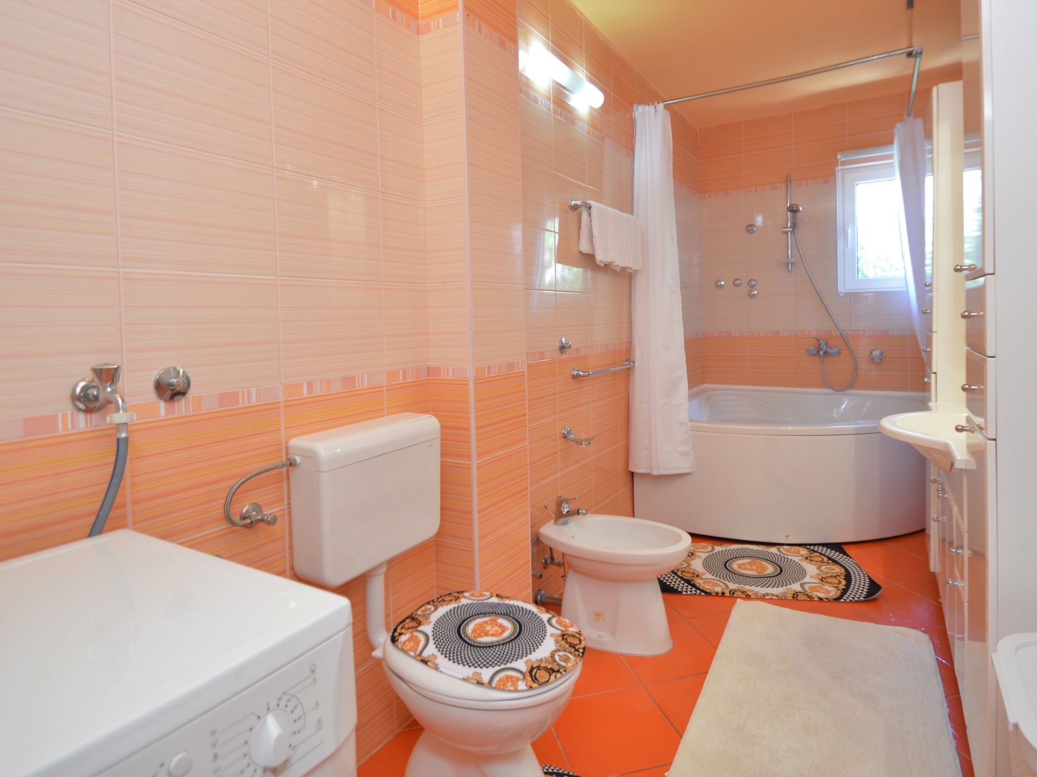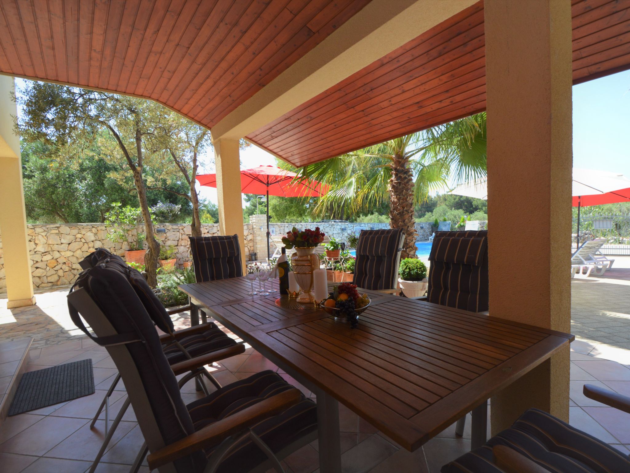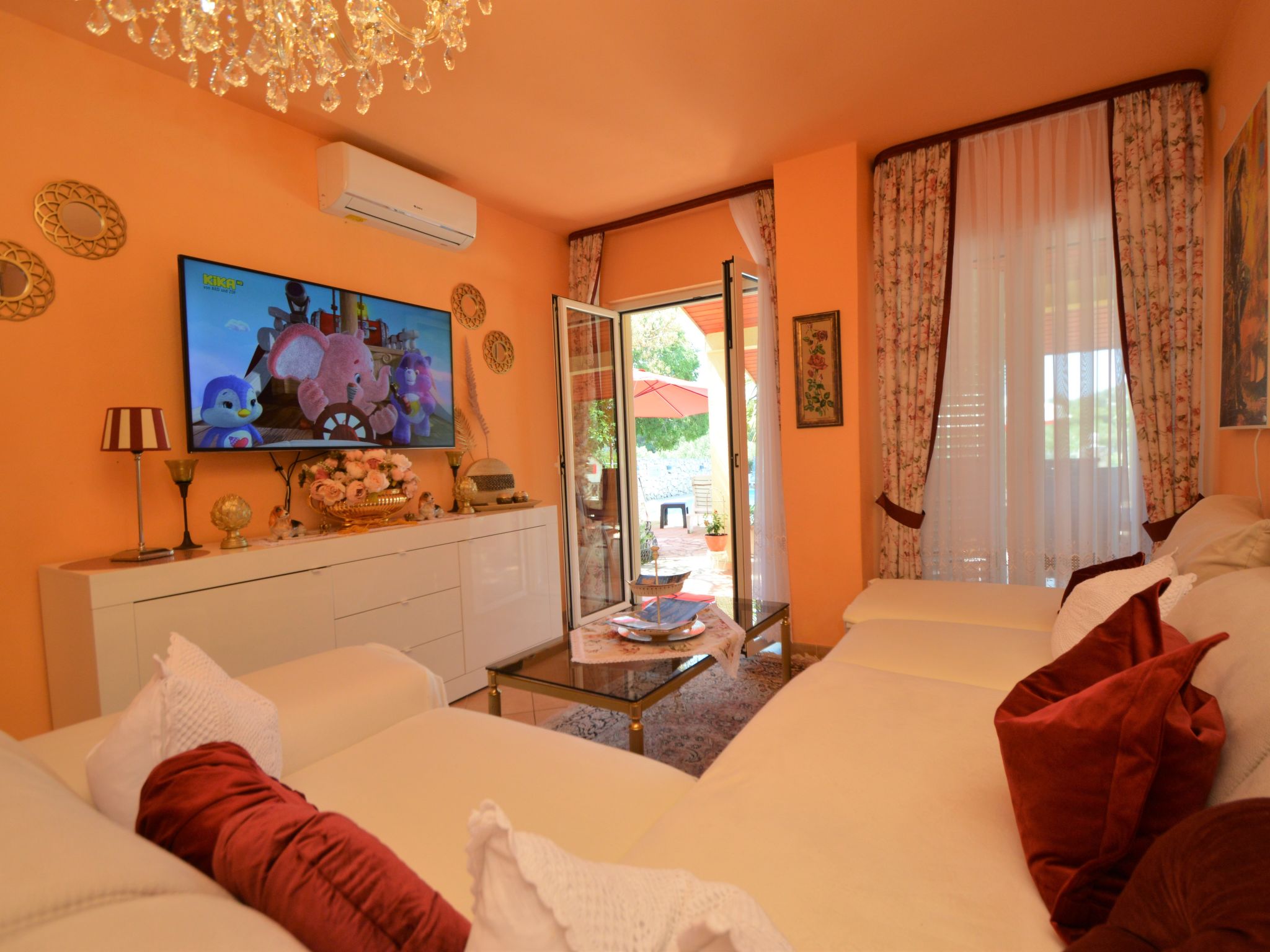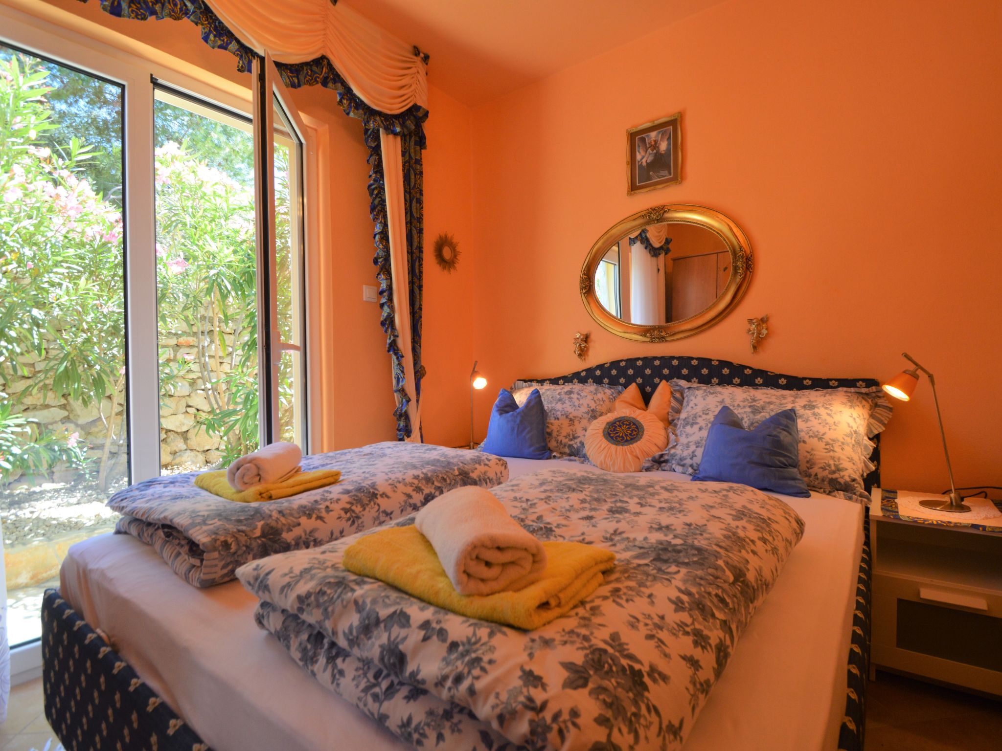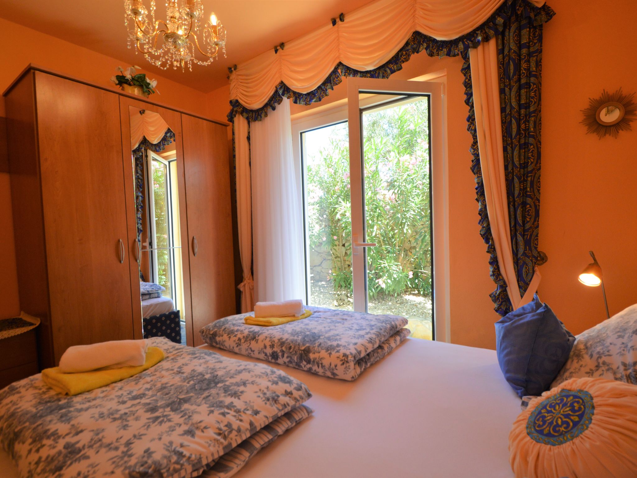 4-Zimmer-Wohnung 95 m2, im Erdgeschoss, Südlage. Schön und gemütlich eingerichtet: Wohn-/Esszimmer 25 mit Sat-TV (Flachbildschirm), Klimaanlage. Ausgang zur Terrasse. 1 Zimmer mit 1 franz. Bett (160 cm, Länge 200 cm). 1 Zimmer mit 1 franz. Bett (160 cm, Länge 200 cm), Klimaanlage. Durchgangszimmer mit 2 Betten (90 cm, Länge 200 cm). Offene Küche (Backofen, Geschirrspüler, 4 Glaskeramikherd Platten, Wasserkocher, Mikrowelle, Tiefkühler, elektrische Kaffeemaschine). Bad/Bidet/WC, sep. WC. Terrasse 30 m2, überdacht. Terrassenmöbel, Gartengrill. Zur Verfügung: Waschmaschine, Babybett. Internet (Wireless LAN, gratis). Bitte beachten: eigener Eingang.
