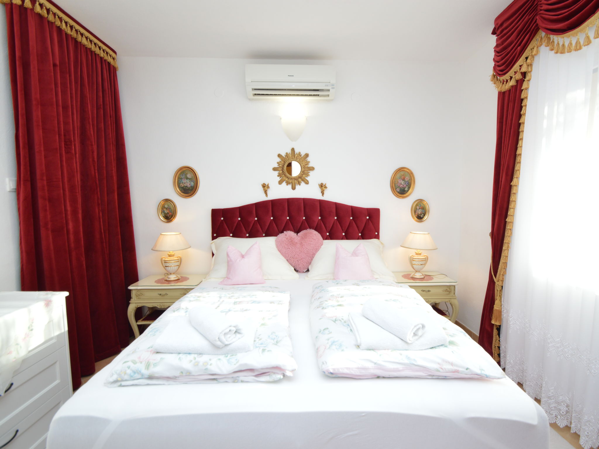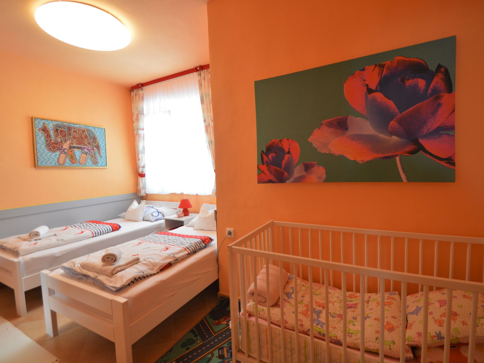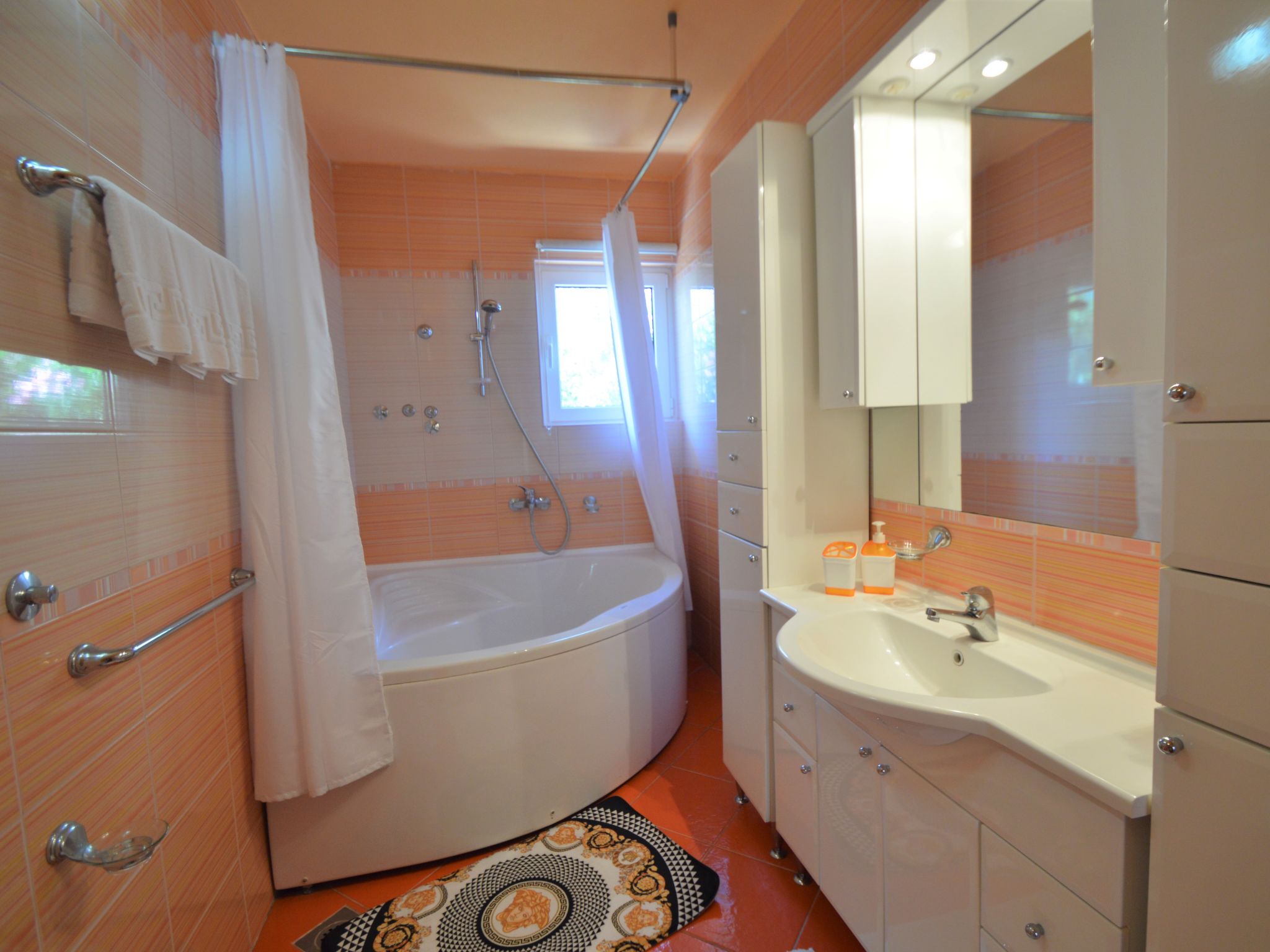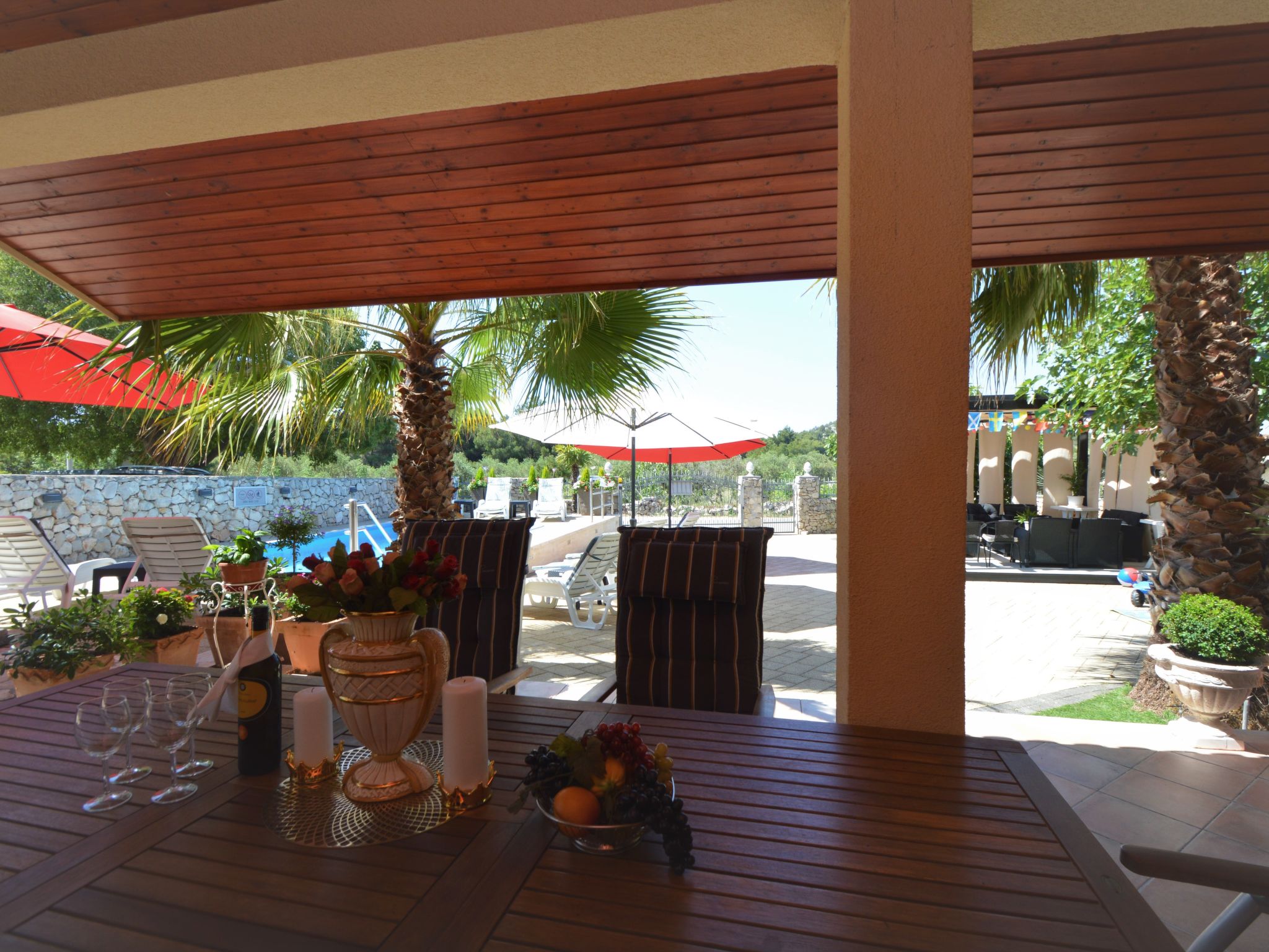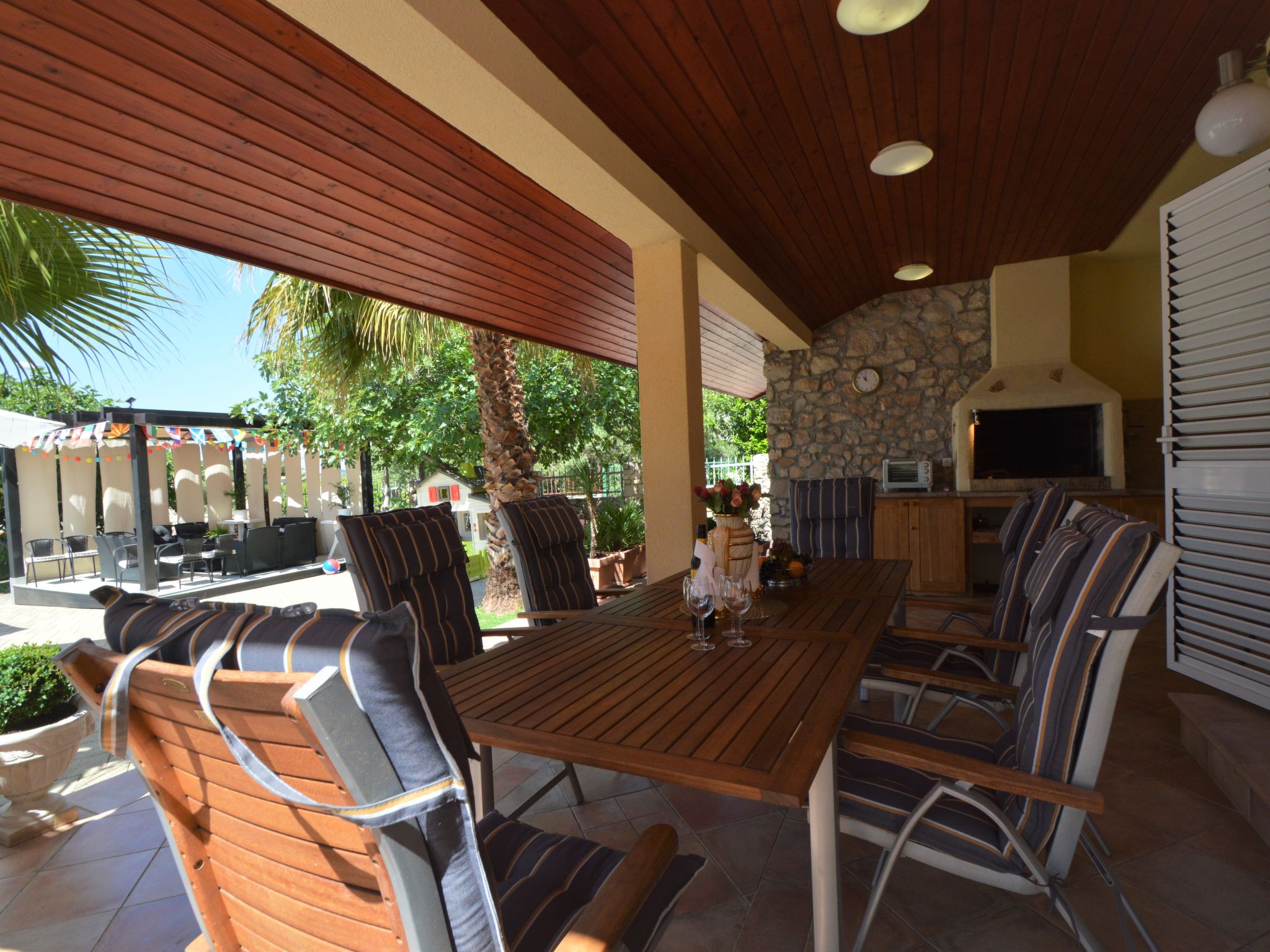 4-Zimmer-Wohnung 95 m2, im Erdgeschoss, Südlage. Schön und gemütlich eingerichtet: Wohn-/Esszimmer 25 mit Sat-TV (Flachbildschirm), Klimaanlage. Ausgang zur Terrasse. 1 Zimmer mit 1 franz. Bett (160 cm, Länge 200 cm). 1 Zimmer mit 1 franz. Bett (160 cm, Länge 200 cm), Klimaanlage. Durchgangszimmer mit 2 Betten (90 cm, Länge 200 cm). Offene Küche (Backofen, Geschirrspüler, 4 Glaskeramikherd Platten, Wasserkocher, Mikrowelle, Tiefkühler, elektrische Kaffeemaschine). Bad/Bidet/WC, sep. WC. Terrasse 30 m2, überdacht. Terrassenmöbel, Gartengrill. Zur Verfügung: Waschmaschine, Babybett. Internet (Wireless LAN, gratis). Bitte beachten: eigener Eingang.