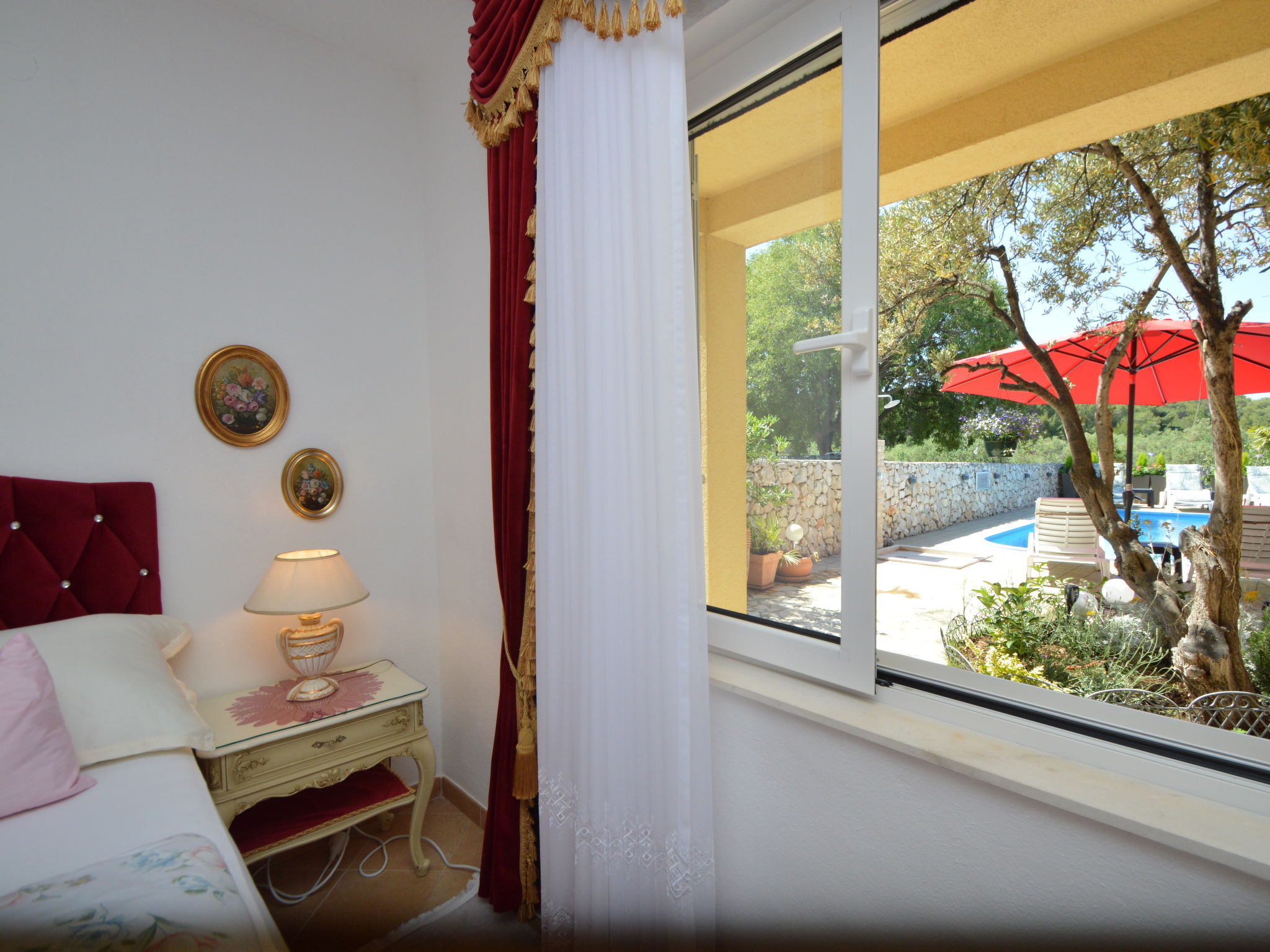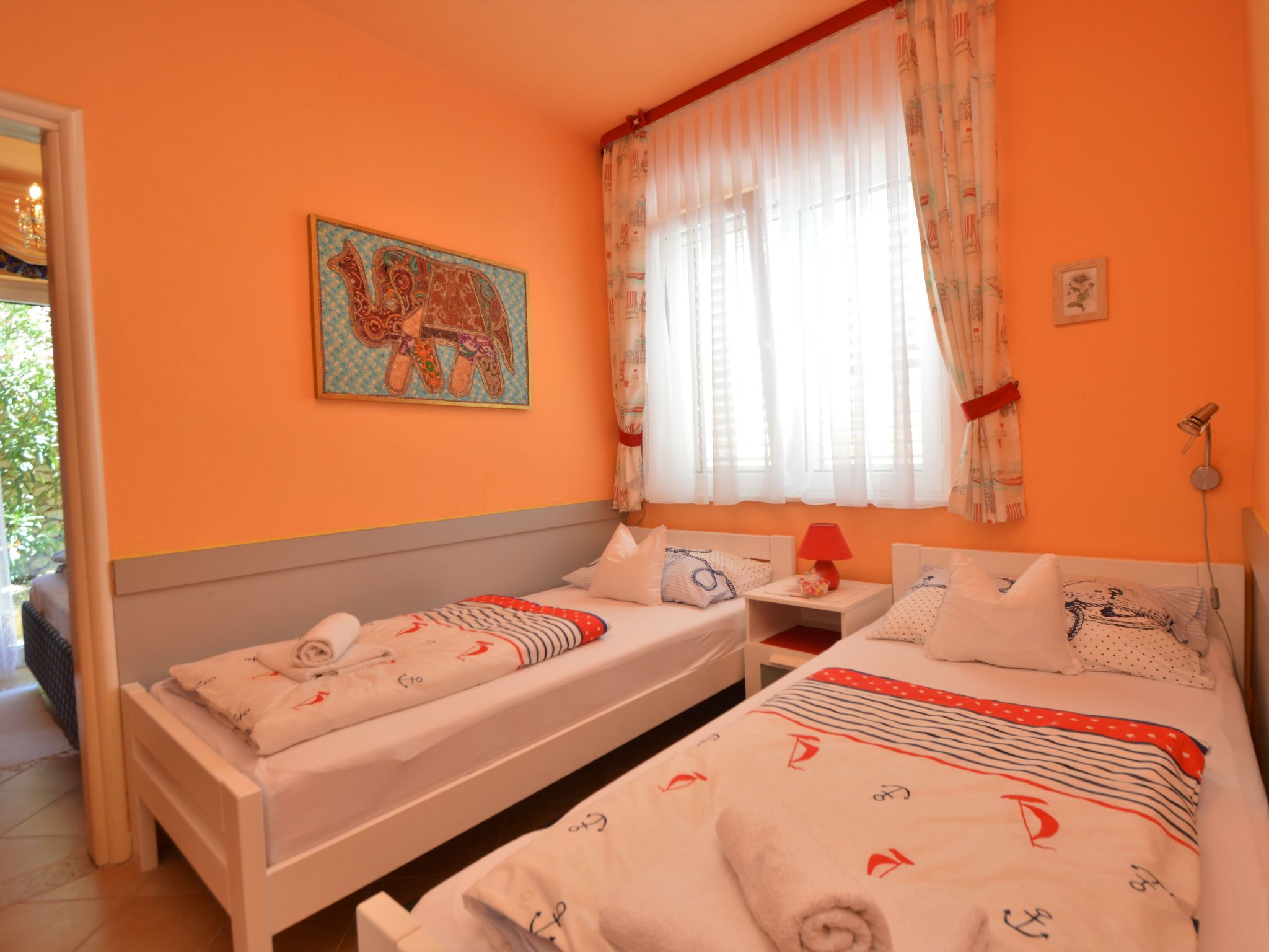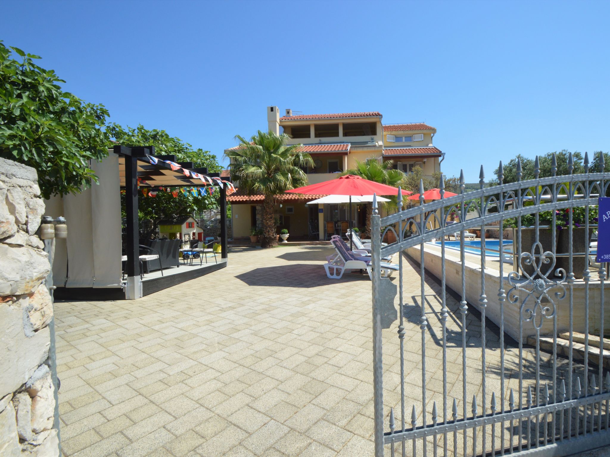 Tribunj 3 km von Vodice: Schönes Mehrfamilienhaus "Friedrich". Im Weiler Sovlje, 1.5 km vom Zentrum von Tribunj, ruhige, sonnige Lage, 250 m vom Meer, 300 m vom Strand. Zur Mitbenutzung: gepflegter Garten (eingezäunt), Schwimmbad (24 m2, 150 cm tief, saisonale Verfügbarkeit: 01.Mai.-31.Okt.) mit Innentreppe. Aussendusche, Laube, Gartenmöbel, Kinderspielplatz. Im Hause: Internetzugang, Waschmaschine (zur Mitbenutzung, extra). Parkplatz beim Haus. Einkaufsgeschäft 1.3 km, Restaurant 350 m, Kieselstrand 400 m, Felsstrand 300 m, betonierter Strand 400 m. Der Besitzer akzeptiert keine Jugendgruppen. Zur Mitbenutzung: Liegestühle und Sonnenschirme. Parkplatz für Anhänger vorhanden.