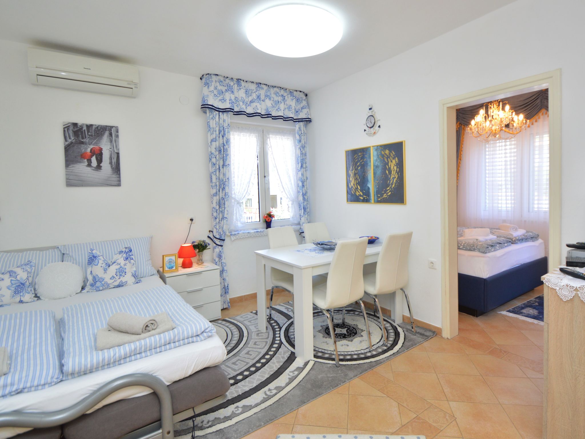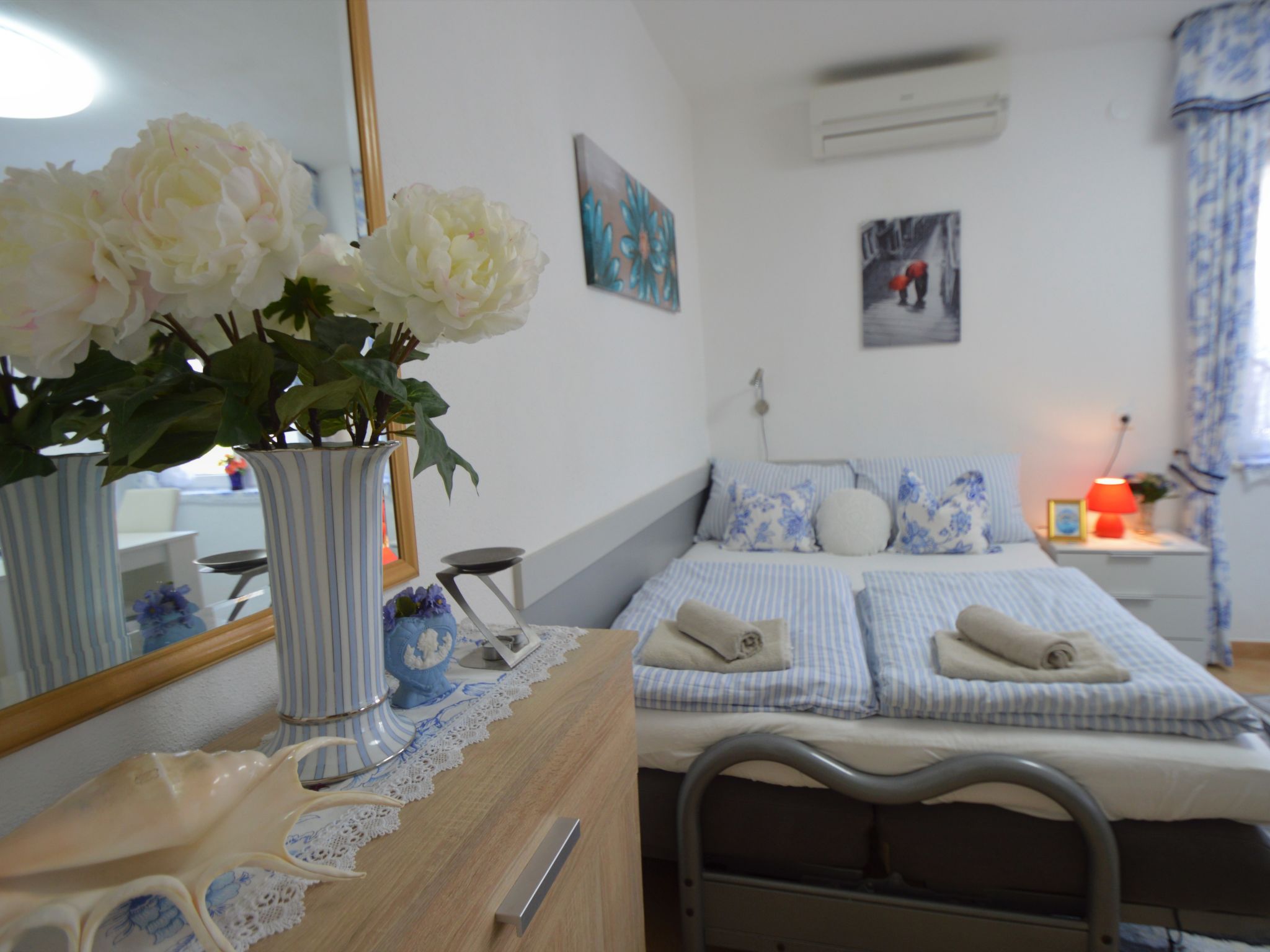 2-Zimmer-Wohnung 35 m2 im 1. Stock, Westlage. Schön und gemütlich eingerichtet: Wohn-/Esszimmer mit 1 Doppeldiwanbett (140 cm, Länge 200 cm), Sat-TV (Flachbildschirm), Klimaanlage. 1 Zimmer mit 1 franz. Bett (160 cm, Länge 200 cm). Ausgang zum Balkon. Offene Küche (Geschirrspüler, 4 Glaskeramikherd Platten, Wasserkocher, Mikrowelle, Tiefkühler, elektrische Kaffeemaschine). Dusche/Bidet/WC. Balkon 4 m2. Balkonmöbel. Zur Verfügung: Internet (Wireless LAN, gratis).