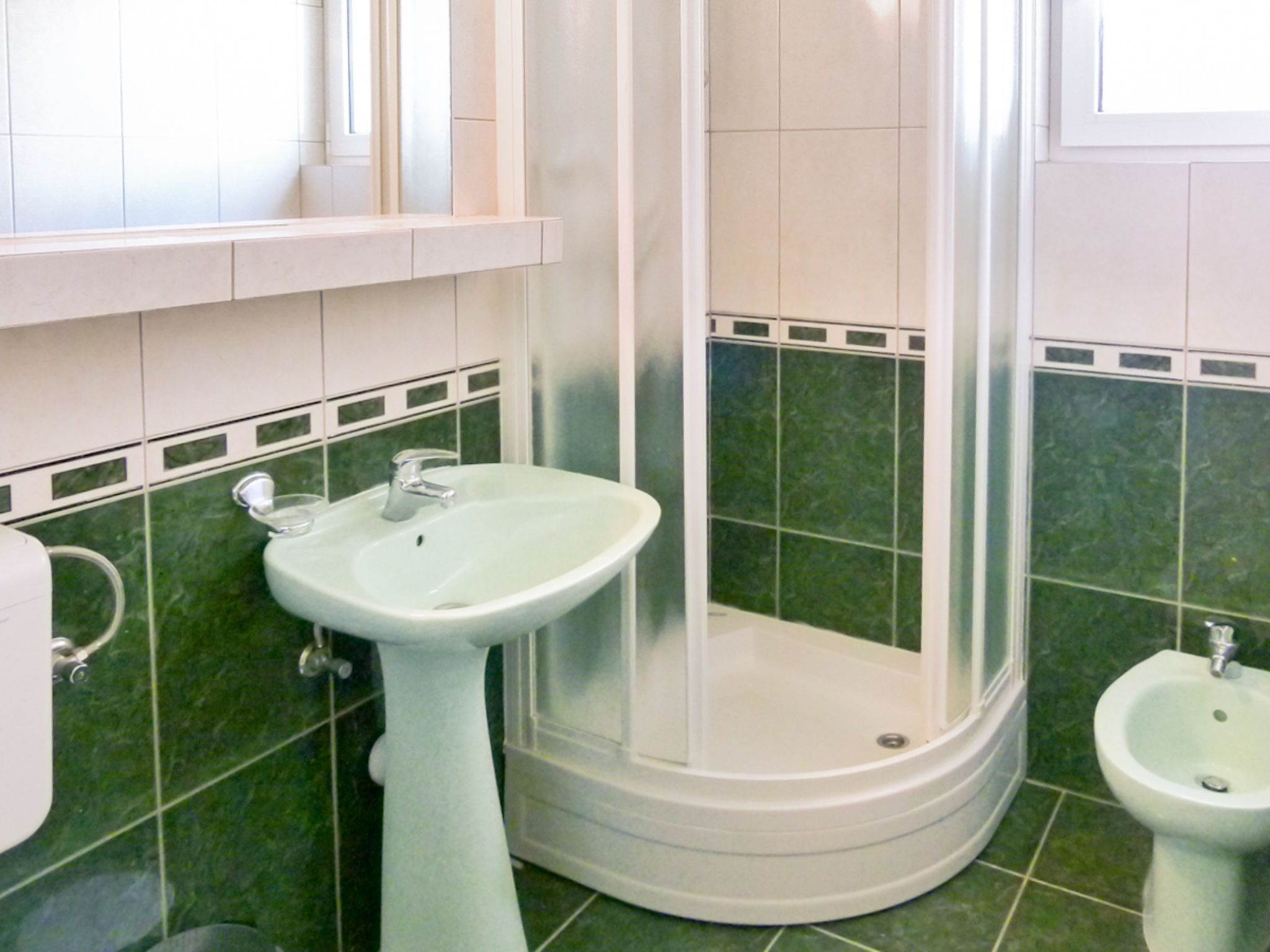 2-Zimmer-Wohnung 35 m2 im 1. Stock, Nordostlage. Schön und gemütlich eingerichtet: Wohn-/Esszimmer mit 1 Doppeldiwanbett (140 cm, Länge 200 cm), Sat-TV (Flachbildschirm), Klimaanlage. 1 Zimmer mit 1 franz. Bett (160 cm, Länge 200 cm). Ausgang zum Balkon. Offene Küche (Geschirrspüler, 4 Glaskeramikherd Platten, Wasserkocher, Mikrowelle, Tiefkühler, elektrische Kaffeemaschine). Dusche/Bidet/WC. Balkon 4 m2. Balkonmöbel. Zur Verfügung: Internet (Wireless LAN, gratis).